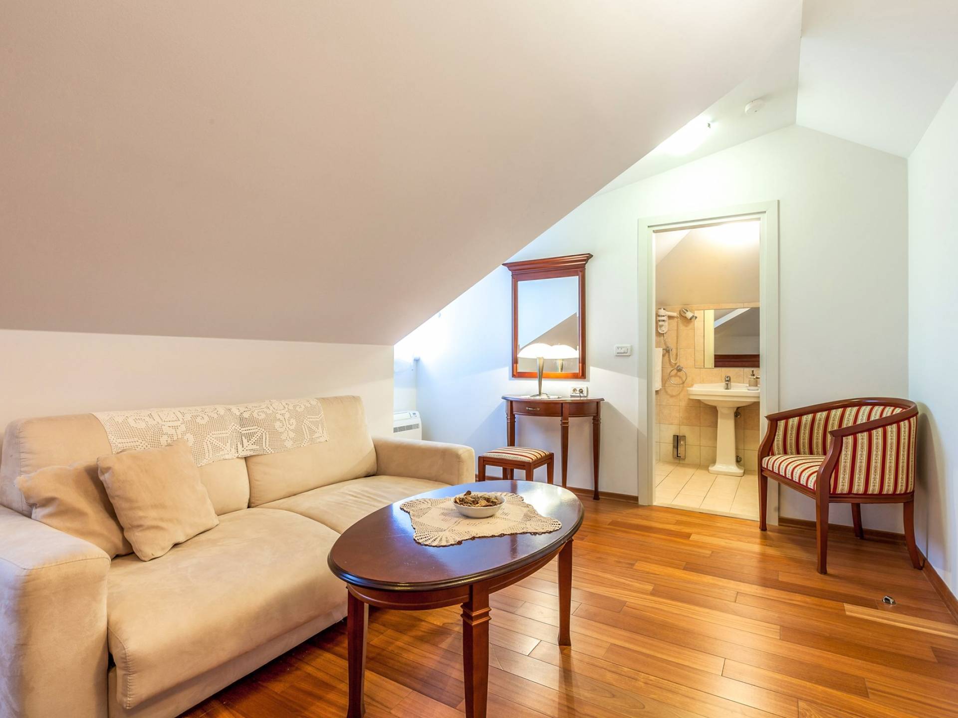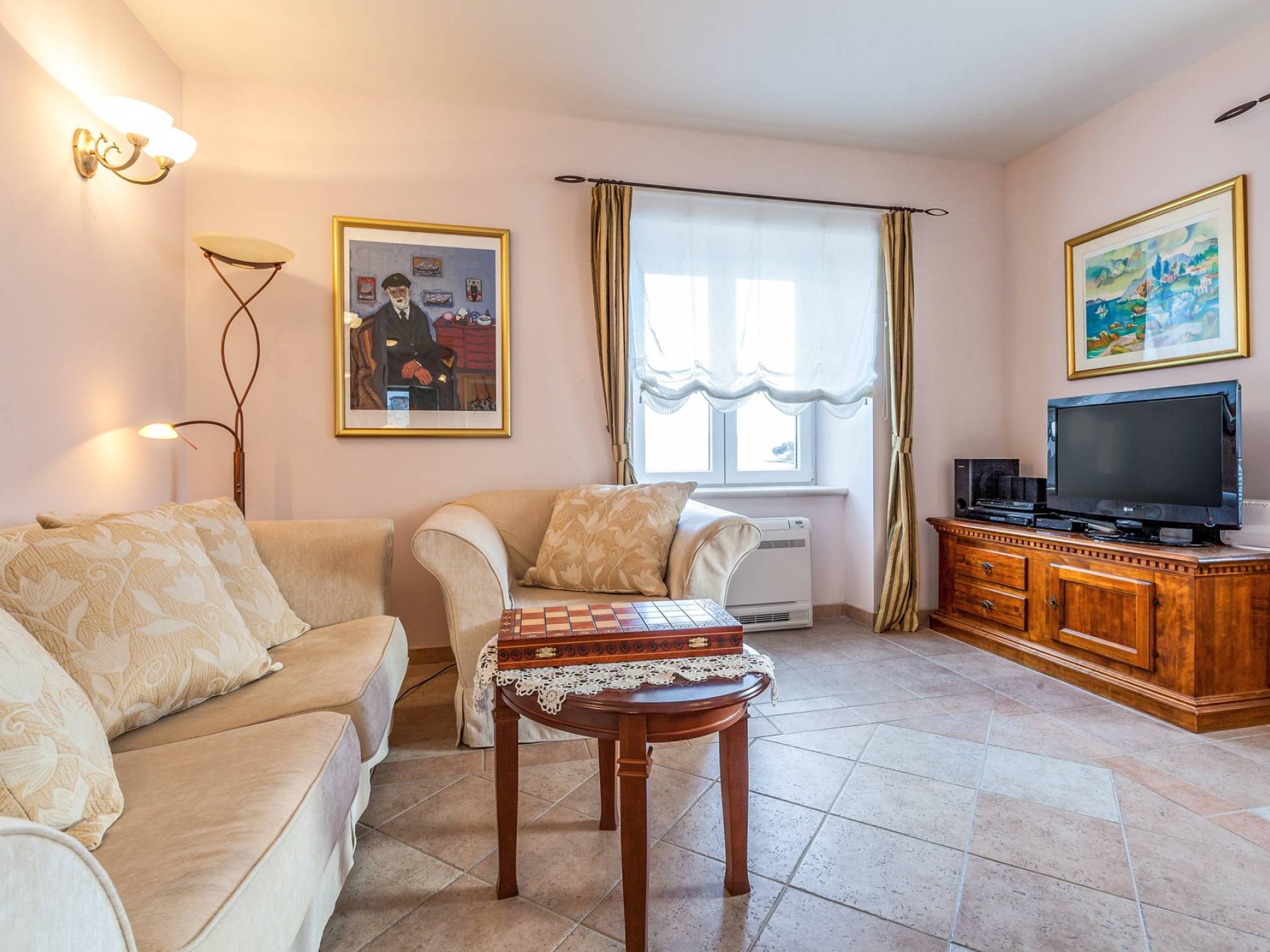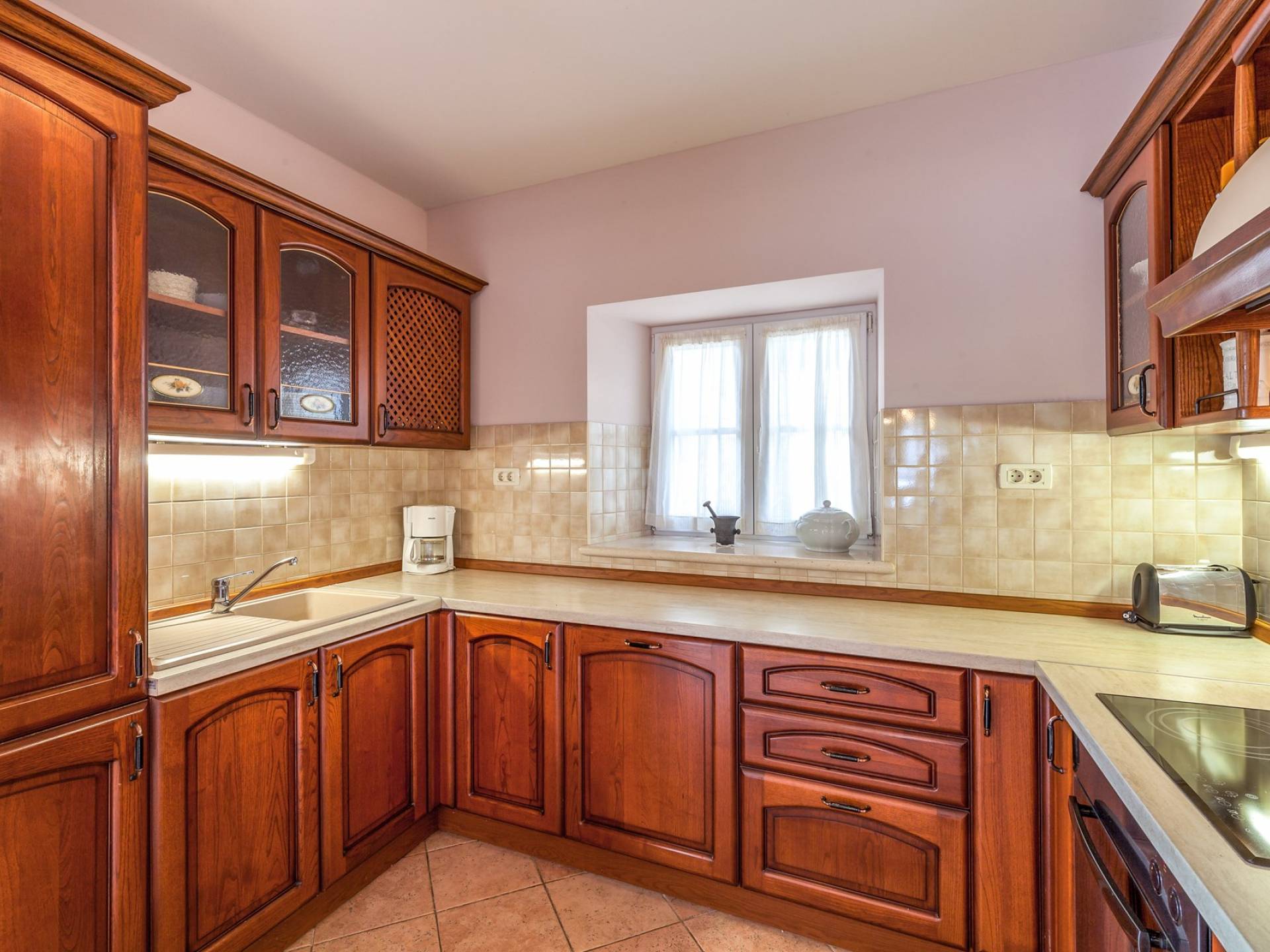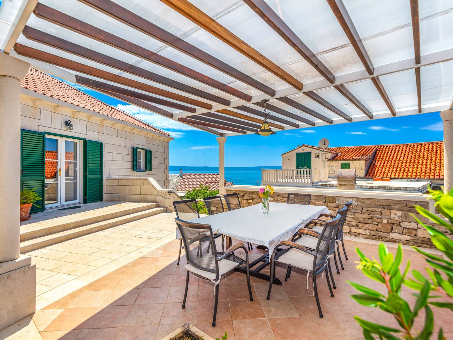 Durch das Wohnzimmer gelangen Sie auf die große, offene Terrasse, auf der sich ein Swimmingpool und eine Liegewiese befinden. Es gibt auch einen großen, schattigen Essbereich mit einem Außengrill, so dass Sie im Freien kochen und essen können und die friedliche kroatische Umgebung genießen. Seitlich der Terrasse befinden sich weitere Sitzgelegenheiten.