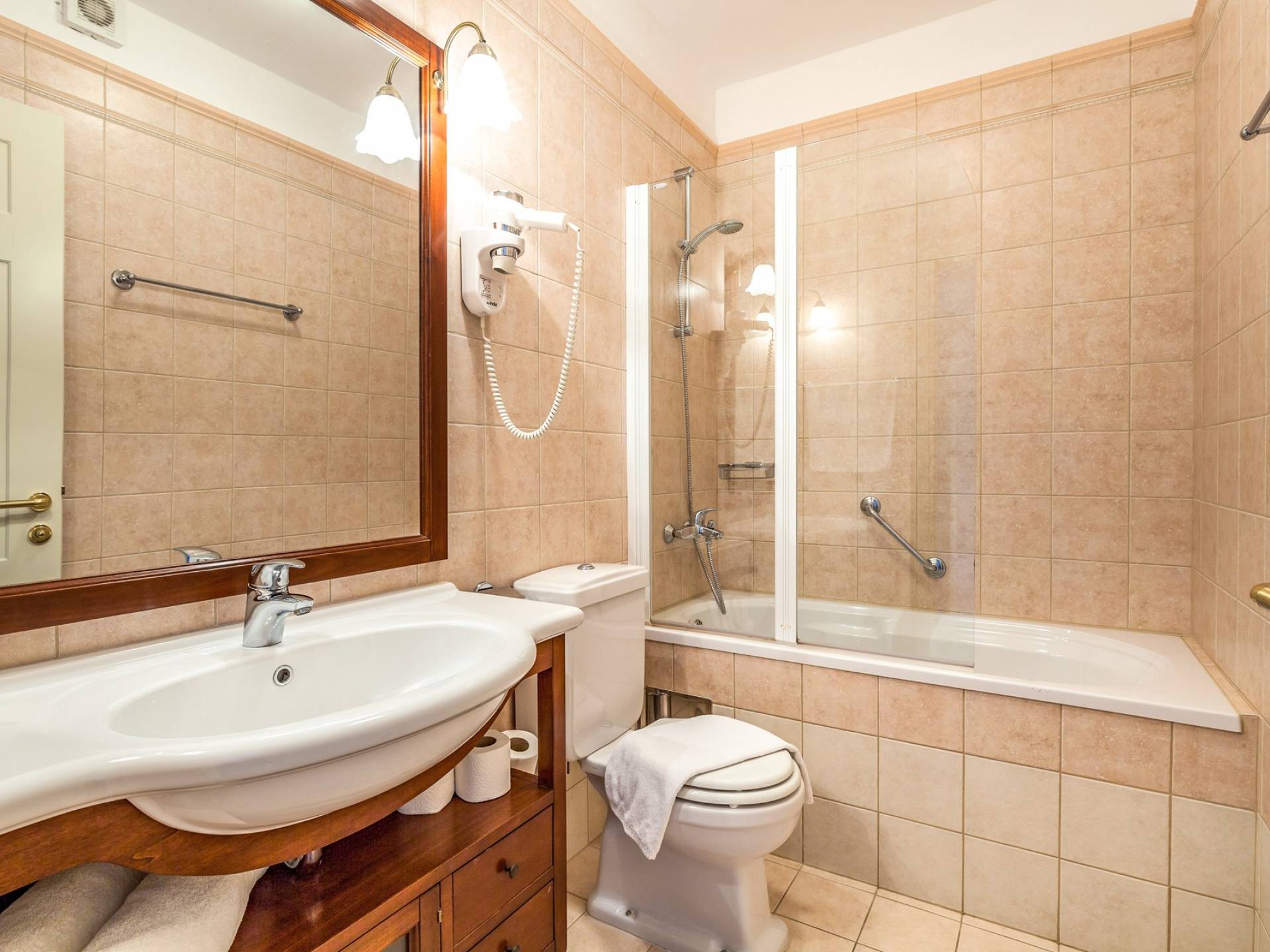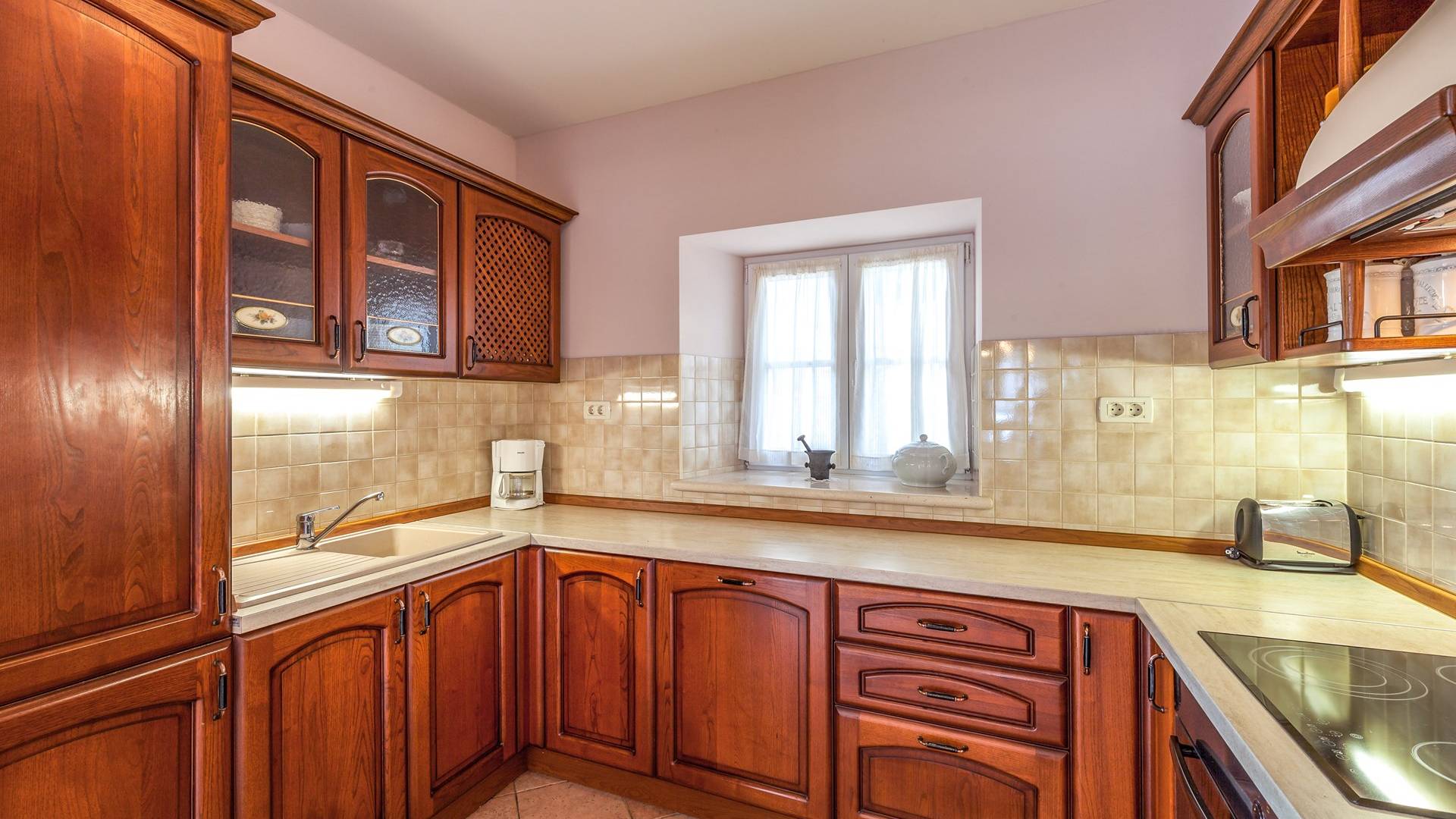 Im Erdgeschoss der Villa befinden sich eine Küche, ein Esszimmer und ein Wohnzimmer in einem großen, offenen Raum, der sich zur Terrasse hin öffnet. Das Wohnzimmer verfügt über bequeme Sofas und Fernseher sowie einen Schreibtisch, falls Sie ihn brauchen. Die Küche ist eine traditionelle Holzküche, die mit allem ausgestattet ist, was Sie während Ihres Aufenthalts benötigen, um hausgemachte Mahlzeiten zuzubereiten.