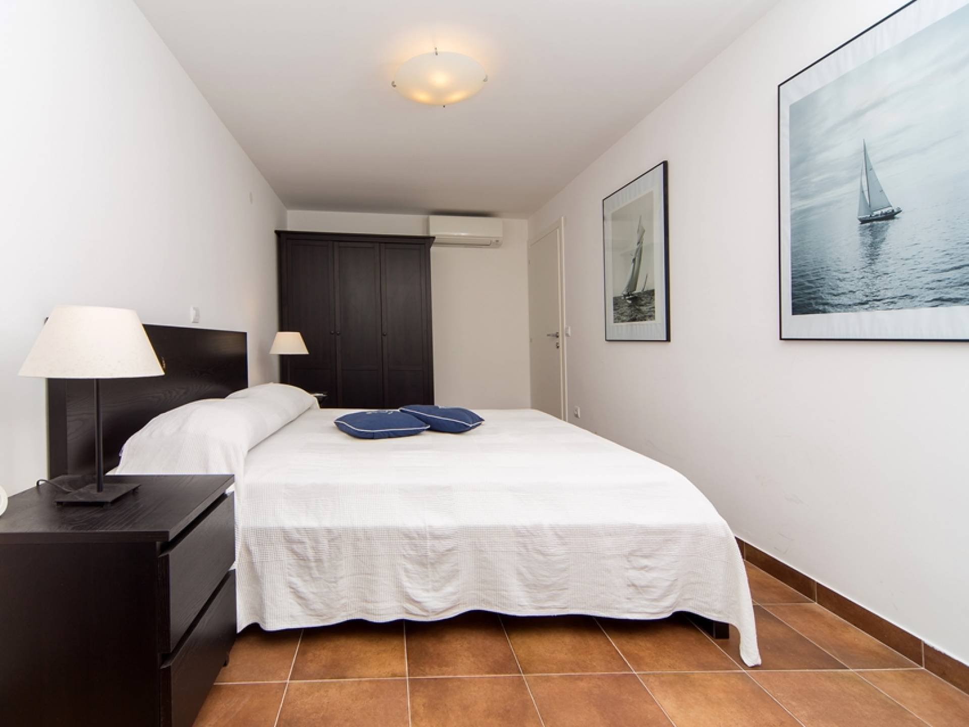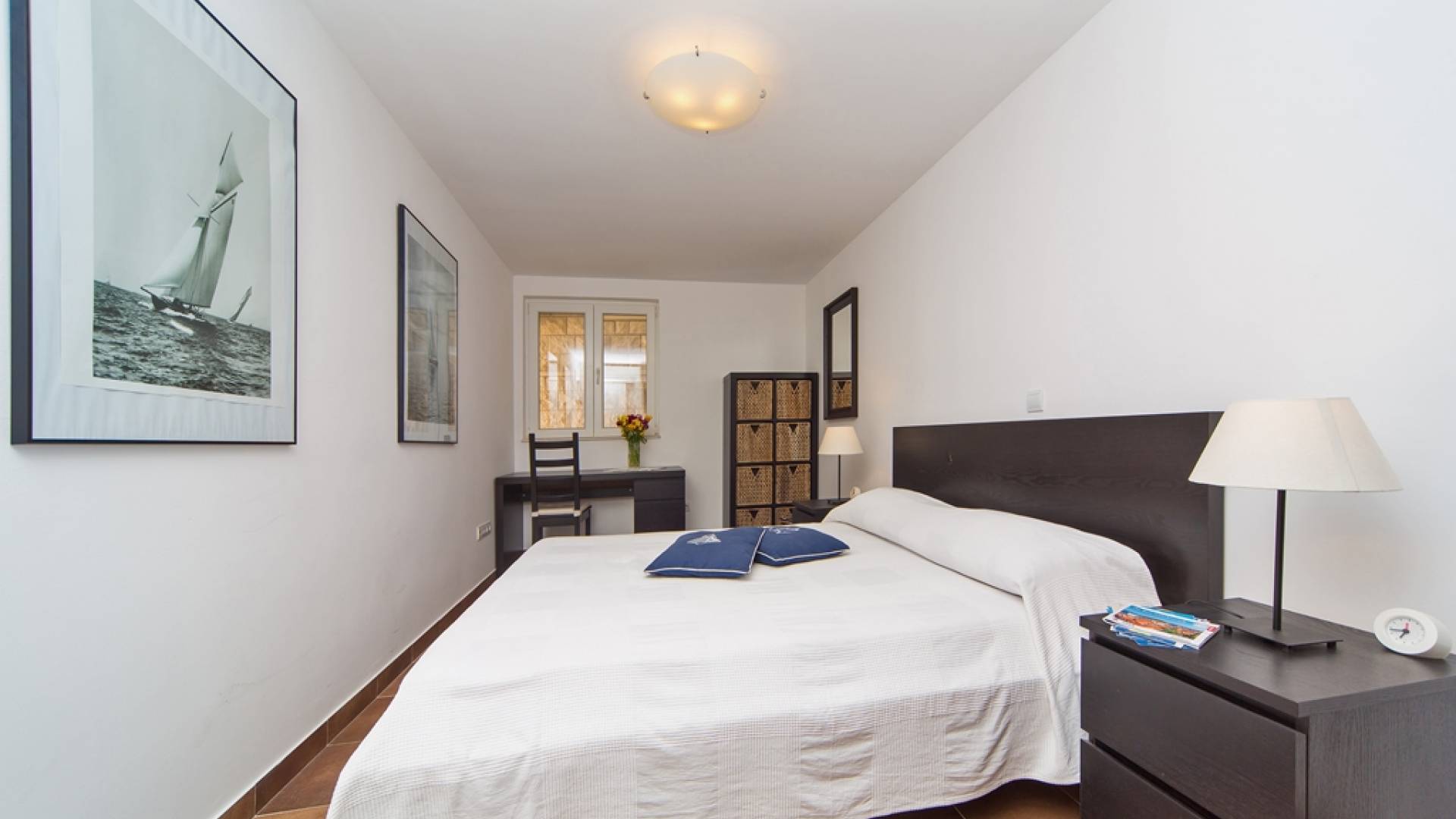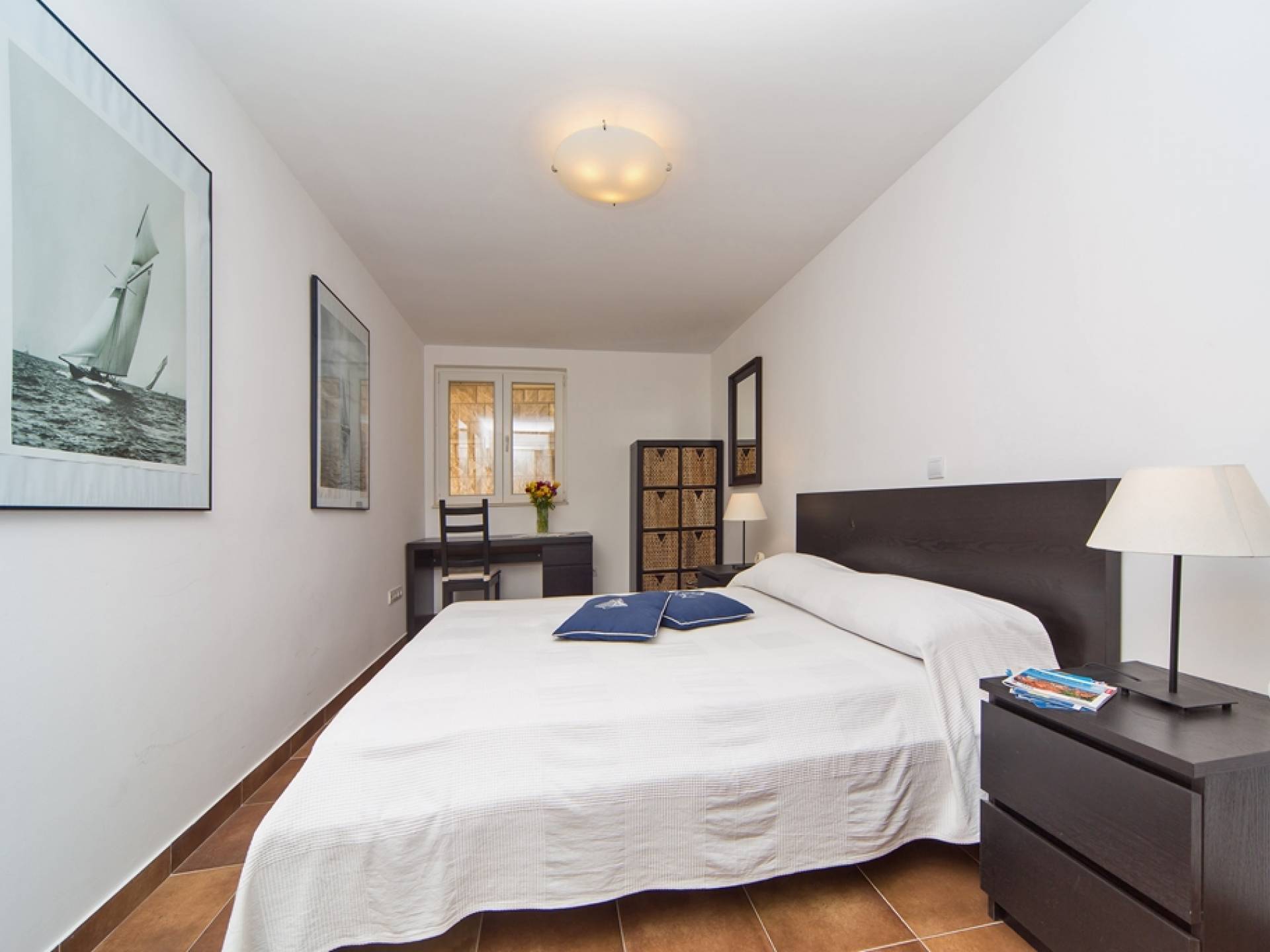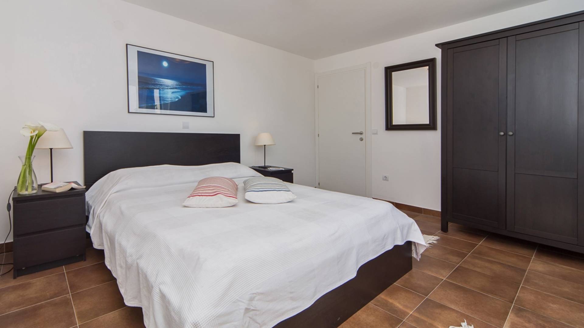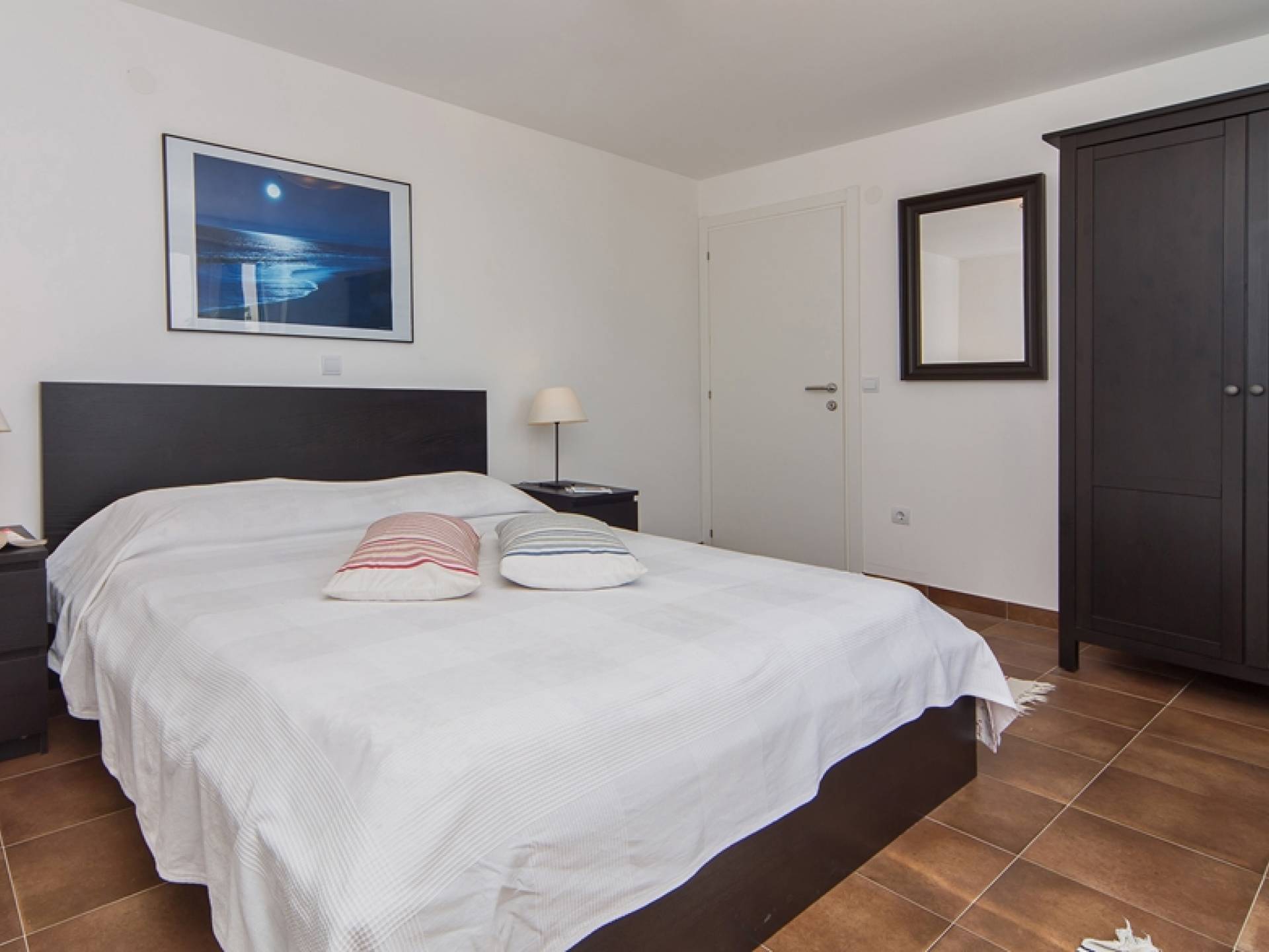 Das Erdgeschoss besteht aus 3 Schlafzimmern (zwei mit Doppelbetten und eines mit 2 Einzelbetten). Es gibt auch ein Badezimmer mit Dusche und eine separate Waschküche. Die vordere Terrasse ist mit bequemen Gartenmöbeln und Sonnenschirmen ausgestattet.