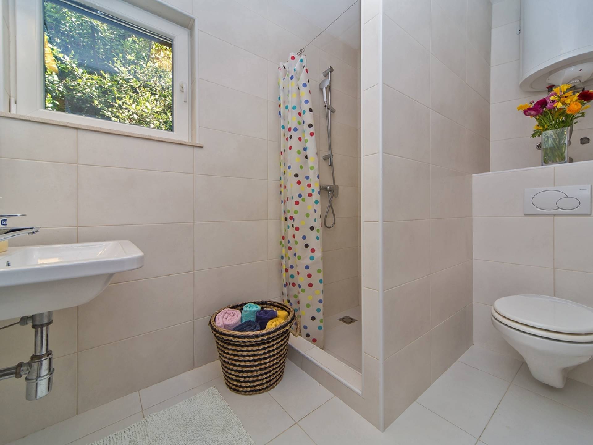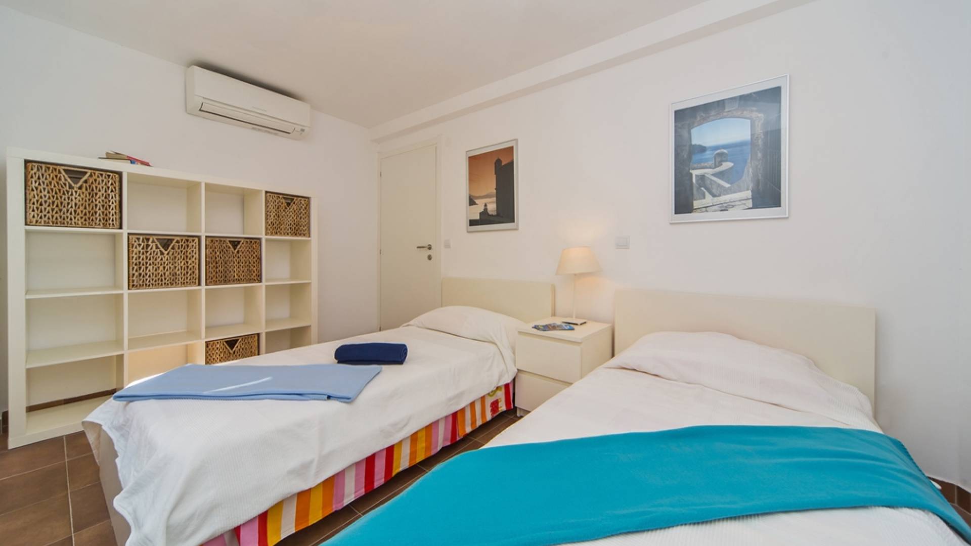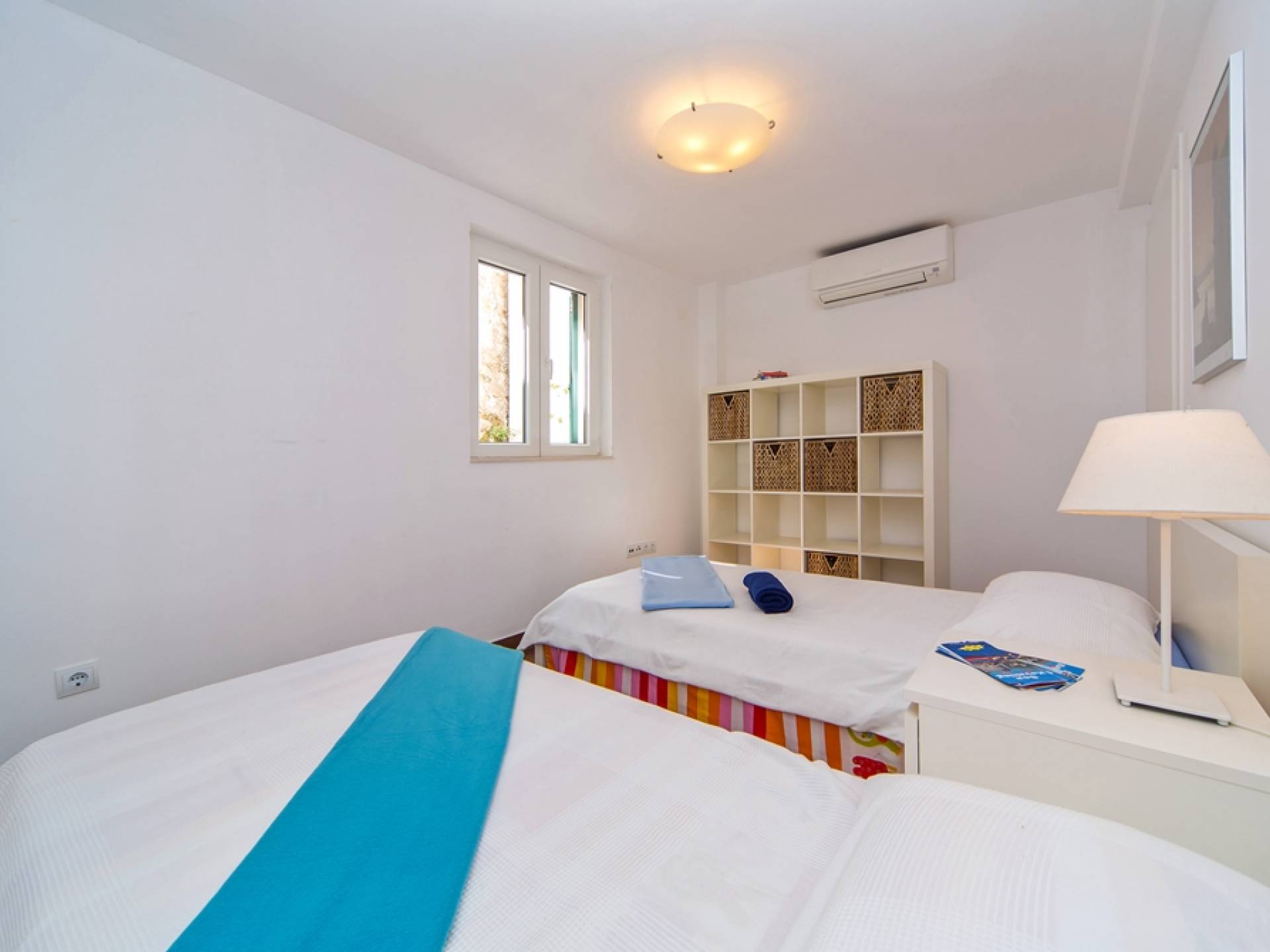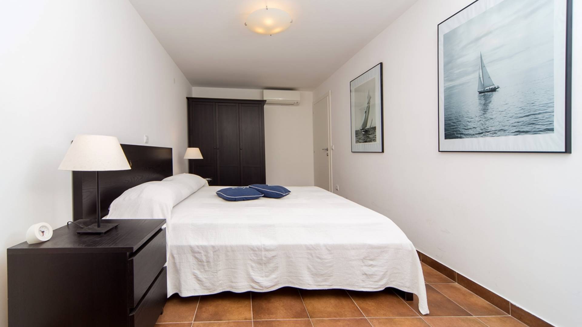 Das Erdgeschoss besteht aus 3 Schlafzimmern (zwei mit Doppelbetten und eines mit 2 Einzelbetten). Es gibt auch ein Badezimmer mit Dusche und eine separate Waschküche. Die vordere Terrasse ist mit bequemen Gartenmöbeln und Sonnenschirmen ausgestattet.
