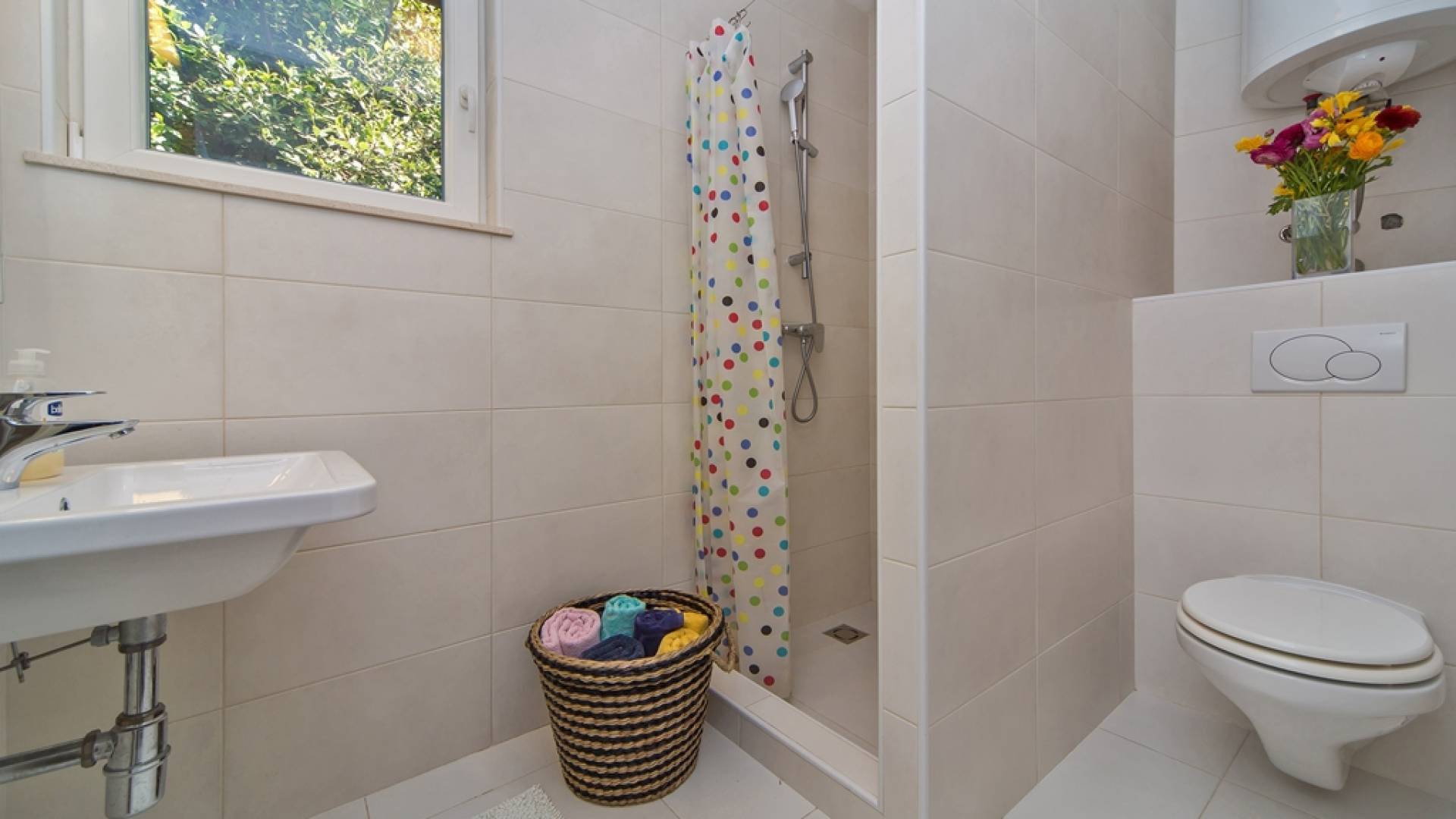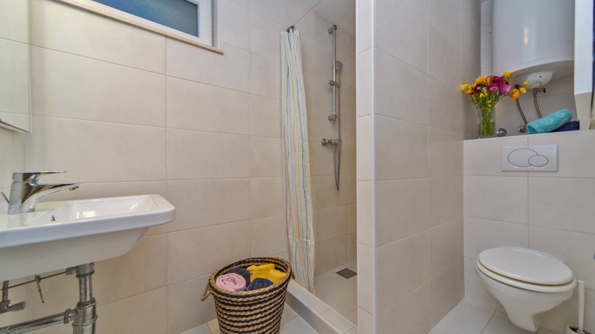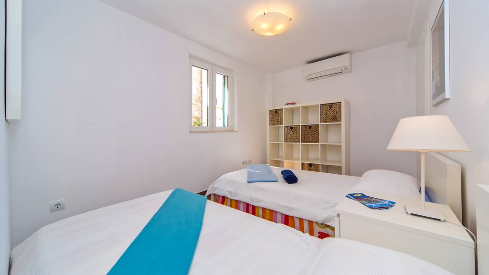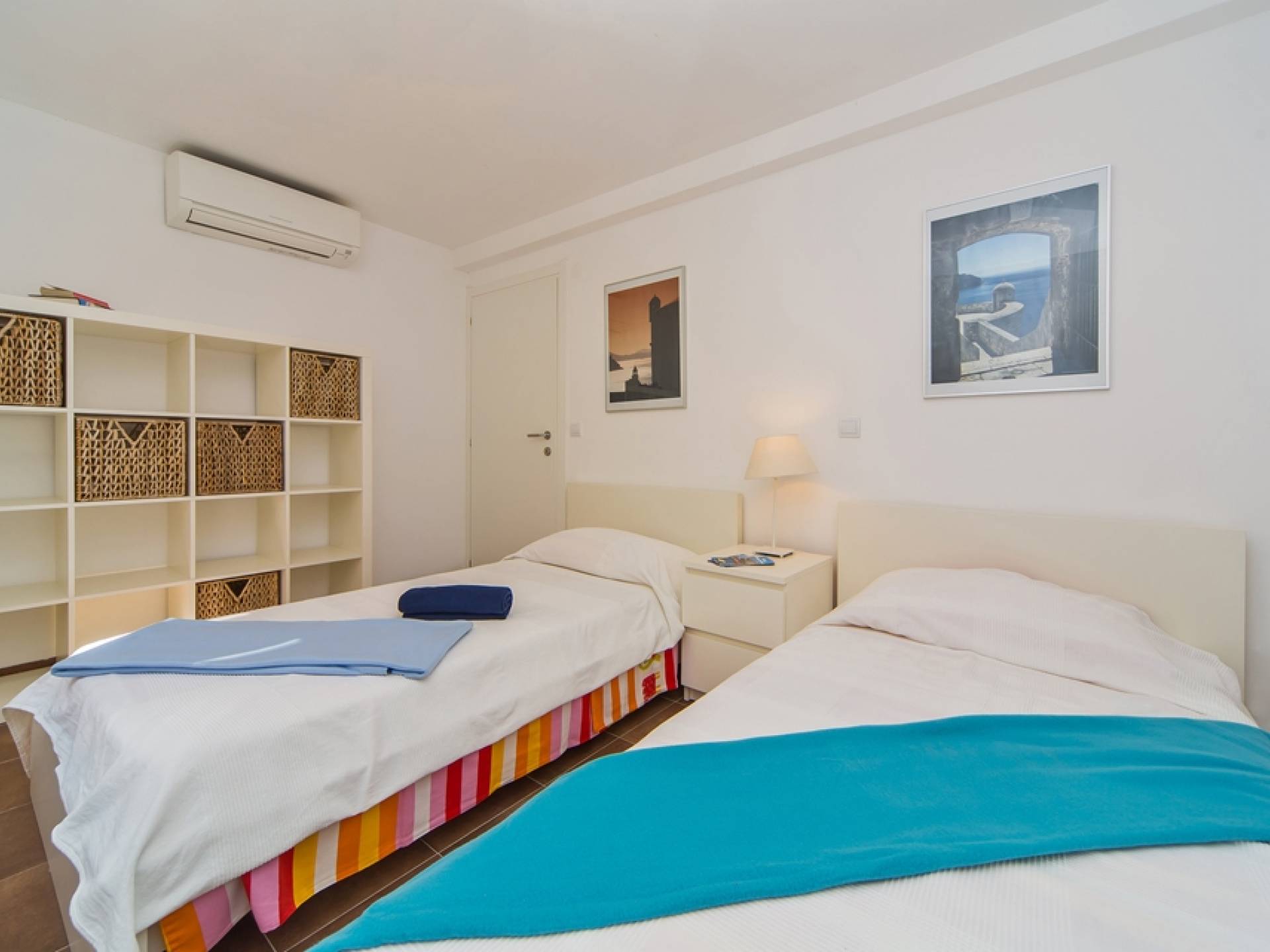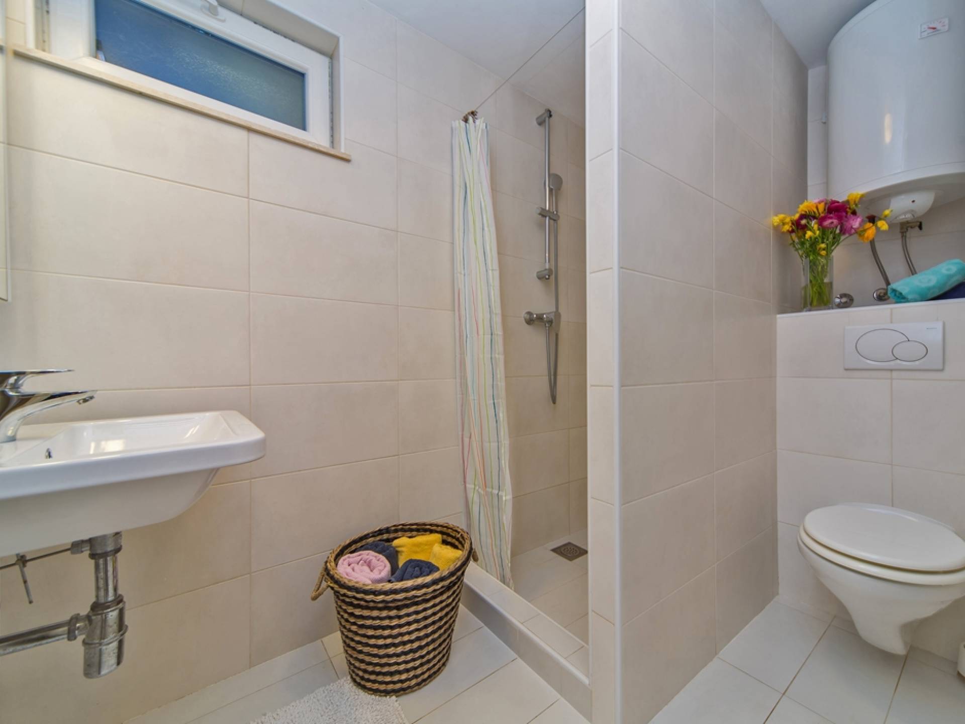 Das Erdgeschoss besteht aus 3 Schlafzimmern (zwei mit Doppelbetten und eines mit 2 Einzelbetten). Es gibt auch ein Badezimmer mit Dusche und eine separate Waschküche. Die vordere Terrasse ist mit bequemen Gartenmöbeln und Sonnenschirmen ausgestattet.