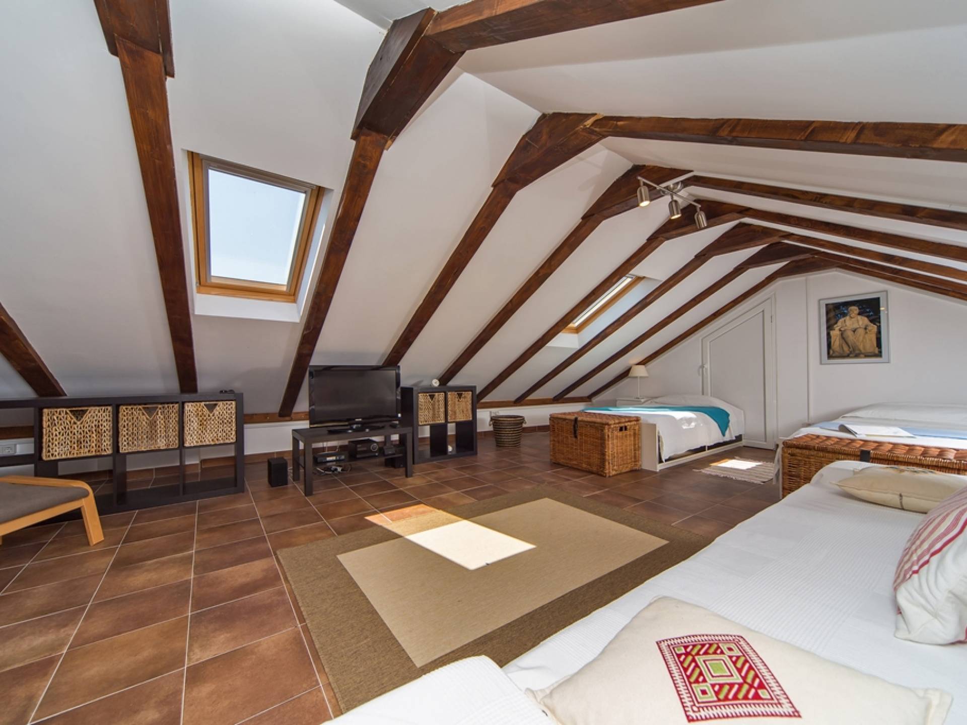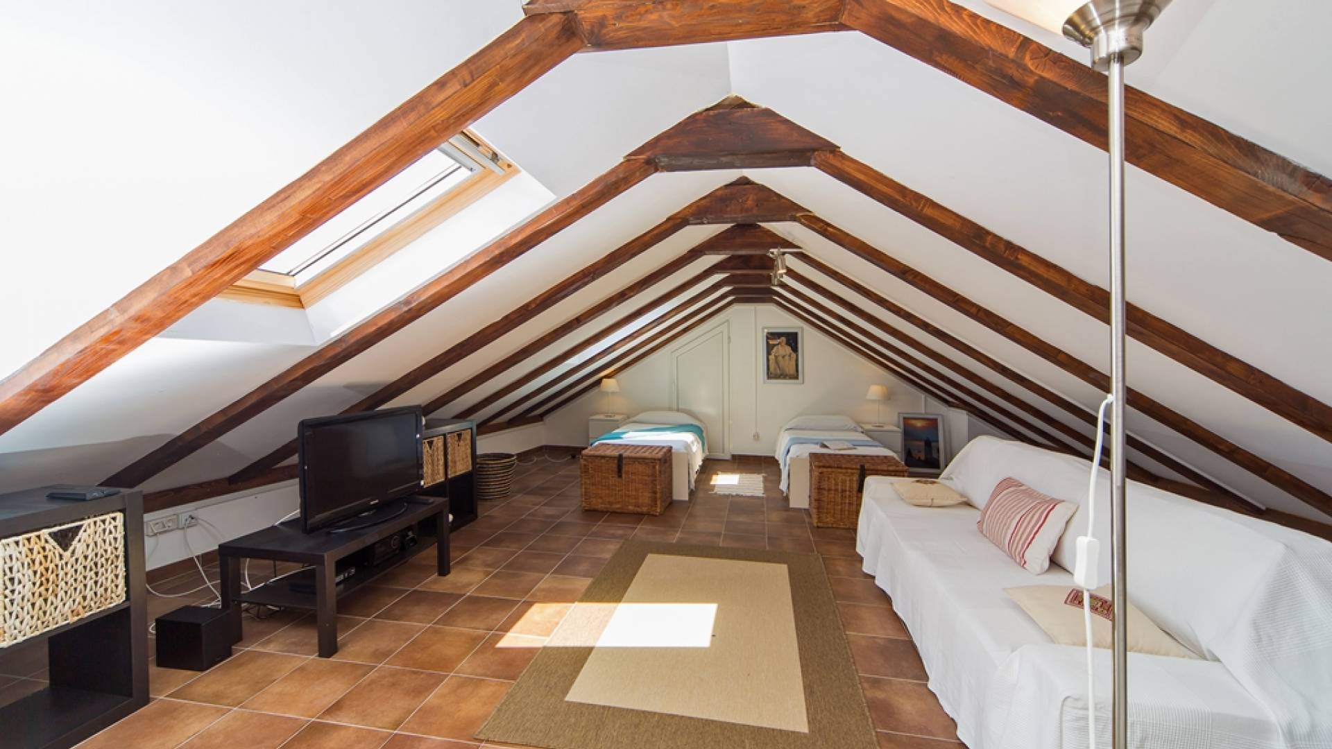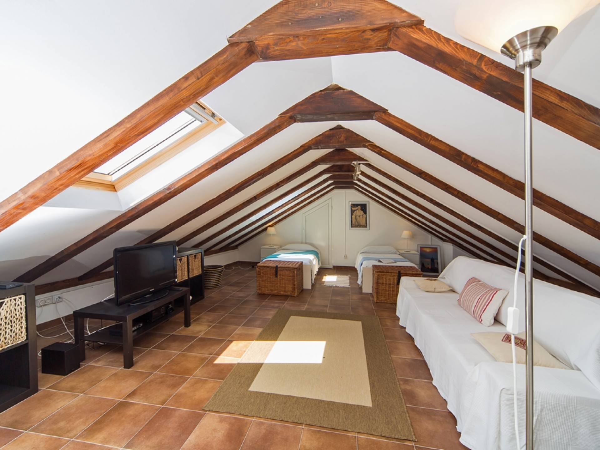 Der Dachboden ist als großzügiger offener Bereich mit zwei Einzelbetten auf der einen Seite und Wohnraum mit einer Schlafcouch auf der anderen Seite gehalten. Das Schlafsofa kann in ein Doppelbett in voller Größe umgewandelt werden.