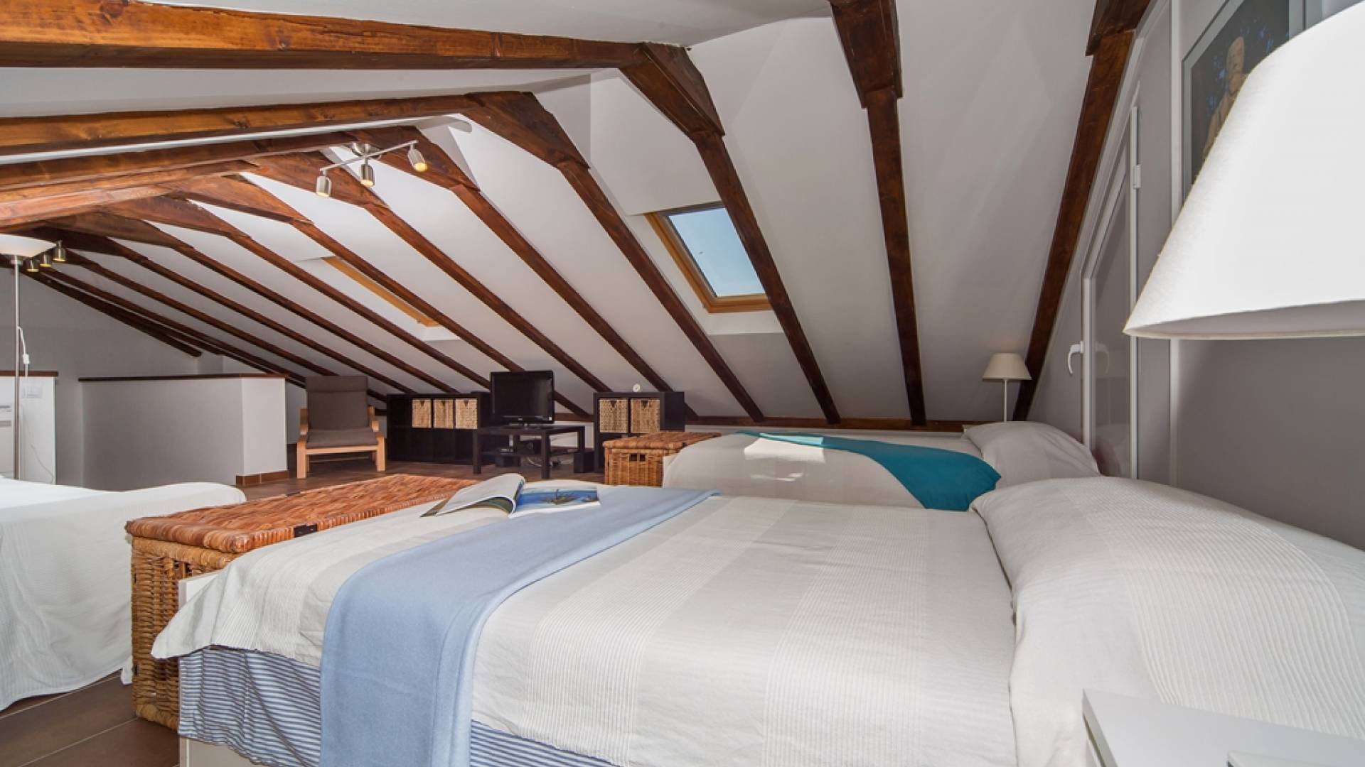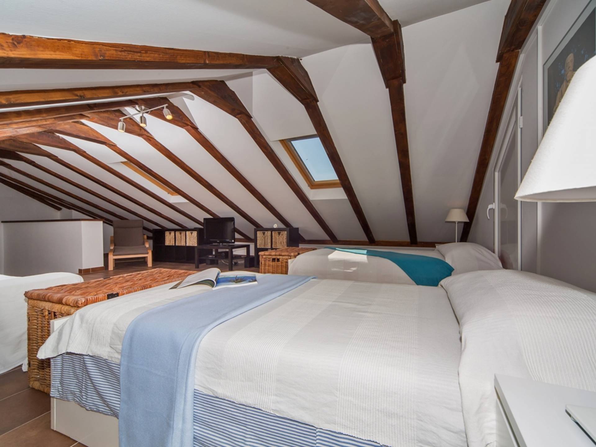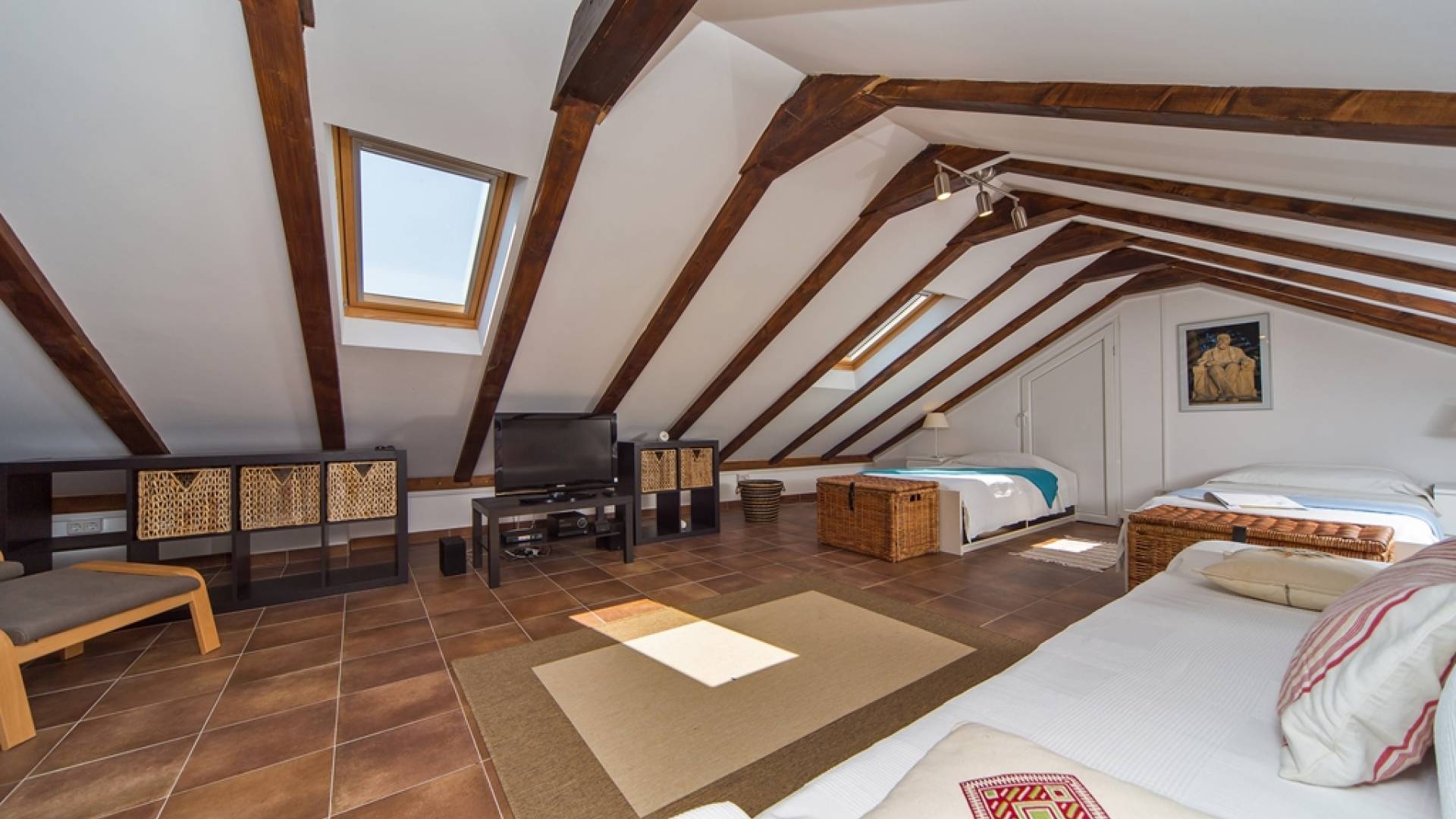 Der Dachboden ist als großzügiger offener Bereich mit zwei Einzelbetten auf der einen Seite und Wohnraum mit einer Schlafcouch auf der anderen Seite gehalten. Das Schlafsofa kann in ein Doppelbett in voller Größe umgewandelt werden.