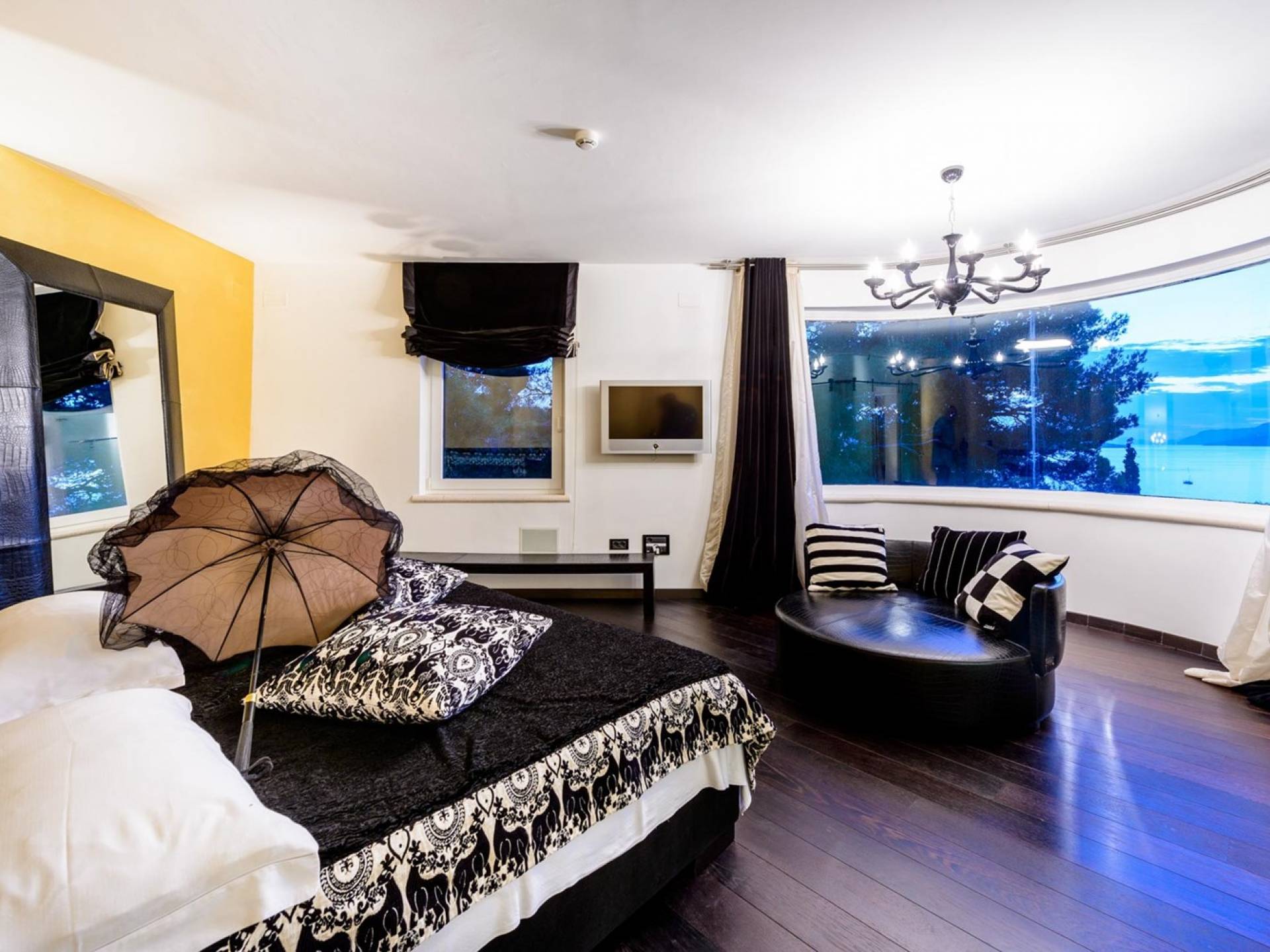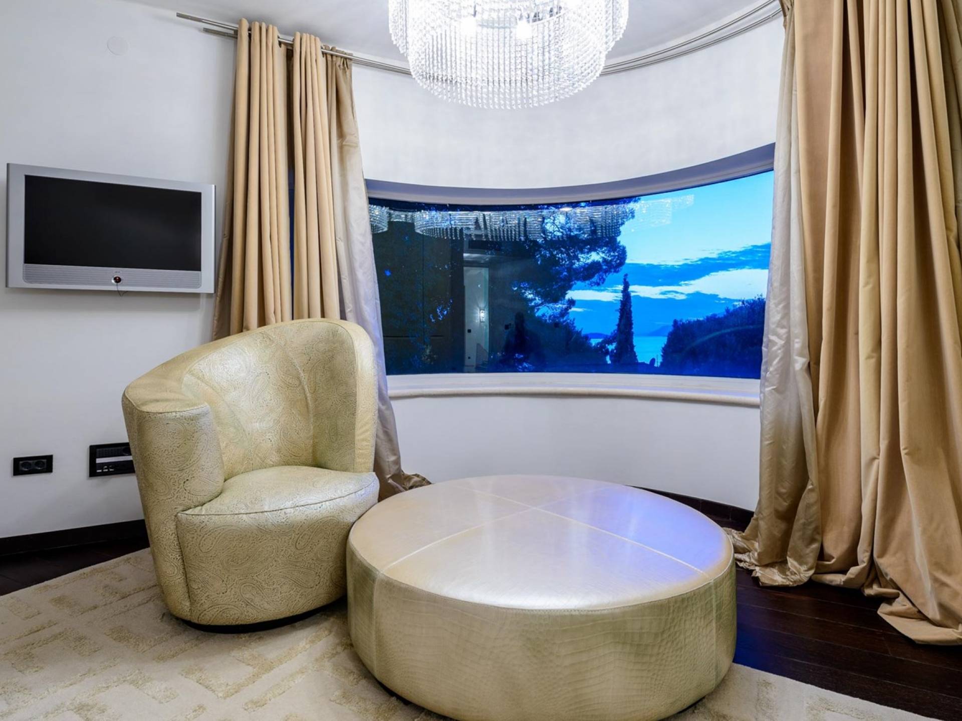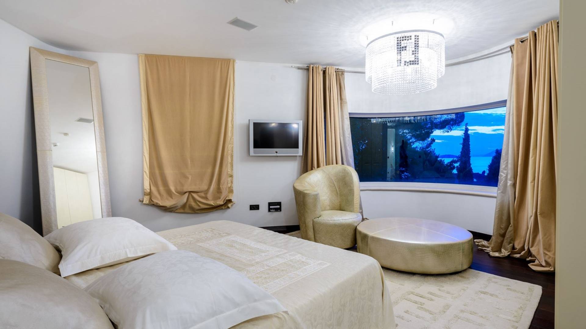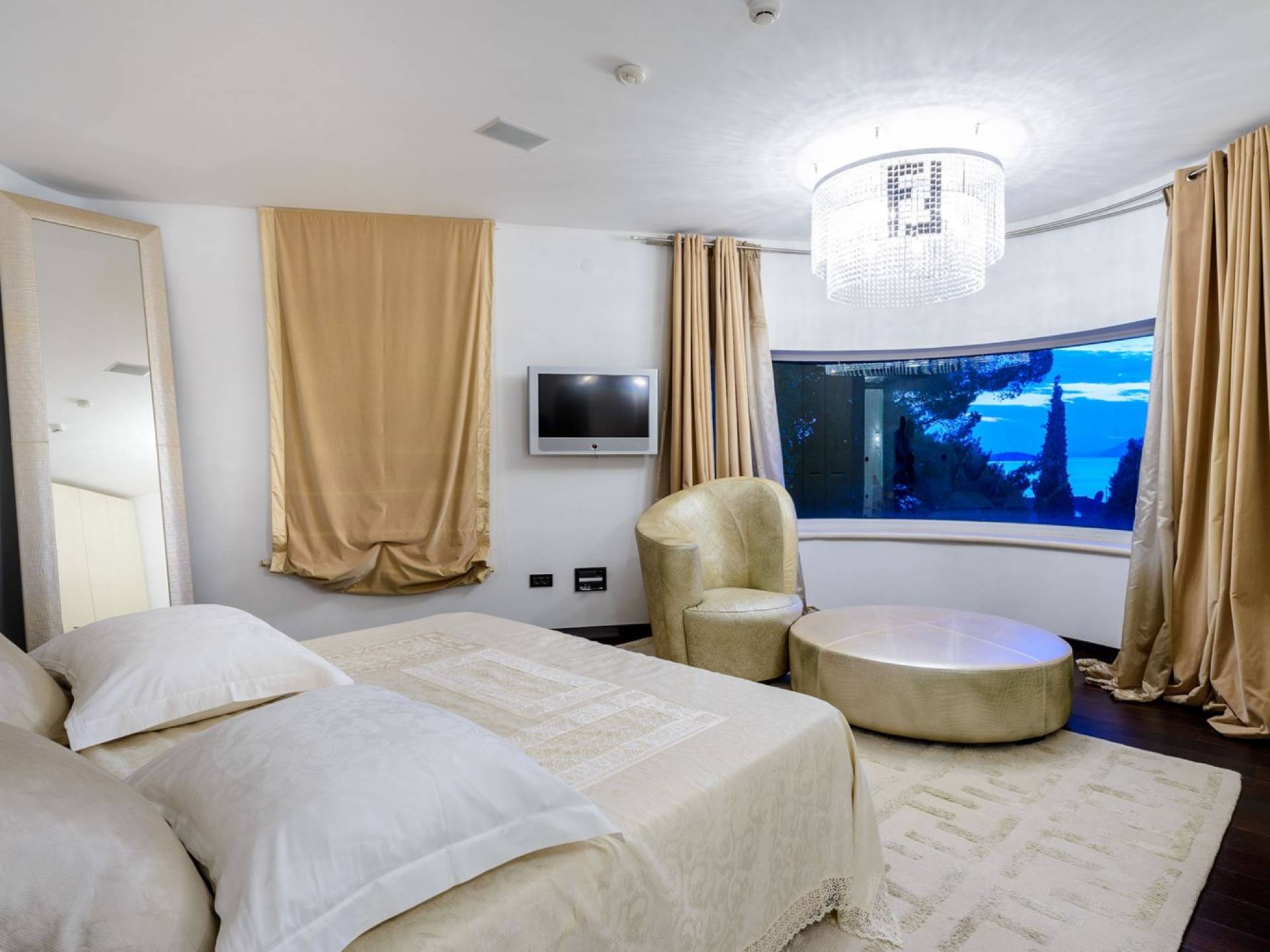 Das Erdgeschoss der Villa Royal Dubrovnik ist mit Innentreppen aus Marmor mit dem großzügigen Erholungsbereich verbunden. Die beiden Zimmer mit Doppelbetten befinden sich im ersten Stock; Ein Schlafzimmer hat auch Sitzmöbel zum Entspannen. Das zweite Zimmer verfügt ebenfalls über ein Designer-Doppelbett und ein modern ausgestattetes Badezimmer mit Dusche. Von diesem Raum gibt es einen Ausgang auf die schöne Terrasse voller Sonnenschein. Auf dieser Etage gibt es auch ein modernes Badezimmer mit Whirlpool und ein weiteres Zimmer mit einem modernen und Designer-Sofa, das als Bett genutzt werden kann. Auf der zweiten Etage der Villa Royal Dubrovnik gibt es ein Hauptschlafzimmer mit eigenem Bad und ein großes Wohnzimmer mit Terrasse und herrlichem Blick auf das offene Meer. Vom Wohnzimmer gibt es einen Ausgang zur Terrasse mit Swimmingpool. Die Terrasse mit Swimmingpool ist geräumig, vor Blicken geschützt, umgeben von mediterranen Bäumen und Pflanzen. Dieses elegante Schwimmbad mit eigenem Wasserfall, Wassermassage und Geysir-Optionen wartet darauf, von Ihnen in absoluter Privatsphäre genossen zu werden.
