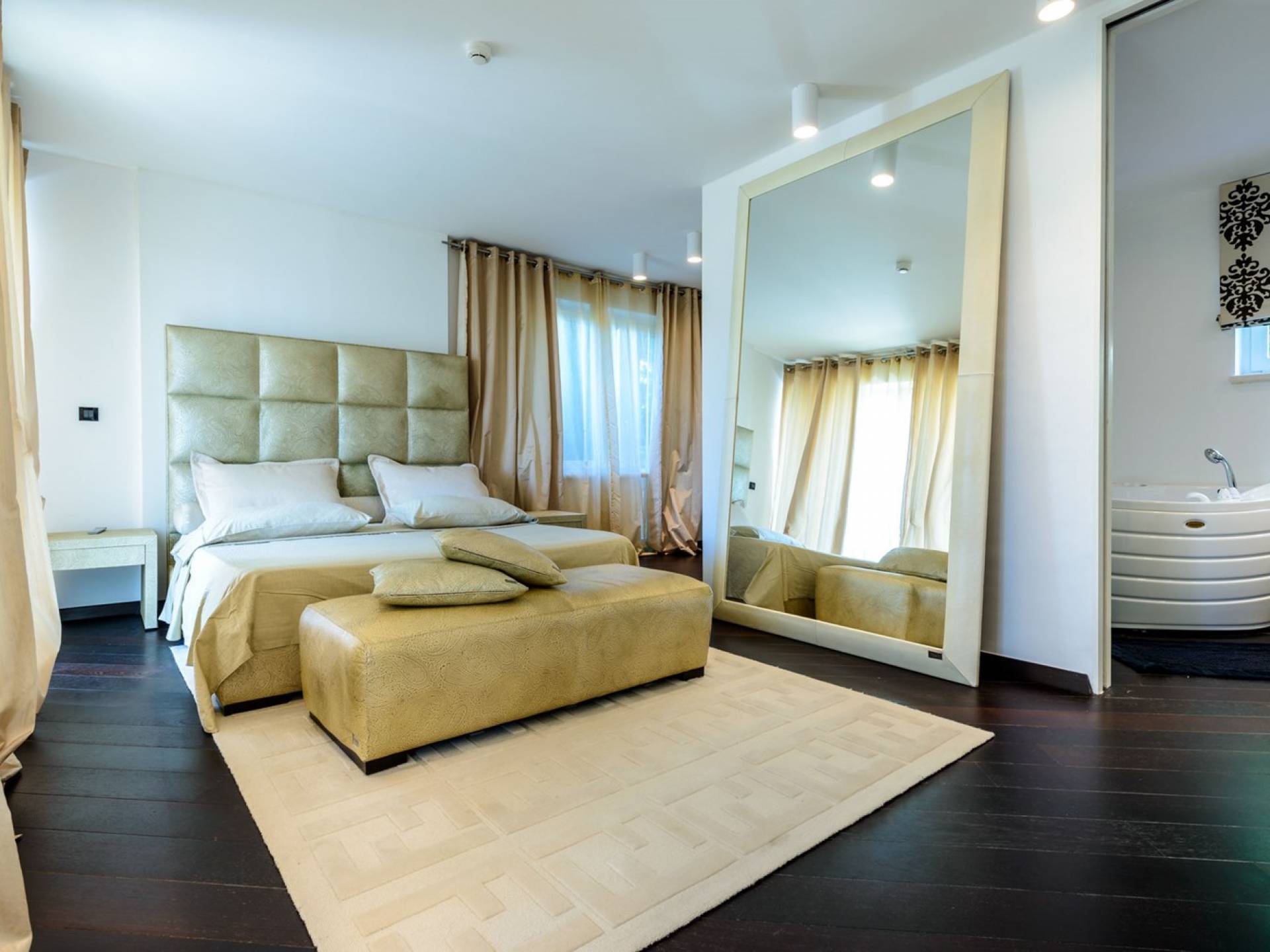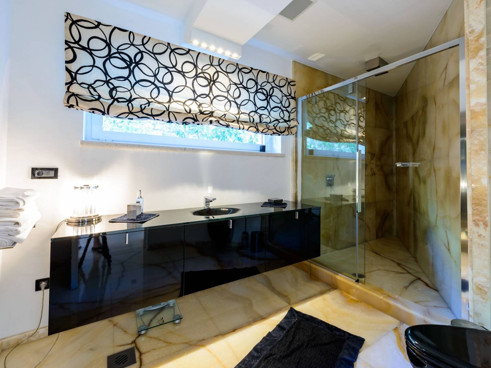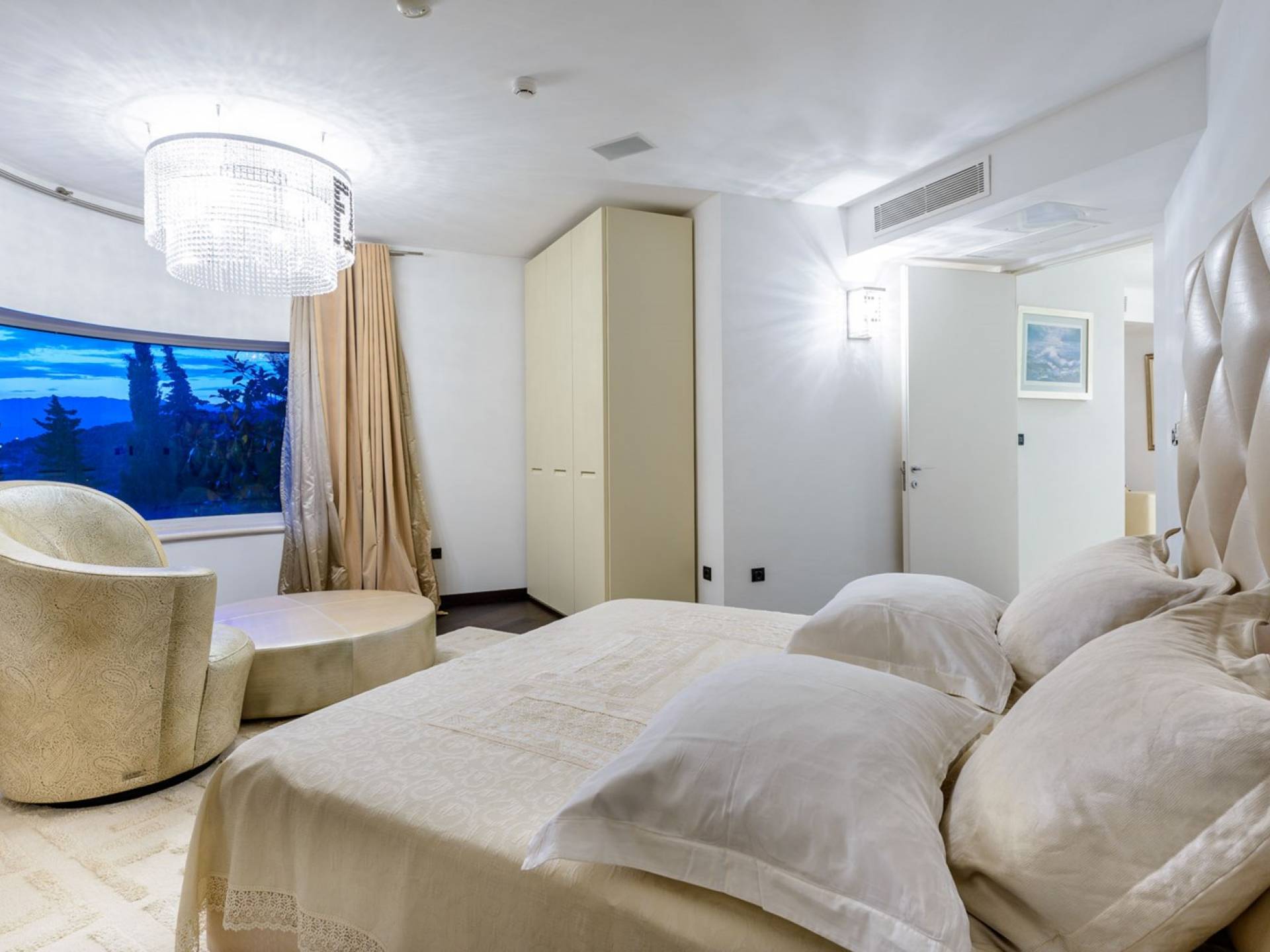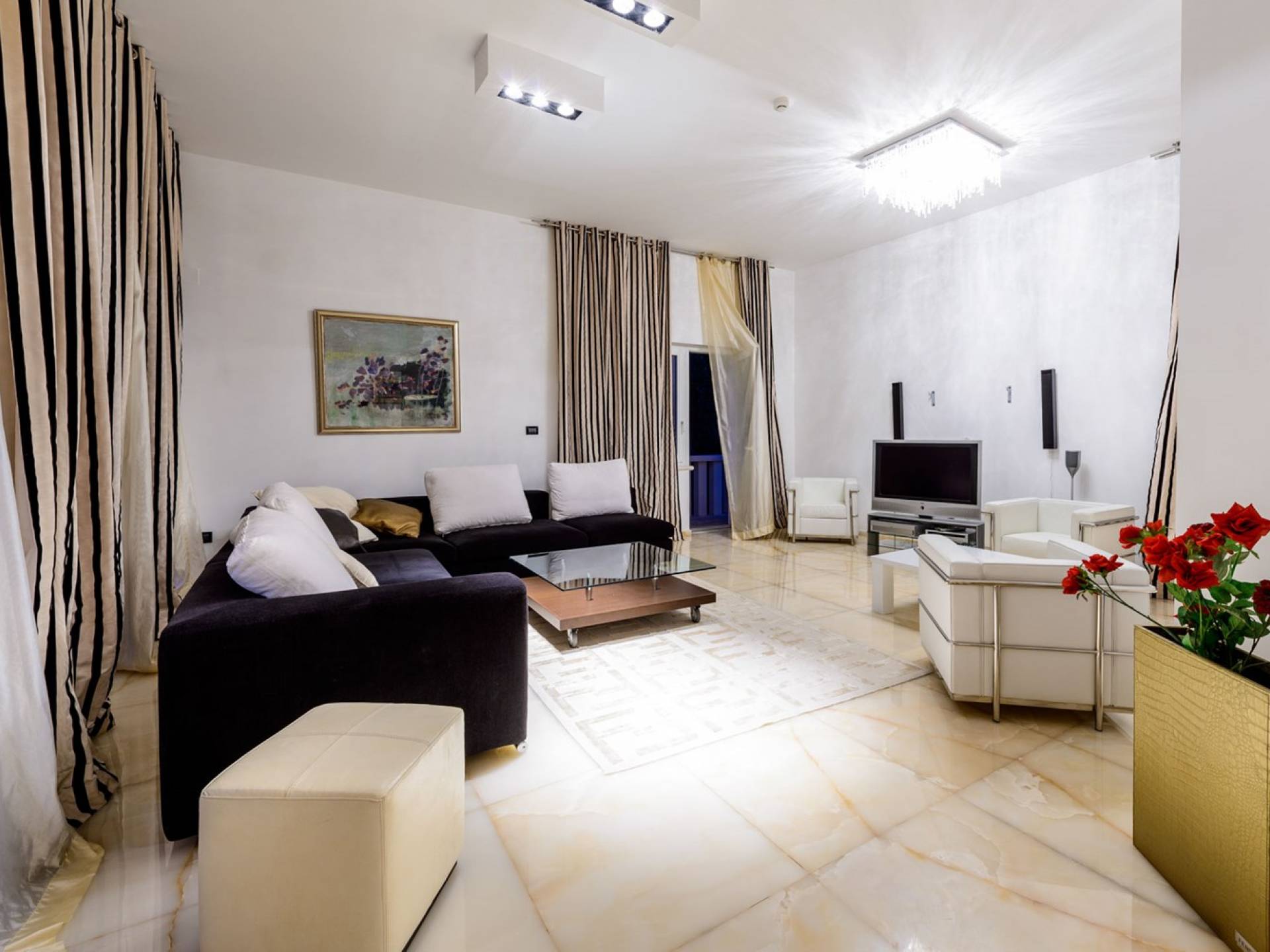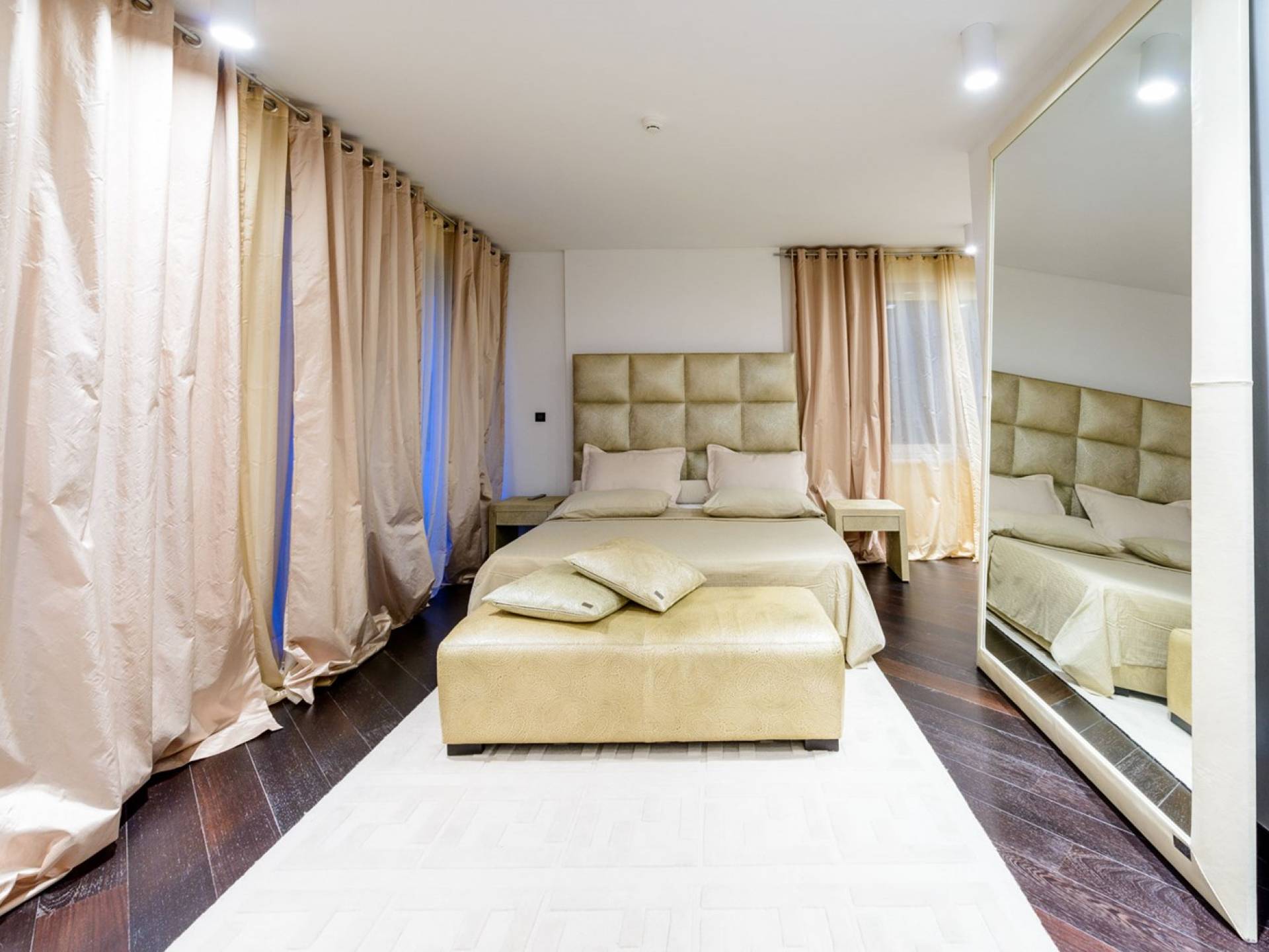 Das Erdgeschoss der Villa Royal Dubrovnik ist mit Innentreppen aus Marmor mit dem großzügigen Erholungsbereich verbunden. Die beiden Zimmer mit Doppelbetten befinden sich im ersten Stock; Ein Schlafzimmer hat auch Sitzmöbel zum Entspannen. Das zweite Zimmer verfügt ebenfalls über ein Designer-Doppelbett und ein modern ausgestattetes Badezimmer mit Dusche. Von diesem Raum gibt es einen Ausgang auf die schöne Terrasse voller Sonnenschein. Auf dieser Etage gibt es auch ein modernes Badezimmer mit Whirlpool und ein weiteres Zimmer mit einem modernen und Designer-Sofa, das als Bett genutzt werden kann. Auf der zweiten Etage der Villa Royal Dubrovnik gibt es ein Hauptschlafzimmer mit eigenem Bad und ein großes Wohnzimmer mit Terrasse und herrlichem Blick auf das offene Meer. Vom Wohnzimmer gibt es einen Ausgang zur Terrasse mit Swimmingpool. Die Terrasse mit Swimmingpool ist geräumig, vor Blicken geschützt, umgeben von mediterranen Bäumen und Pflanzen. Dieses elegante Schwimmbad mit eigenem Wasserfall, Wassermassage und Geysir-Optionen wartet darauf, von Ihnen in absoluter Privatsphäre genossen zu werden.