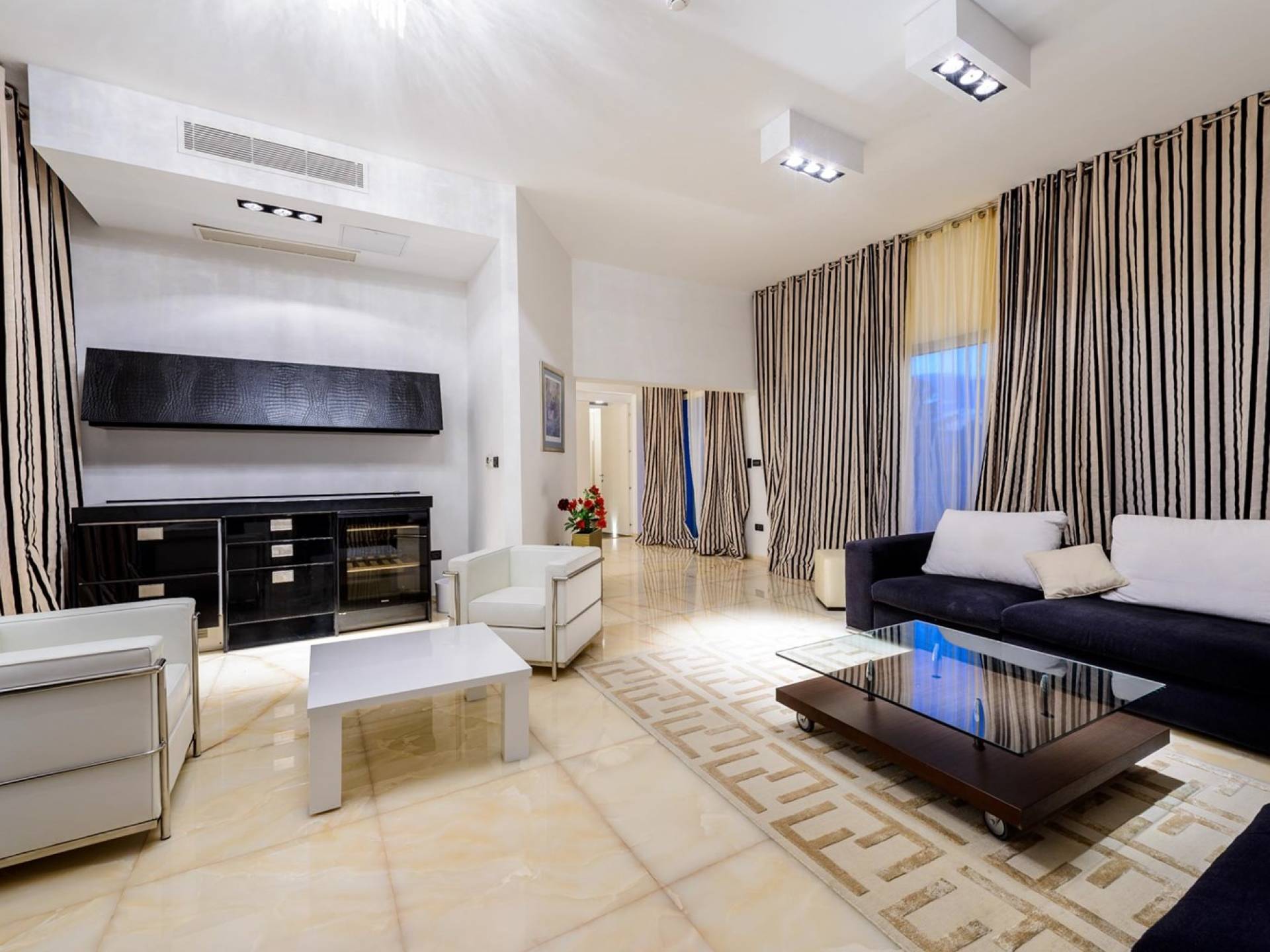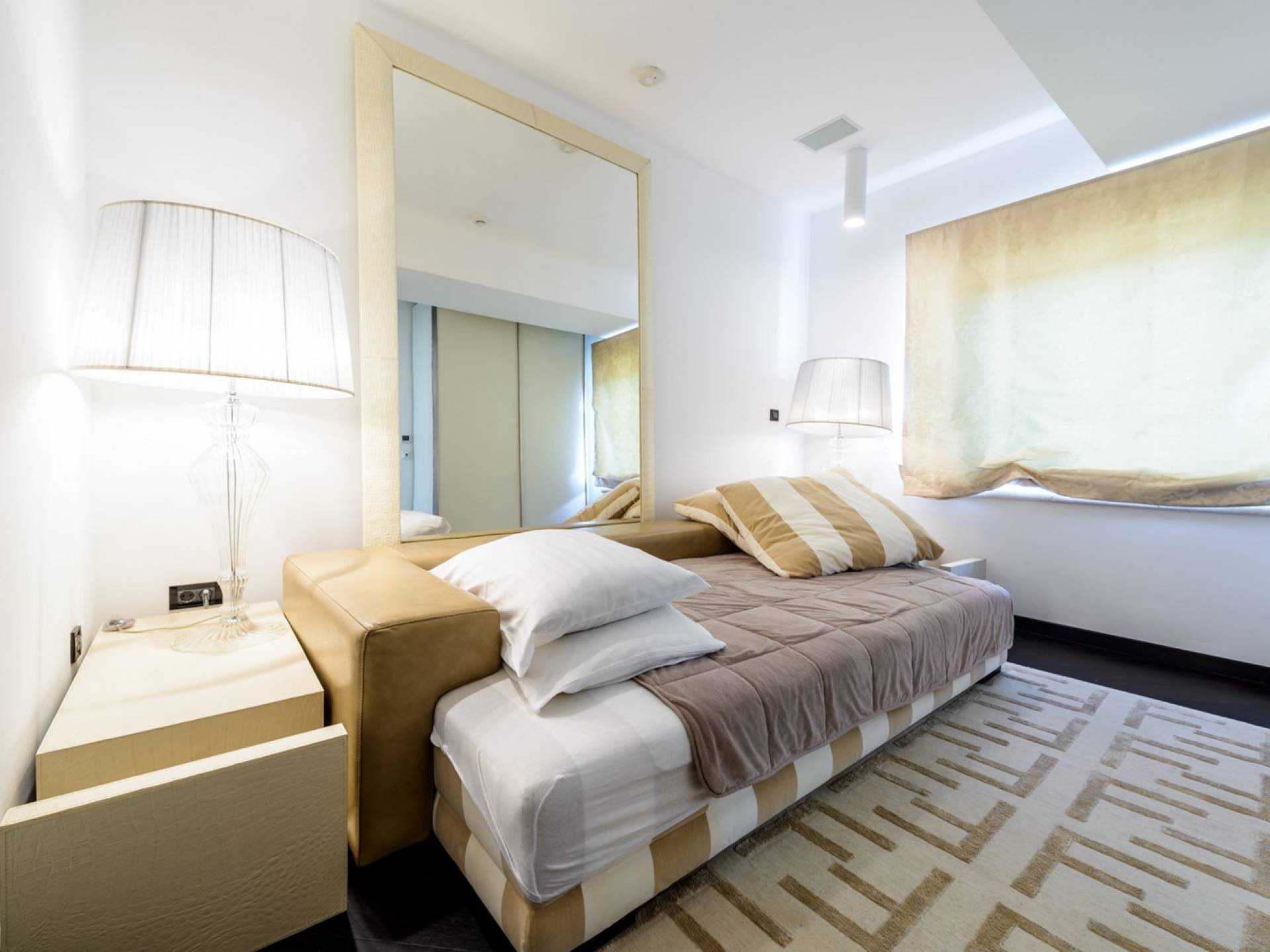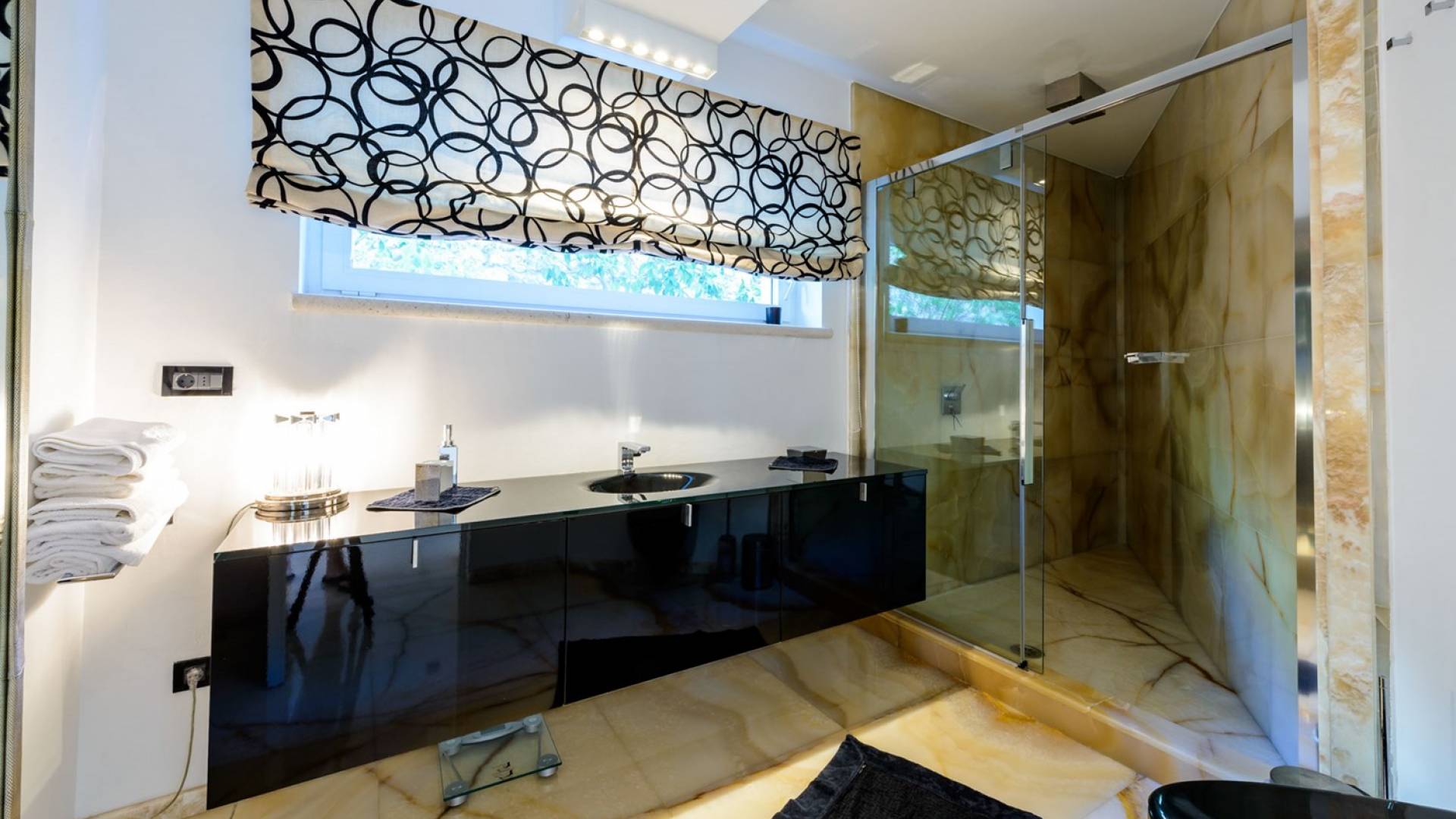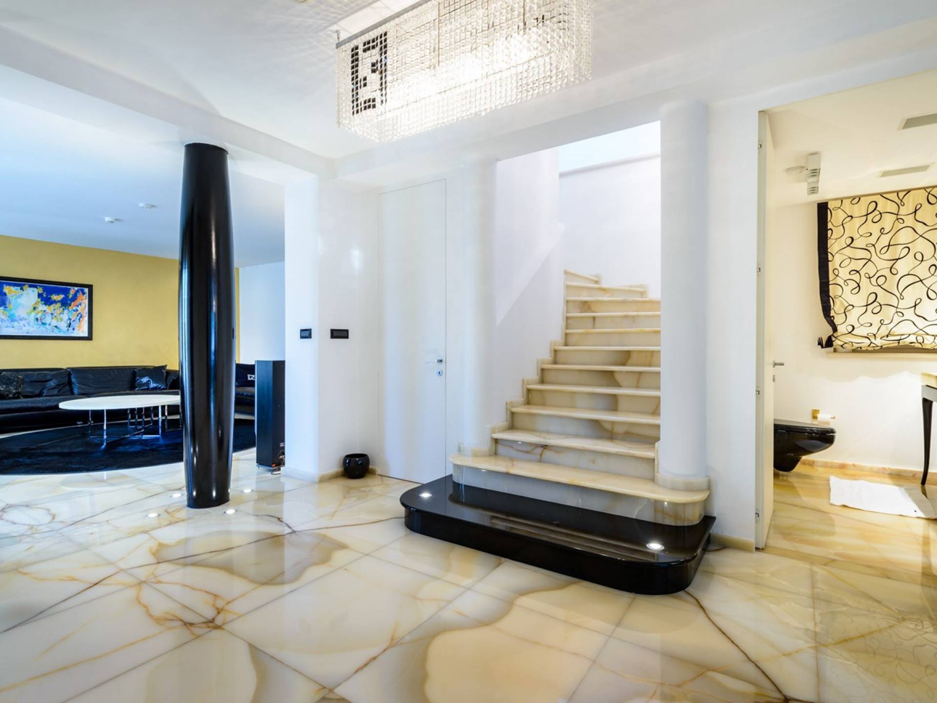 Das Erdgeschoss der Villa Royal Dubrovnik ist mit Innentreppen aus Marmor mit dem großzügigen Erholungsbereich verbunden. Die beiden Zimmer mit Doppelbetten befinden sich im ersten Stock; Ein Schlafzimmer hat auch Sitzmöbel zum Entspannen. Das zweite Zimmer verfügt ebenfalls über ein Designer-Doppelbett und ein modern ausgestattetes Badezimmer mit Dusche. Von diesem Raum gibt es einen Ausgang auf die schöne Terrasse voller Sonnenschein. Auf dieser Etage gibt es auch ein modernes Badezimmer mit Whirlpool und ein weiteres Zimmer mit einem modernen und Designer-Sofa, das als Bett genutzt werden kann. Auf der zweiten Etage der Villa Royal Dubrovnik gibt es ein Hauptschlafzimmer mit eigenem Bad und ein großes Wohnzimmer mit Terrasse und herrlichem Blick auf das offene Meer. Vom Wohnzimmer gibt es einen Ausgang zur Terrasse mit Swimmingpool. Die Terrasse mit Swimmingpool ist geräumig, vor Blicken geschützt, umgeben von mediterranen Bäumen und Pflanzen. Dieses elegante Schwimmbad mit eigenem Wasserfall, Wassermassage und Geysir-Optionen wartet darauf, von Ihnen in absoluter Privatsphäre genossen zu werden.