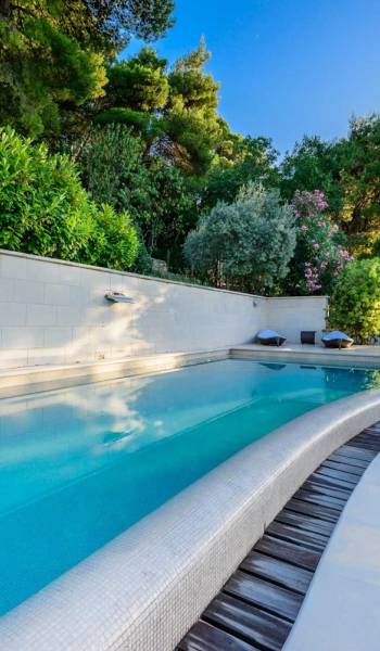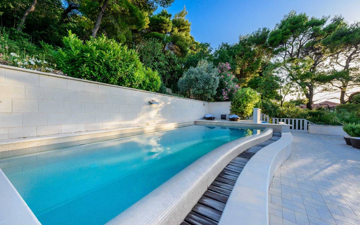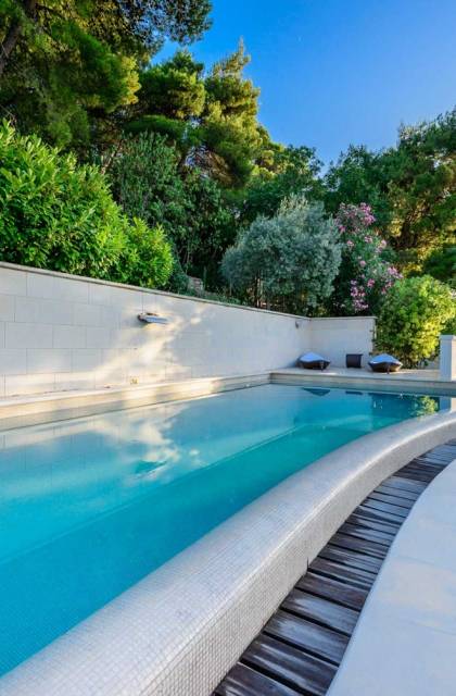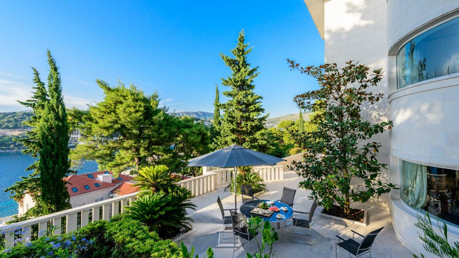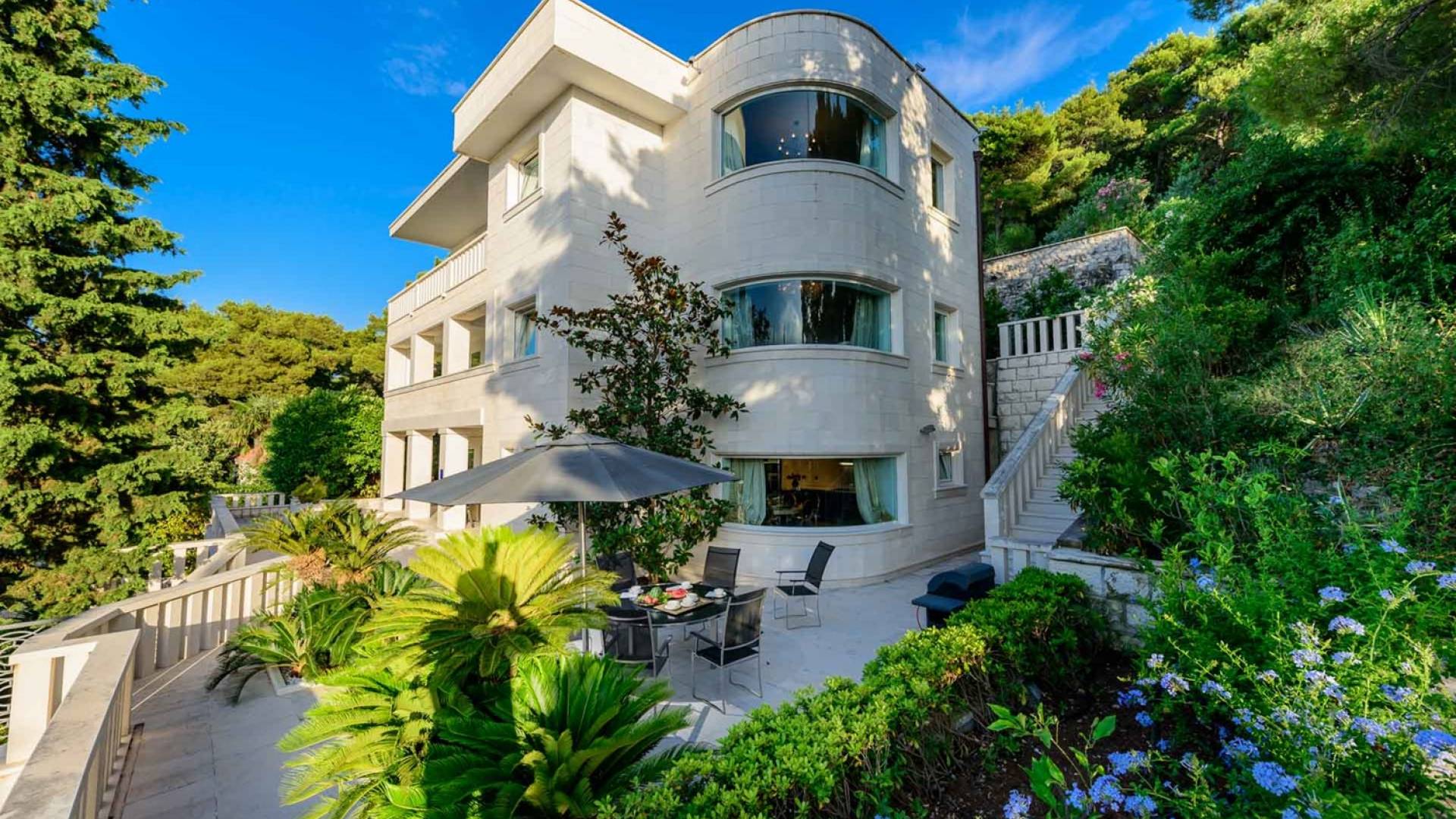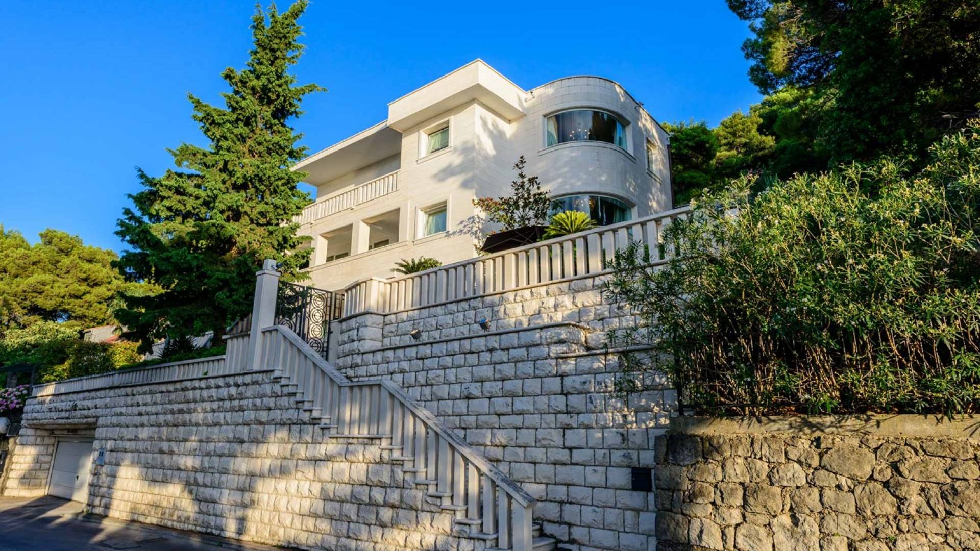 Villa Royal Dubrovnik ist eine Luxusvilla mit 4 Schlafzimmern und einem privaten Pool. Die Villa Royal Dubrovnik befindet sich in einem elitären Teil der Lapad-Bucht - einem der begehrtesten Teile von Dubrovnik. Auf der einen Seite überblickt die Villa das Meer und die Elaphiten-Inseln, während sie auf der anderen Seite vollständig in die wunderschönen üppigen Pinienwälder des Naturparks Mala Petka eingebettet ist. Neben der natürlichen Umgebung verfügt die Villa Royal Dubrovnik über einen wunderschönen Garten mit einer reichen mediterranen Flora auf einem riesigen Grundstück von 2000 m². Dieser einzigartige Garten bietet den Gästen eine besondere Stimmung und tiefe Intimität.