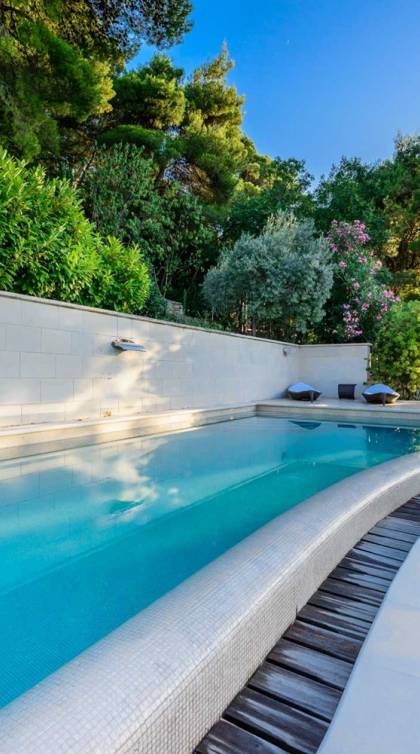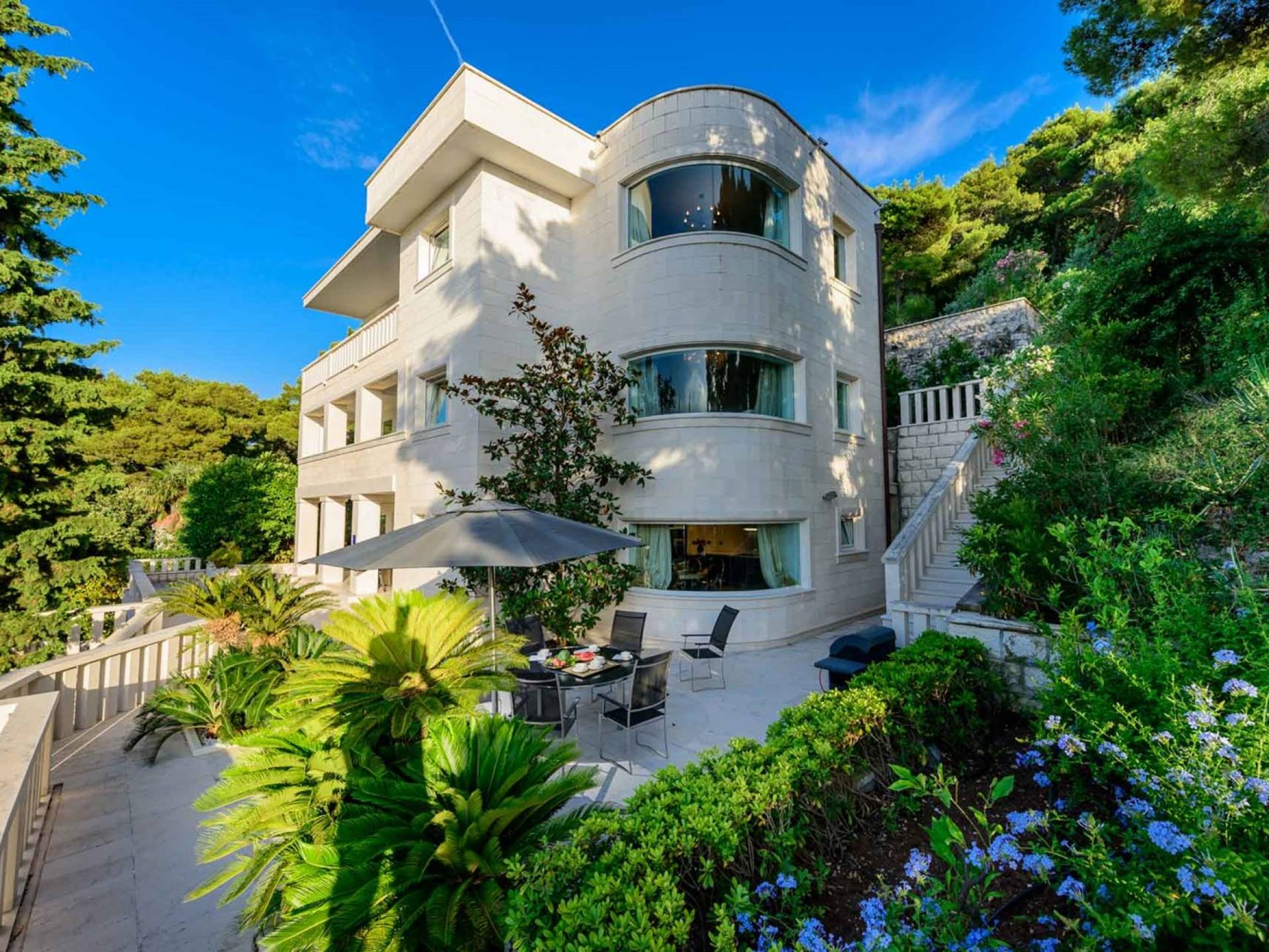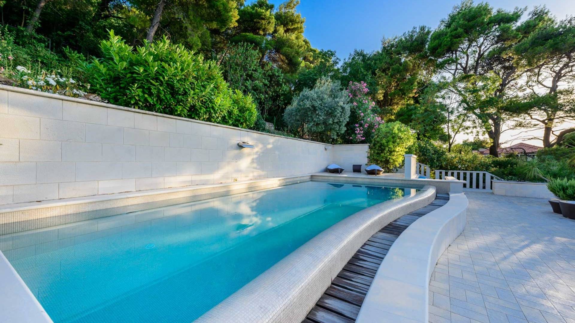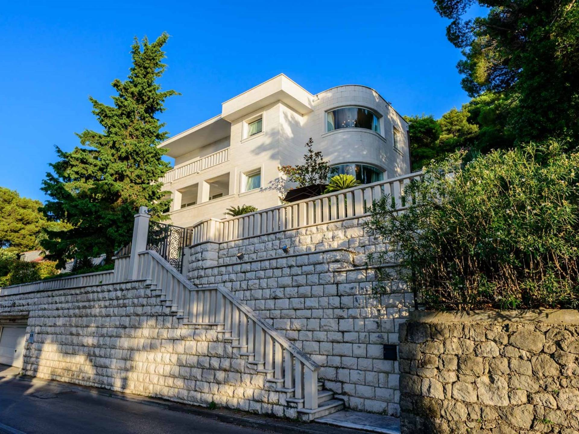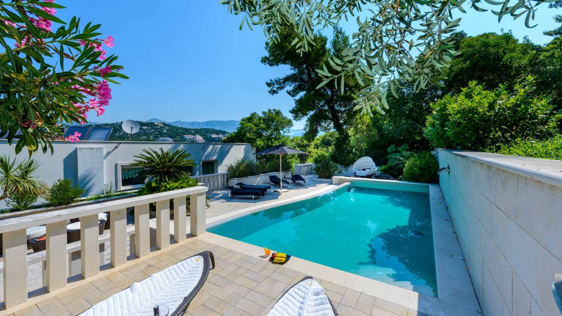 Villa Royal Dubrovnik ist eine Luxusvilla mit 4 Schlafzimmern und einem privaten Pool. Die Villa Royal Dubrovnik befindet sich in einem elitären Teil der Lapad-Bucht - einem der begehrtesten Teile von Dubrovnik. Auf der einen Seite überblickt die Villa das Meer und die Elaphiten-Inseln, während sie auf der anderen Seite vollständig in die wunderschönen üppigen Pinienwälder des Naturparks Mala Petka eingebettet ist. Neben der natürlichen Umgebung verfügt die Villa Royal Dubrovnik über einen wunderschönen Garten mit einer reichen mediterranen Flora auf einem riesigen Grundstück von 2000 m². Dieser einzigartige Garten bietet den Gästen eine besondere Stimmung und tiefe Intimität.
