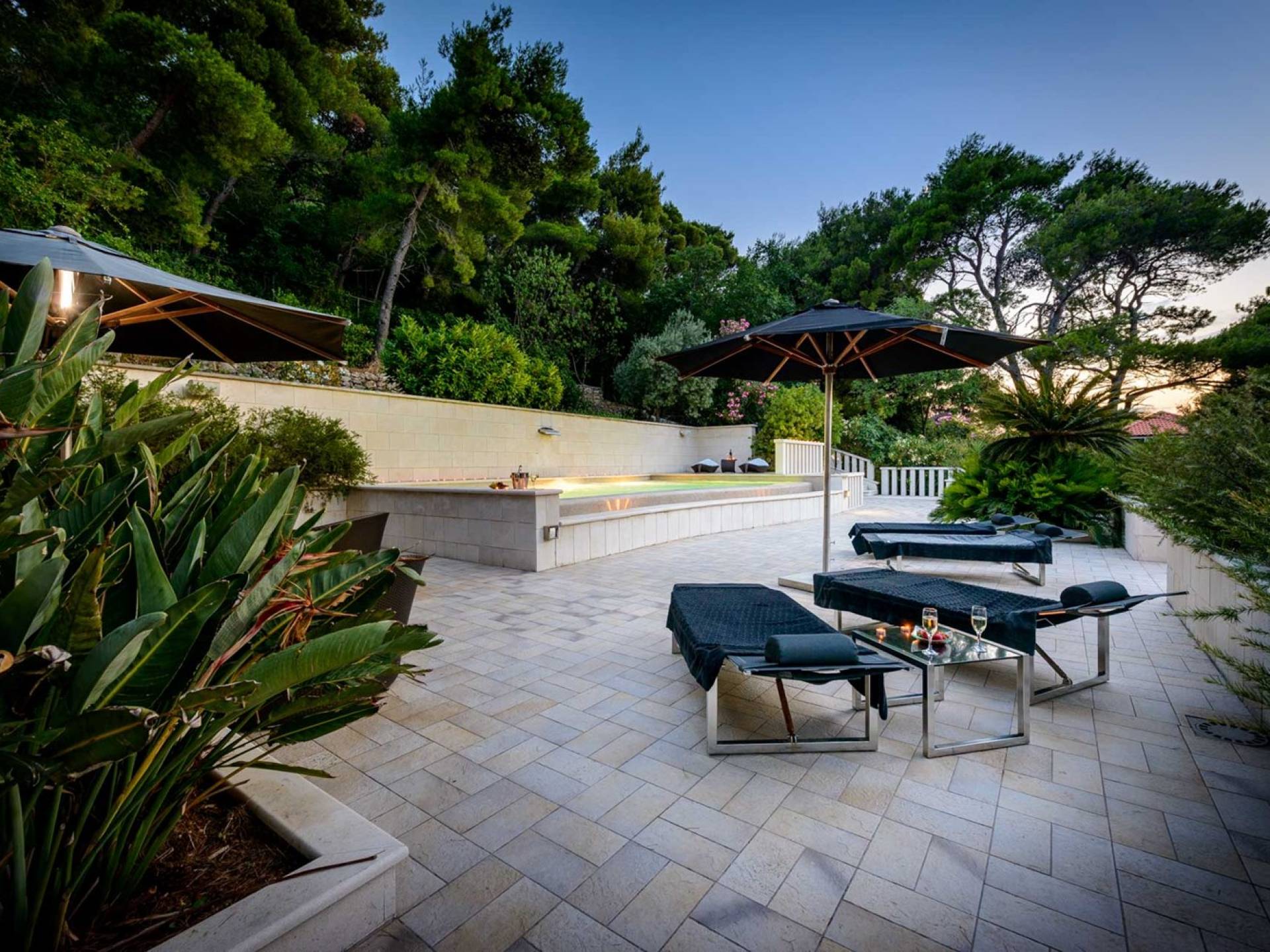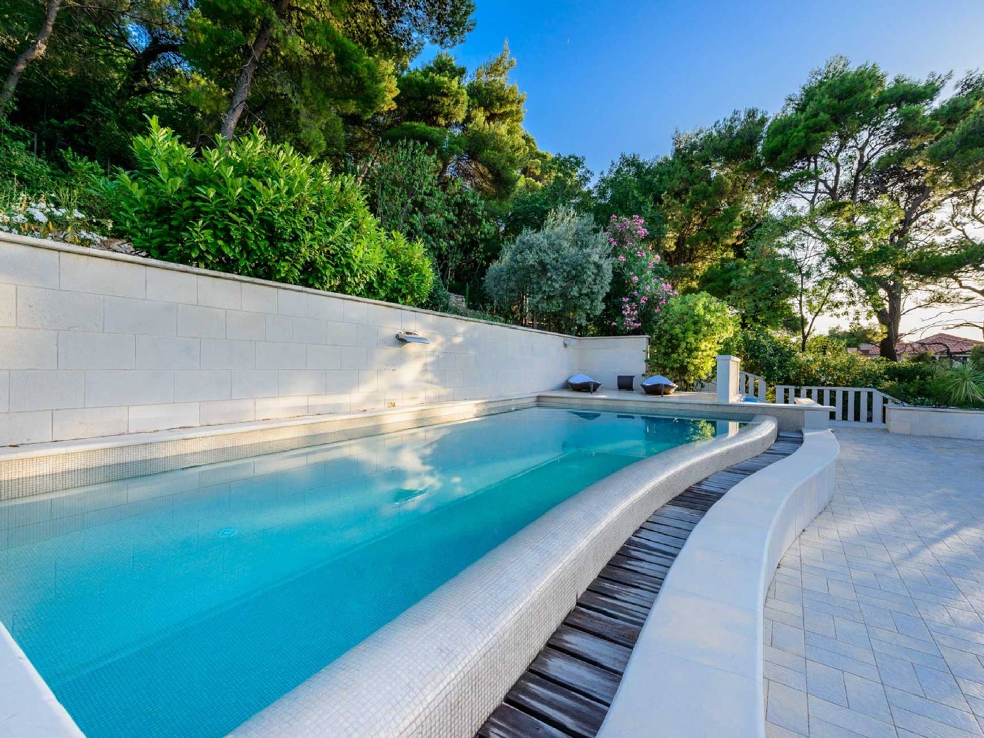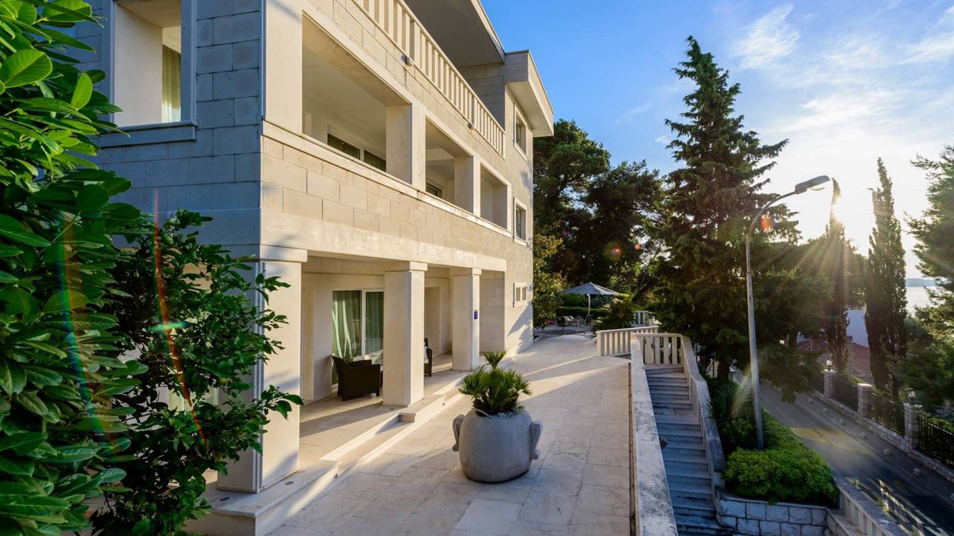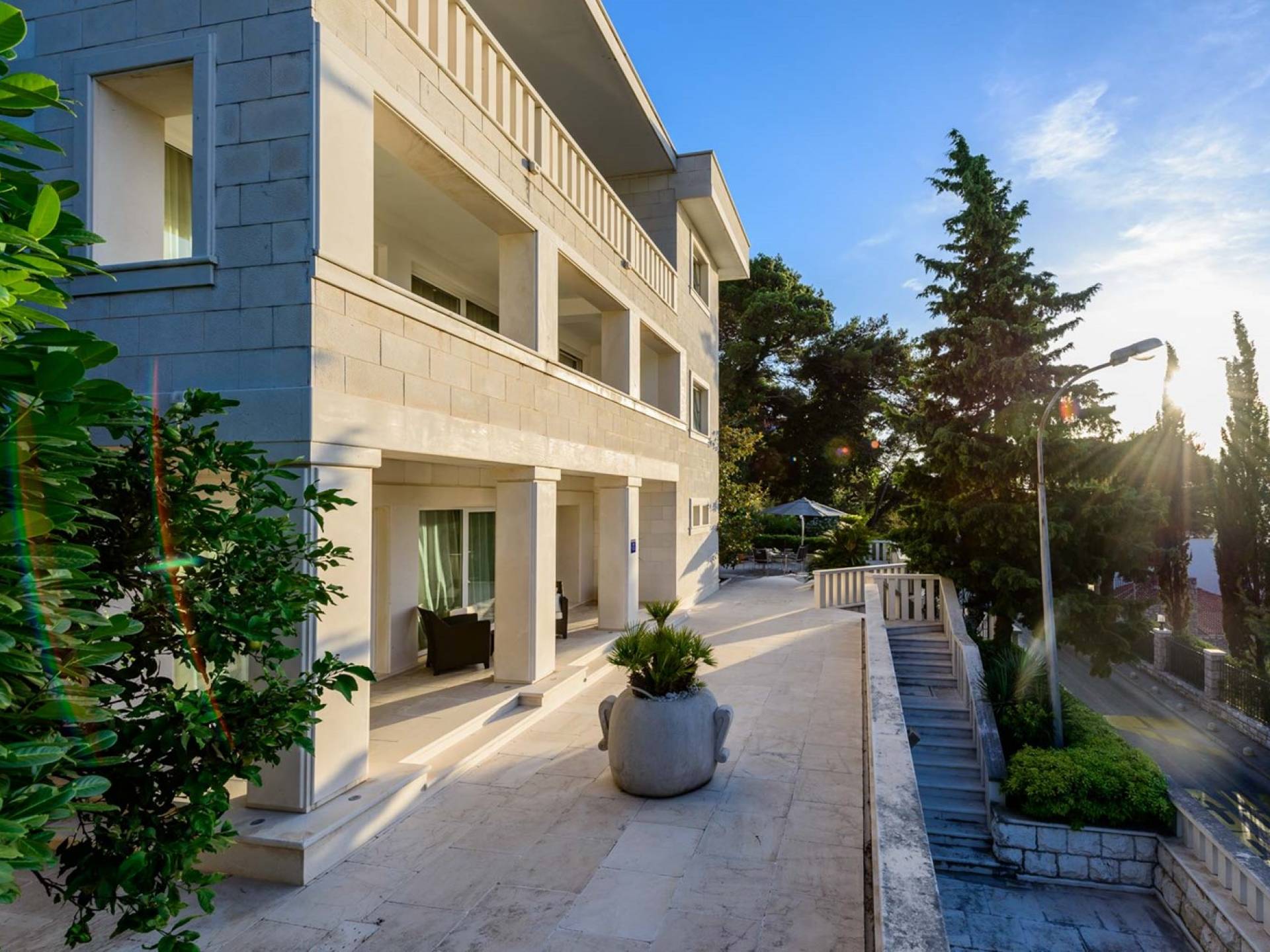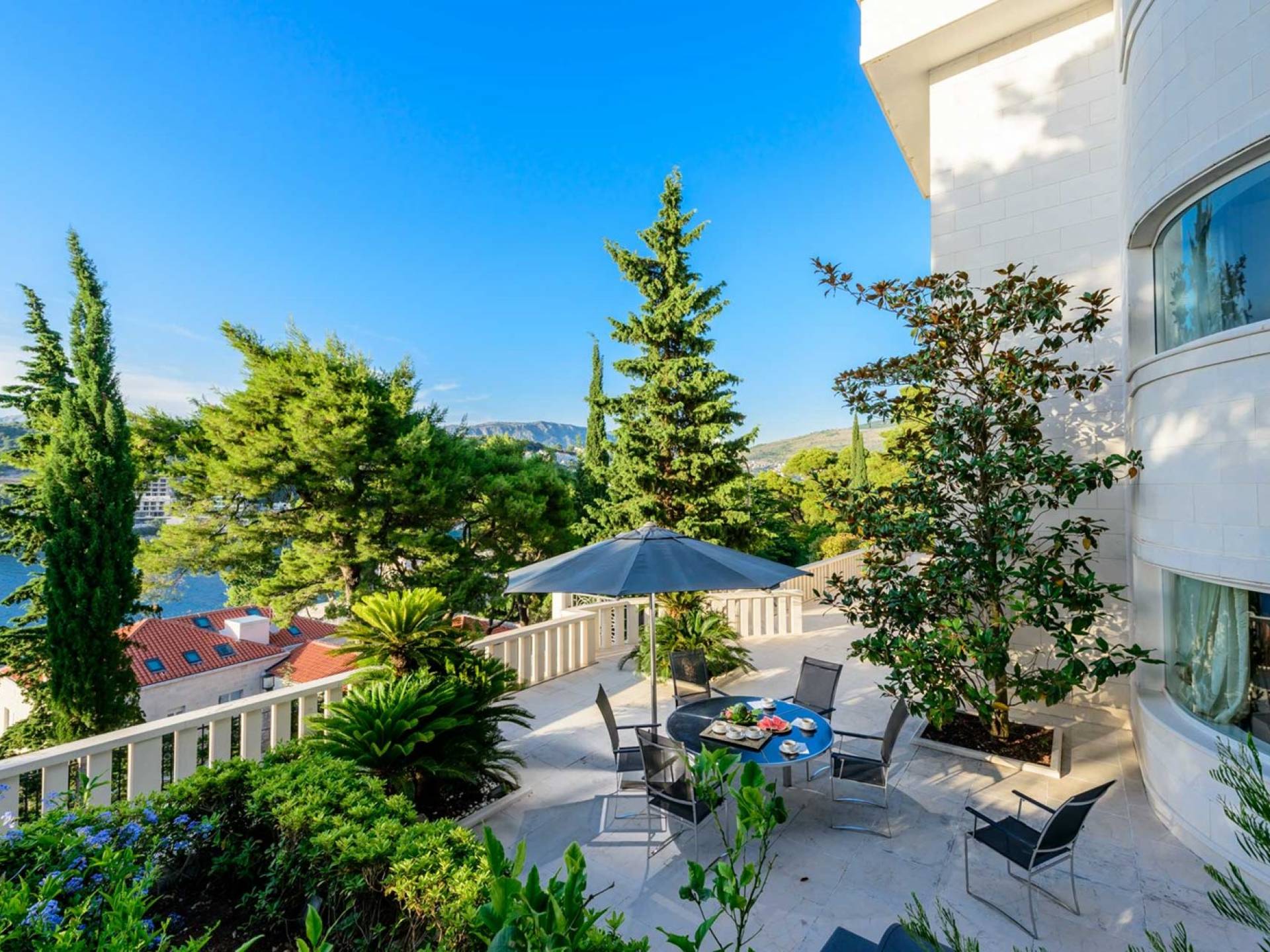 Villa Royal Dubrovnik ist eine Luxusvilla mit 4 Schlafzimmern und einem privaten Pool. Die Villa Royal Dubrovnik befindet sich in einem elitären Teil der Lapad-Bucht - einem der begehrtesten Teile von Dubrovnik. Auf der einen Seite überblickt die Villa das Meer und die Elaphiten-Inseln, während sie auf der anderen Seite vollständig in die wunderschönen üppigen Pinienwälder des Naturparks Mala Petka eingebettet ist. Neben der natürlichen Umgebung verfügt die Villa Royal Dubrovnik über einen wunderschönen Garten mit einer reichen mediterranen Flora auf einem riesigen Grundstück von 2000 m². Dieser einzigartige Garten bietet den Gästen eine besondere Stimmung und tiefe Intimität.