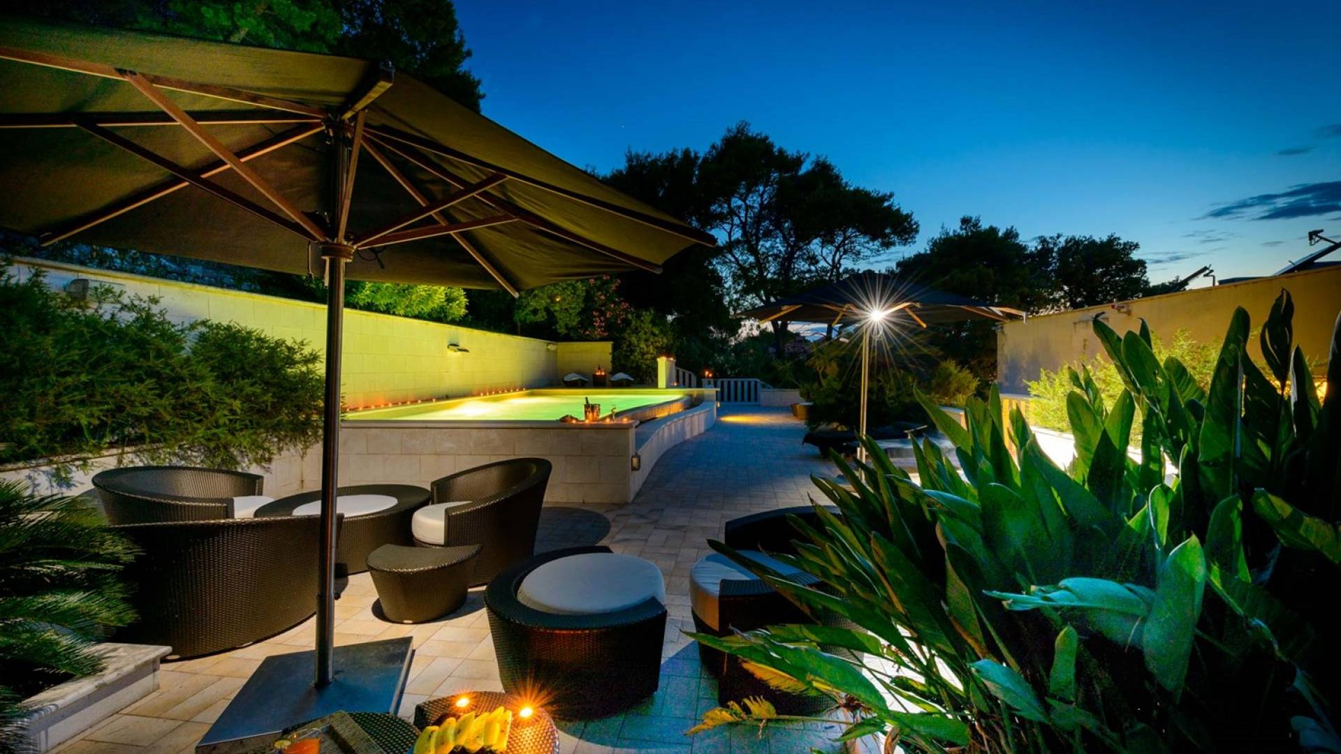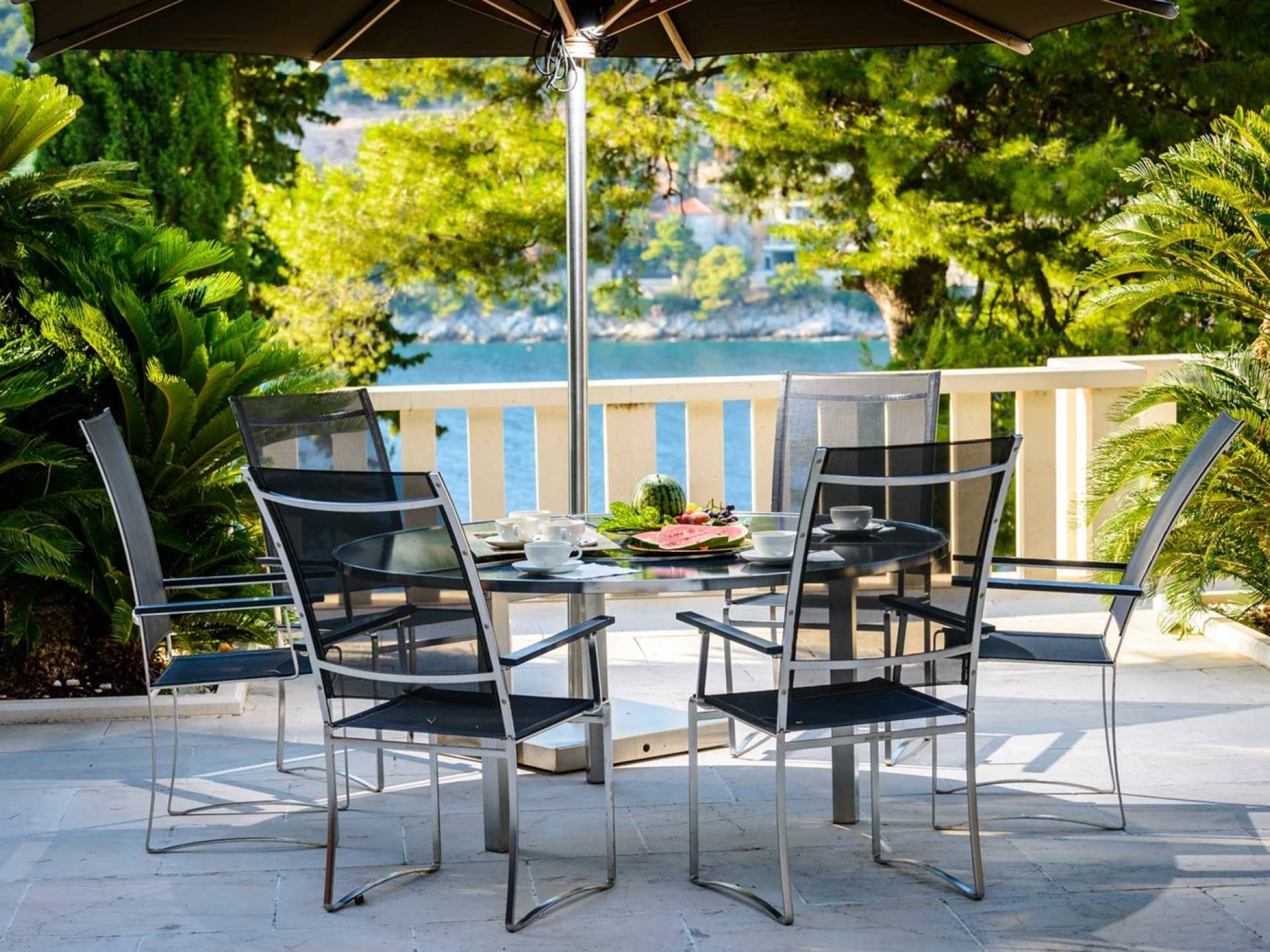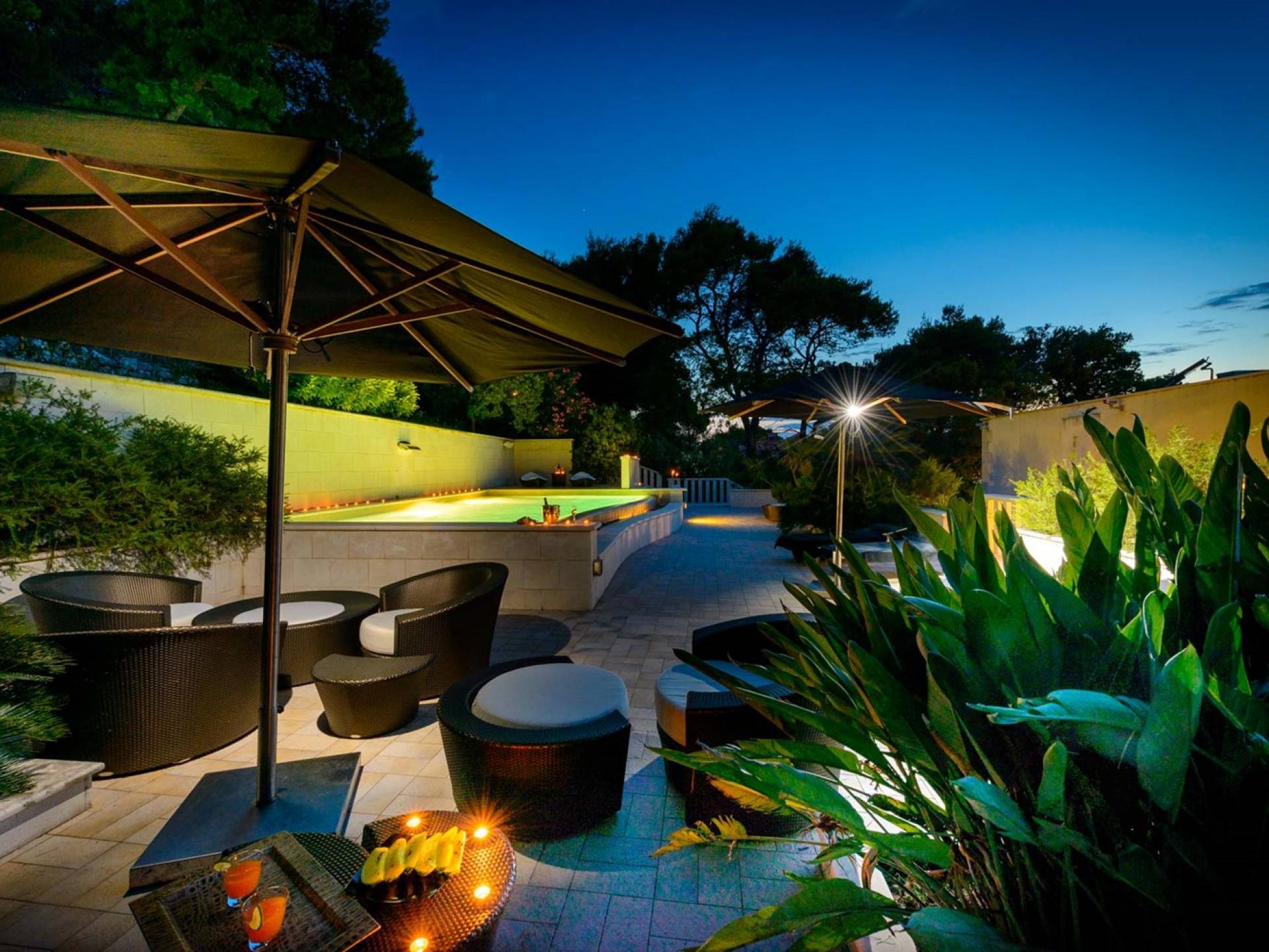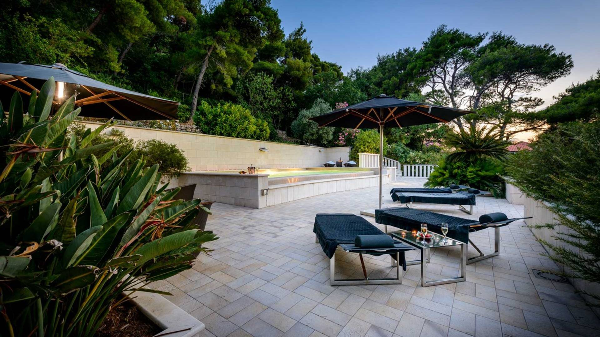 Villa Royal Dubrovnik ist eine Luxusvilla mit 4 Schlafzimmern und einem privaten Pool. Die Villa Royal Dubrovnik befindet sich in einem elitären Teil der Lapad-Bucht - einem der begehrtesten Teile von Dubrovnik. Auf der einen Seite überblickt die Villa das Meer und die Elaphiten-Inseln, während sie auf der anderen Seite vollständig in die wunderschönen üppigen Pinienwälder des Naturparks Mala Petka eingebettet ist. Neben der natürlichen Umgebung verfügt die Villa Royal Dubrovnik über einen wunderschönen Garten mit einer reichen mediterranen Flora auf einem riesigen Grundstück von 2000 m². Dieser einzigartige Garten bietet den Gästen eine besondere Stimmung und tiefe Intimität.
