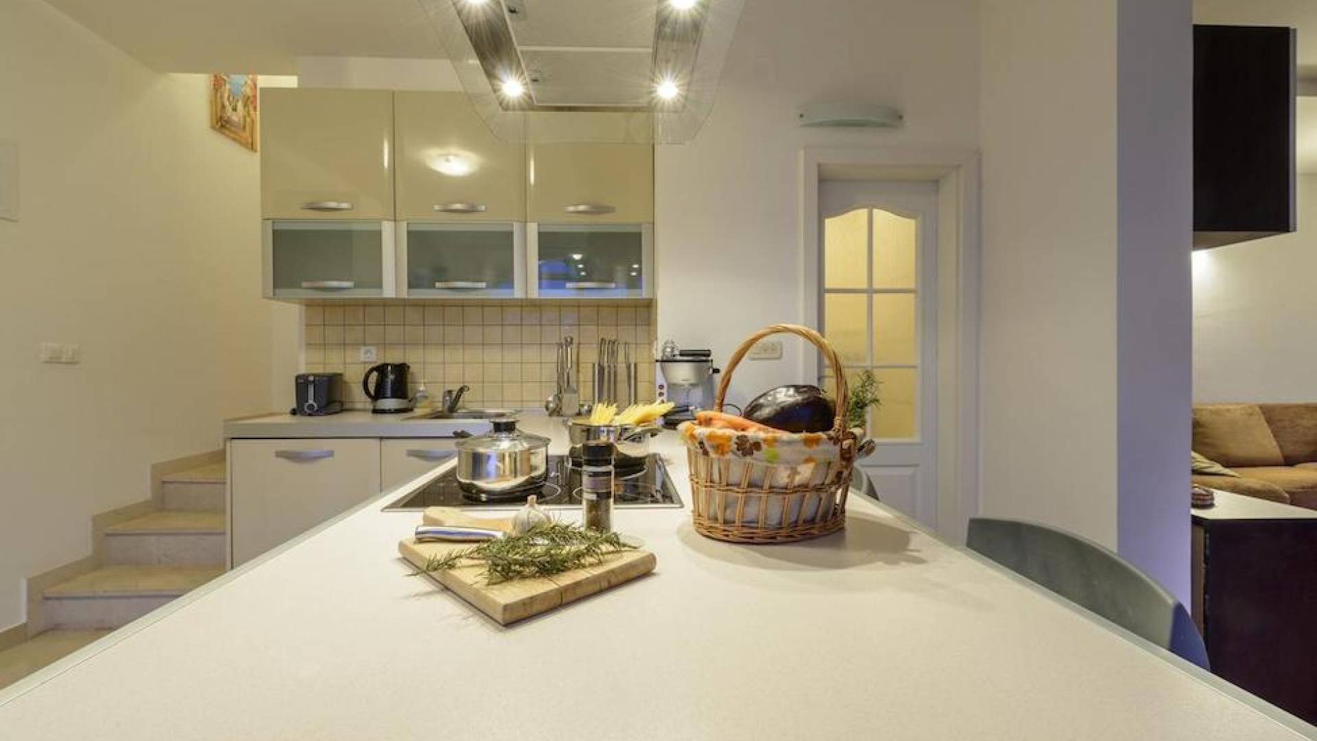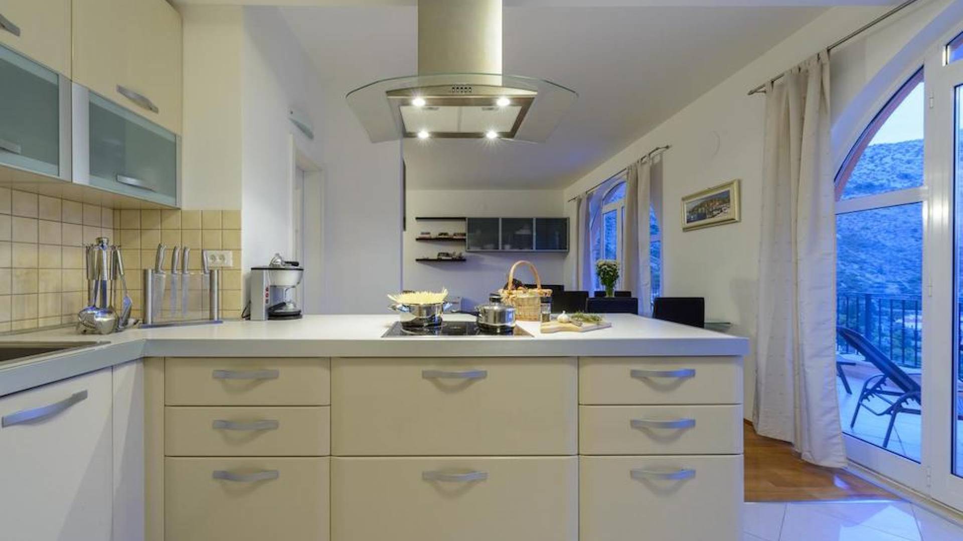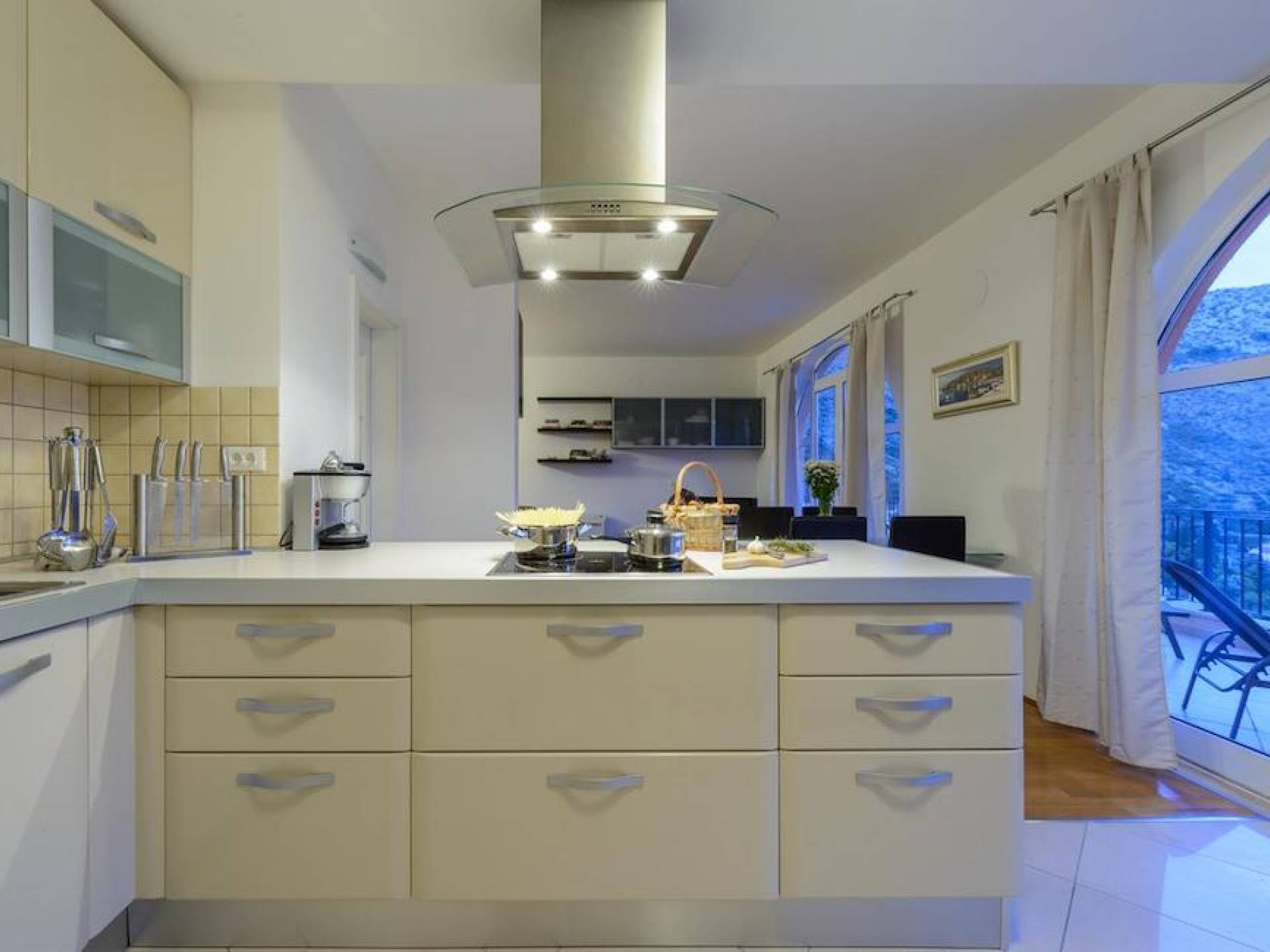 Die Terrasse ist der perfekte Ort für Geselligkeit, Vergnügen und Spaß. Oft verbringen die Gäste den ganzen Tag auf der Terrasse beim Sonnenbaden, Grillen vorbereiten, sich im Pool erfrischen, immer mit einem herrlichen Blick über die Bucht und das kristallklare Adriatische Meer. Parkplätze sind außerhalb des Hauses und in der Garage neben dem Haus vorhanden.
