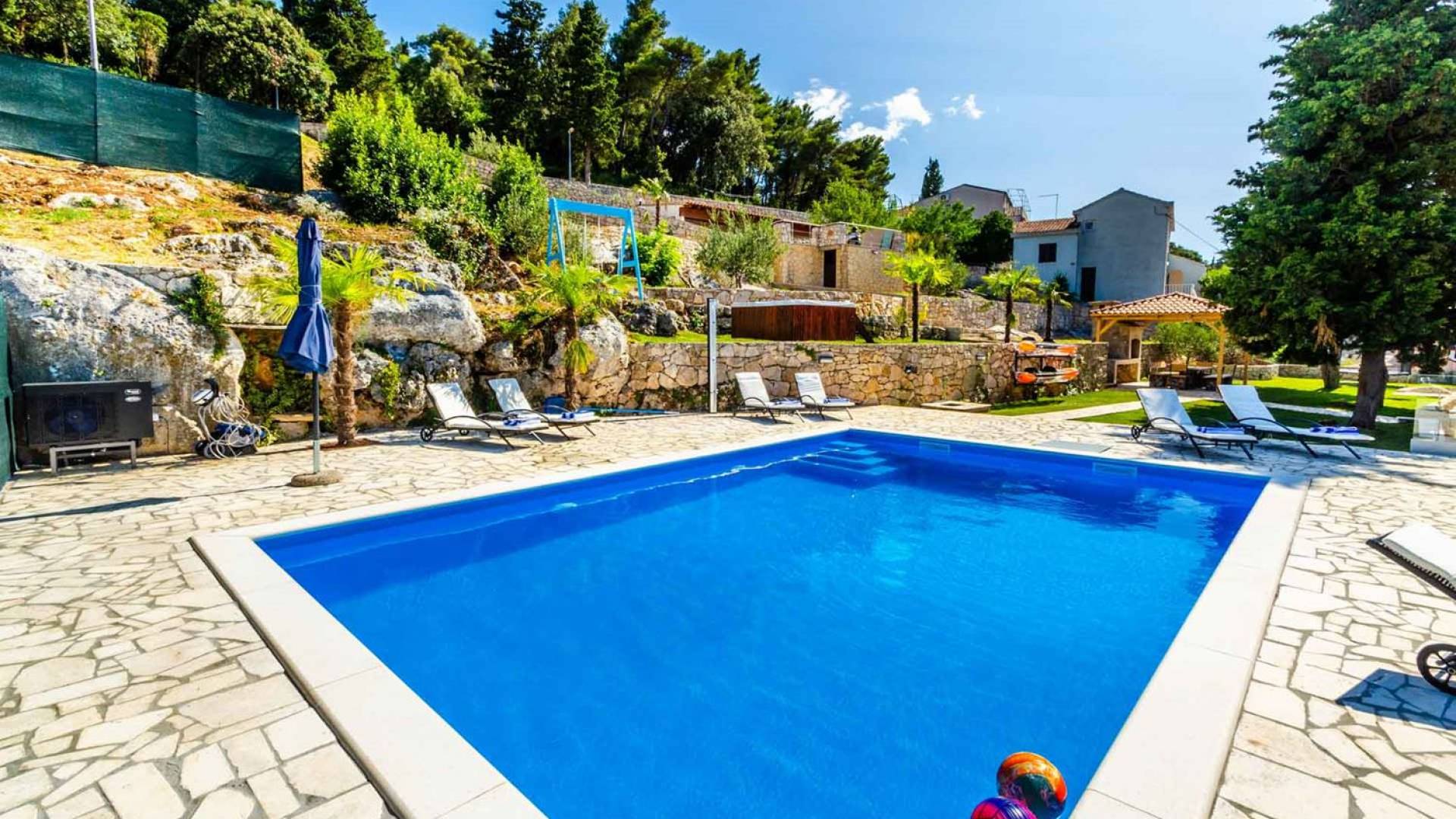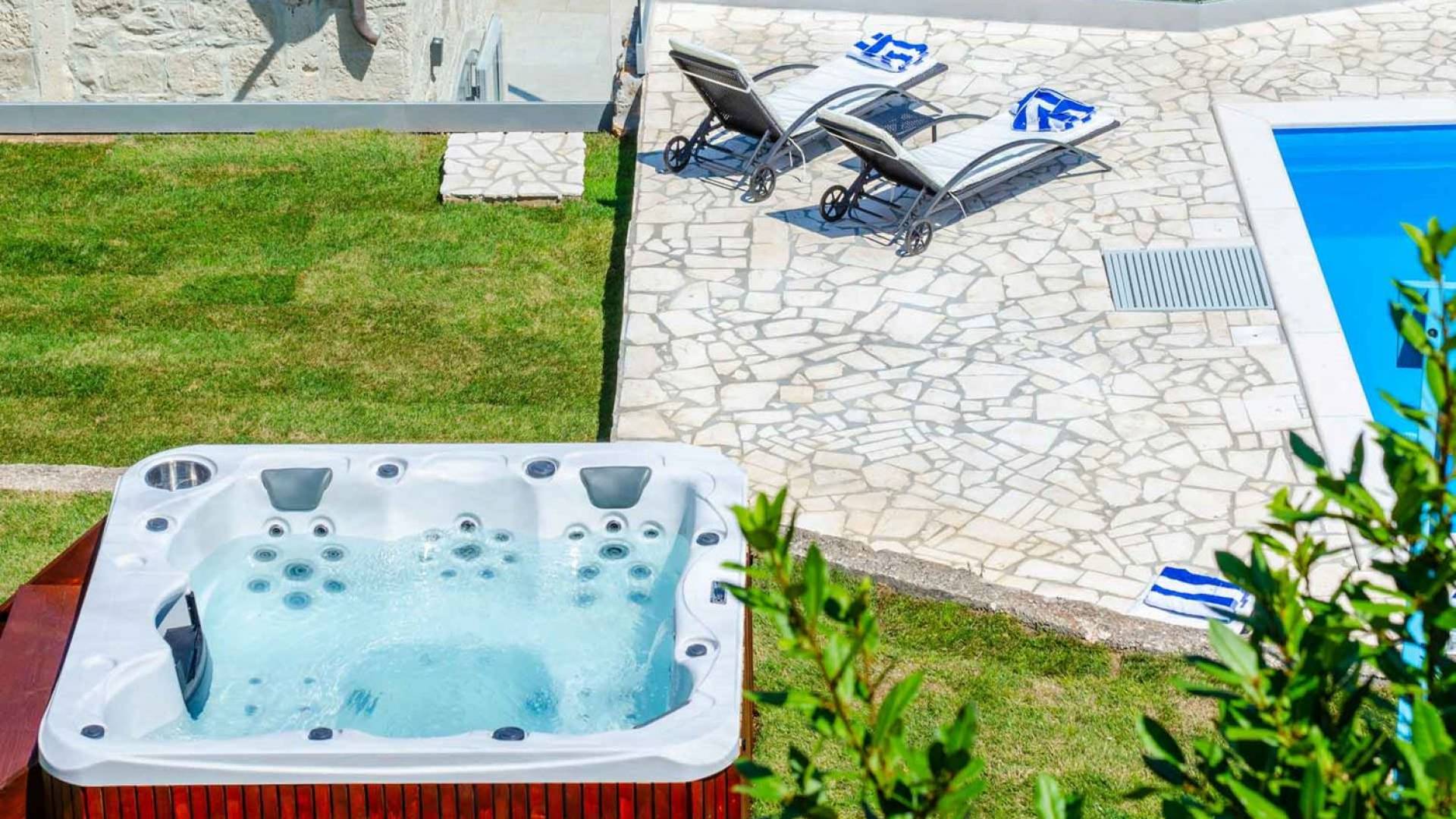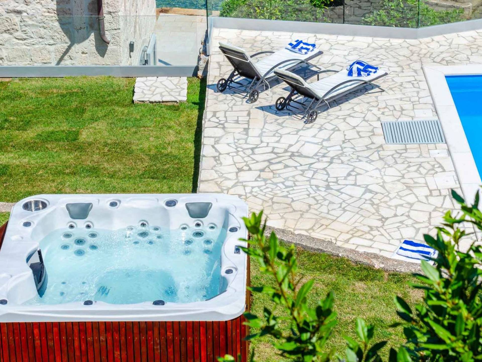 Wenn Sie das Anwesen betreten, werden Sie zuerst einen schönen Garten, einen Whirlpool und einen Swimmingpool bemerken - perfekt für ein erfrischendes Bad in den heißen Sommermonaten. Der Pool bietet einen fantastischen Blick auf das Meer und die Berge, an den Sie sich für immer erinnern werden. Der Garten bietet genug Platz, damit jeder sein Lieblingsplätzchen finden kann. Diejenigen, die gerne im Freien speisen, können Gourmetgerichte auf dem Grill im Freien zubereiten und Zeit mit Familie und Freunden unter dem überdachten Essbereich im Freien verbringen, während die Kinder sich auf dem Trampolin und den Schaukeln vergnügen.