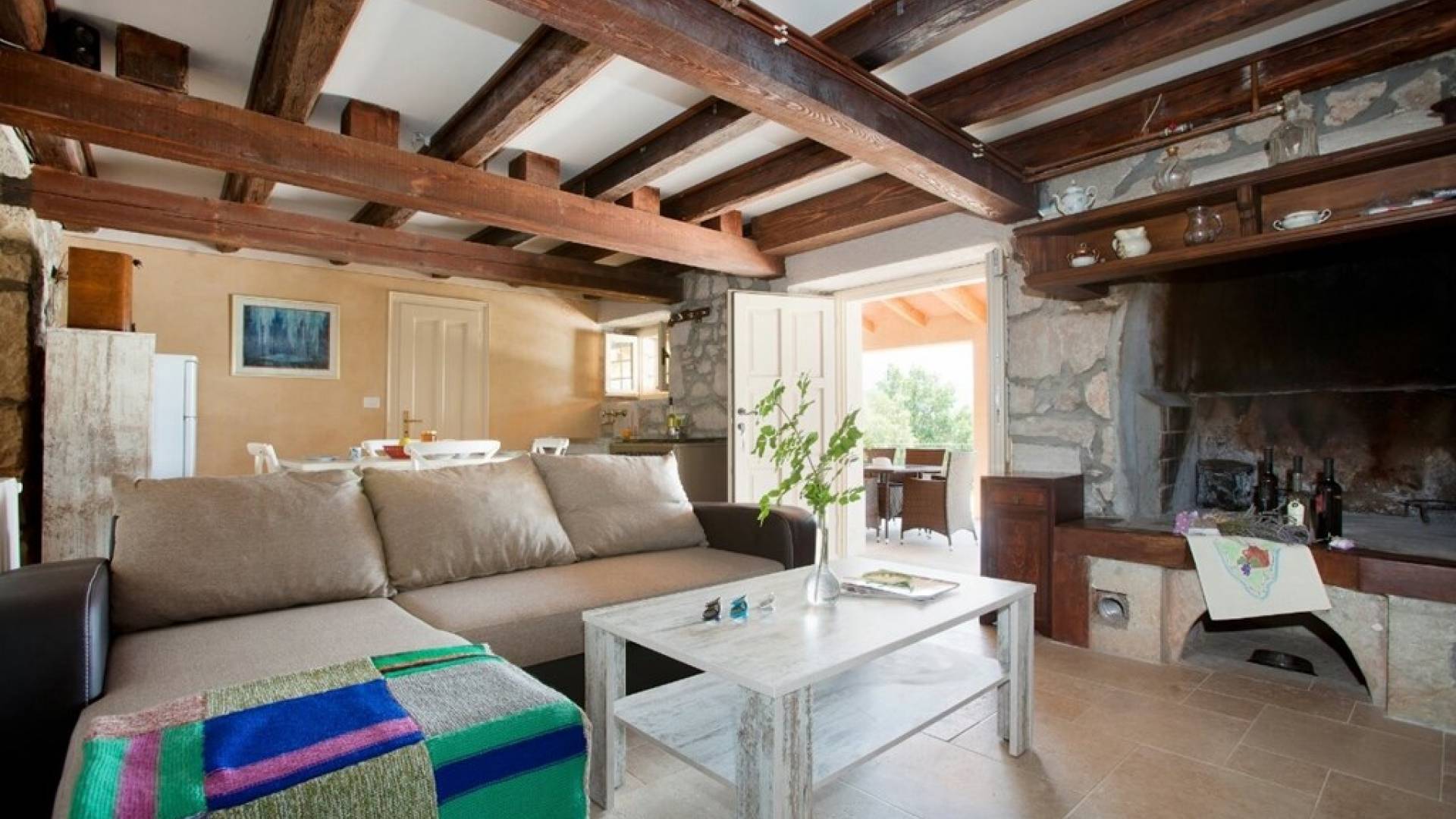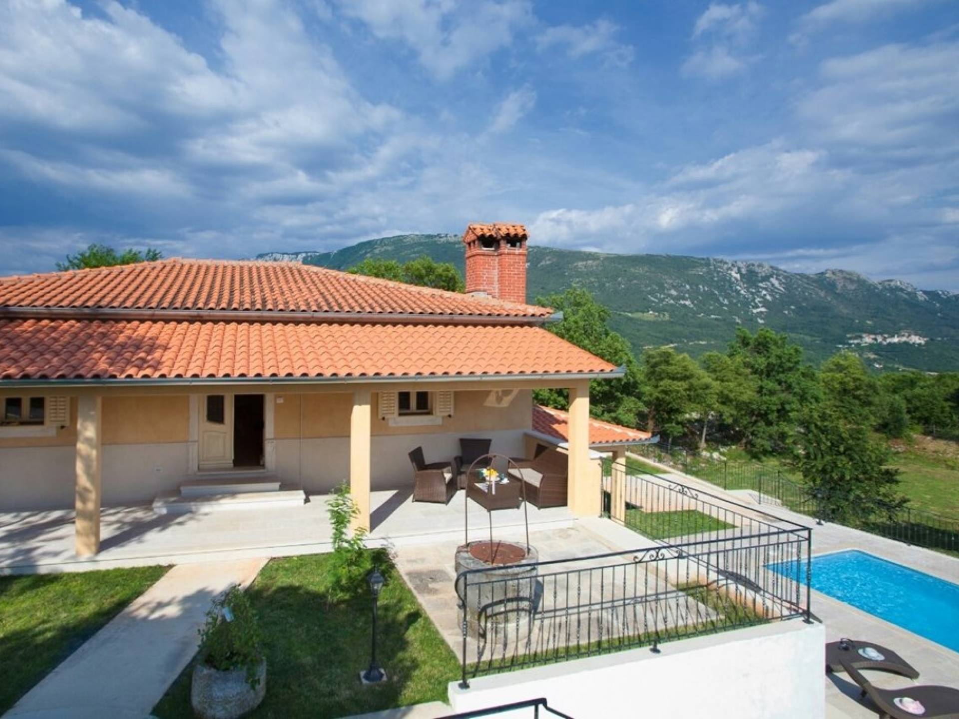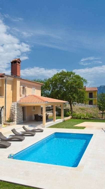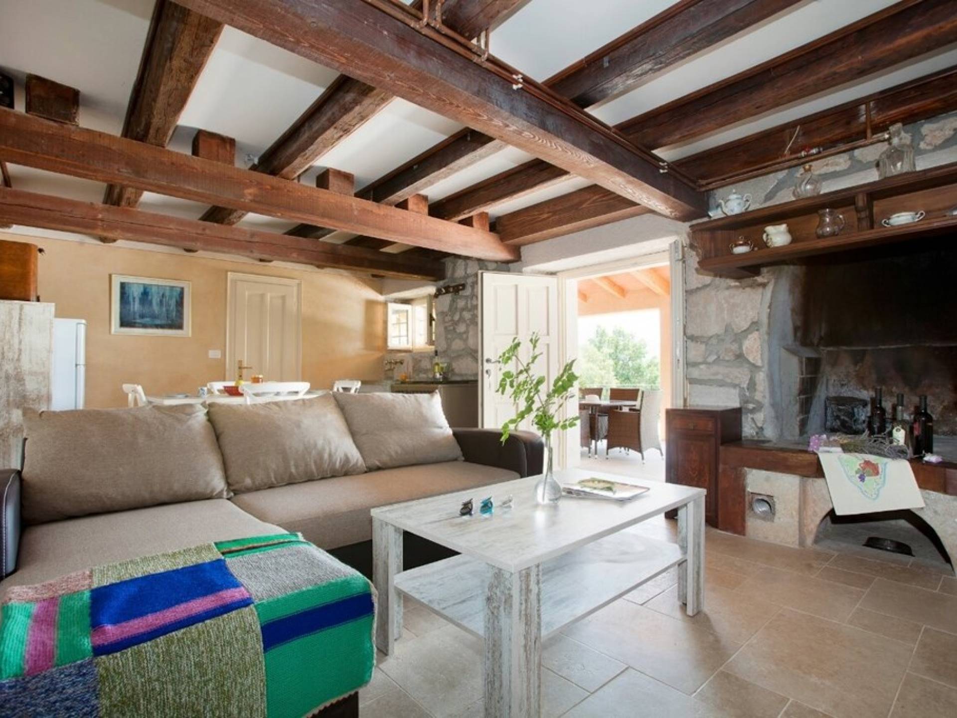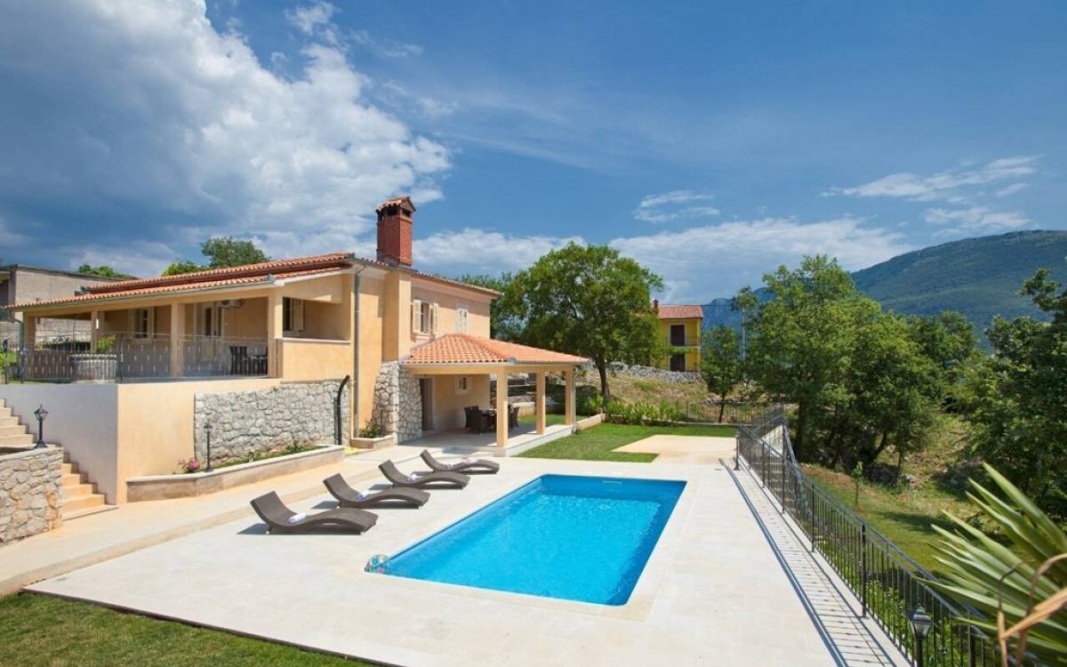 Die Villa besteht aus zwei Teilen mit separaten Eingängen. Der obere Teil ist eine geräumige Wohnung mit drei Schlafzimmern, einer Küche, einem Badezimmer und einer Terrasse mit Gartenmöbeln. Im Erdgeschoss befindet sich ein Studio-Apartment aus Stein mit einem traditionell abgeleiteten Kamin und einer Terrasse mit Gartenmöbeln, vor der sich ein Pool und einige Sonnenliegen befinden. Die Villa liegt in einem kleinen Dorf mit nur wenigen besiedelten Häusern. Um sie herum erstreckt sich ein 7000 Quadratmeter großer grüner Garten, der sich ideal zum Entspannen und Genießen der Ruhe und der absoluten Privatsphäre eignet.