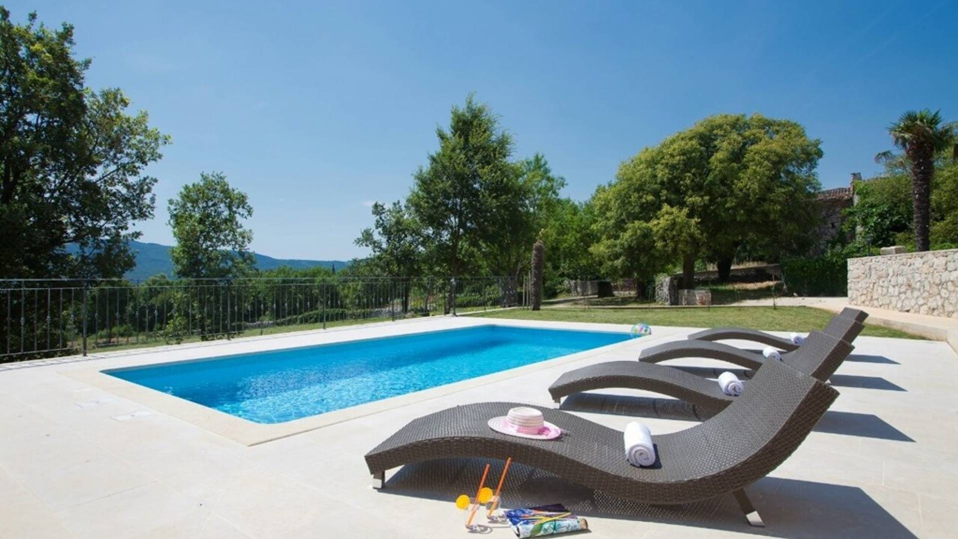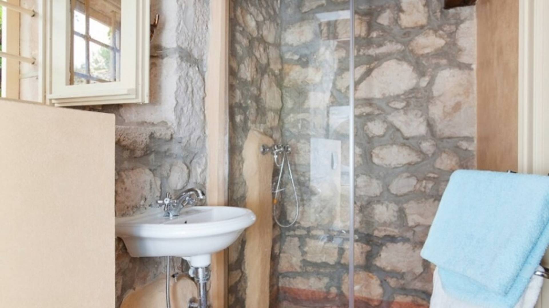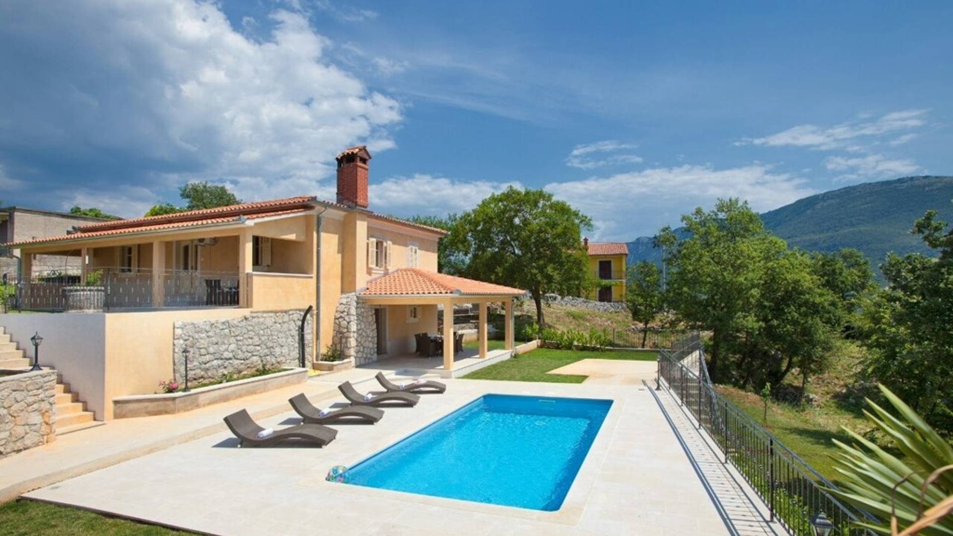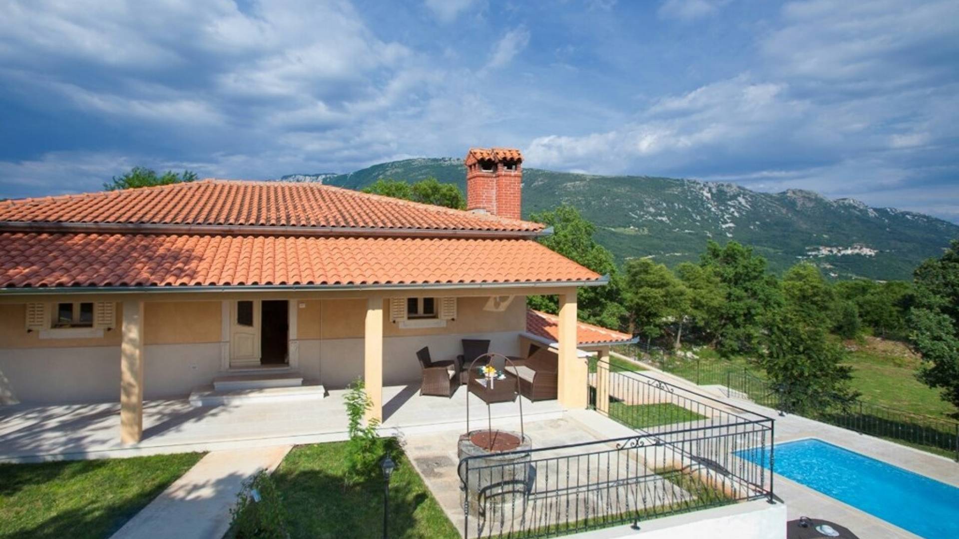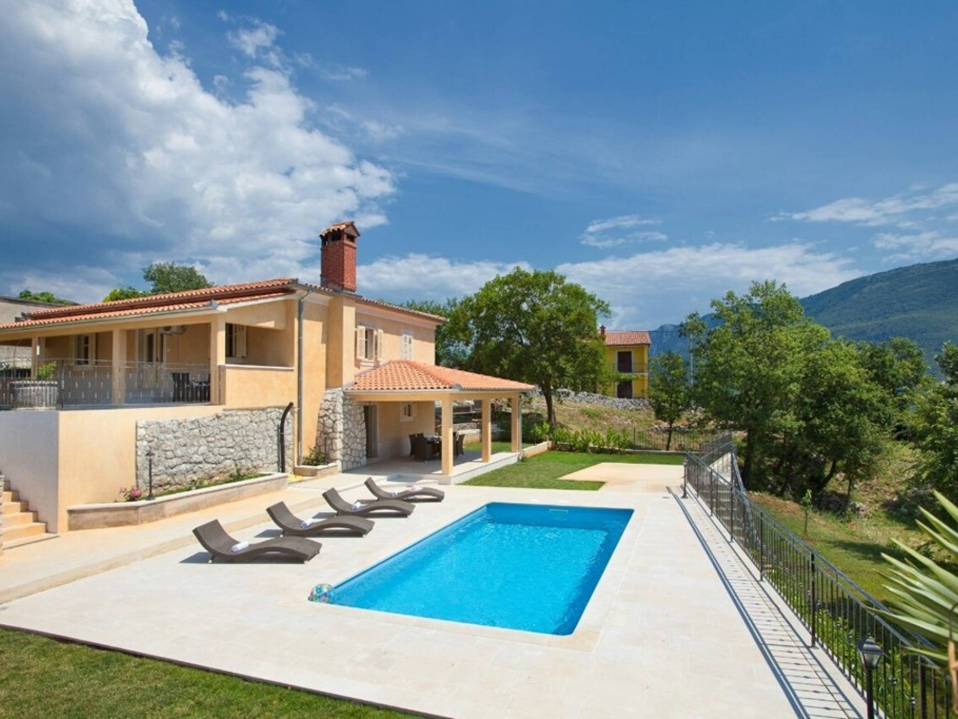 Die Villa besteht aus zwei Teilen mit separaten Eingängen. Der obere Teil ist eine geräumige Wohnung mit drei Schlafzimmern, einer Küche, einem Badezimmer und einer Terrasse mit Gartenmöbeln. Im Erdgeschoss befindet sich ein Studio-Apartment aus Stein mit einem traditionell abgeleiteten Kamin und einer Terrasse mit Gartenmöbeln, vor der sich ein Pool und einige Sonnenliegen befinden. Die Villa liegt in einem kleinen Dorf mit nur wenigen besiedelten Häusern. Um sie herum erstreckt sich ein 7000 Quadratmeter großer grüner Garten, der sich ideal zum Entspannen und Genießen der Ruhe und der absoluten Privatsphäre eignet.