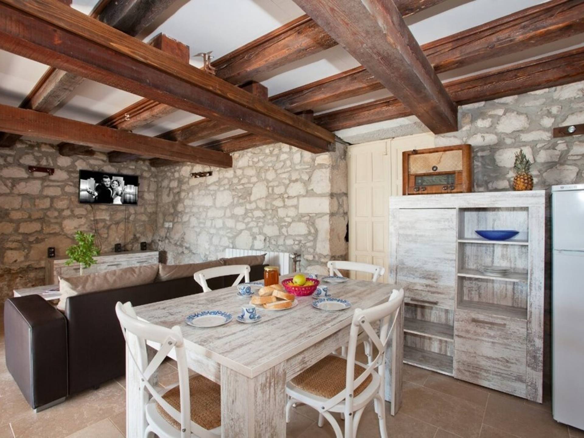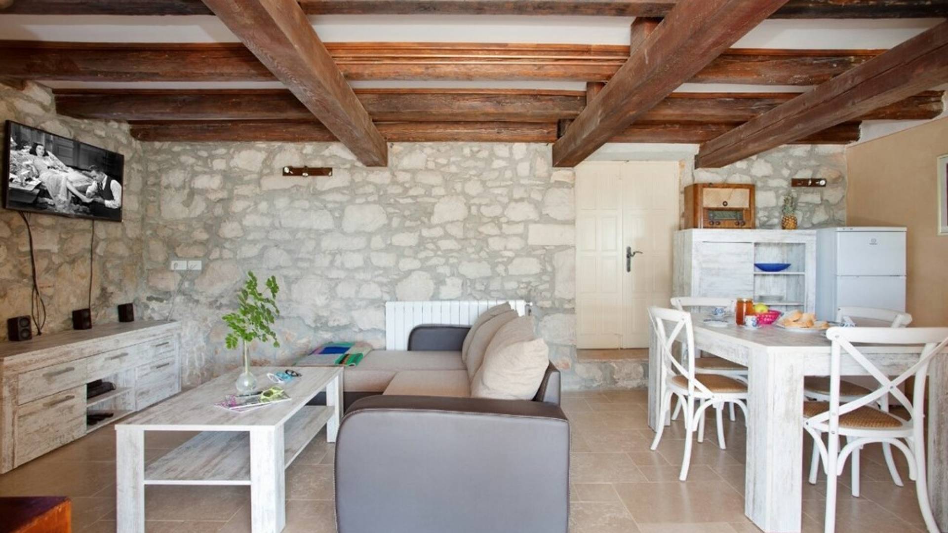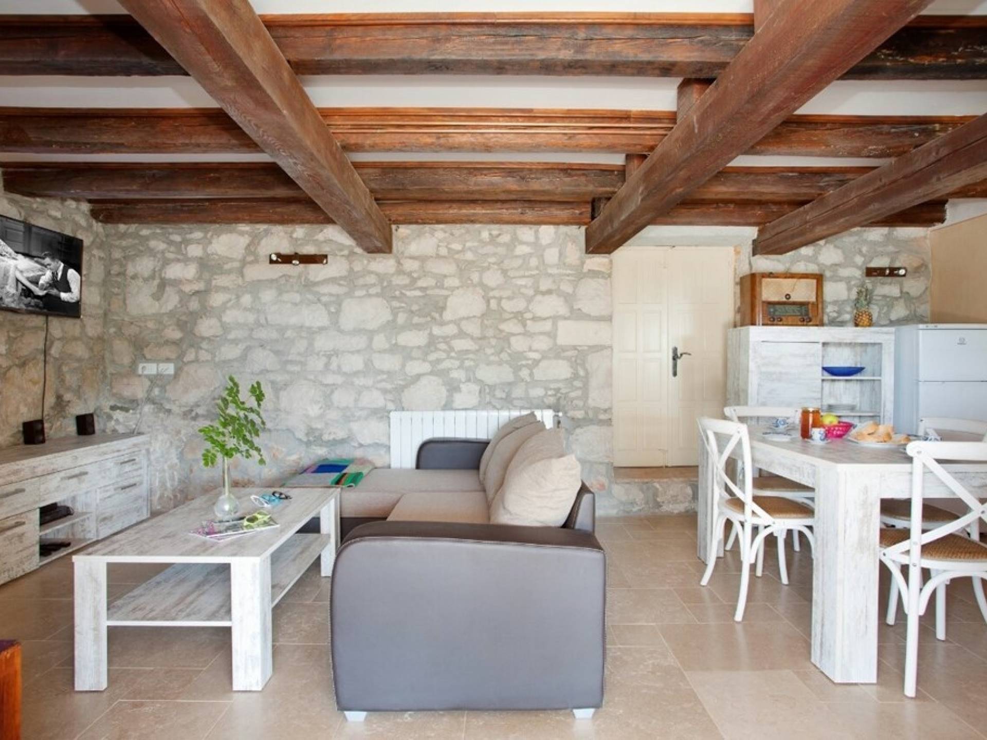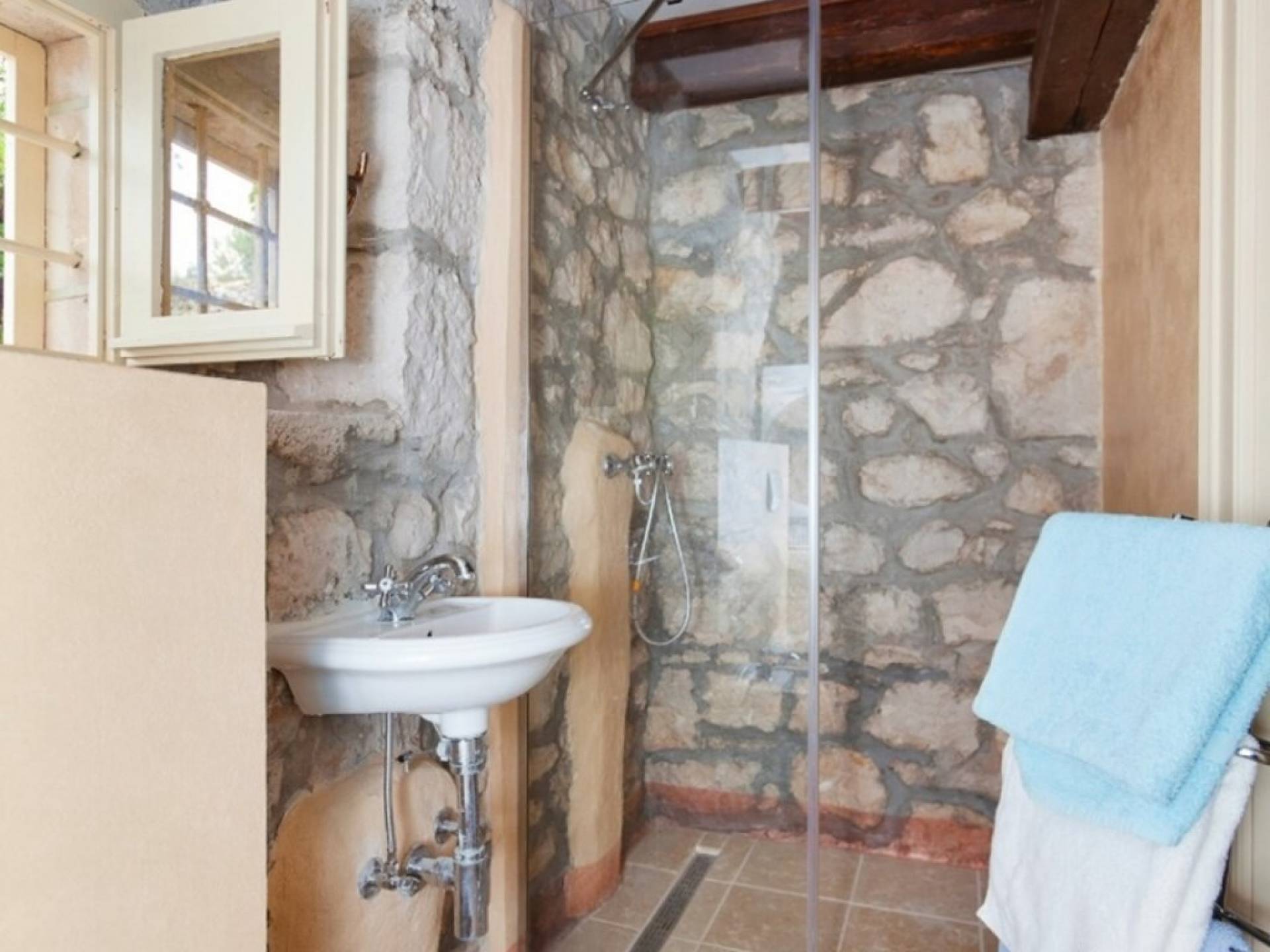 Die Villa besteht aus zwei Teilen mit separaten Eingängen. Der obere Teil ist eine geräumige Wohnung mit drei Schlafzimmern, einer Küche, einem Badezimmer und einer Terrasse mit Gartenmöbeln. Im Erdgeschoss befindet sich ein Studio-Apartment aus Stein mit einem traditionell abgeleiteten Kamin und einer Terrasse mit Gartenmöbeln, vor der sich ein Pool und einige Sonnenliegen befinden. Die Villa liegt in einem kleinen Dorf mit nur wenigen besiedelten Häusern. Um sie herum erstreckt sich ein 7000 Quadratmeter großer grüner Garten, der sich ideal zum Entspannen und Genießen der Ruhe und der absoluten Privatsphäre eignet.