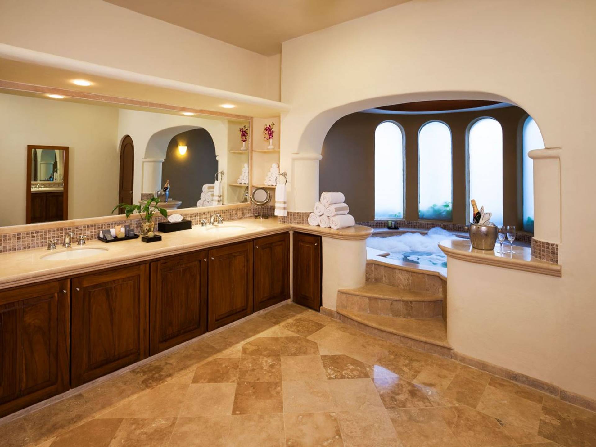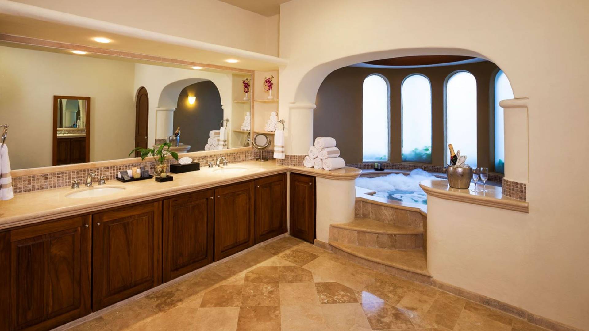 Zusätzlich zu den oben erwähnten Annehmlichkeiten bieten die beiden 899 Quadratfuß großen modernen Hauptschlafzimmer-Suiten ein komplettes Gefühl von Luxus in einer übergroßen Suite mit einem Innen- und einem Außen-Jacuzzi für zwei Personen. Die Suite verfügt über einen übergroßen begehbaren Kleiderschrank, ein Doppelsofa, einen großen Balkon oder eine Terrasse, ein privates Marmorbad mit Regenwalddusche, Doppelwaschbecken, luxuriöse Bademäntel und Hausschuhe, Ganzkörper- und Schminkspiegel.