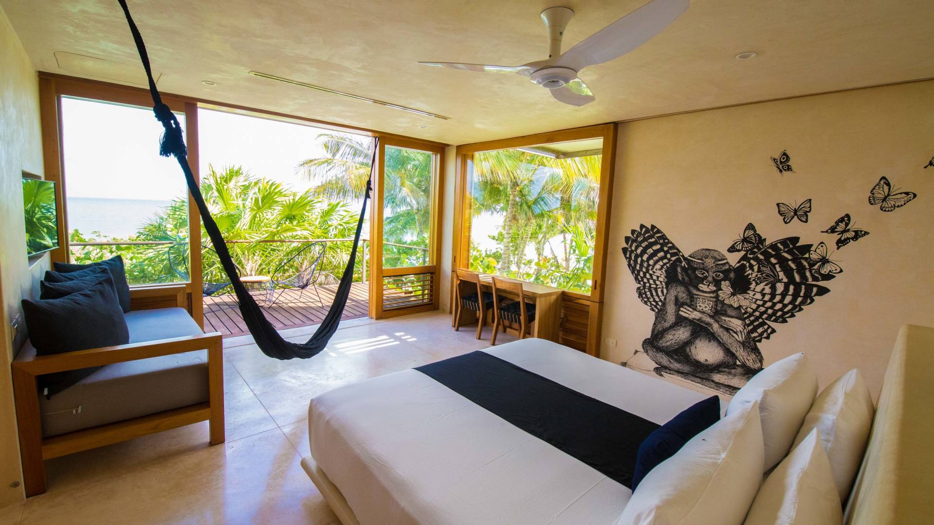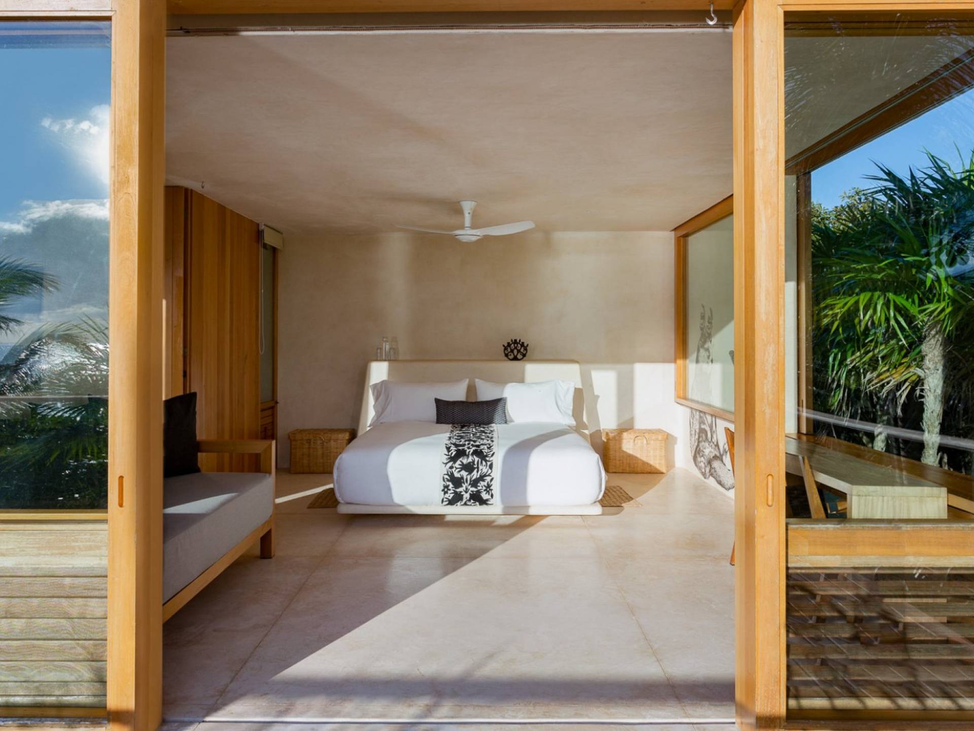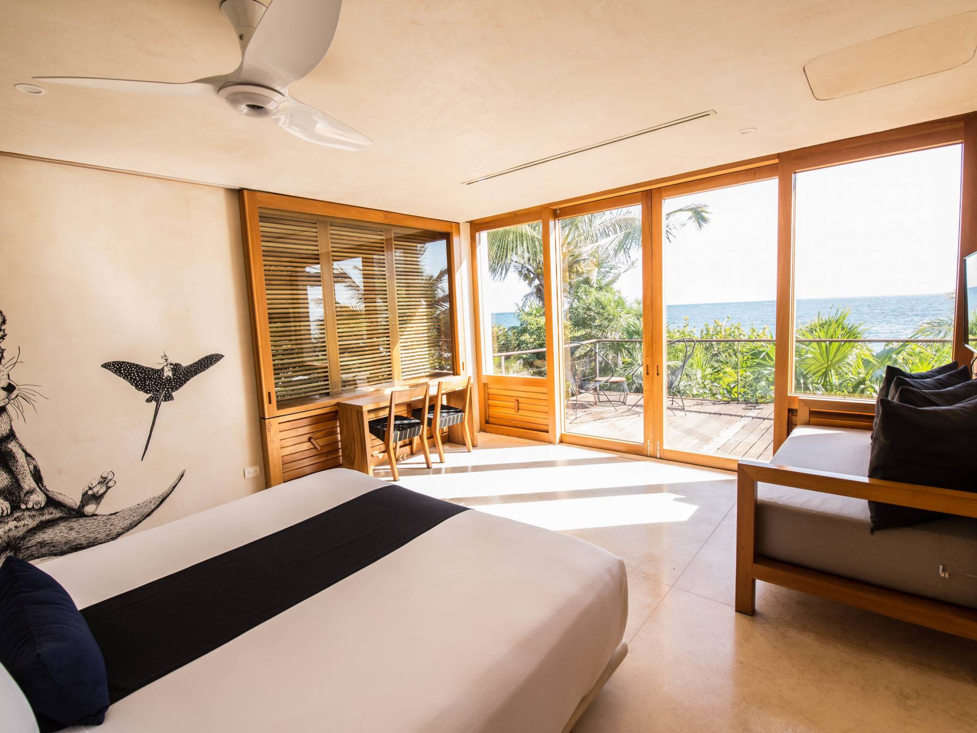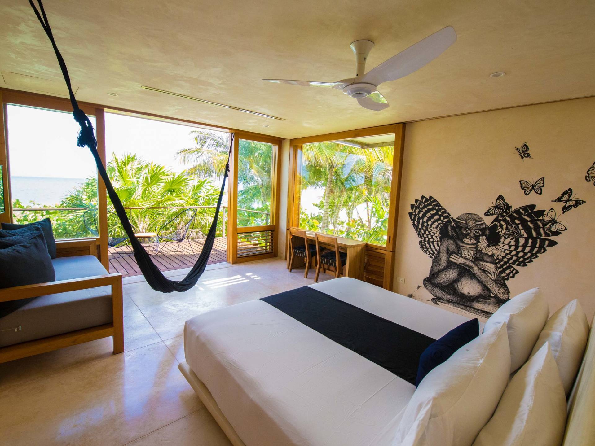 Viel Platz zum Spielen und Träumen. Direkt am Meer können Sie sich auf den Strandbetten mit einer Piña Colada aus den auf dem Anwesen angebauten Kokosnüssen entspannen und bräunen, am Riff schnorcheln oder mit dem Kajak hinauspaddeln. Oder treten Sie ein paar Meter vom Wasser entfernt in den gesprenkelten Schatten der Kokospalmen-Lounge, die mit stilvollen Liegestühlen und handgefertigten Hängematten aus dem nahe gelegenen Merida ausgestattet ist. Ihr Mittagessen kann unter den Kokospalmen serviert werden, während Sie sich zurücklehnen und den Fischadlern dabei zusehen, wie sie nach ihrer Beute tauchen. An einem anderen Tag können Sie Ihr Mittagessen auf dem Dach einnehmen, die 360°-Aussicht genießen, ein paar Runden im chlorfreien Pool drehen, auf den Sonnenliegen abhängen und eine Siesta machen. Das Dach ist ein idyllischer Ort für die Happy Hour, während Sie den Sonnenuntergang über der Lagune beobachten und die leichten Käfer in den Baumwipfeln tanzen.