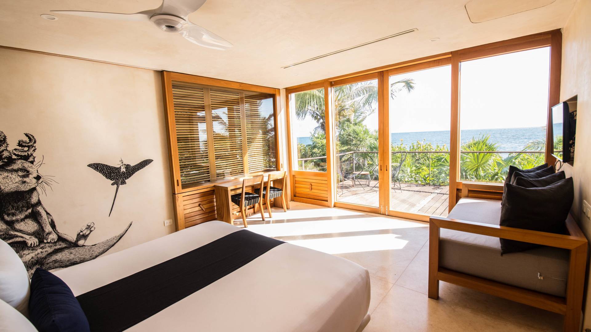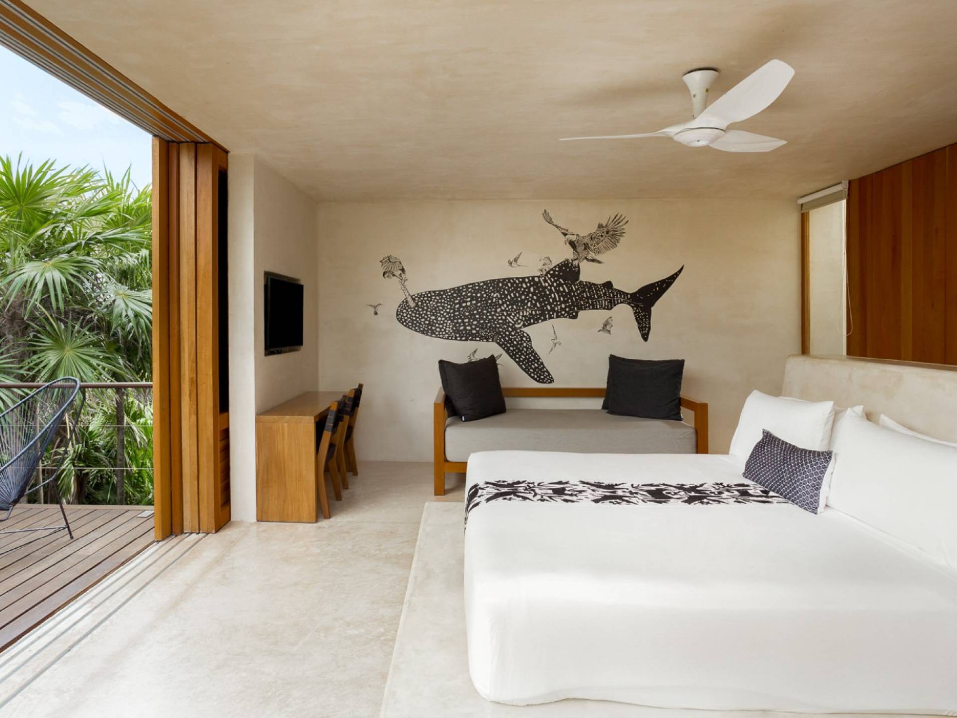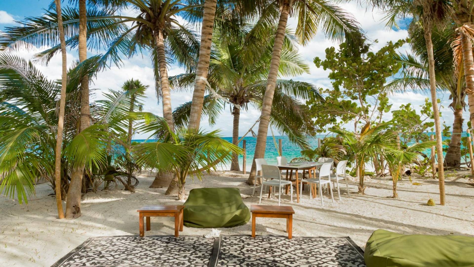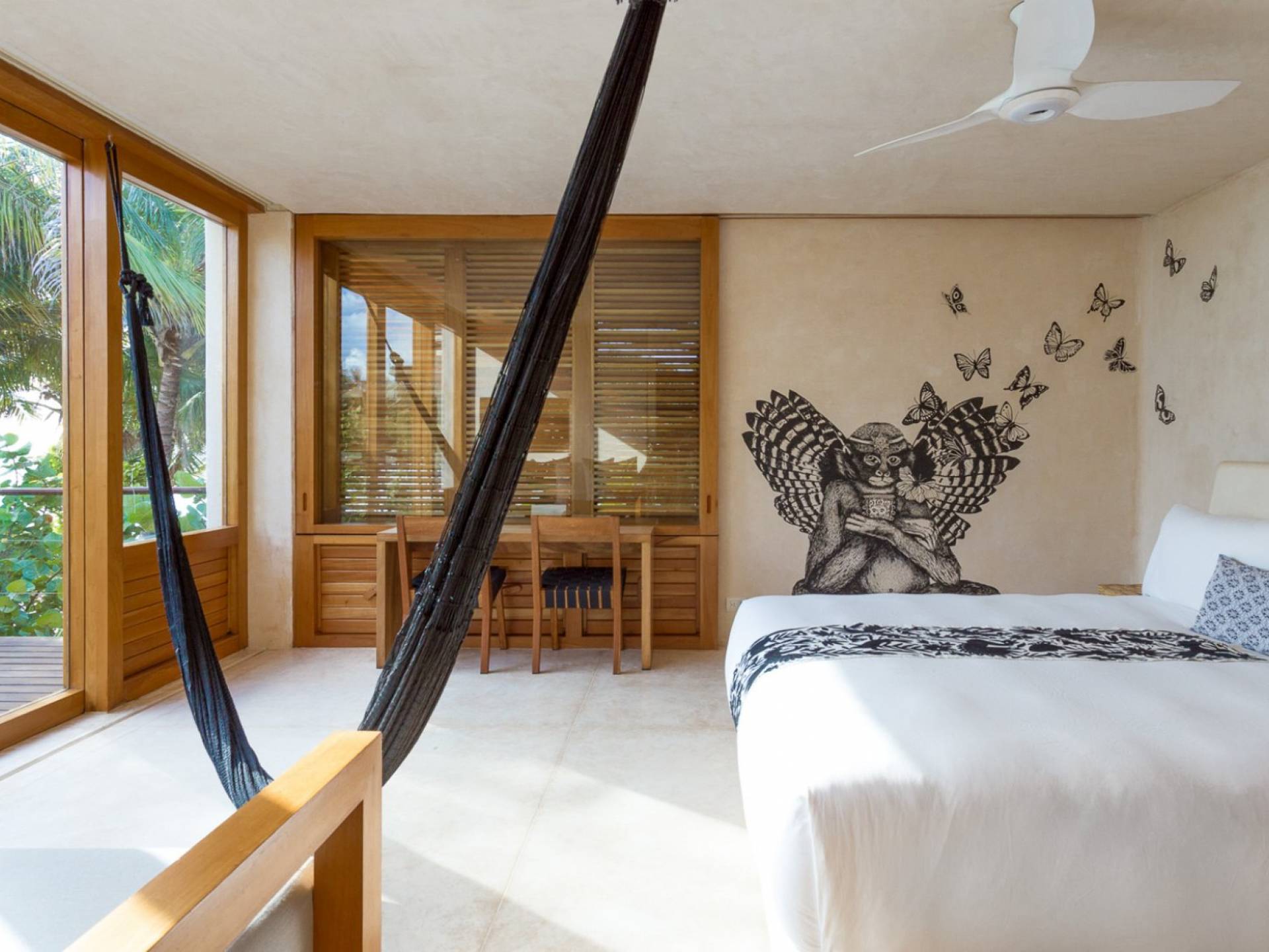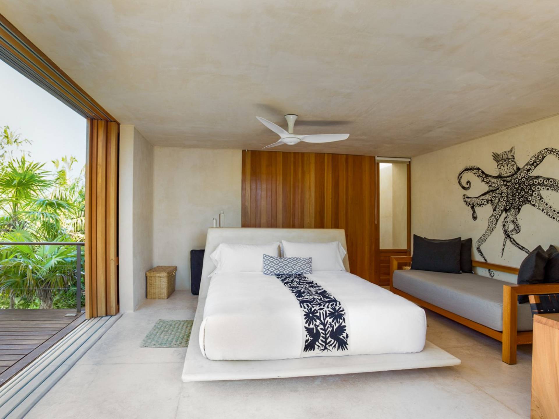 Viel Platz zum Spielen und Träumen. Direkt am Meer können Sie sich auf den Strandbetten mit einer Piña Colada aus den auf dem Anwesen angebauten Kokosnüssen entspannen und bräunen, am Riff schnorcheln oder mit dem Kajak hinauspaddeln. Oder treten Sie ein paar Meter vom Wasser entfernt in den gesprenkelten Schatten der Kokospalmen-Lounge, die mit stilvollen Liegestühlen und handgefertigten Hängematten aus dem nahe gelegenen Merida ausgestattet ist. Ihr Mittagessen kann unter den Kokospalmen serviert werden, während Sie sich zurücklehnen und den Fischadlern dabei zusehen, wie sie nach ihrer Beute tauchen. An einem anderen Tag können Sie Ihr Mittagessen auf dem Dach einnehmen, die 360°-Aussicht genießen, ein paar Runden im chlorfreien Pool drehen, auf den Sonnenliegen abhängen und eine Siesta machen. Das Dach ist ein idyllischer Ort für die Happy Hour, während Sie den Sonnenuntergang über der Lagune beobachten und die leichten Käfer in den Baumwipfeln tanzen.
