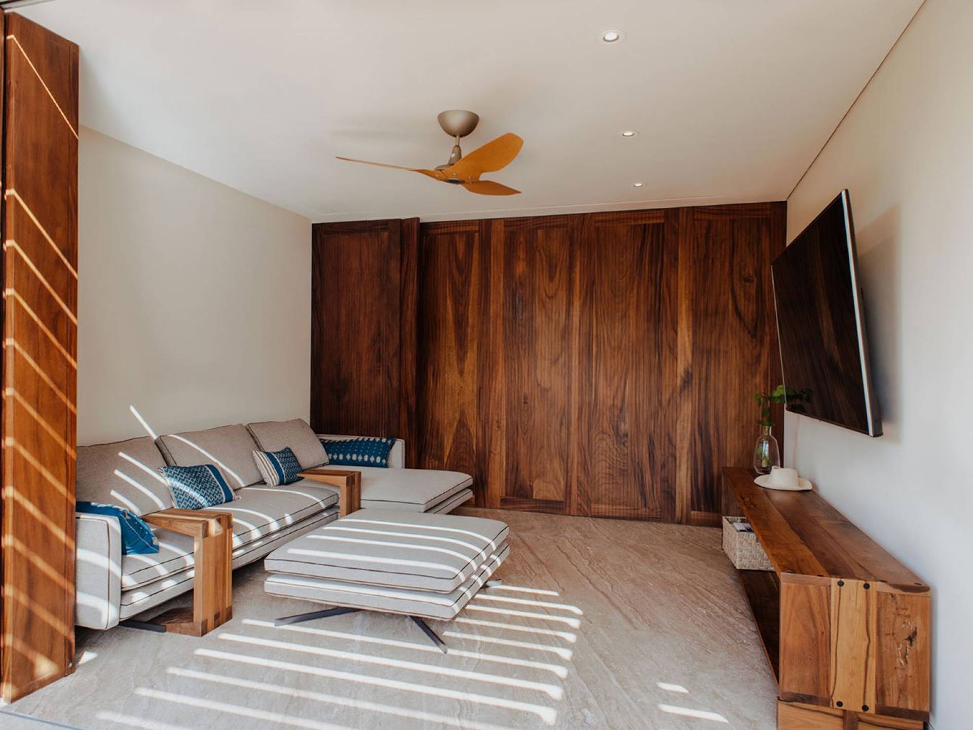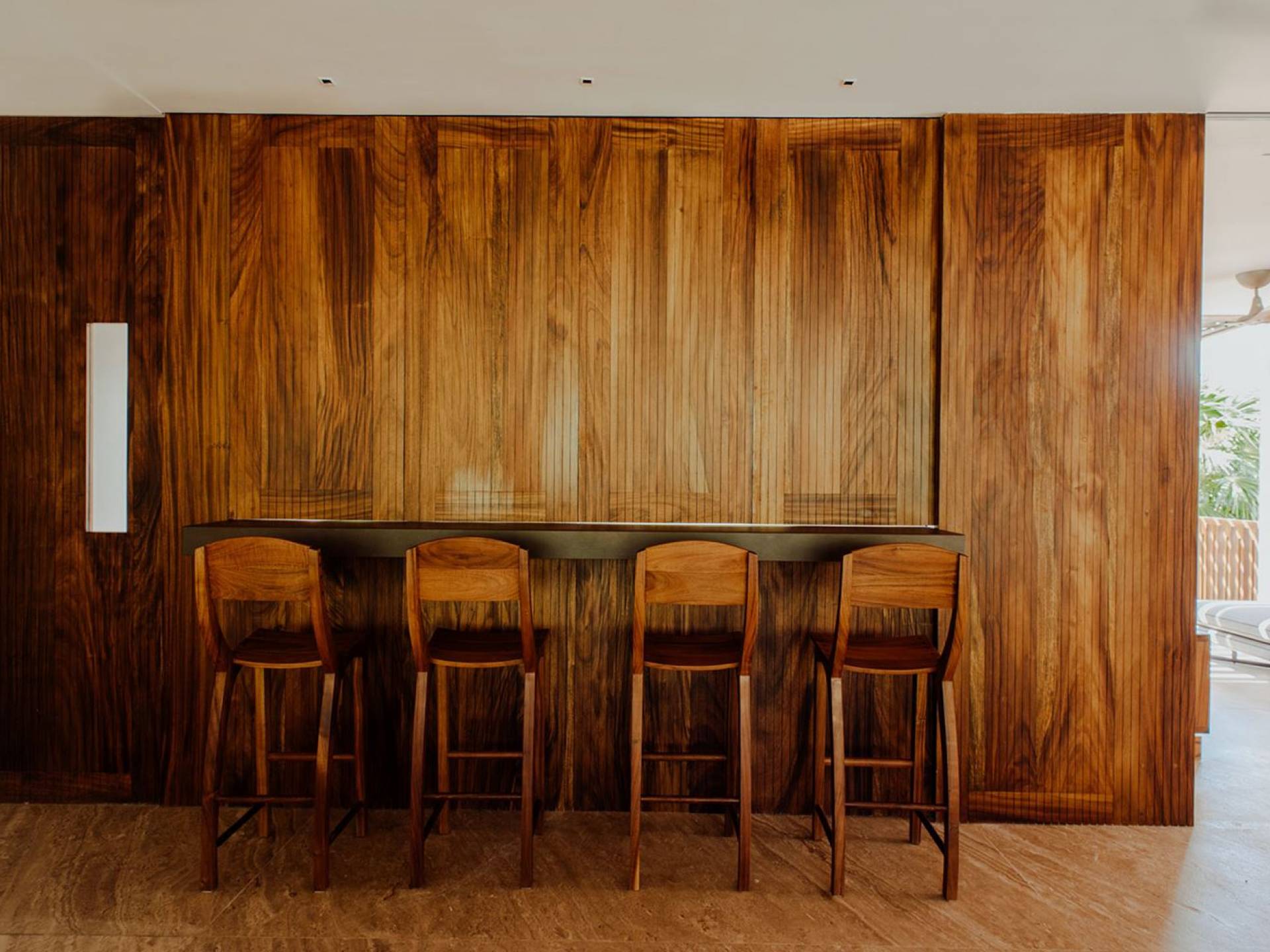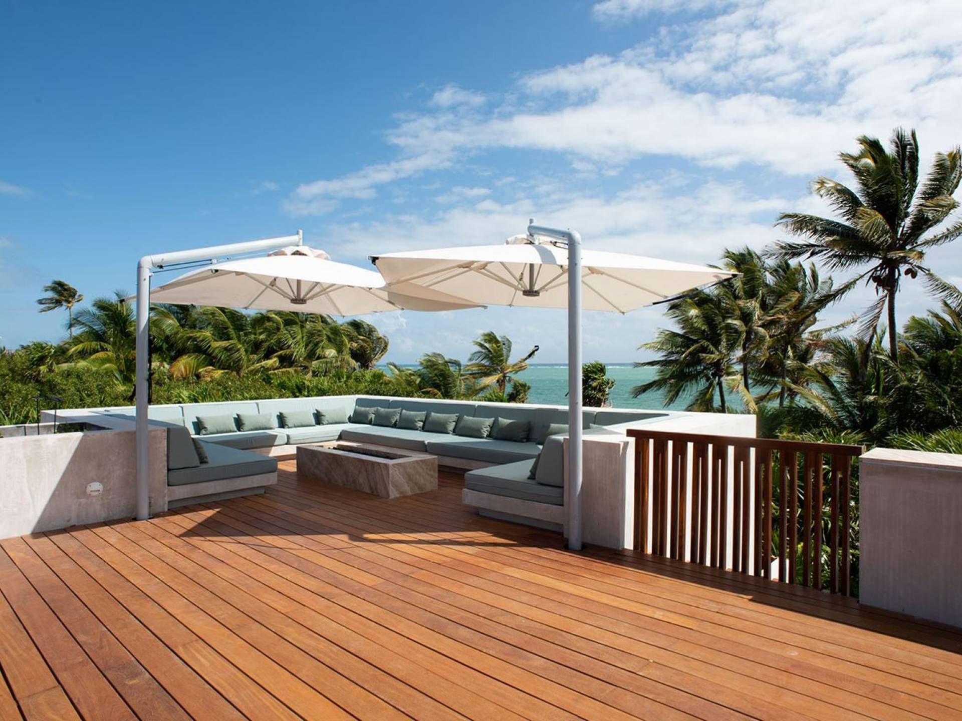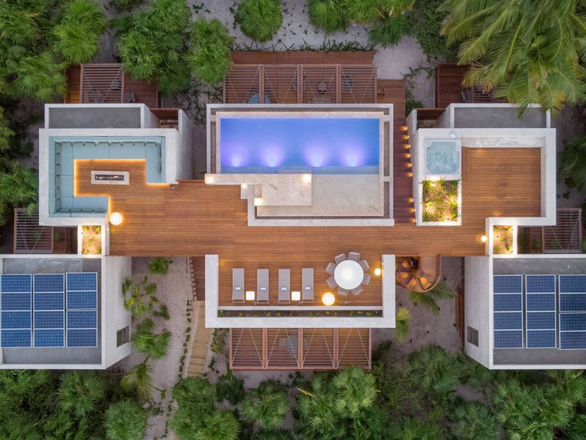 Das Dach wurde für opulentes Wohnen entworfen und verfügt über einen herrlichen 30-Fuß-Infinity-Salzwasserpool, einen Whirlpool für 8 Personen, eine Lounge mit Kamin, einen Bereich mit Sternenbeobachtung und sogar einen großen schattigen Tisch für Cocktails und Abendessen „über allem“. Uh K'aay wurde für ein harmonisches Leben mit der Natur geschaffen und verfügt über einziehbare Wände, offene Korridore und mehrere Terrassen, die ein nahtloses Wohnen im Innen- und Außenbereich ermöglichen. Diese luxuriöse Villa mit 4 Schlafzimmern wurde sorgfältig geplant, um mit der Meeresbrise, dem Himmel und dem Schatten zusammenzuarbeiten, um eine frische Atmosphäre mit einem sich ständig ändernden Spiel von Farben und Licht aufrechtzuerhalten. Das Innendesign ist inspiriert: clean und schlicht mit Holz, Weiß und Blau. Die Möbel, das Dekor und die Kunst wurden alle von mexikanischen Handwerkern geschaffen, die das lokale Erbe wunderbar in dieses erstaunliche Haus integrieren.