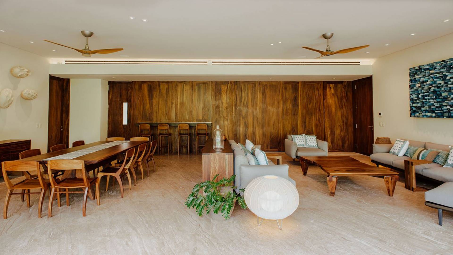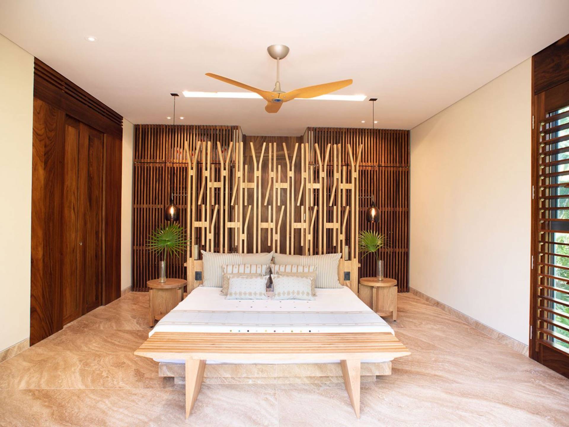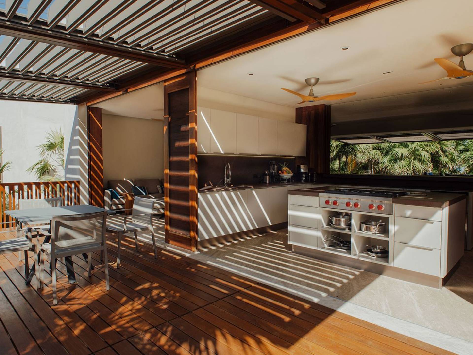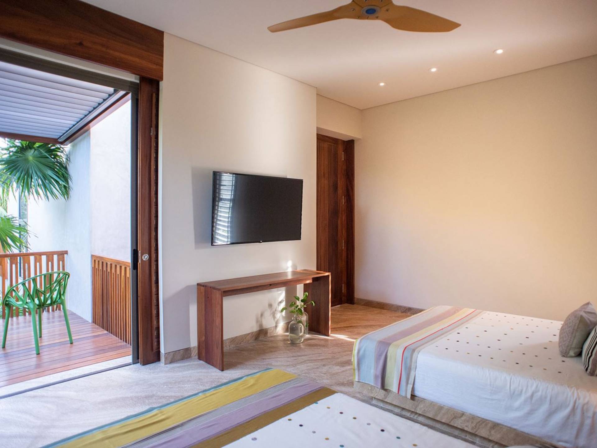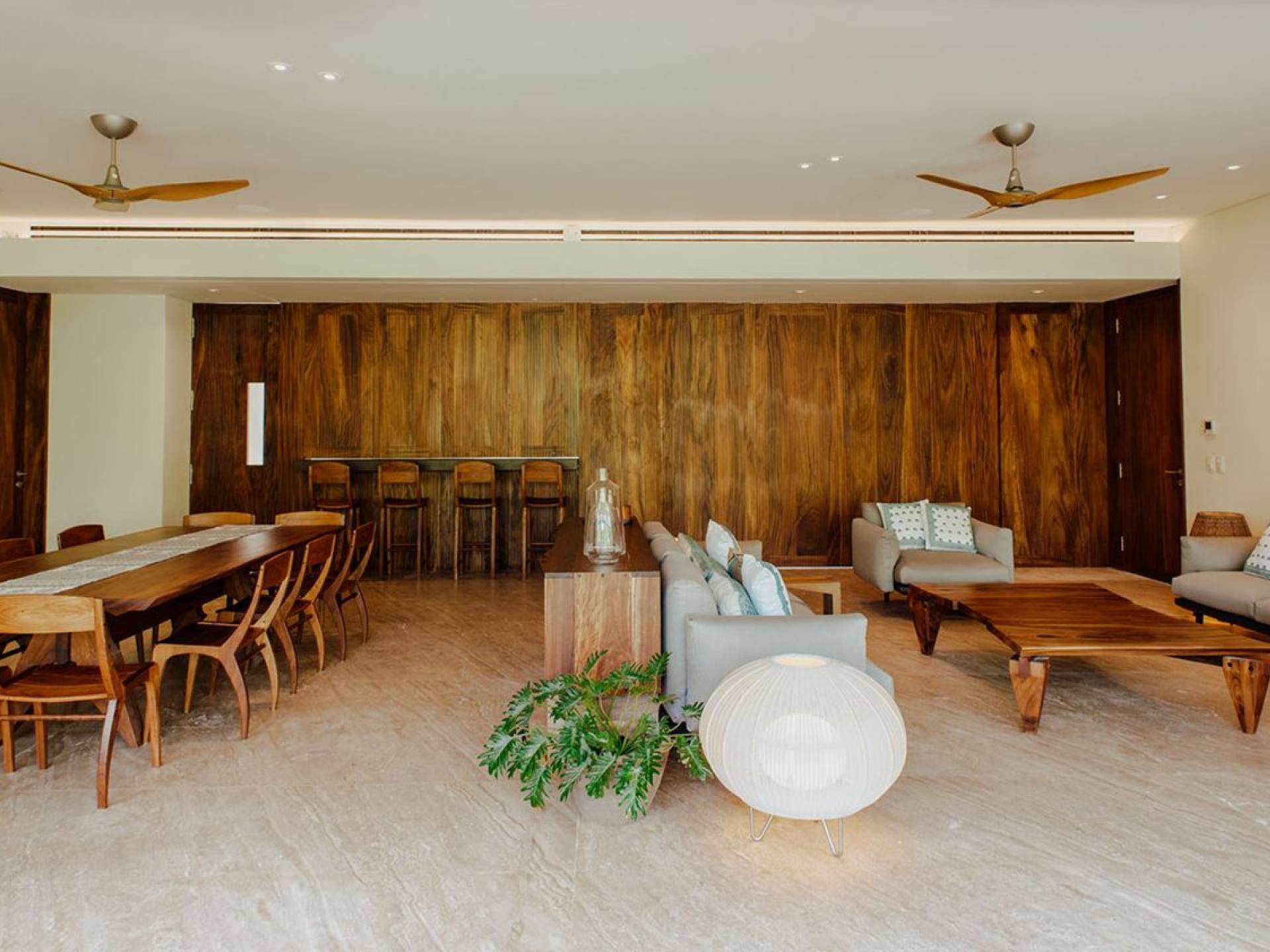 Das Dach wurde für opulentes Wohnen entworfen und verfügt über einen herrlichen 30-Fuß-Infinity-Salzwasserpool, einen Whirlpool für 8 Personen, eine Lounge mit Kamin, einen Bereich mit Sternenbeobachtung und sogar einen großen schattigen Tisch für Cocktails und Abendessen „über allem“. Uh K'aay wurde für ein harmonisches Leben mit der Natur geschaffen und verfügt über einziehbare Wände, offene Korridore und mehrere Terrassen, die ein nahtloses Wohnen im Innen- und Außenbereich ermöglichen. Diese luxuriöse Villa mit 4 Schlafzimmern wurde sorgfältig geplant, um mit der Meeresbrise, dem Himmel und dem Schatten zusammenzuarbeiten, um eine frische Atmosphäre mit einem sich ständig ändernden Spiel von Farben und Licht aufrechtzuerhalten. Das Innendesign ist inspiriert: clean und schlicht mit Holz, Weiß und Blau. Die Möbel, das Dekor und die Kunst wurden alle von mexikanischen Handwerkern geschaffen, die das lokale Erbe wunderbar in dieses erstaunliche Haus integrieren.