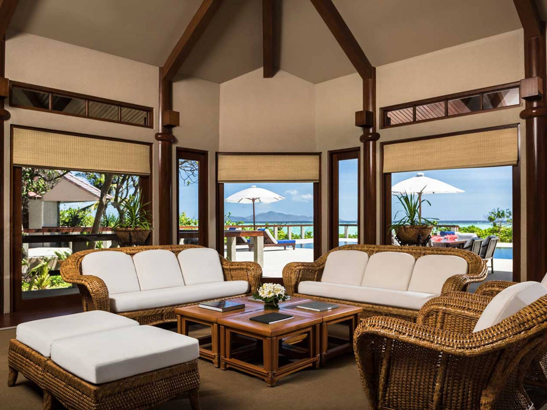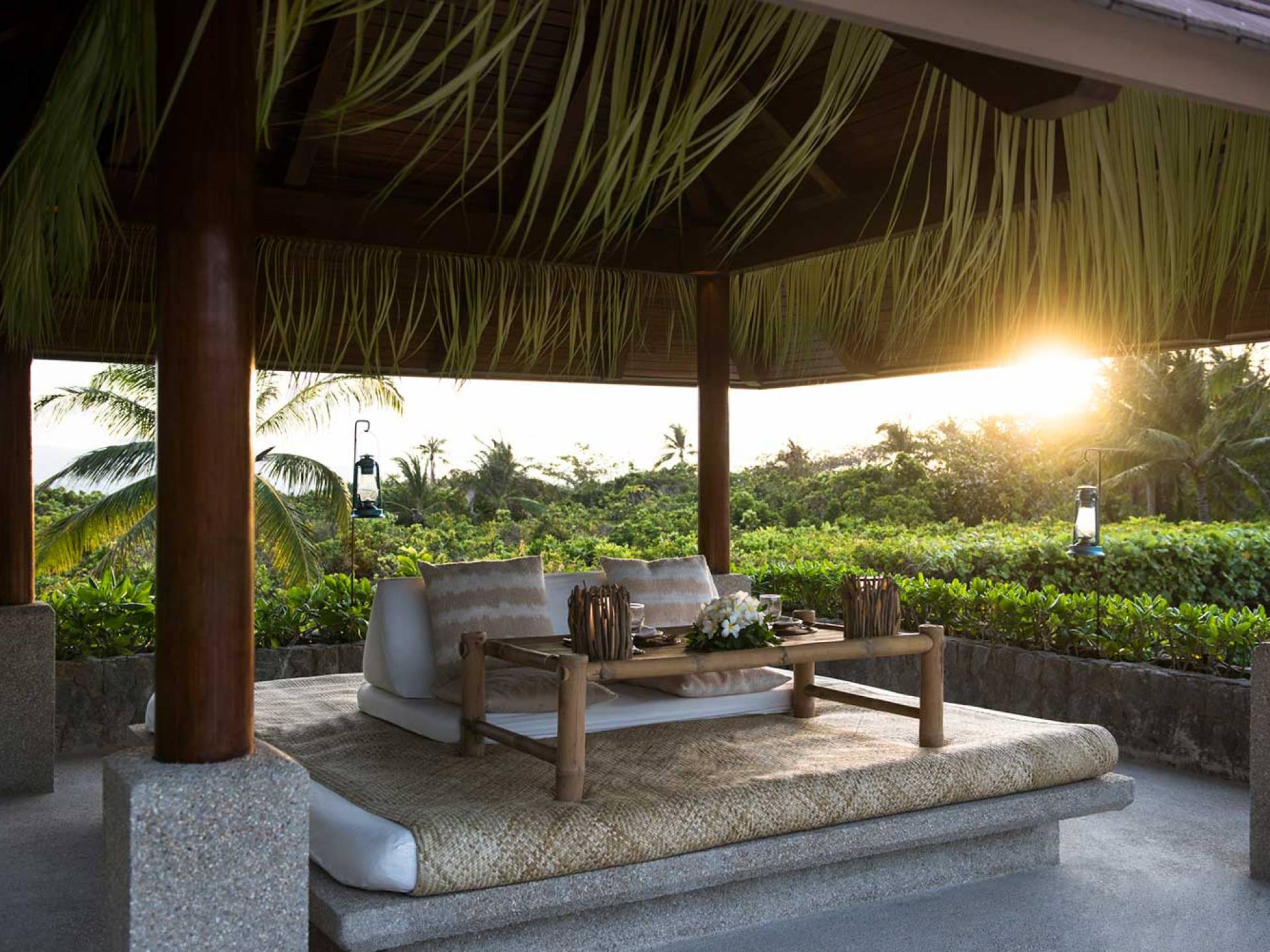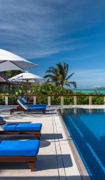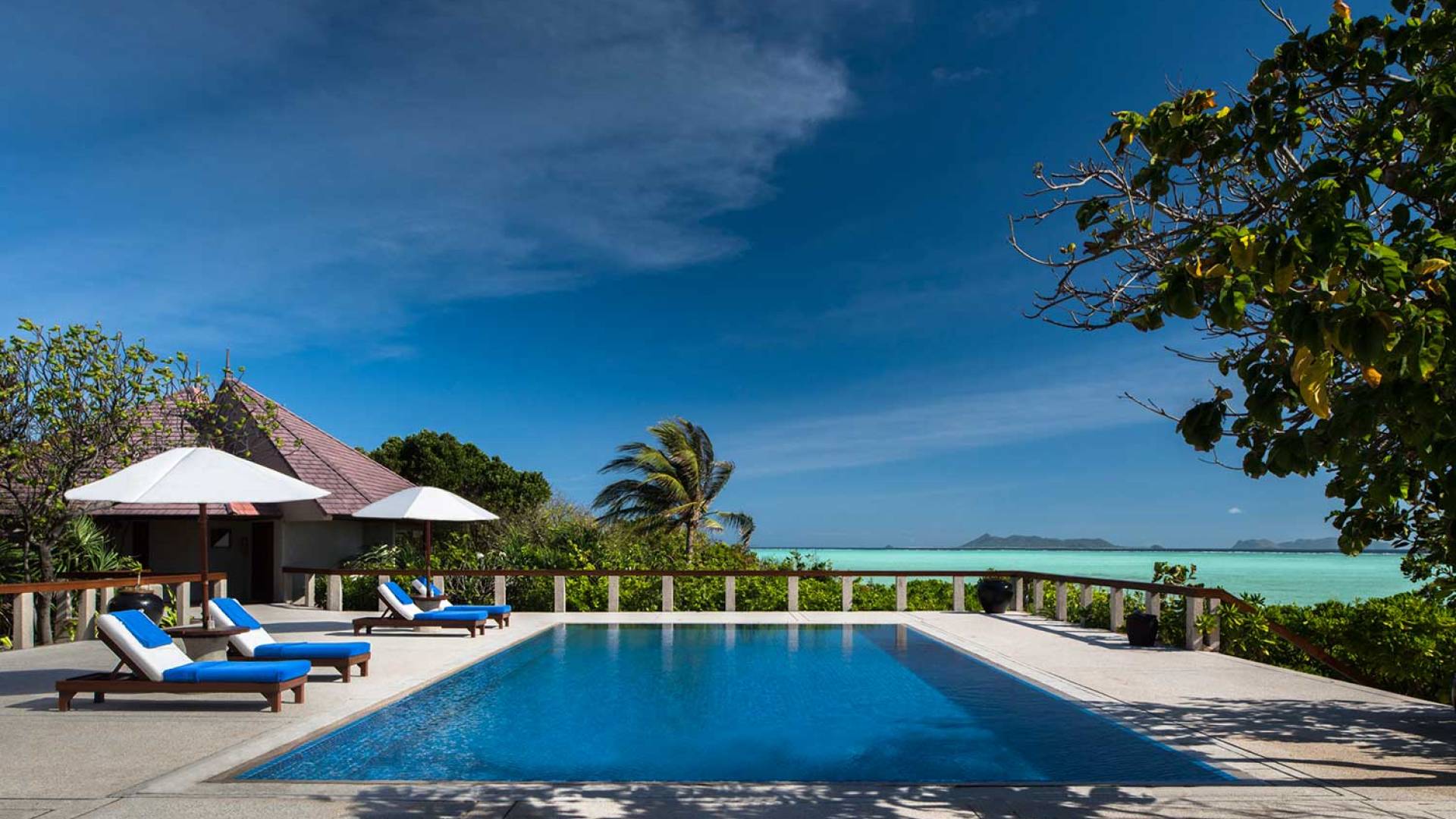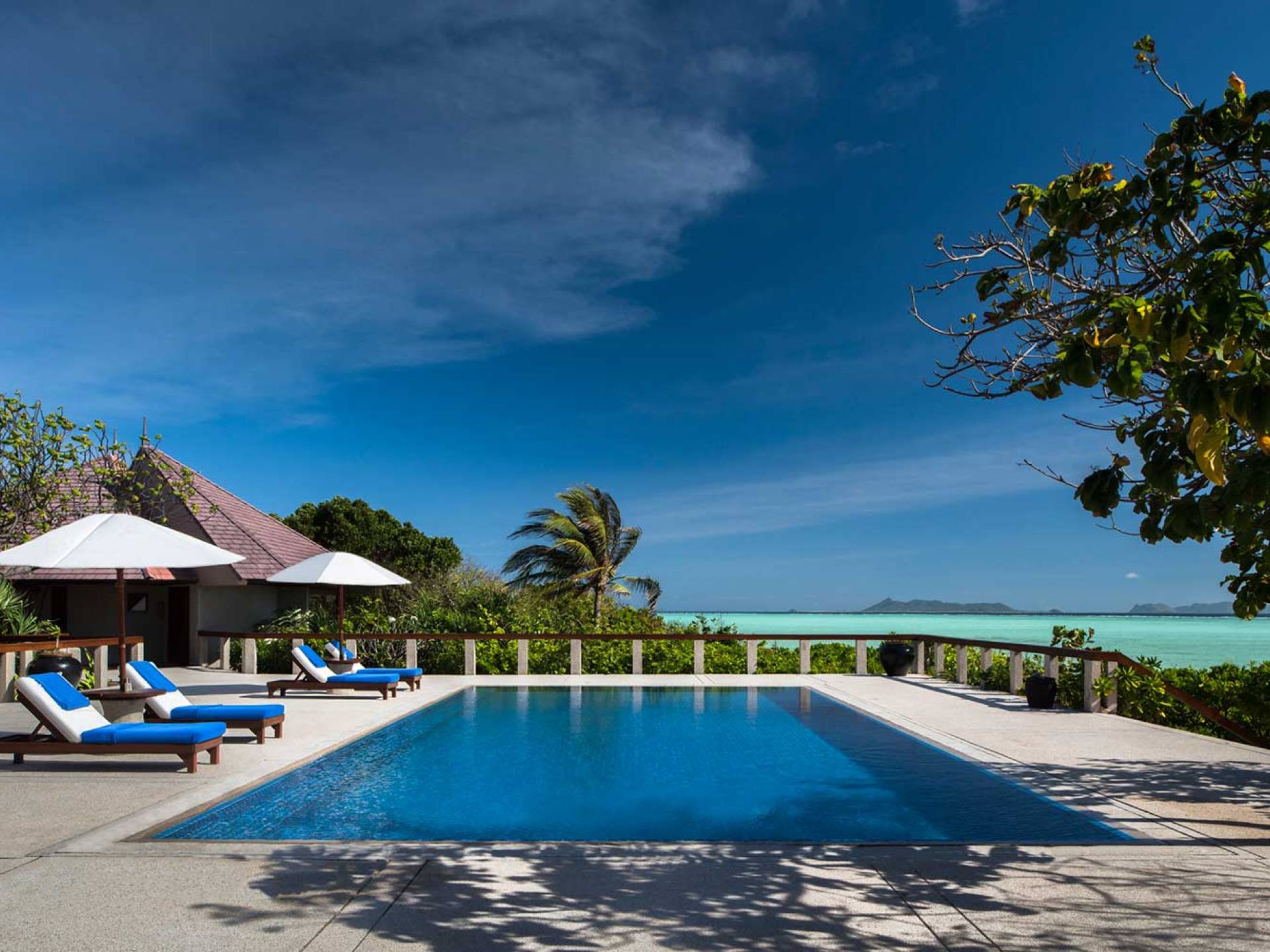 Die Villen mit 2 Schlafzimmern von Amanpulo mit Blick auf das leuchtend türkisfarbene Wasser der Küste verfügen über einen großen zentralen Pool und eine klimatisierte Wohnfläche von 215 m².