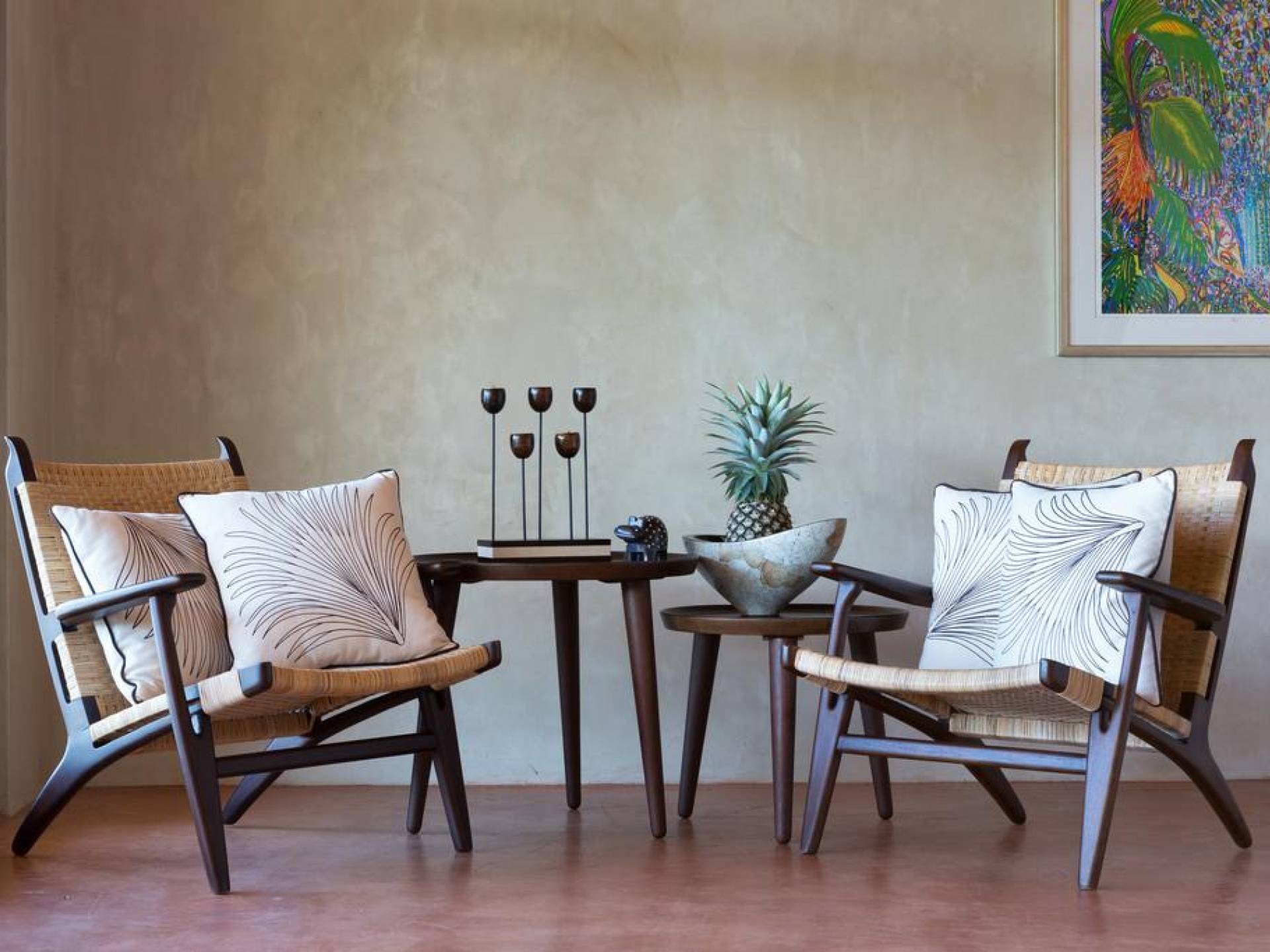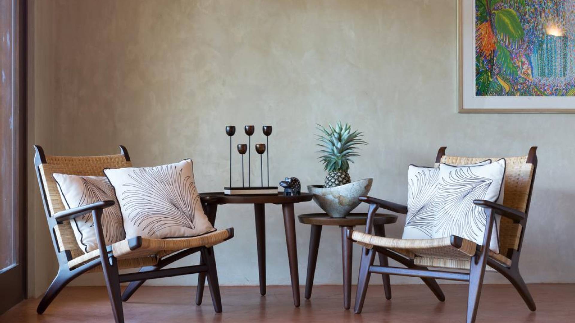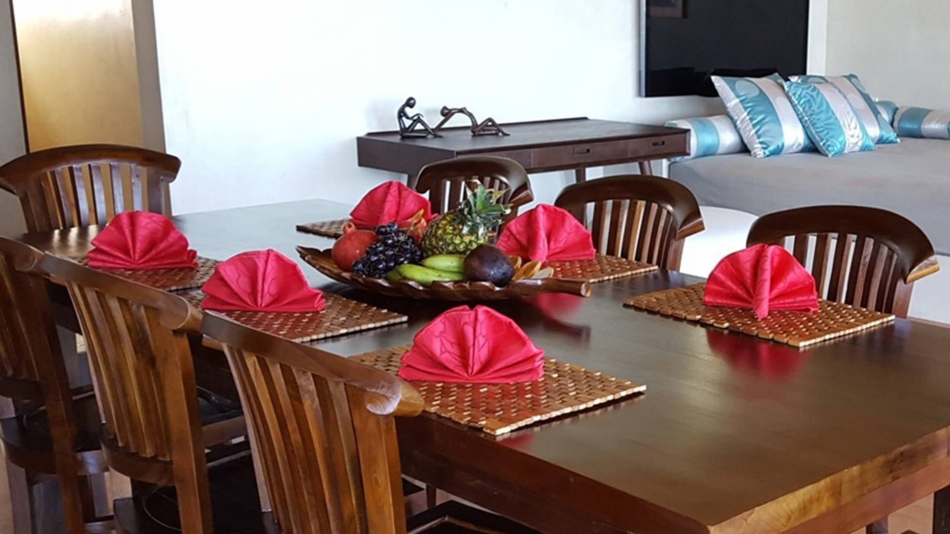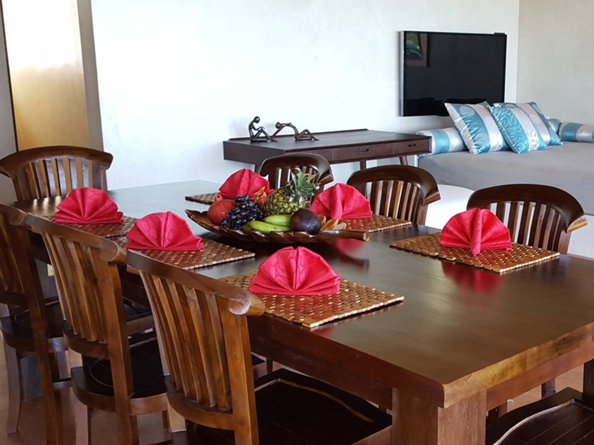 Alle Schlafzimmer sind voll klimatisiert, Wohnzimmer und Terrassenbereich sind mit Deckenventilatoren ausgestattet. Das gesamte Interieur der Villa ist mit stilvollen Massivmöbeln aus Bali ausgestattet. Der Wohnbereich bietet durch audiovisuelle Technologie, Bang & Olufsen, Internet und WLAN ausreichend Komfort zum Entspannen oder Faulenzen und Filme schauen oder Musik hören.
