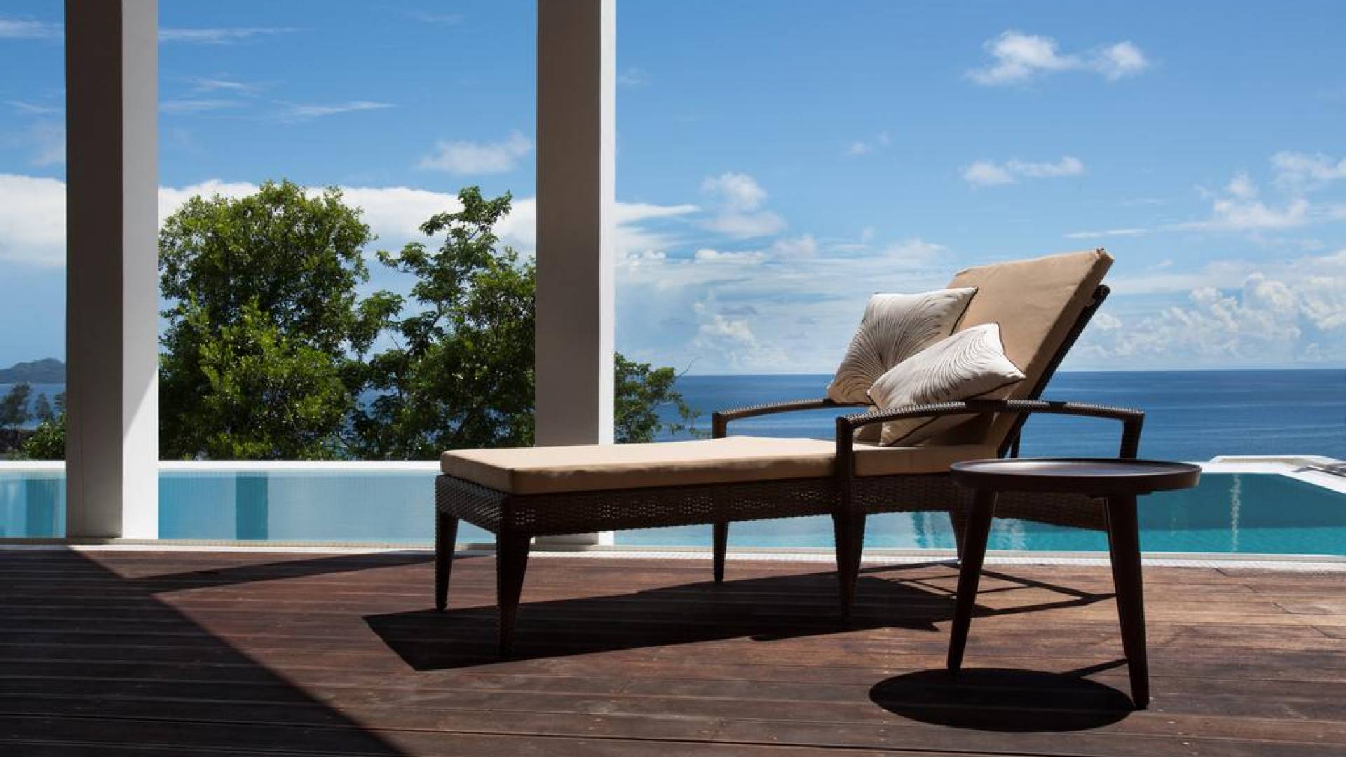 Eine geräumige Terrasse mit Tagesbetten und Rattansitzen mit spektakulärem Blick auf das Meer. Die King-Villa verfügt über einen eigenen Pool mit Überlauf und Planschbecken, einen großzügigen Sitzbereich und eine Außenküche mit Minibar. Die köstlichen Gerichte werden von einem privaten Koch zubereitet, der Ihnen voll zur Verfügung steht.