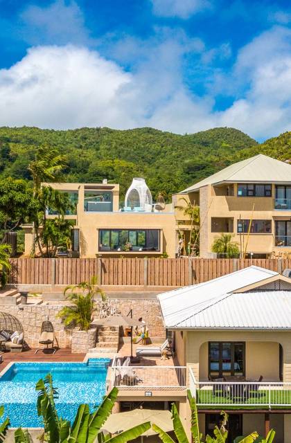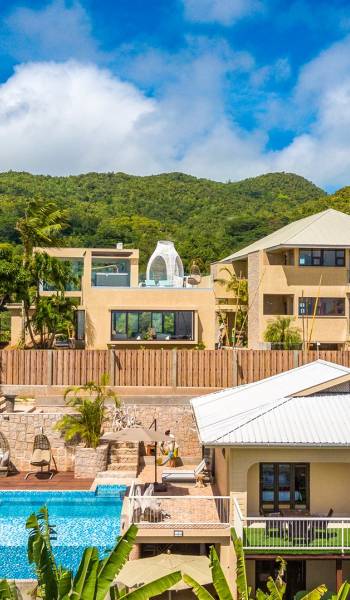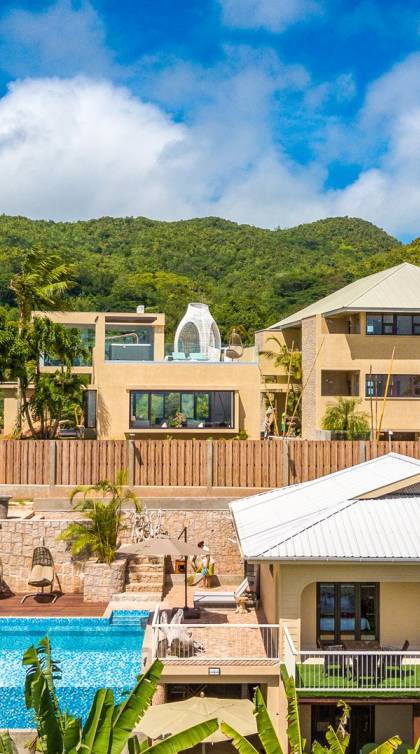 Villa 180 Seychelles befindet sich auf einem Hügel oberhalb des Hotels. Die Villa genießt einen spektakulären Blick auf den Strand von Cote D'Or, die benachbarten Inseln und die Küste. Es bietet ultimativen Komfort und bietet Familien und Freunden die Möglichkeit, eine andere Art von privater Unterkunft zu genießen und gleichzeitig den legendären Service und die Gastfreundschaft des Hotels zu genießen.