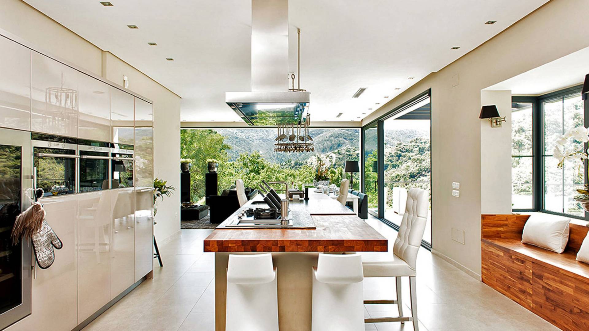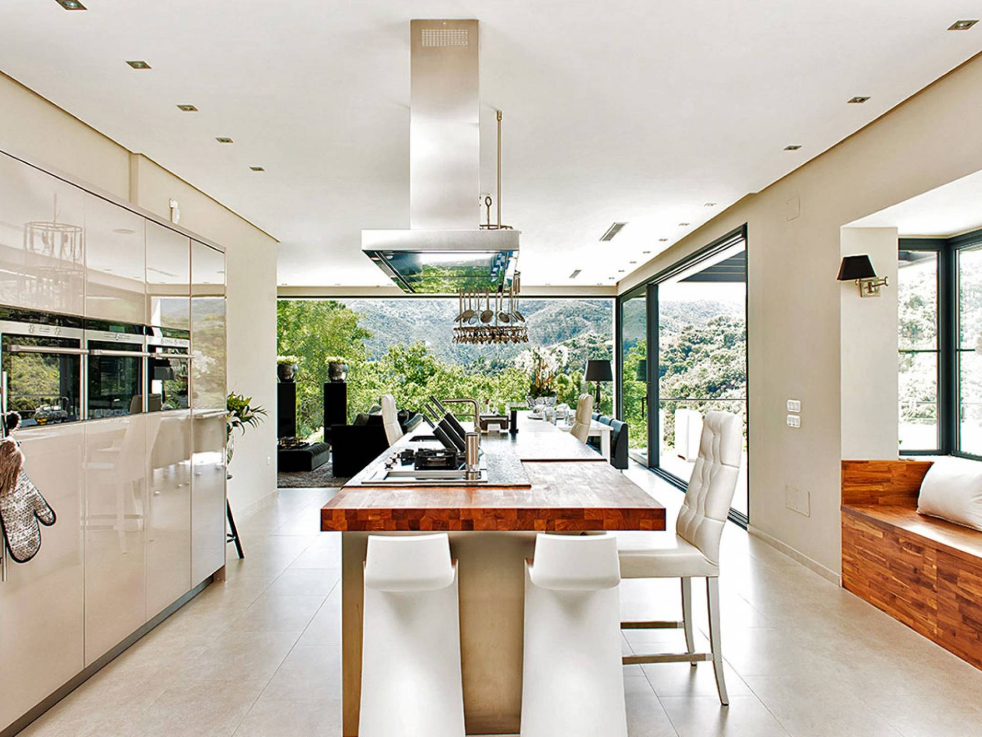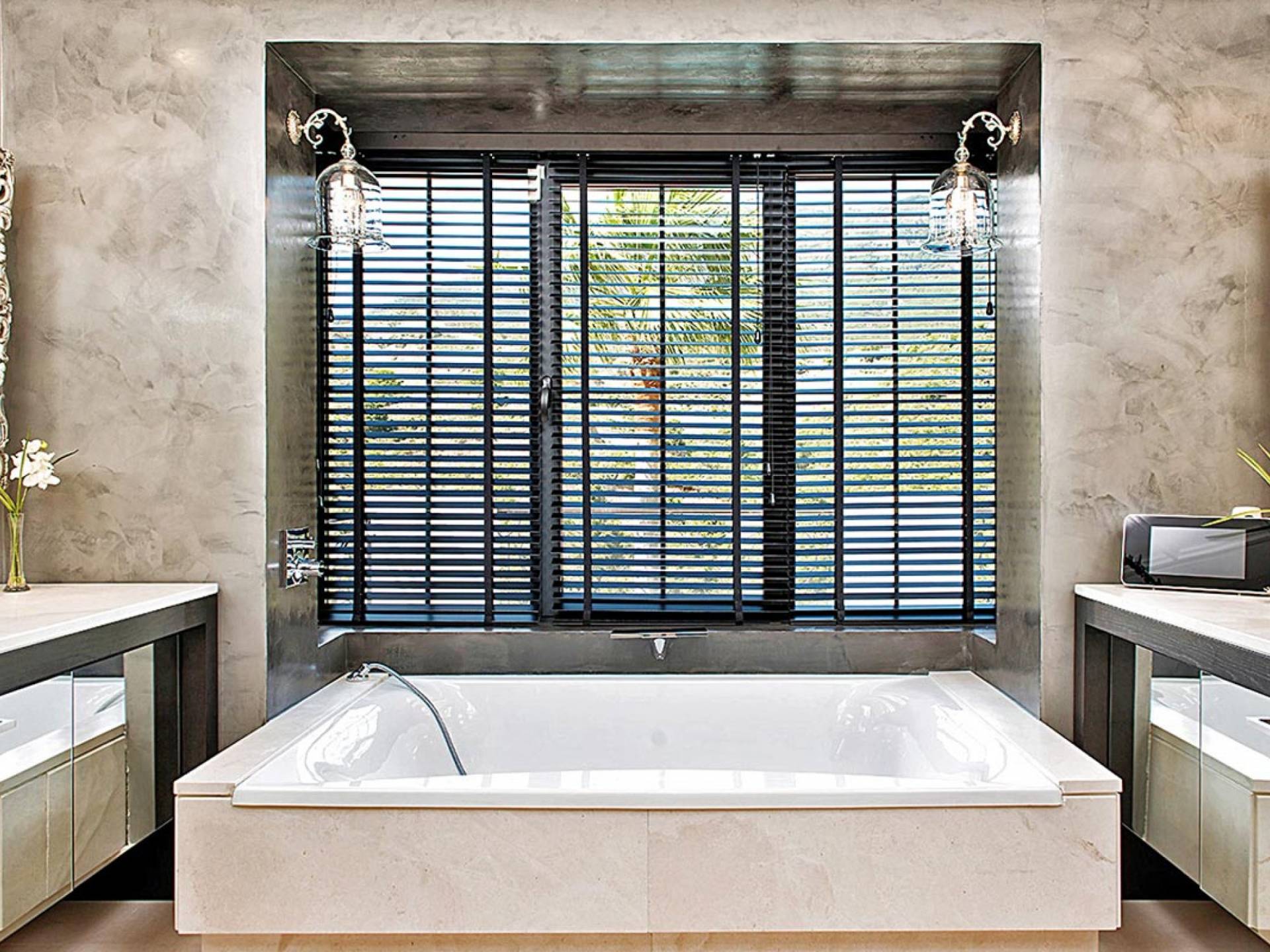 Der Fokus liegt überall auf dezentem Luxus mit hohen Decken, umlaufenden raumhohen Glasfenstern, Marmorbädern und hochwertigen Möbeln. Der Hauptwohnbereich ist der perfekte Ort für Gäste, um sich zu entspannen, Kontakte zu knüpfen, zu unterhalten oder zu speisen, und bietet eine herrliche Aussicht auf die Gärten und den Poolbereich. Eine große und voll ausgestattete moderne Küche öffnet sich direkt zum Essbereich im Freien und durch den Garten.