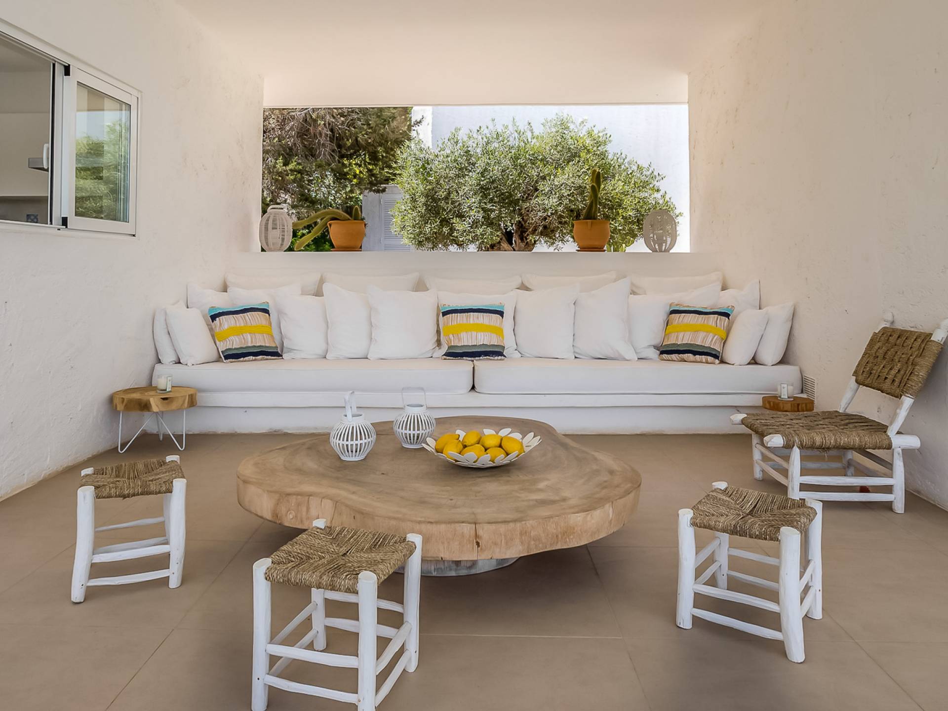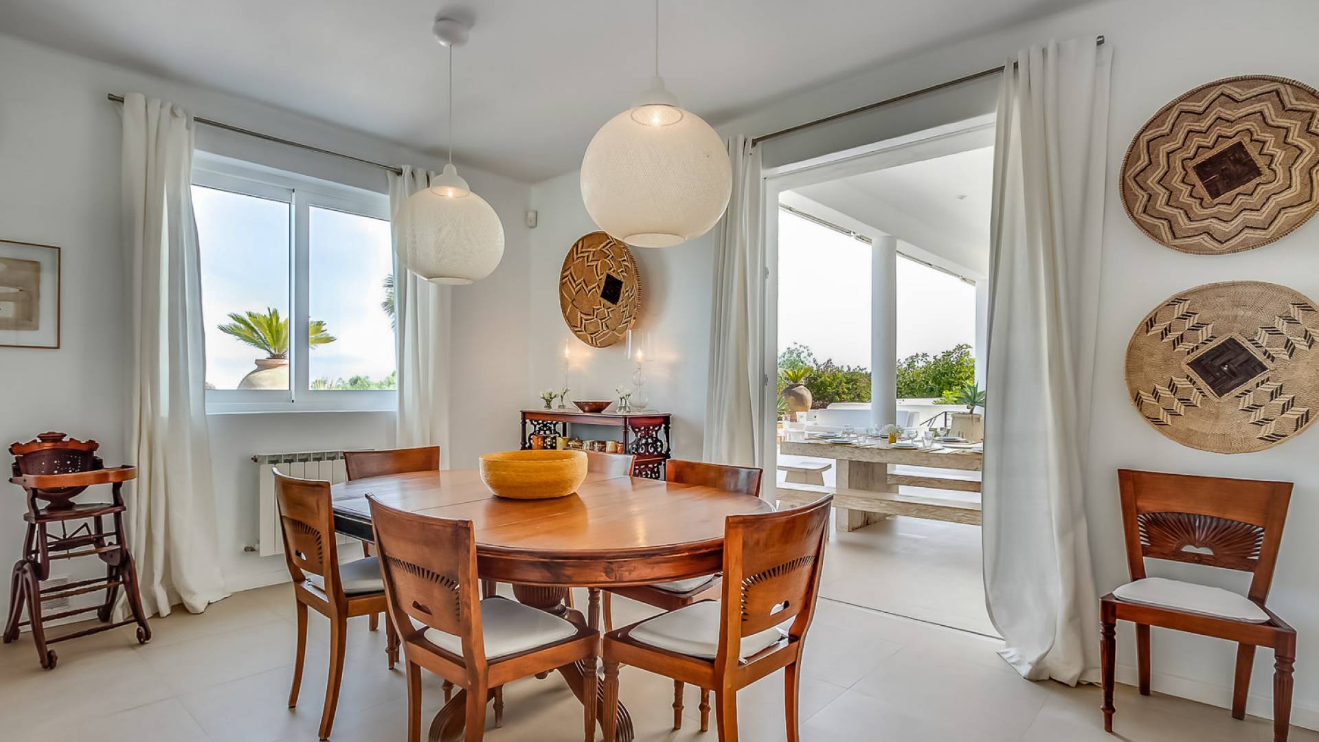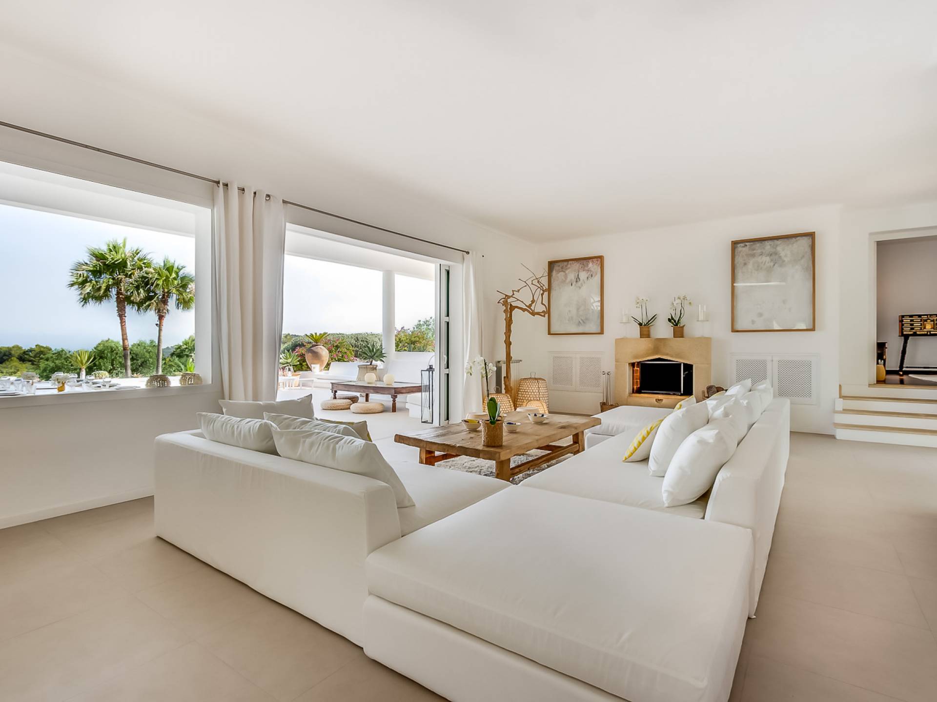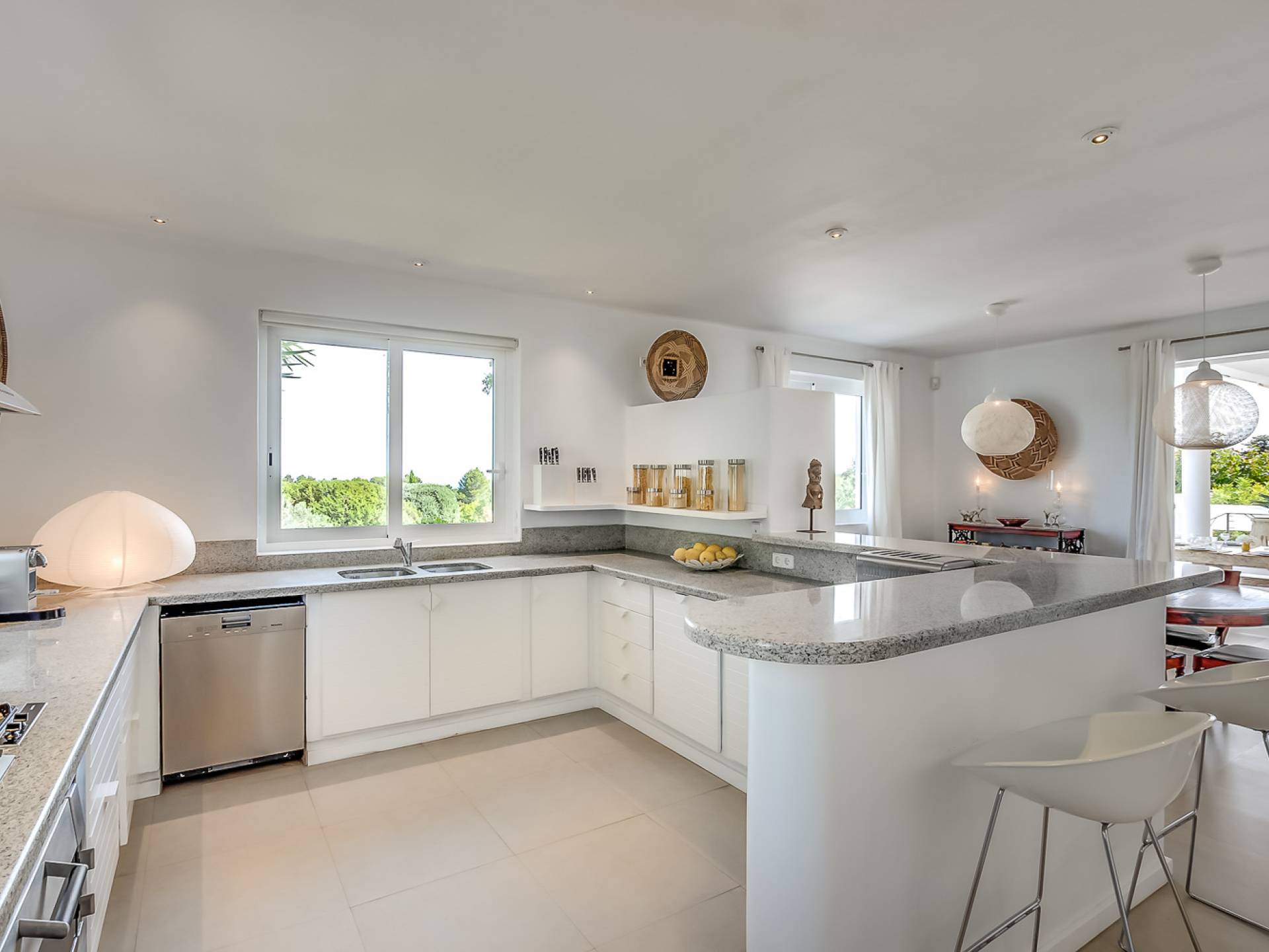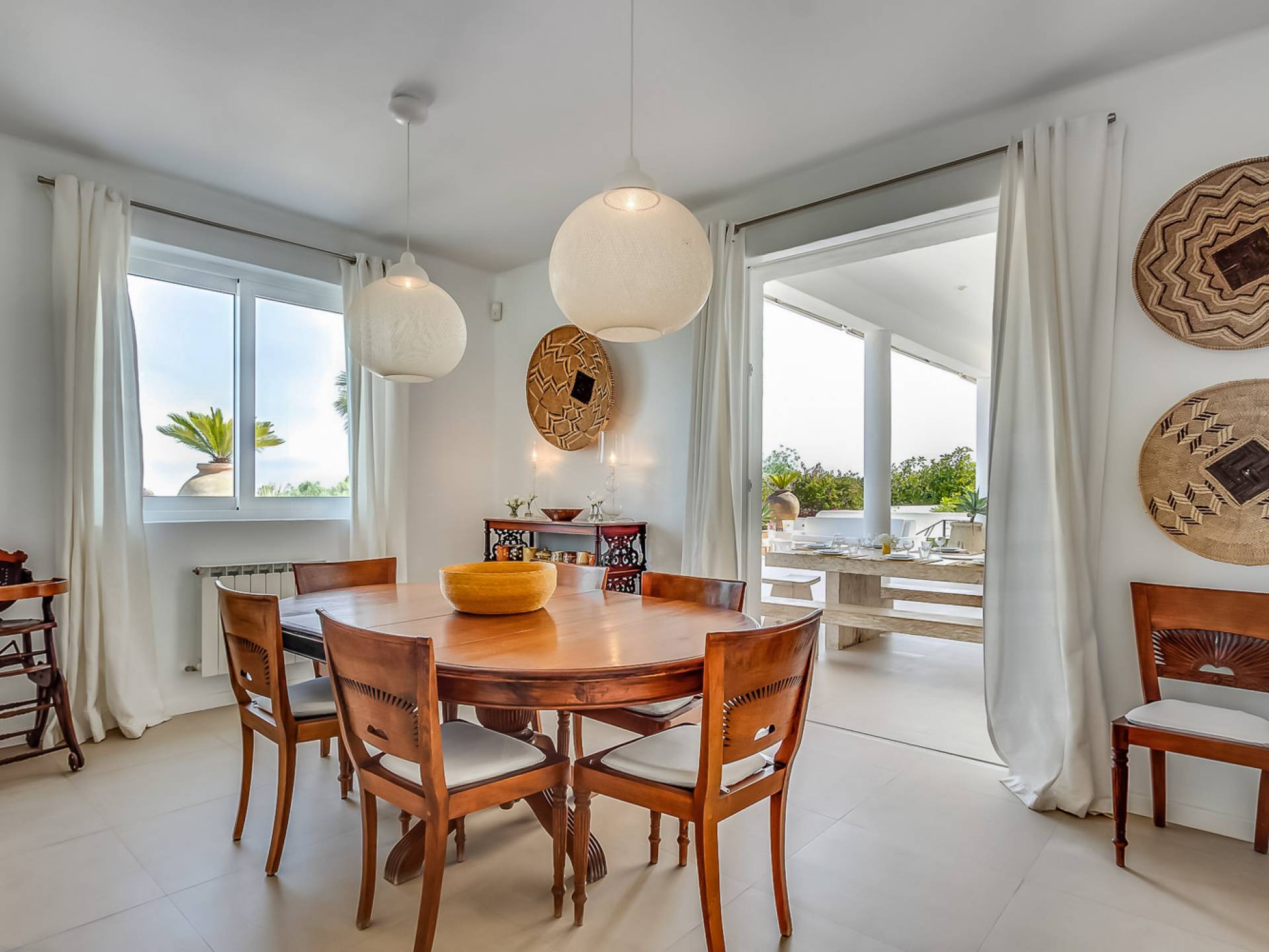 Die Can Felipe Villa ist überwiegend ganz in Weiß gehalten, mit einem Hauch klassischer ibizenkischer Architektur, sowie modern mit einer wunderbar ruhigen und gemütlichen Atmosphäre. Es verfügt über ein Heizsystem und einen Kamin für kühlere Jahreszeiten, ein Bose- und Sonos-Musiksystem im Innen- und Außenbereich mit iPod-Anschluss und Zugang zu WIFI ist im gesamten Gebäude vorhanden. Es gibt eine Bibliothek mit Büchern in mindestens 4 oder 5 verschiedenen Sprachen für alle Arten von Interessen für Erwachsene und Kinder, eine DVD-Sammlung mit Klassikern, Action- und Kinderfilmen sowie Spielen und Rätseln für alle. Die Küche ist komplett ausgestattet und bietet Meerblick mit Zugang zum Kräutergarten. Zur Ausstattung gehören Kaltpressen-Entsafter, Nespresso-Maschine, professioneller Pommes-Frites-Cutter, 2 Gaggenau-Öfen (ein extra großer und ein normaler für Gebäck), Miele-Geschirrspüler, Mikrowelle, Joghurtbereiter. Außerdem gibt es genügend Geschirr, Gläser, Messer und Gabeln usw. für Dinnerpartys für bis zu 40 Personen. Der Essbereich im Inneren bietet bequem Platz für 8 Personen und öffnet sich auf die geräumige Terrasse. Die Waschküche besteht aus einer Miele-Waschmaschine und -Trockner, einem zusätzlichen Kühlschrank und einem Bügelbereich.