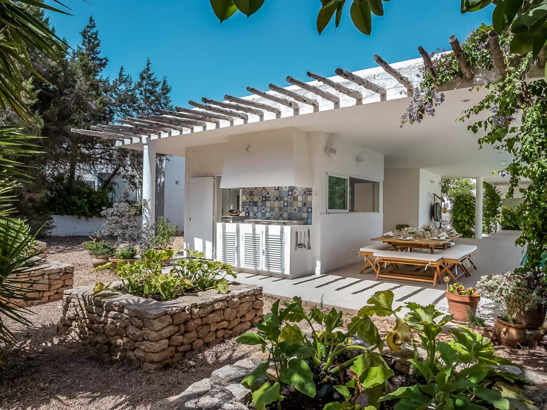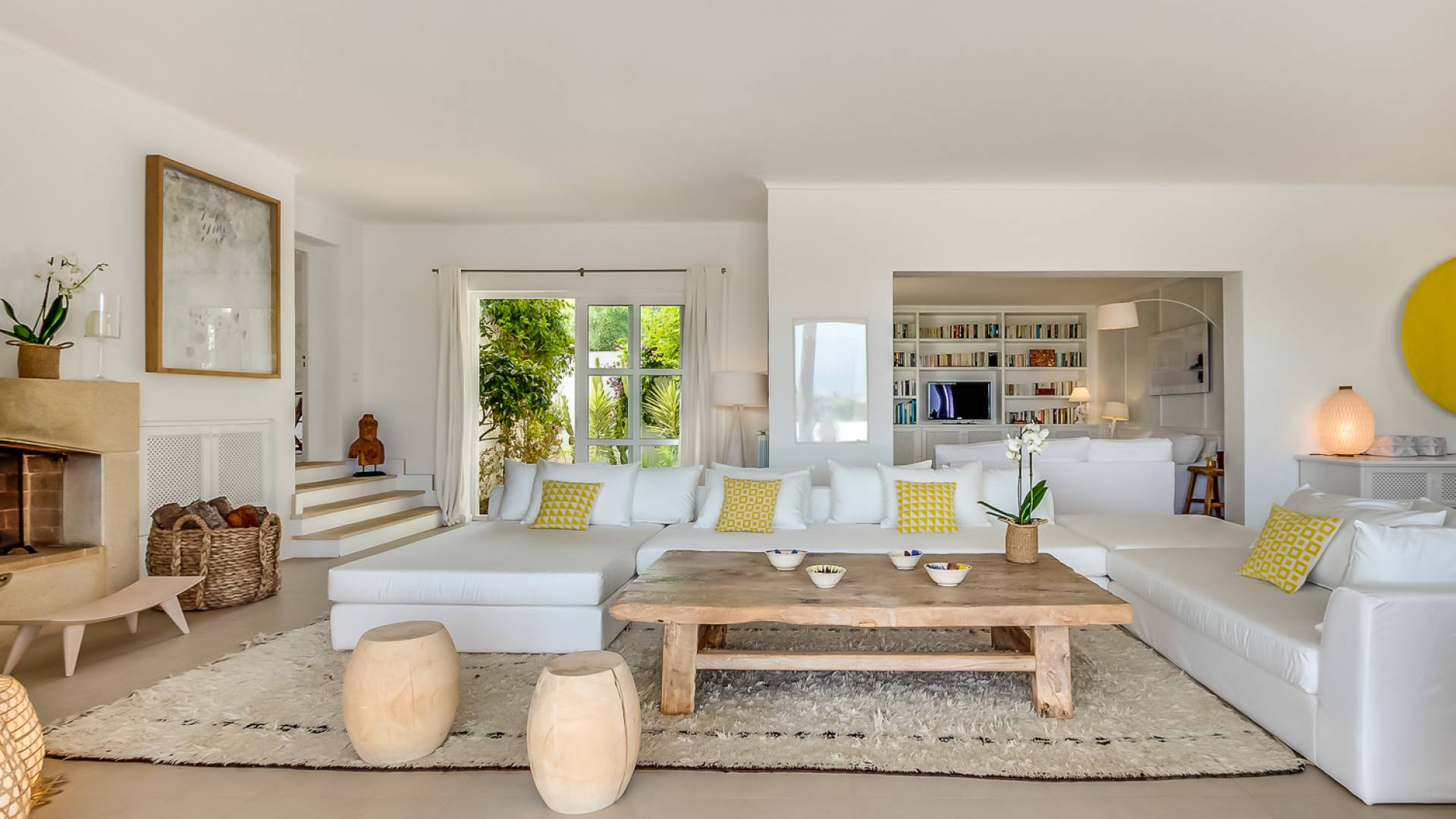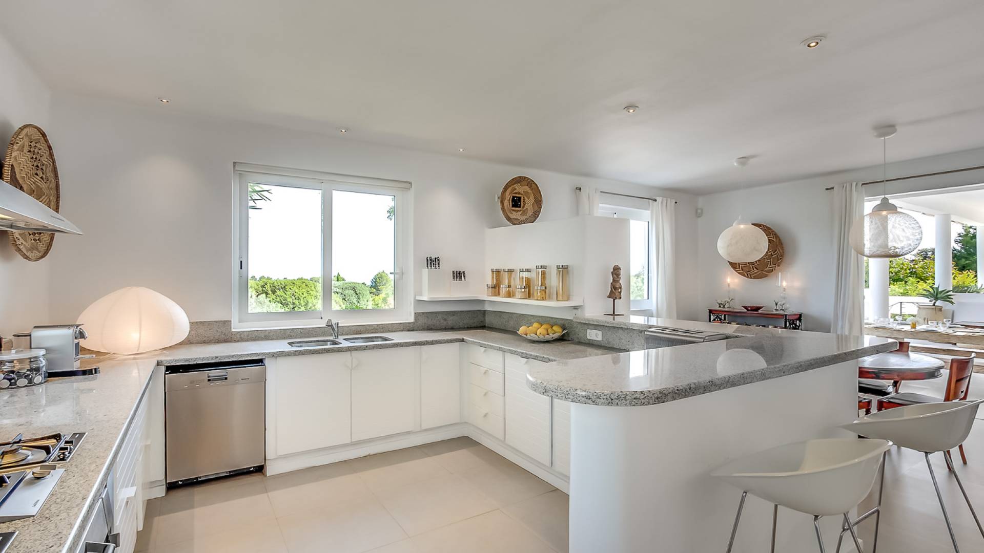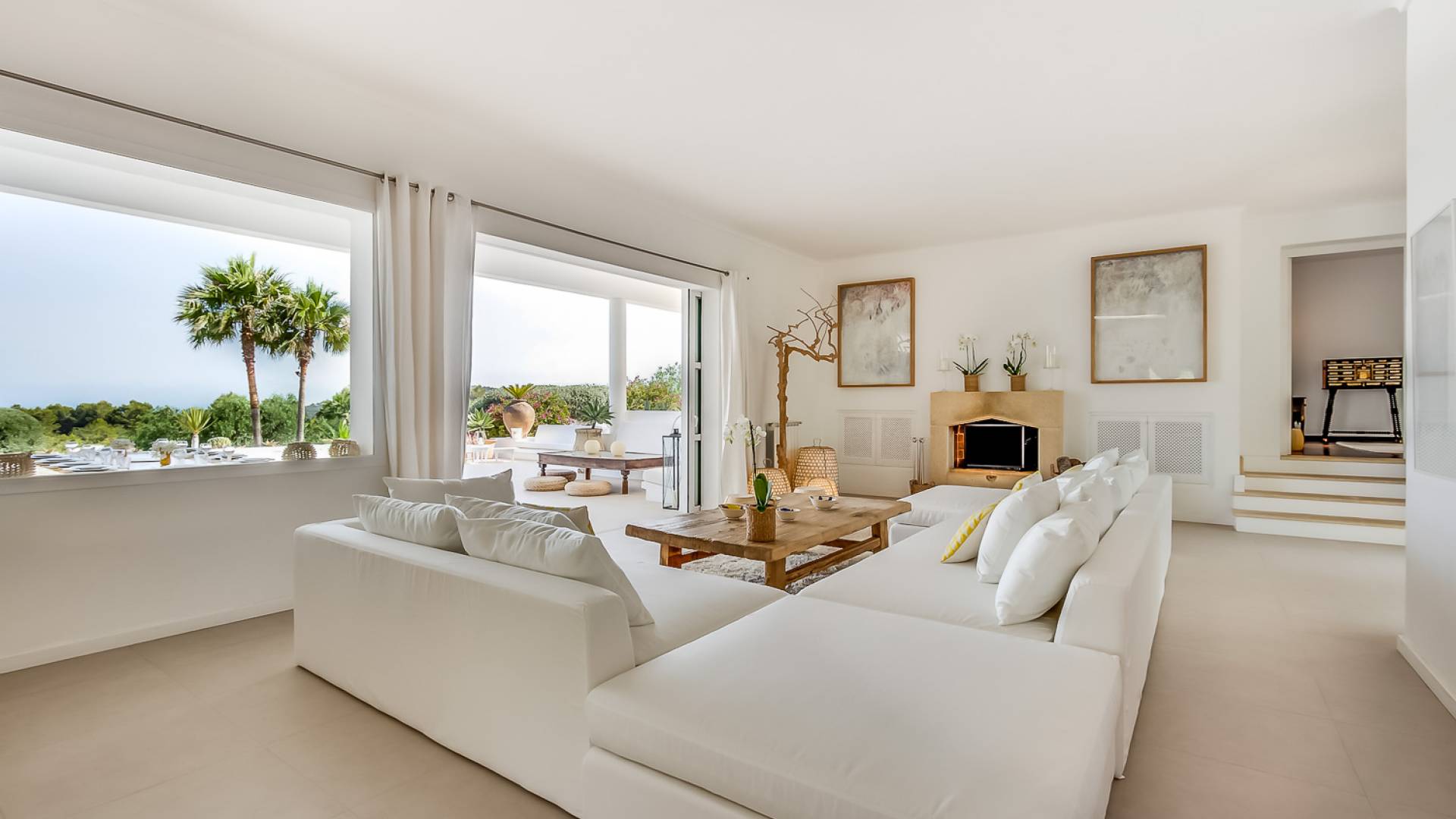 Die Can Felipe Villa ist überwiegend ganz in Weiß gehalten, mit einem Hauch klassischer ibizenkischer Architektur, sowie modern mit einer wunderbar ruhigen und gemütlichen Atmosphäre. Es verfügt über ein Heizsystem und einen Kamin für kühlere Jahreszeiten, ein Bose- und Sonos-Musiksystem im Innen- und Außenbereich mit iPod-Anschluss und Zugang zu WIFI ist im gesamten Gebäude vorhanden. Es gibt eine Bibliothek mit Büchern in mindestens 4 oder 5 verschiedenen Sprachen für alle Arten von Interessen für Erwachsene und Kinder, eine DVD-Sammlung mit Klassikern, Action- und Kinderfilmen sowie Spielen und Rätseln für alle. Die Küche ist komplett ausgestattet und bietet Meerblick mit Zugang zum Kräutergarten. Zur Ausstattung gehören Kaltpressen-Entsafter, Nespresso-Maschine, professioneller Pommes-Frites-Cutter, 2 Gaggenau-Öfen (ein extra großer und ein normaler für Gebäck), Miele-Geschirrspüler, Mikrowelle, Joghurtbereiter. Außerdem gibt es genügend Geschirr, Gläser, Messer und Gabeln usw. für Dinnerpartys für bis zu 40 Personen. Der Essbereich im Inneren bietet bequem Platz für 8 Personen und öffnet sich auf die geräumige Terrasse. Die Waschküche besteht aus einer Miele-Waschmaschine und -Trockner, einem zusätzlichen Kühlschrank und einem Bügelbereich.