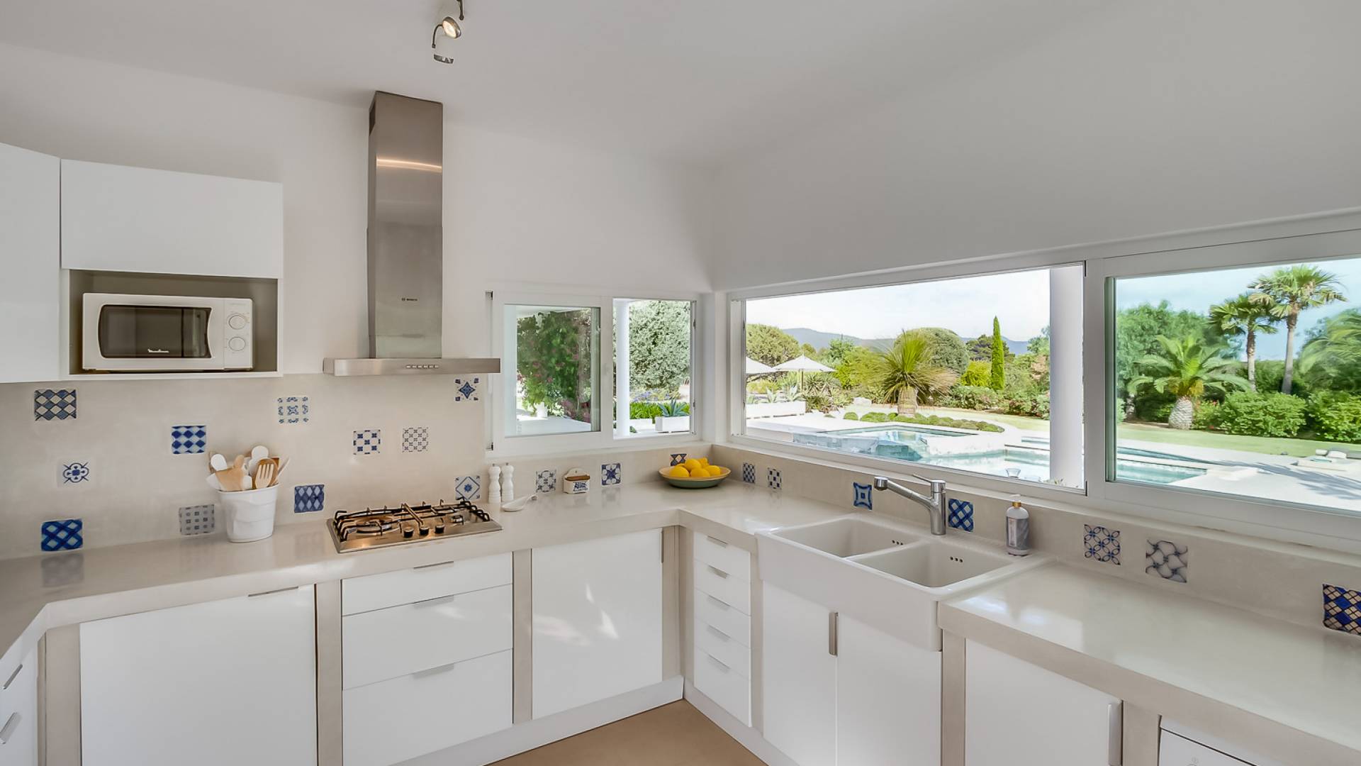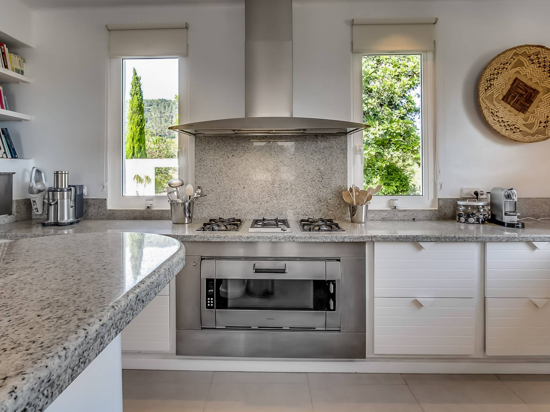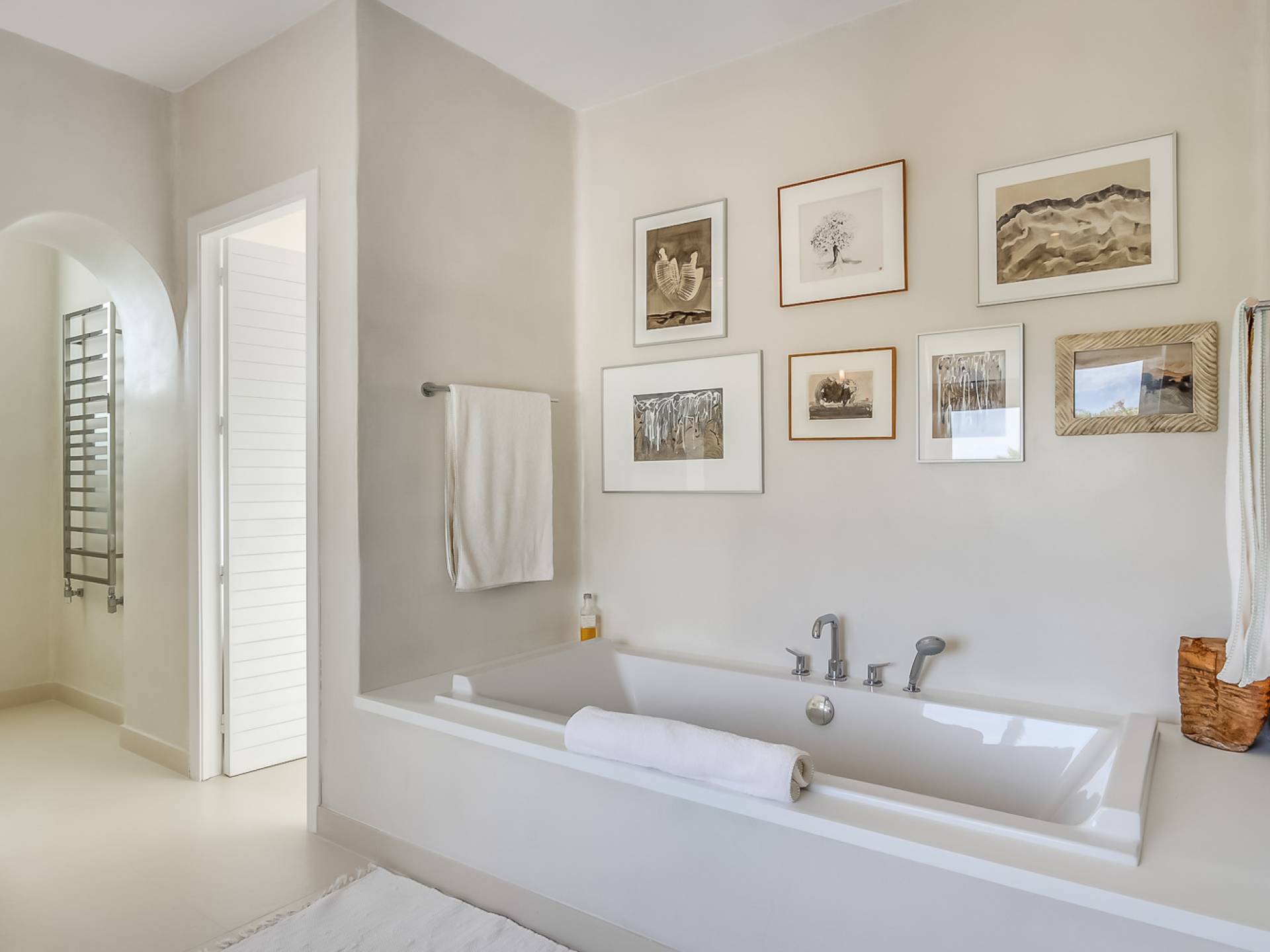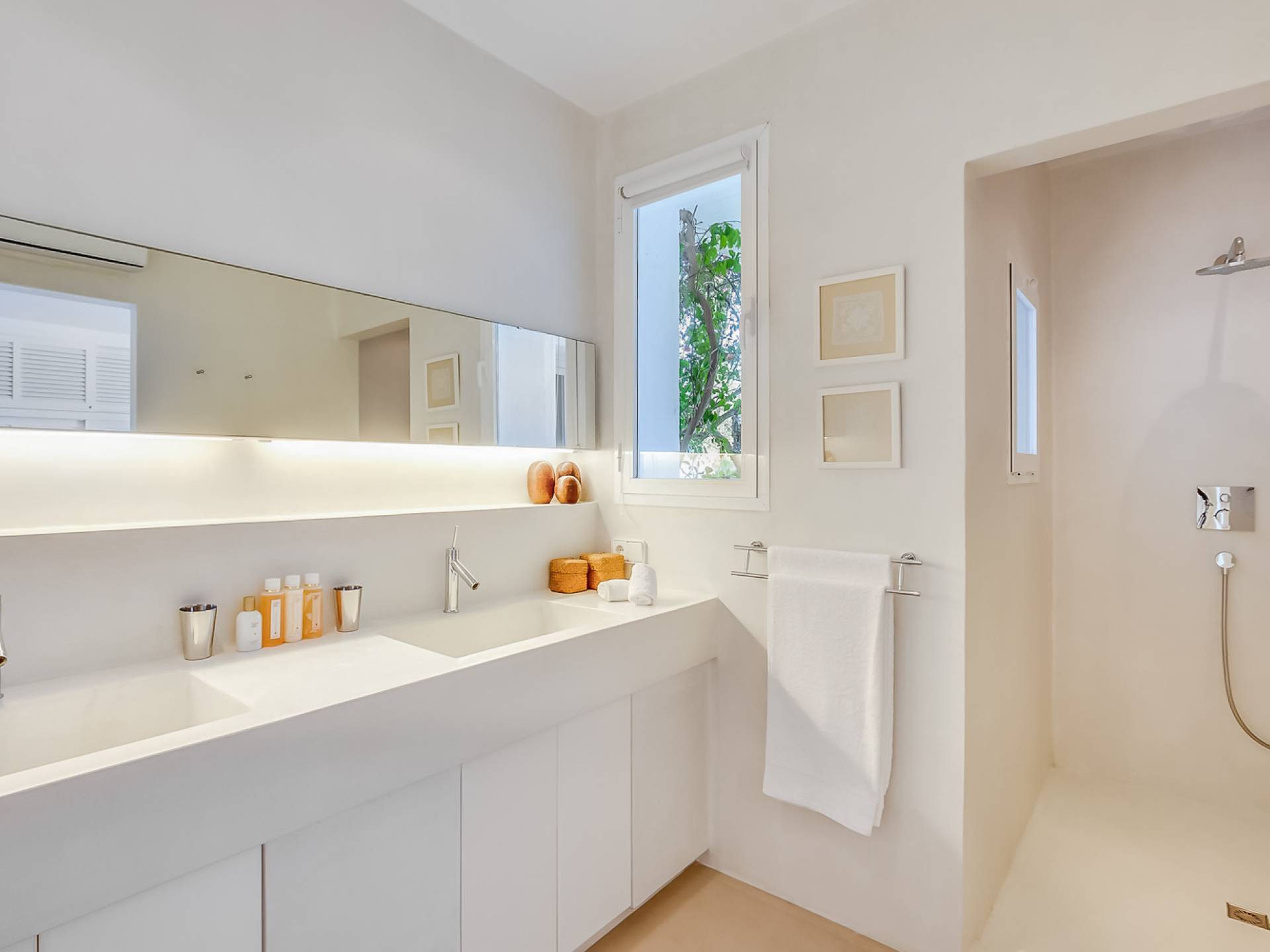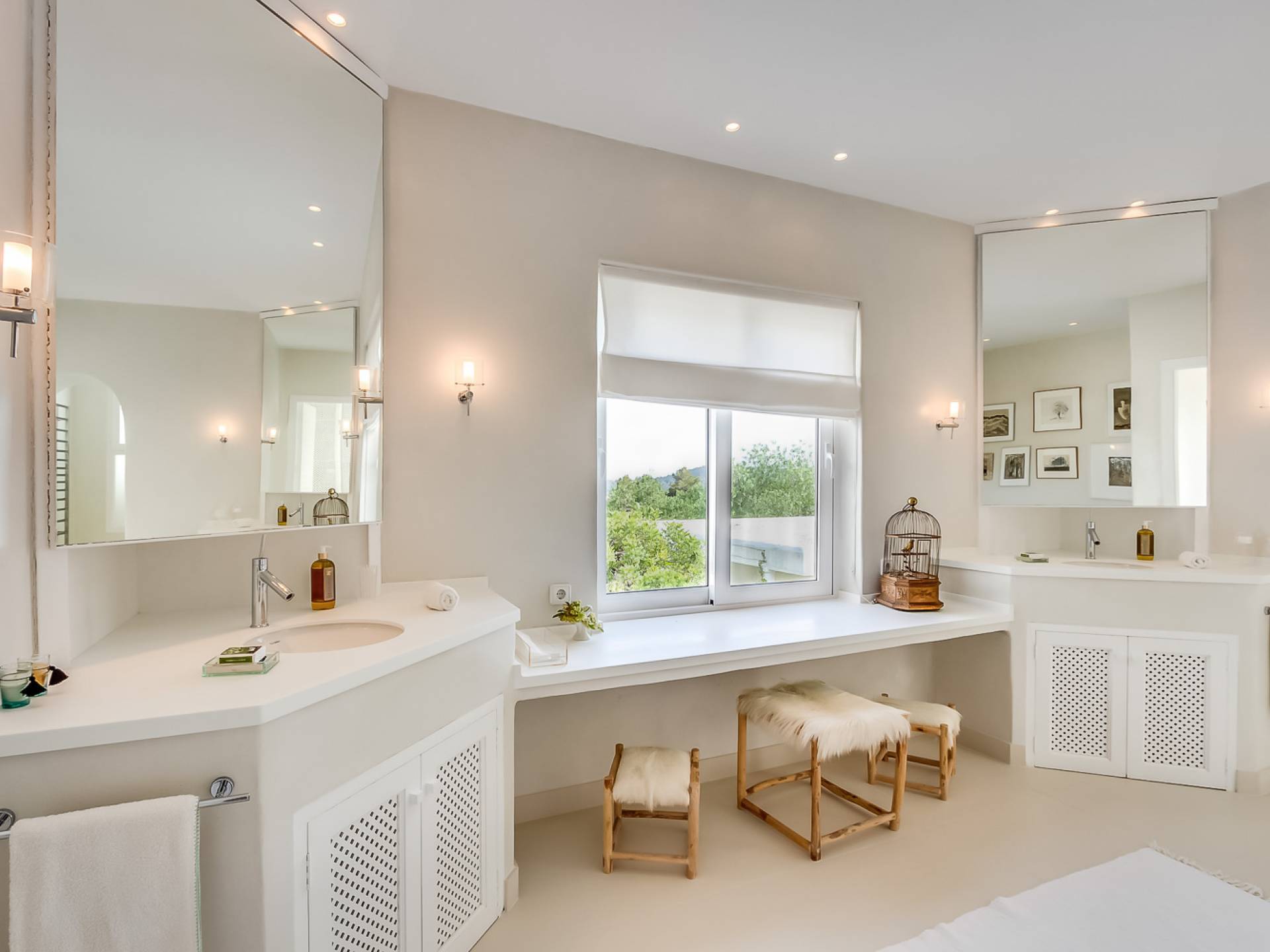 Die Can Felipe Villa ist überwiegend ganz in Weiß gehalten, mit einem Hauch klassischer ibizenkischer Architektur, sowie modern mit einer wunderbar ruhigen und gemütlichen Atmosphäre. Es verfügt über ein Heizsystem und einen Kamin für kühlere Jahreszeiten, ein Bose- und Sonos-Musiksystem im Innen- und Außenbereich mit iPod-Anschluss und Zugang zu WIFI ist im gesamten Gebäude vorhanden. Es gibt eine Bibliothek mit Büchern in mindestens 4 oder 5 verschiedenen Sprachen für alle Arten von Interessen für Erwachsene und Kinder, eine DVD-Sammlung mit Klassikern, Action- und Kinderfilmen sowie Spielen und Rätseln für alle. Die Küche ist komplett ausgestattet und bietet Meerblick mit Zugang zum Kräutergarten. Zur Ausstattung gehören Kaltpressen-Entsafter, Nespresso-Maschine, professioneller Pommes-Frites-Cutter, 2 Gaggenau-Öfen (ein extra großer und ein normaler für Gebäck), Miele-Geschirrspüler, Mikrowelle, Joghurtbereiter. Außerdem gibt es genügend Geschirr, Gläser, Messer und Gabeln usw. für Dinnerpartys für bis zu 40 Personen. Der Essbereich im Inneren bietet bequem Platz für 8 Personen und öffnet sich auf die geräumige Terrasse. Die Waschküche besteht aus einer Miele-Waschmaschine und -Trockner, einem zusätzlichen Kühlschrank und einem Bügelbereich.