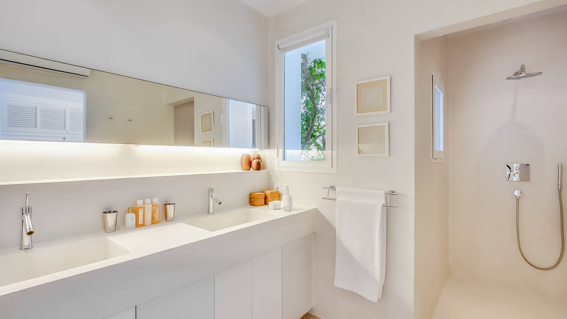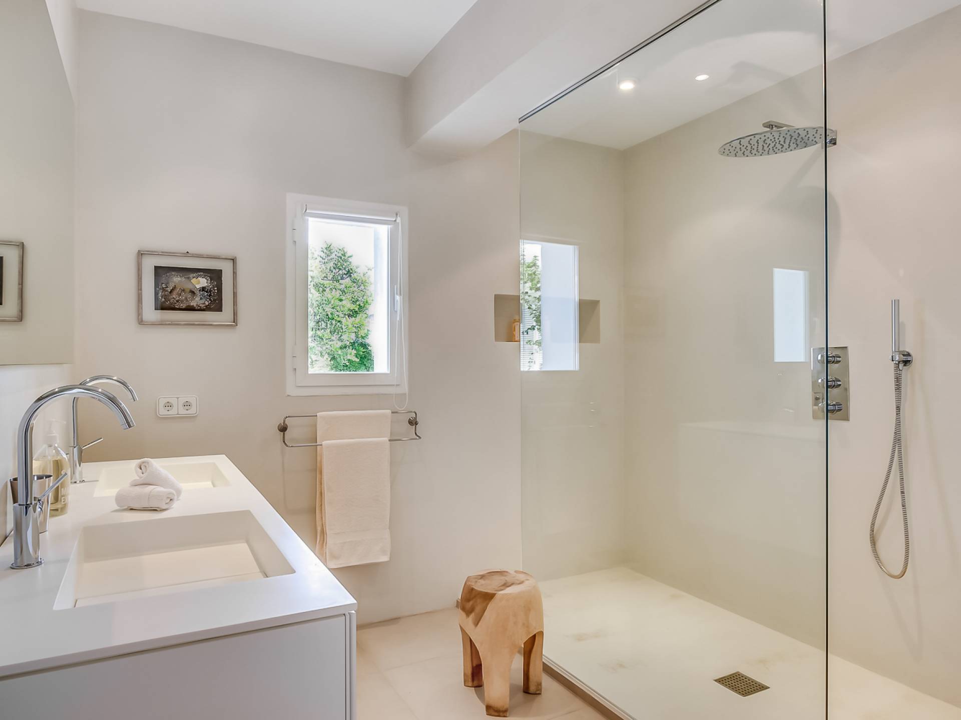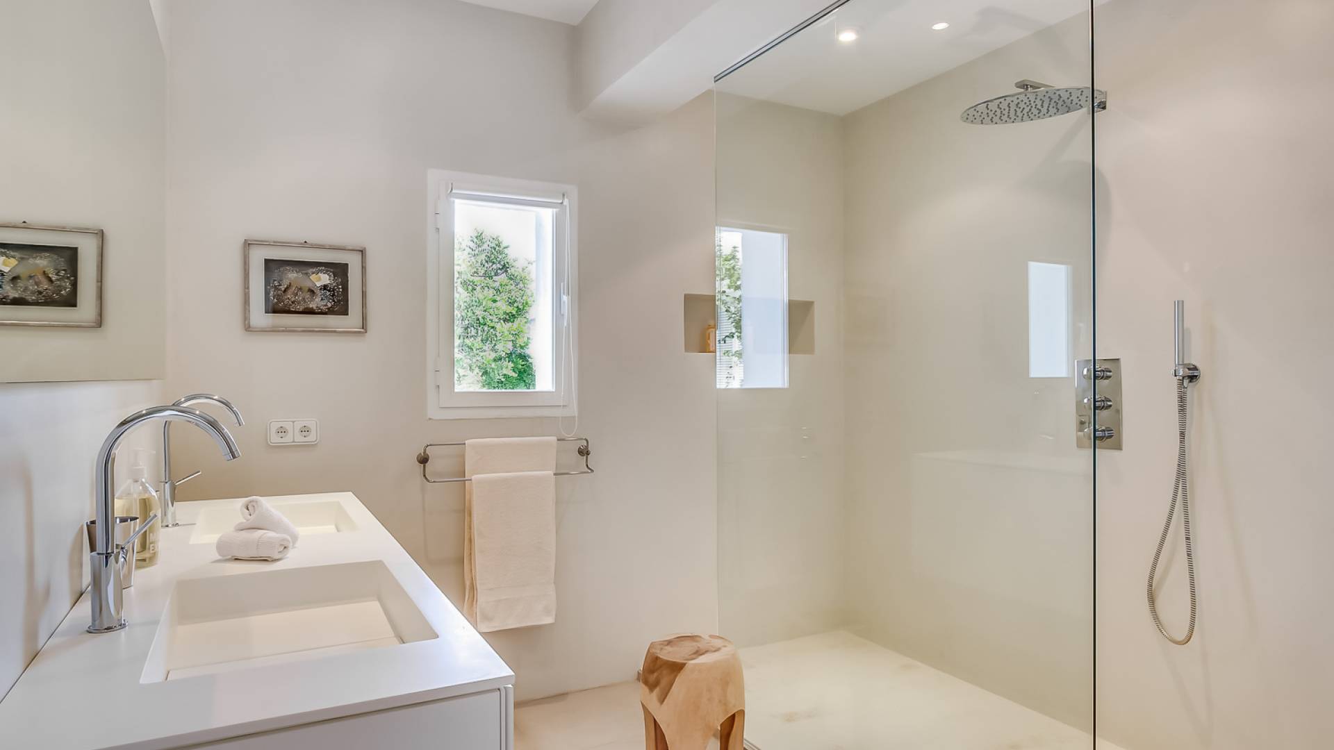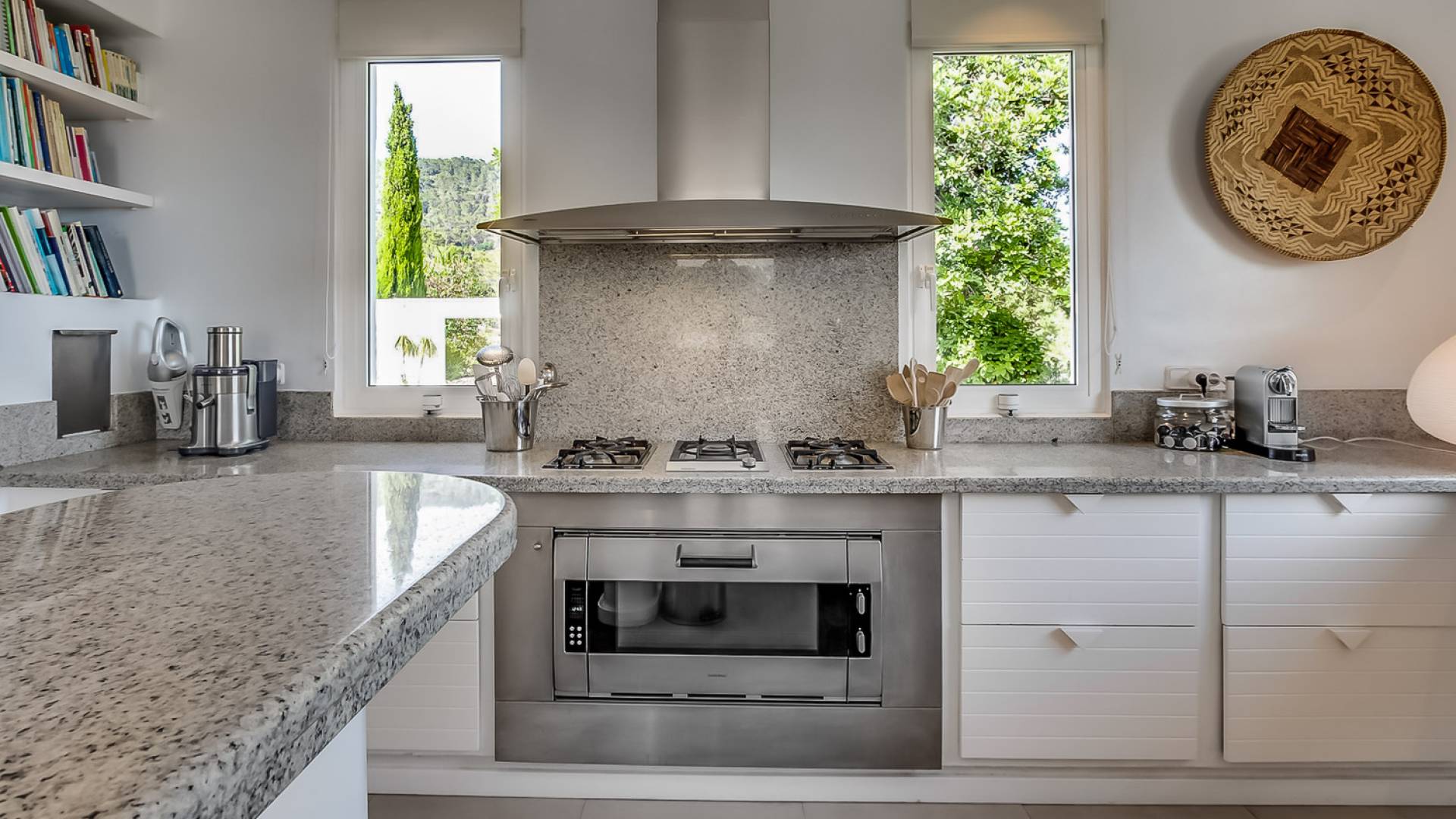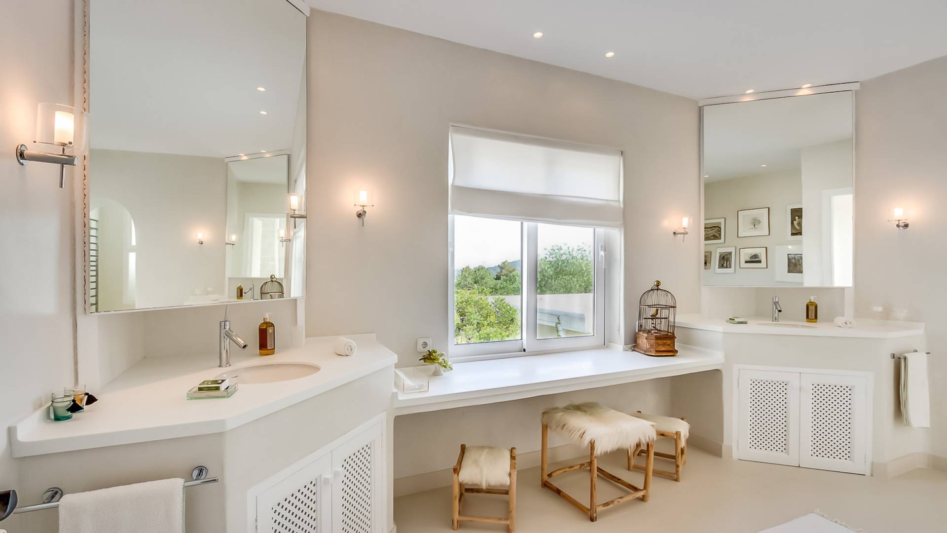 Die Can Felipe Villa ist überwiegend ganz in Weiß gehalten, mit einem Hauch klassischer ibizenkischer Architektur, sowie modern mit einer wunderbar ruhigen und gemütlichen Atmosphäre. Es verfügt über ein Heizsystem und einen Kamin für kühlere Jahreszeiten, ein Bose- und Sonos-Musiksystem im Innen- und Außenbereich mit iPod-Anschluss und Zugang zu WIFI ist im gesamten Gebäude vorhanden. Es gibt eine Bibliothek mit Büchern in mindestens 4 oder 5 verschiedenen Sprachen für alle Arten von Interessen für Erwachsene und Kinder, eine DVD-Sammlung mit Klassikern, Action- und Kinderfilmen sowie Spielen und Rätseln für alle. Die Küche ist komplett ausgestattet und bietet Meerblick mit Zugang zum Kräutergarten. Zur Ausstattung gehören Kaltpressen-Entsafter, Nespresso-Maschine, professioneller Pommes-Frites-Cutter, 2 Gaggenau-Öfen (ein extra großer und ein normaler für Gebäck), Miele-Geschirrspüler, Mikrowelle, Joghurtbereiter. Außerdem gibt es genügend Geschirr, Gläser, Messer und Gabeln usw. für Dinnerpartys für bis zu 40 Personen. Der Essbereich im Inneren bietet bequem Platz für 8 Personen und öffnet sich auf die geräumige Terrasse. Die Waschküche besteht aus einer Miele-Waschmaschine und -Trockner, einem zusätzlichen Kühlschrank und einem Bügelbereich.
