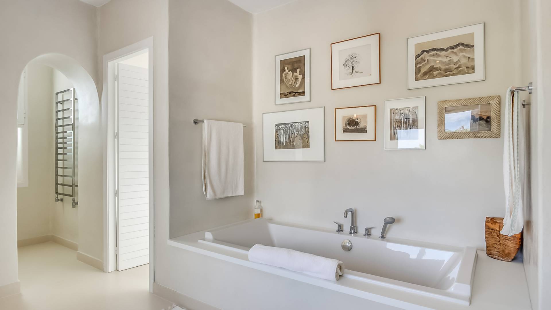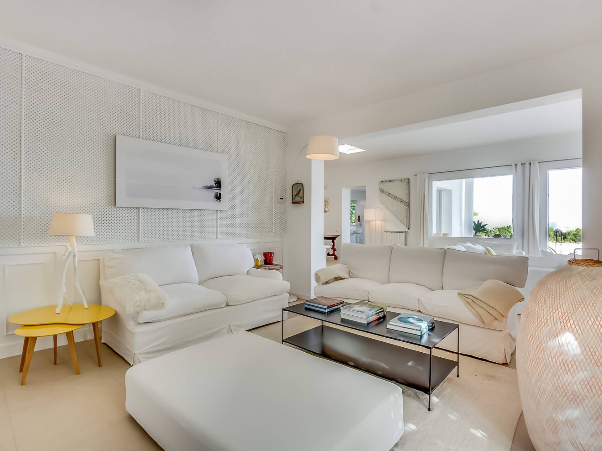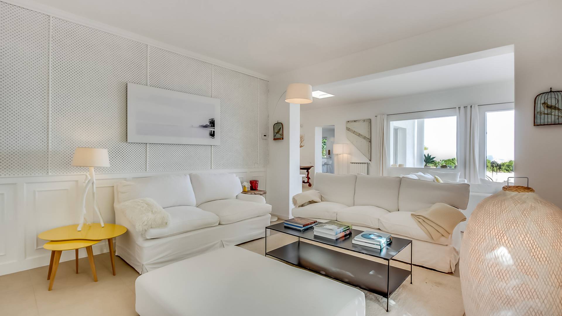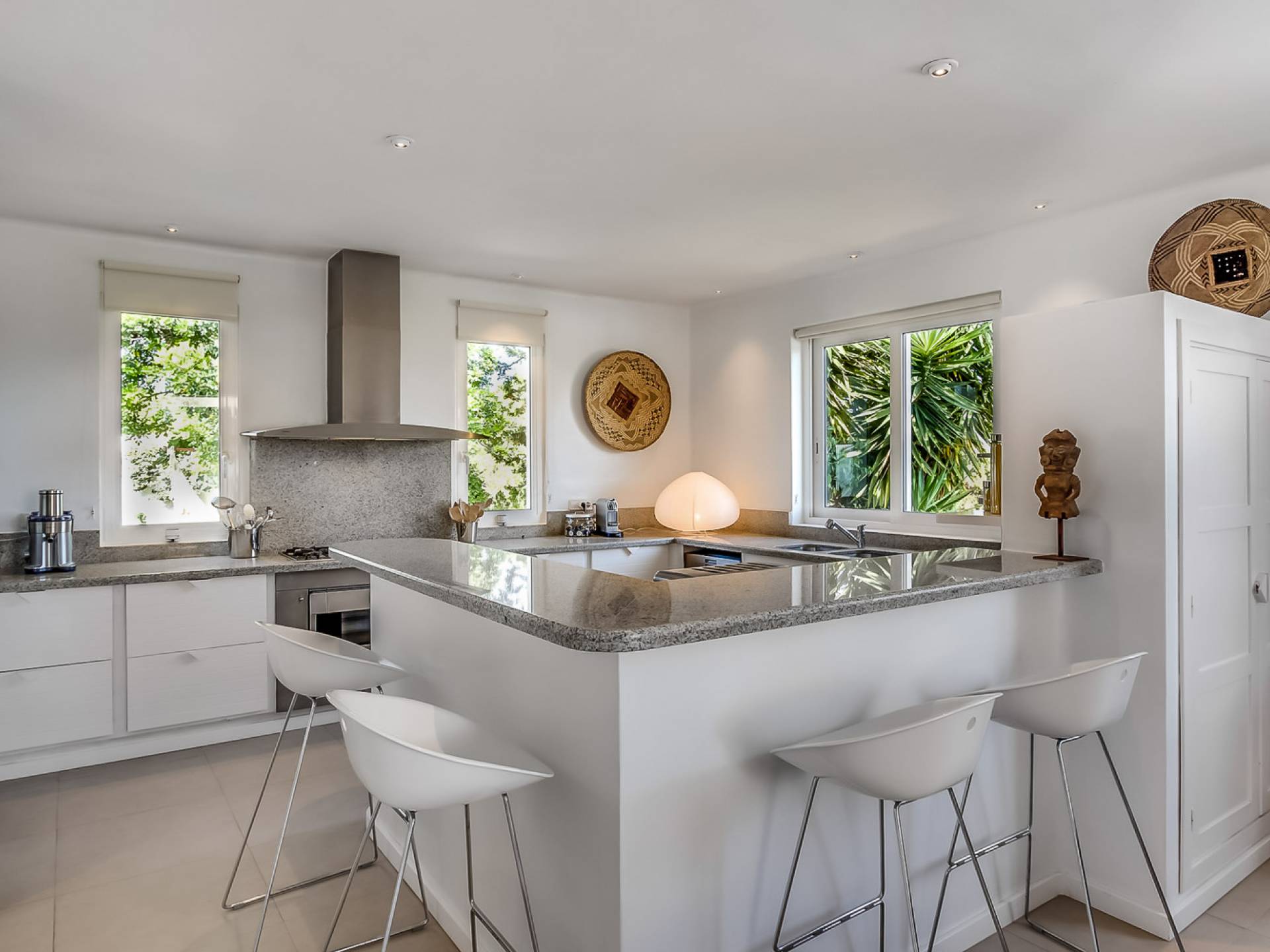 Die Can Felipe Villa ist überwiegend ganz in Weiß gehalten, mit einem Hauch klassischer ibizenkischer Architektur, sowie modern mit einer wunderbar ruhigen und gemütlichen Atmosphäre. Es verfügt über ein Heizsystem und einen Kamin für kühlere Jahreszeiten, ein Bose- und Sonos-Musiksystem im Innen- und Außenbereich mit iPod-Anschluss und Zugang zu WIFI ist im gesamten Gebäude vorhanden. Es gibt eine Bibliothek mit Büchern in mindestens 4 oder 5 verschiedenen Sprachen für alle Arten von Interessen für Erwachsene und Kinder, eine DVD-Sammlung mit Klassikern, Action- und Kinderfilmen sowie Spielen und Rätseln für alle. Die Küche ist komplett ausgestattet und bietet Meerblick mit Zugang zum Kräutergarten. Zur Ausstattung gehören Kaltpressen-Entsafter, Nespresso-Maschine, professioneller Pommes-Frites-Cutter, 2 Gaggenau-Öfen (ein extra großer und ein normaler für Gebäck), Miele-Geschirrspüler, Mikrowelle, Joghurtbereiter. Außerdem gibt es genügend Geschirr, Gläser, Messer und Gabeln usw. für Dinnerpartys für bis zu 40 Personen. Der Essbereich im Inneren bietet bequem Platz für 8 Personen und öffnet sich auf die geräumige Terrasse. Die Waschküche besteht aus einer Miele-Waschmaschine und -Trockner, einem zusätzlichen Kühlschrank und einem Bügelbereich.