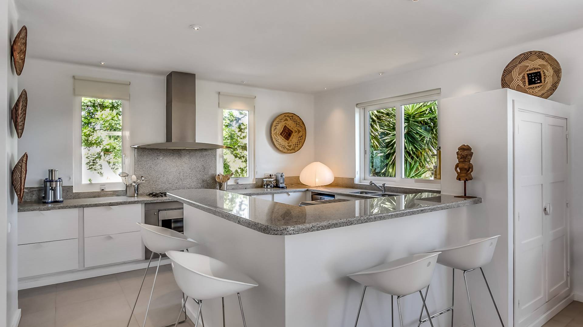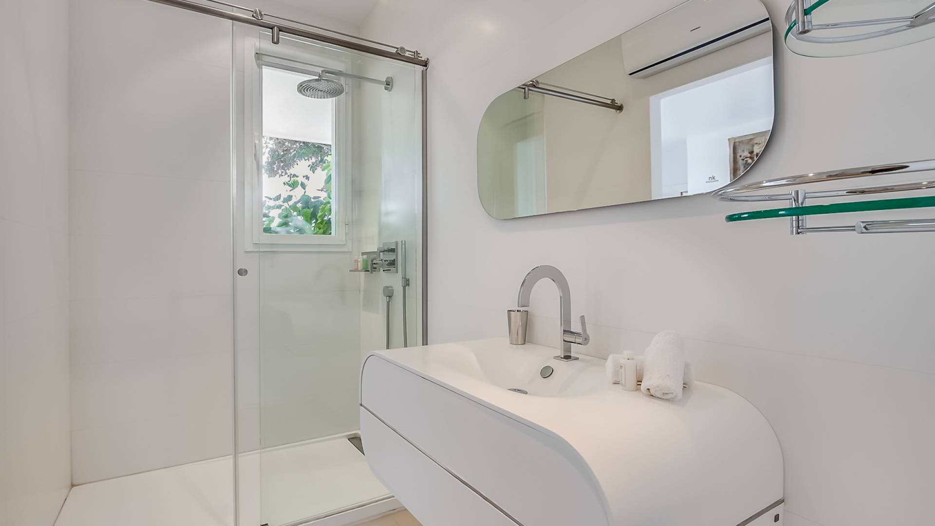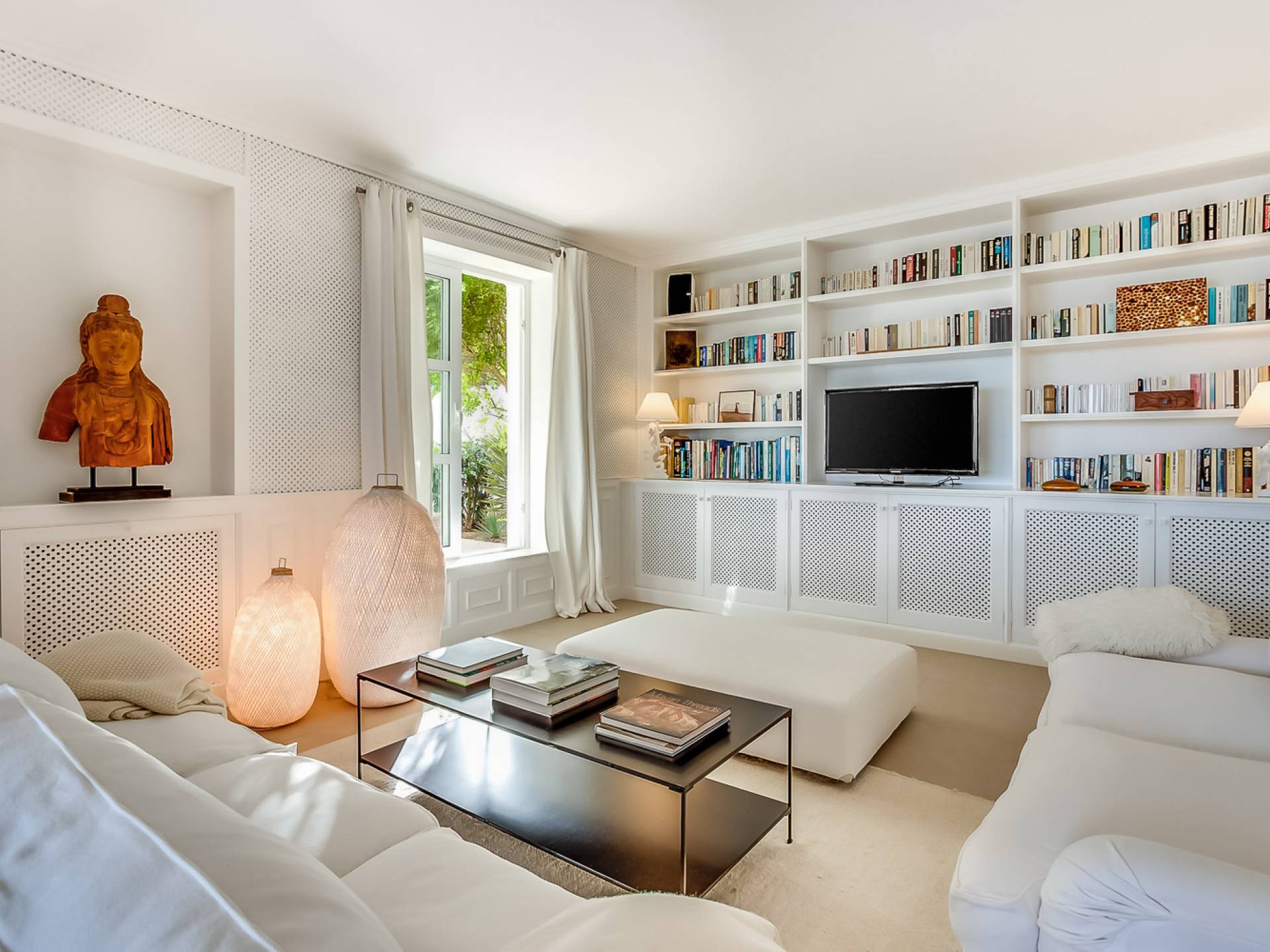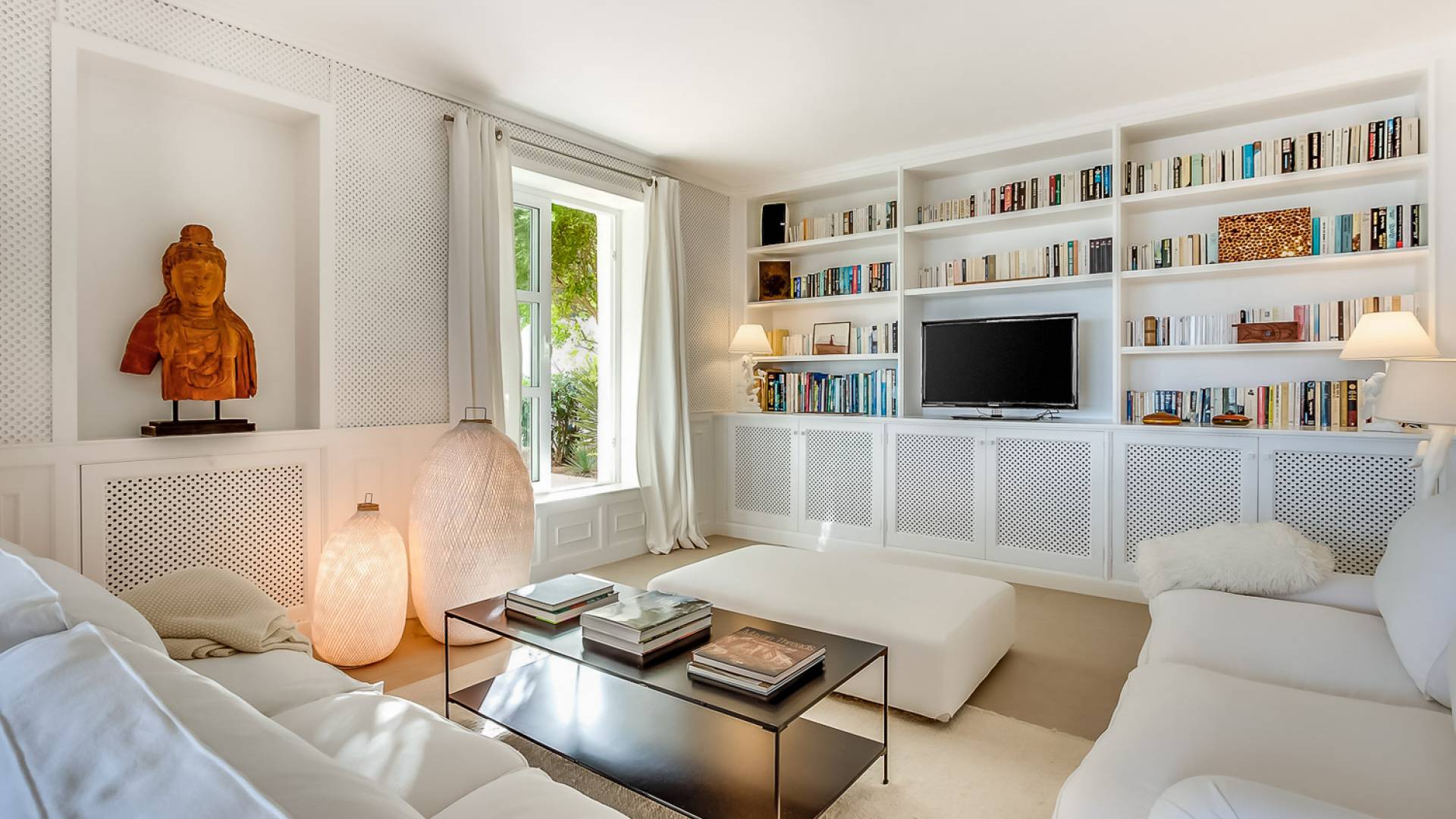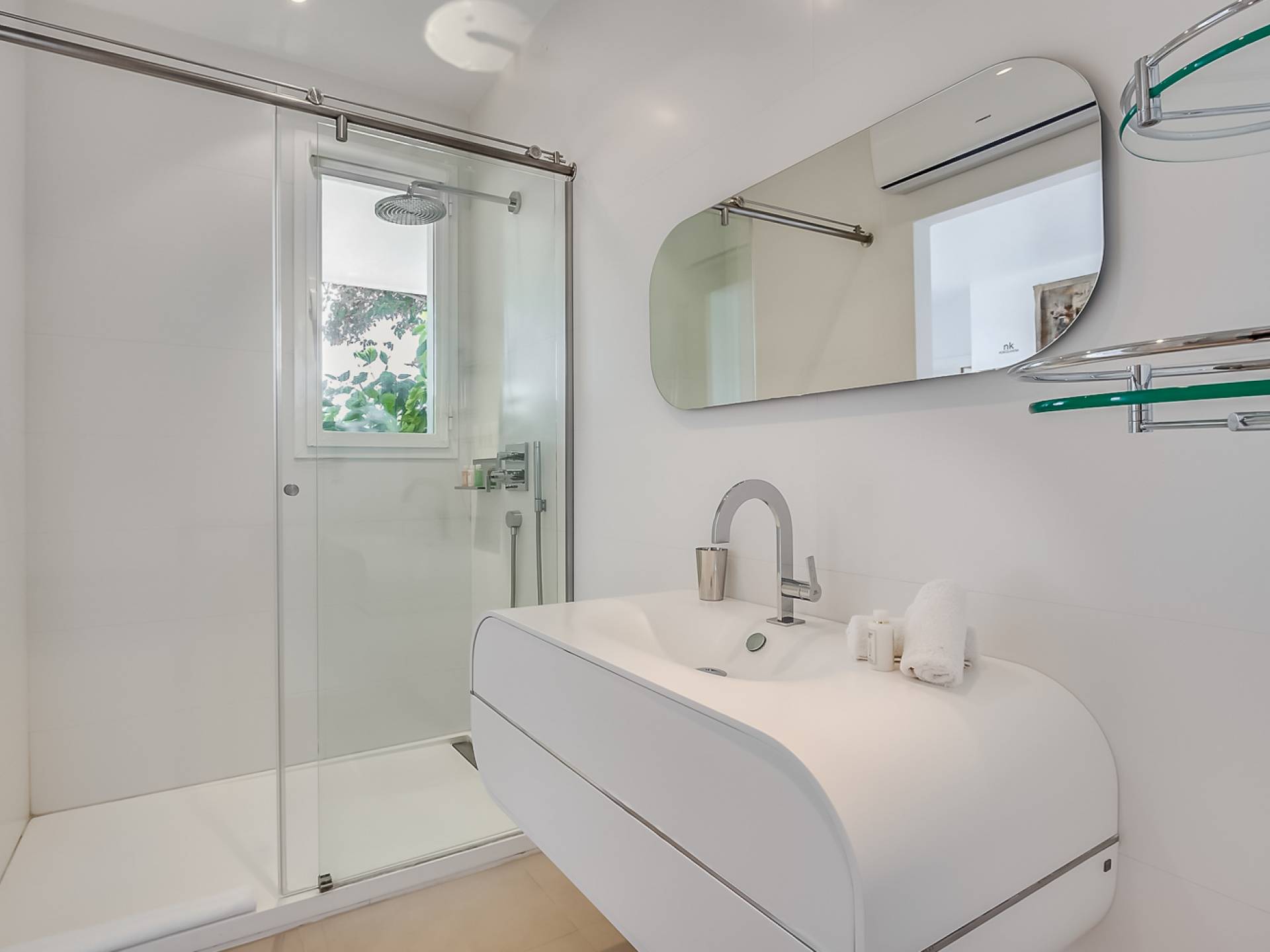 Die Can Felipe Villa ist überwiegend ganz in Weiß gehalten, mit einem Hauch klassischer ibizenkischer Architektur, sowie modern mit einer wunderbar ruhigen und gemütlichen Atmosphäre. Es verfügt über ein Heizsystem und einen Kamin für kühlere Jahreszeiten, ein Bose- und Sonos-Musiksystem im Innen- und Außenbereich mit iPod-Anschluss und Zugang zu WIFI ist im gesamten Gebäude vorhanden. Es gibt eine Bibliothek mit Büchern in mindestens 4 oder 5 verschiedenen Sprachen für alle Arten von Interessen für Erwachsene und Kinder, eine DVD-Sammlung mit Klassikern, Action- und Kinderfilmen sowie Spielen und Rätseln für alle. Die Küche ist komplett ausgestattet und bietet Meerblick mit Zugang zum Kräutergarten. Zur Ausstattung gehören Kaltpressen-Entsafter, Nespresso-Maschine, professioneller Pommes-Frites-Cutter, 2 Gaggenau-Öfen (ein extra großer und ein normaler für Gebäck), Miele-Geschirrspüler, Mikrowelle, Joghurtbereiter. Außerdem gibt es genügend Geschirr, Gläser, Messer und Gabeln usw. für Dinnerpartys für bis zu 40 Personen. Der Essbereich im Inneren bietet bequem Platz für 8 Personen und öffnet sich auf die geräumige Terrasse. Die Waschküche besteht aus einer Miele-Waschmaschine und -Trockner, einem zusätzlichen Kühlschrank und einem Bügelbereich.