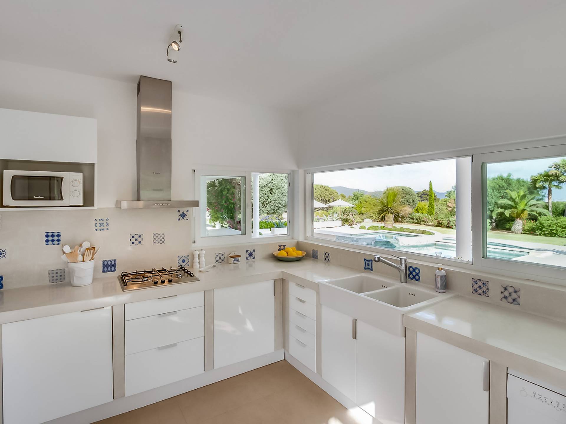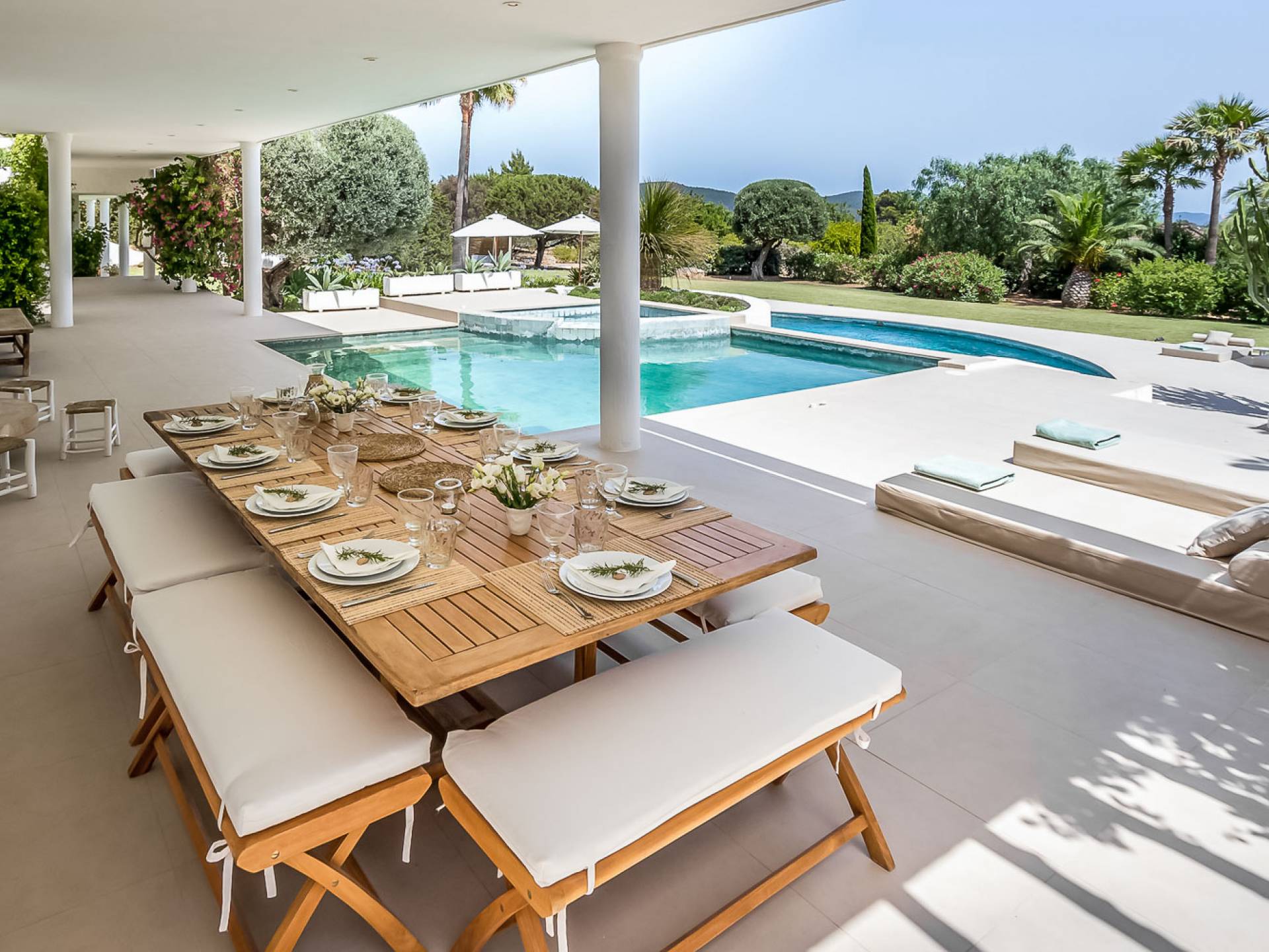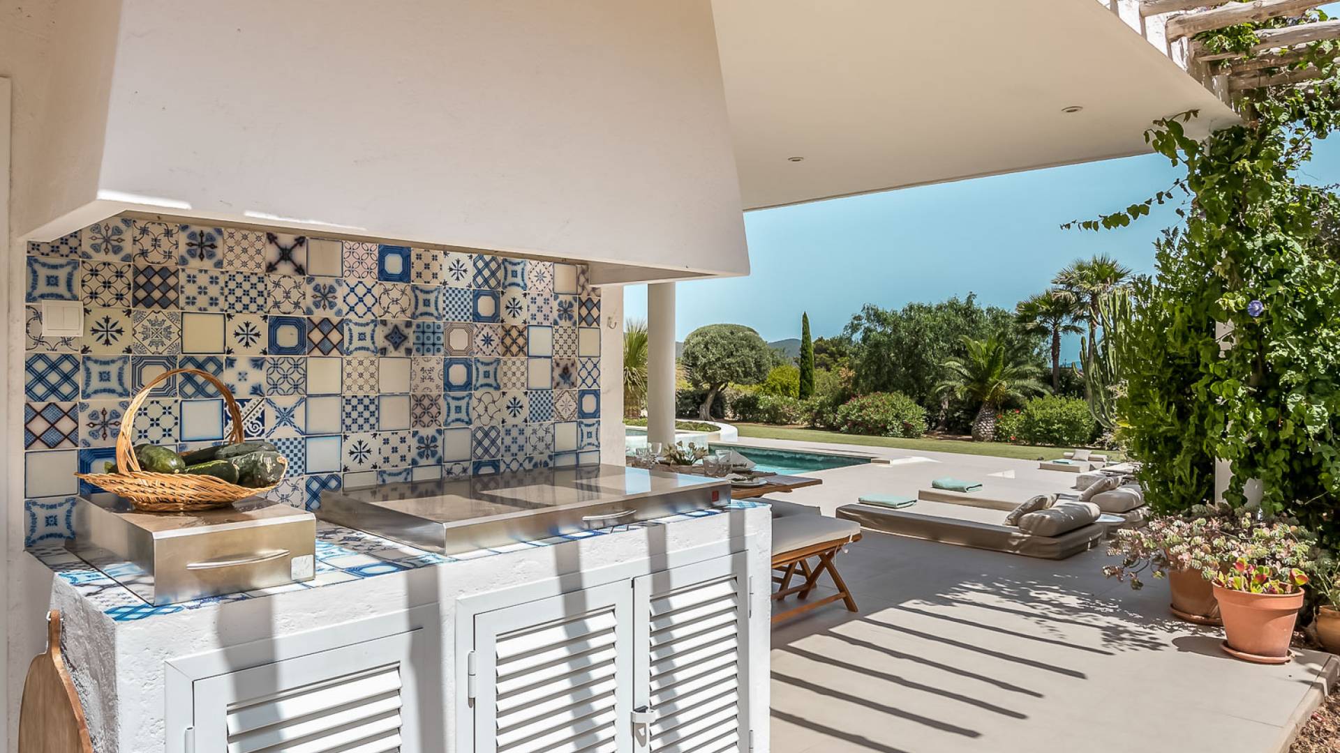 Es gibt 3 separate Essbereiche, viele Terrassen zum Entspannen und Entspannen, eine voll ausgestattete Außenküche mit eingebauter Fritteuse und Plancha, 2 Kühlschränke, Geschirrspüler, Mikrowelle und Gasherd. Die übergroße Terrasse bietet eine beeindruckende Aussicht, diese Terrasse kann mit einem elektrischen Sonnenschirm überdacht werden. Der Essbereich im Freien bietet Platz für 12 Personen, zusätzliche Tische und Bänke stehen für größere Dinnerpartys mit etwa 40 Personen zur Verfügung. Der Pool ist in drei Abschnitte unterteilt - Kinderbecken, Whirlpool und Hauptpool. Der Hauptpool hat eine Größe von 10 x 6 m2 und der Whirlpool befindet sich in der Ecke des Kinderbeckens mit Solarthermie. Um den Pool herum gibt es 12 Sonnenliegen und 3 Sonnenschirme; Zwischen Poolhaus und Poolküche befindet sich ein riesiger Loungebereich mit 2 Doppel-Sonnenliegen. Das Poolhaus besteht aus einer Umkleidekabine und einem separaten WC.