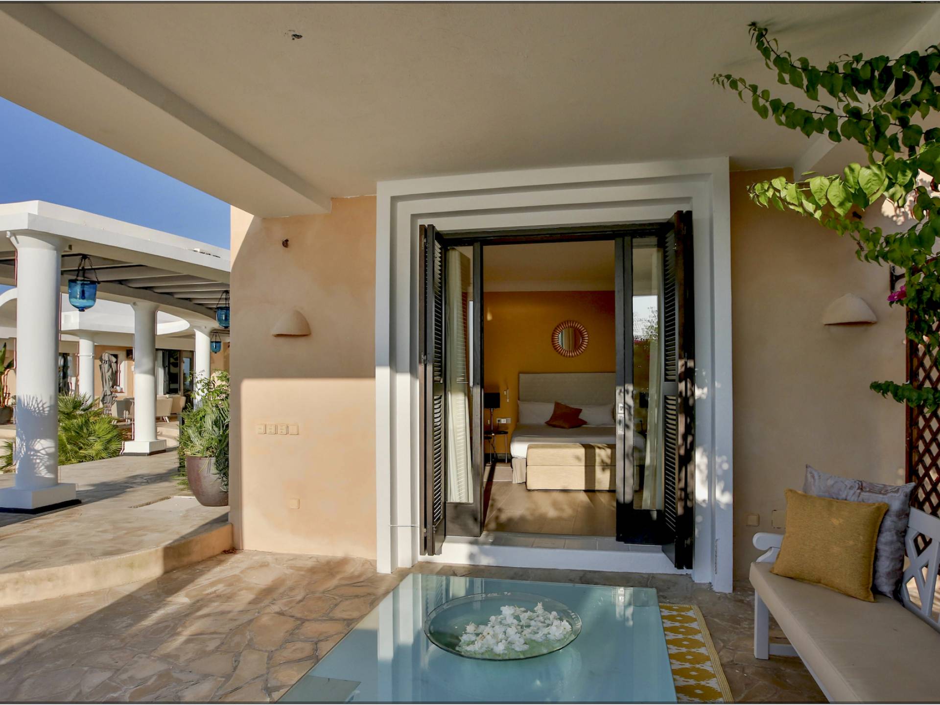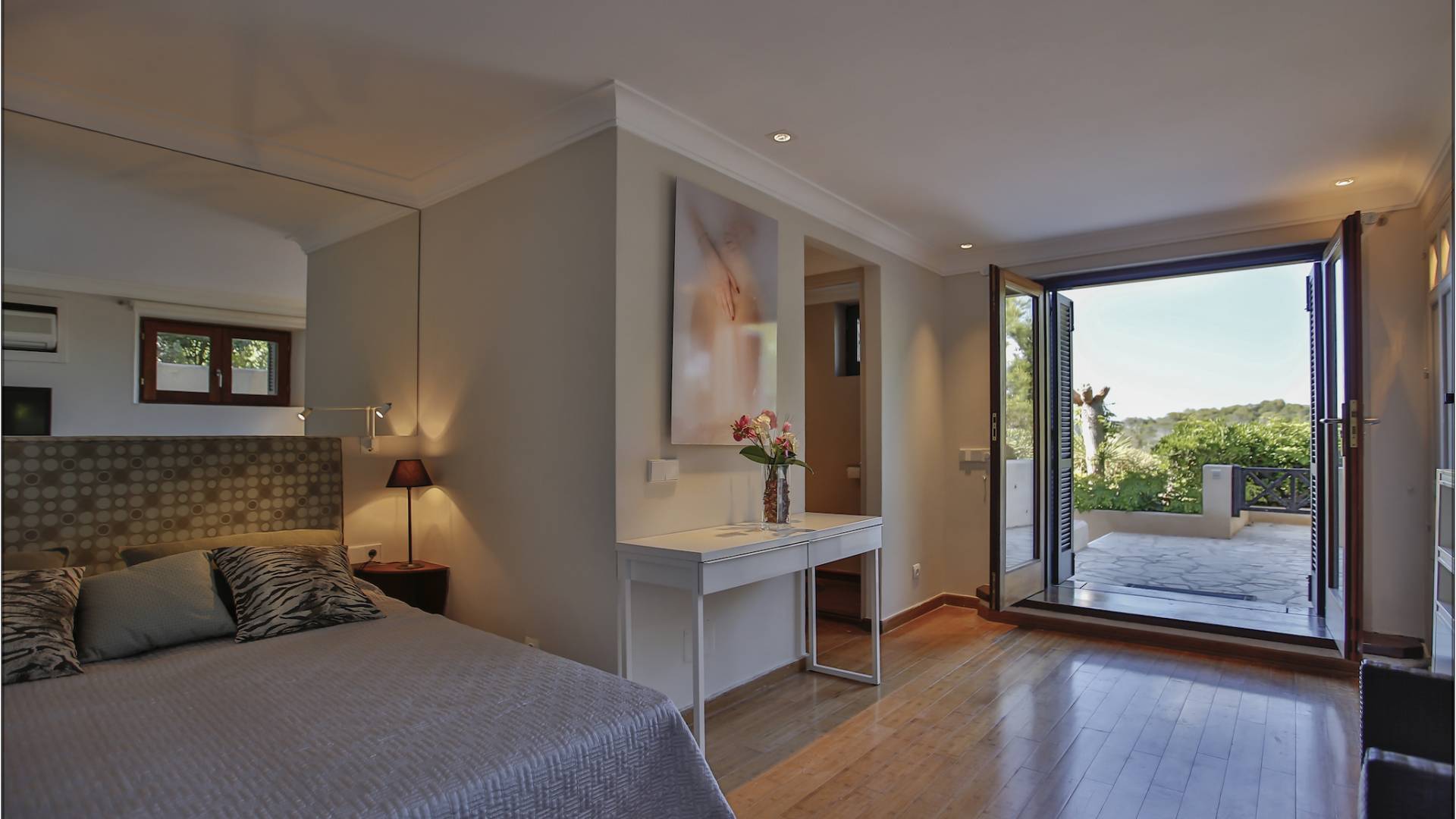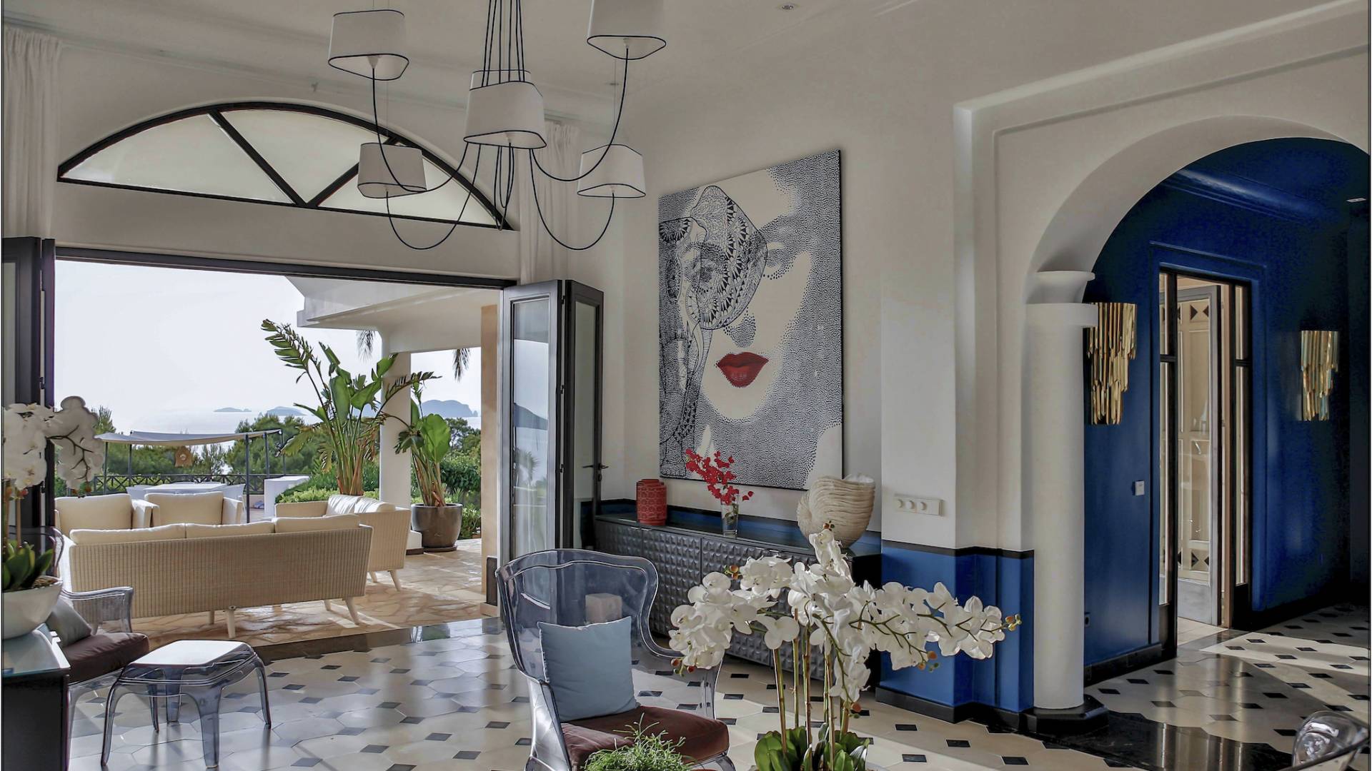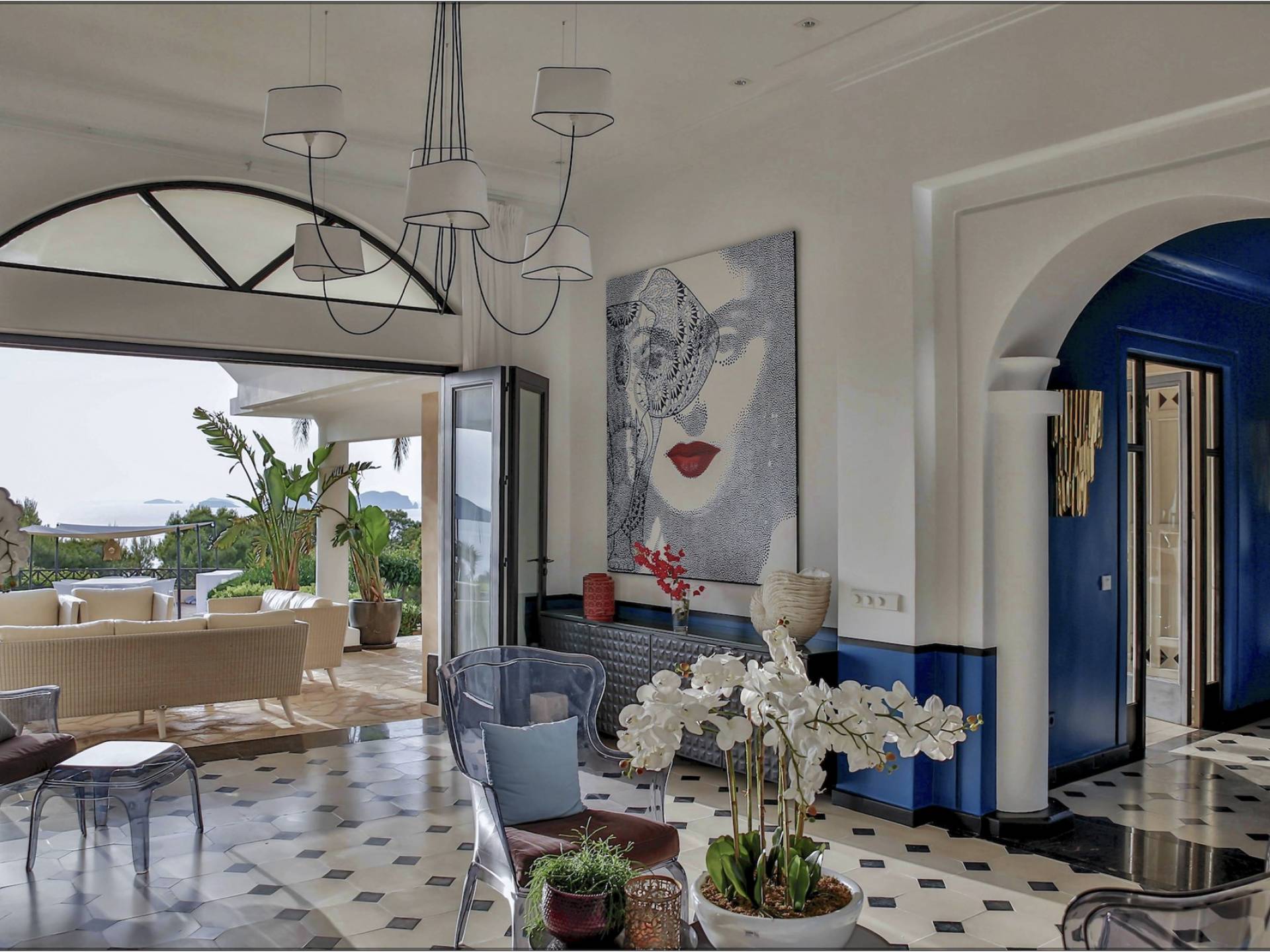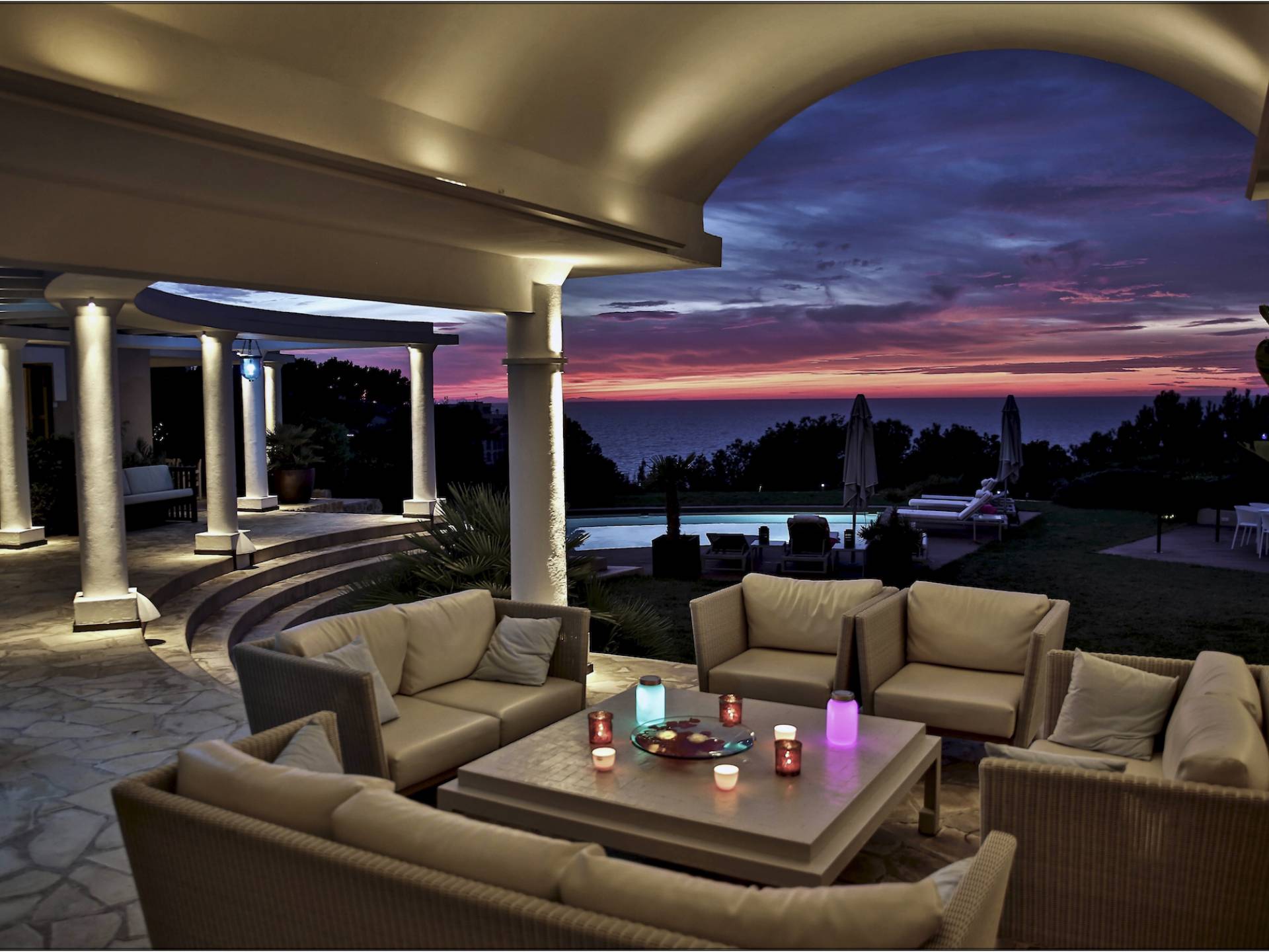 Auf einer Klippe mit Blick auf den Strand von Cala Moli gelegen, ist Can Icarus auf zwei Ebenen gebaut und bietet einen 180°-Blick auf das Meer und Illetas sowie direkten Zugang zu einer kleinen Bucht über in die Klippe gehauene Felsstufen . Die Architektur der Villa ist modern und offen, so dass die Schlafzimmer und Terrassen den herrlichen Panoramablick voll ausnutzen können. Die Sonnenuntergänge in dieser Villa sind wirklich unvergesslich und die Villa verfügt über eine Fülle von Terrassen und Innenhöfen, so dass die Aussicht aus allen Blickwinkeln genossen werden kann. Im Inneren unterstreichen rohe Materialien und warme Farben das orientalische und zeitgenössische Dekor. Das große Wohnzimmer erstreckt sich auf einen bezaubernden Patio, wo sich das Plätschern des Springbrunnens mit Vogelgezwitscher vermischt.