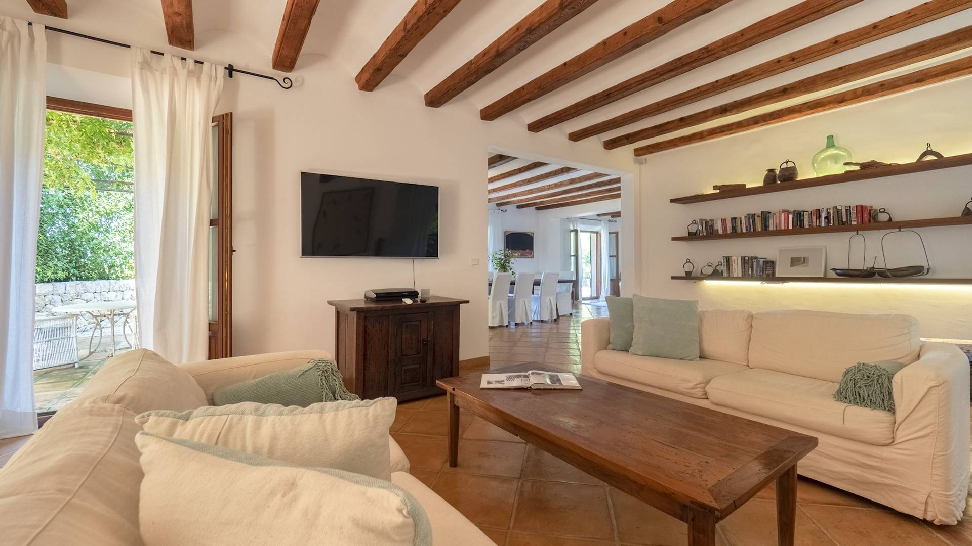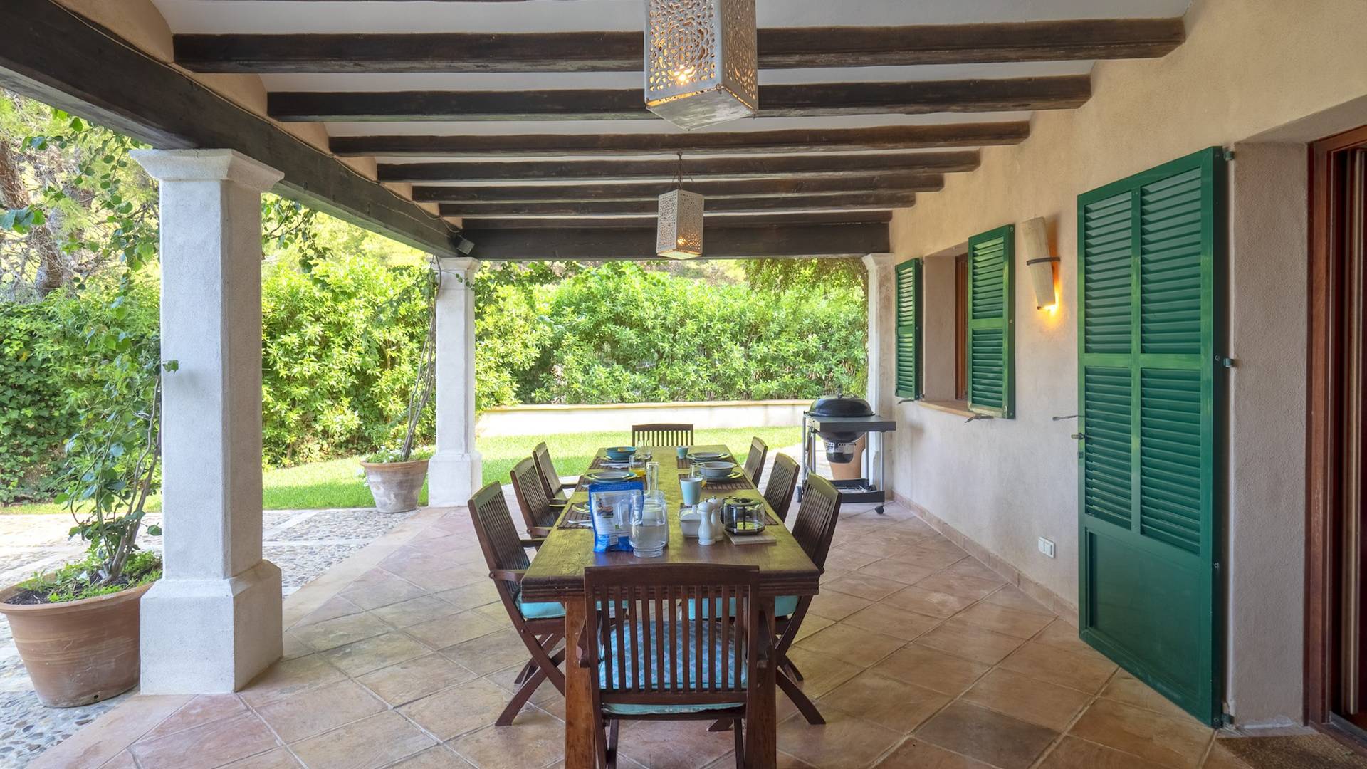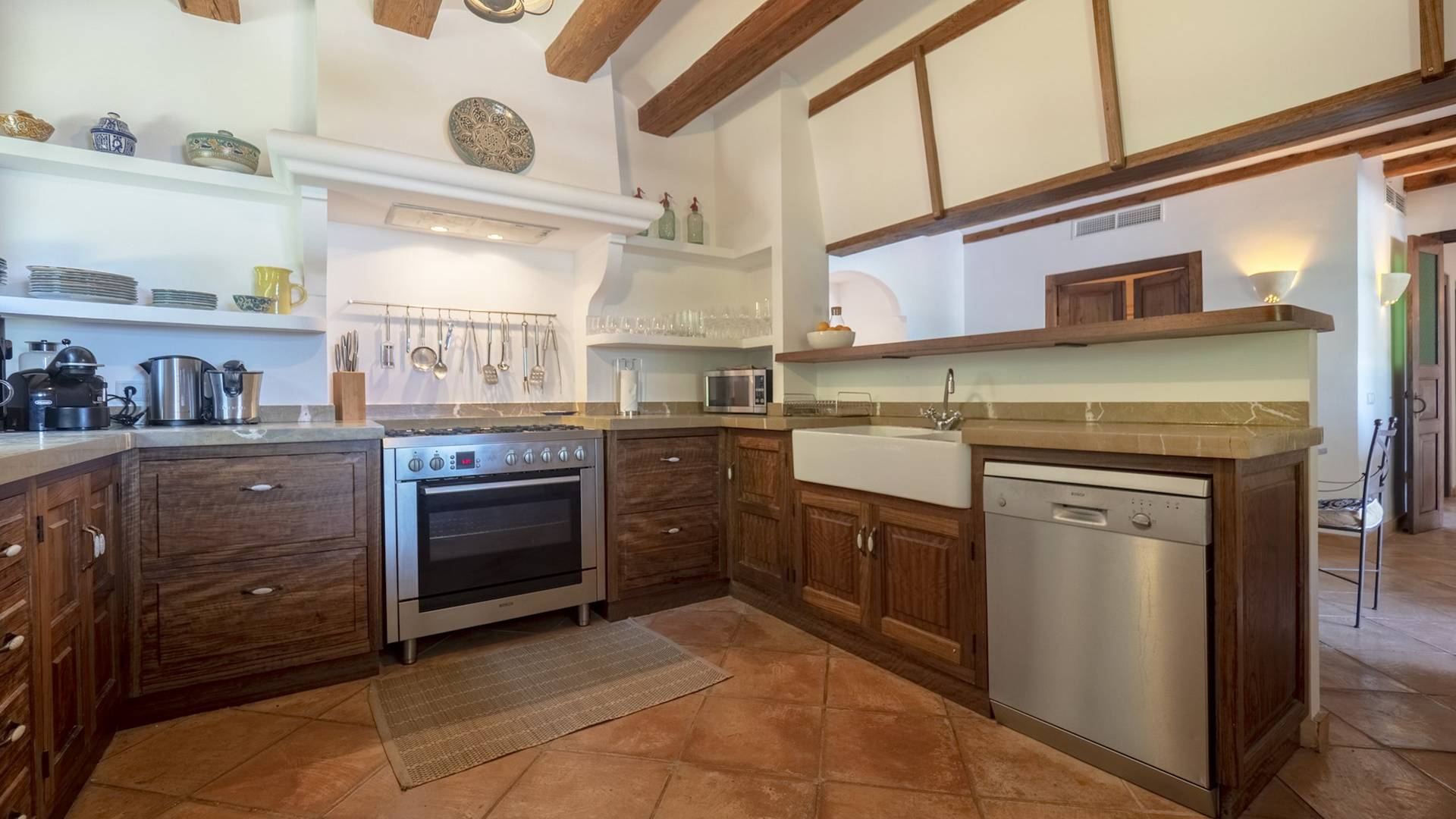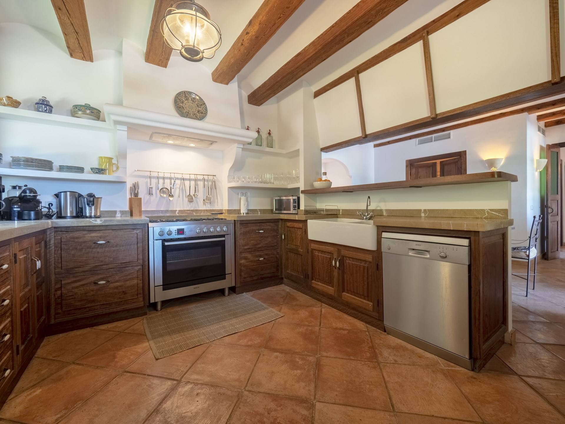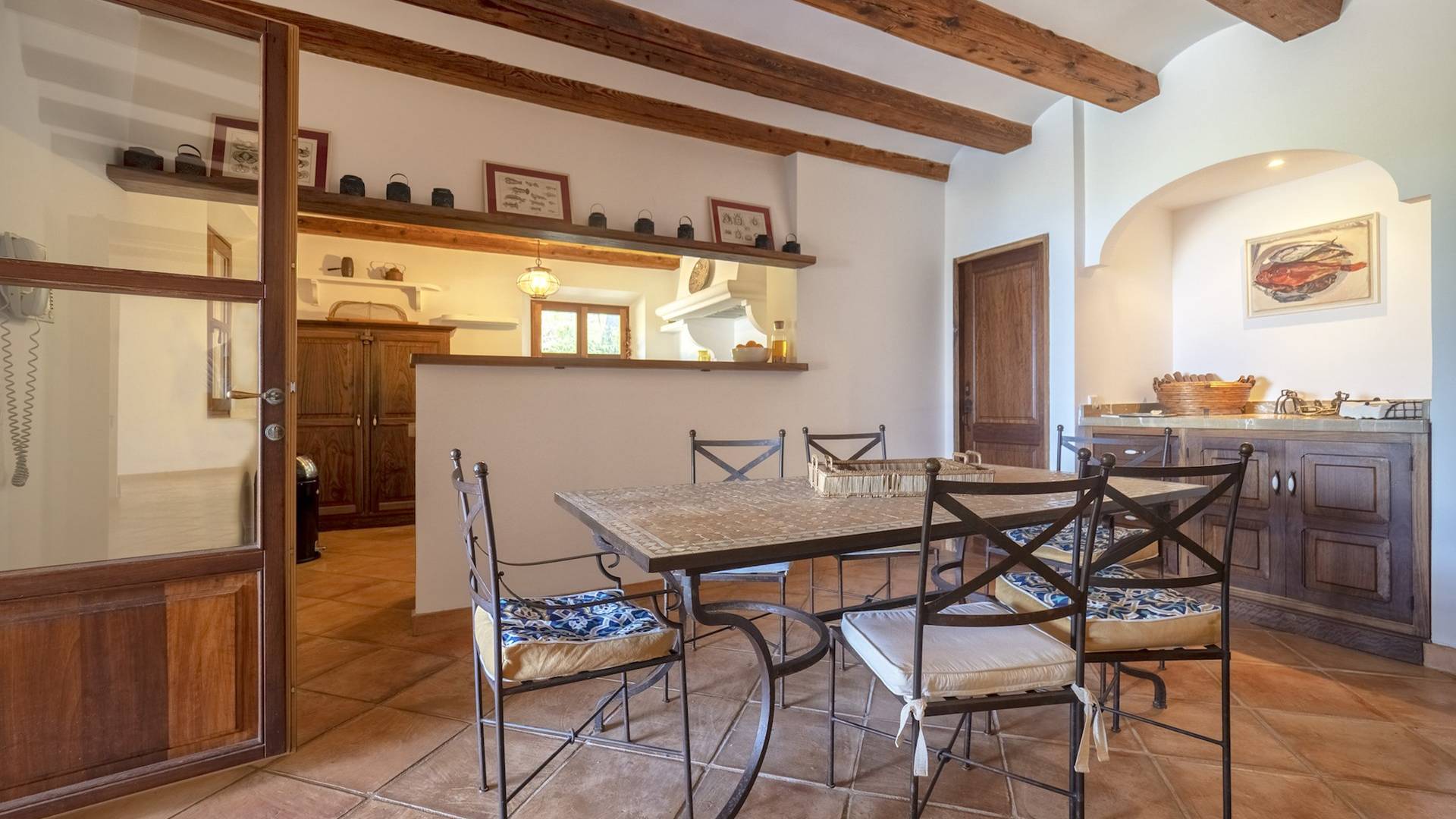 Der Raum führt zu einem Essbereich, der sich auf die Terrasse und den überdachten Verandabereich öffnet. Zurück im Inneren finden Sie eine voll ausgestattete Küche mit allem, was Sie zur Selbstverpflegung benötigen.