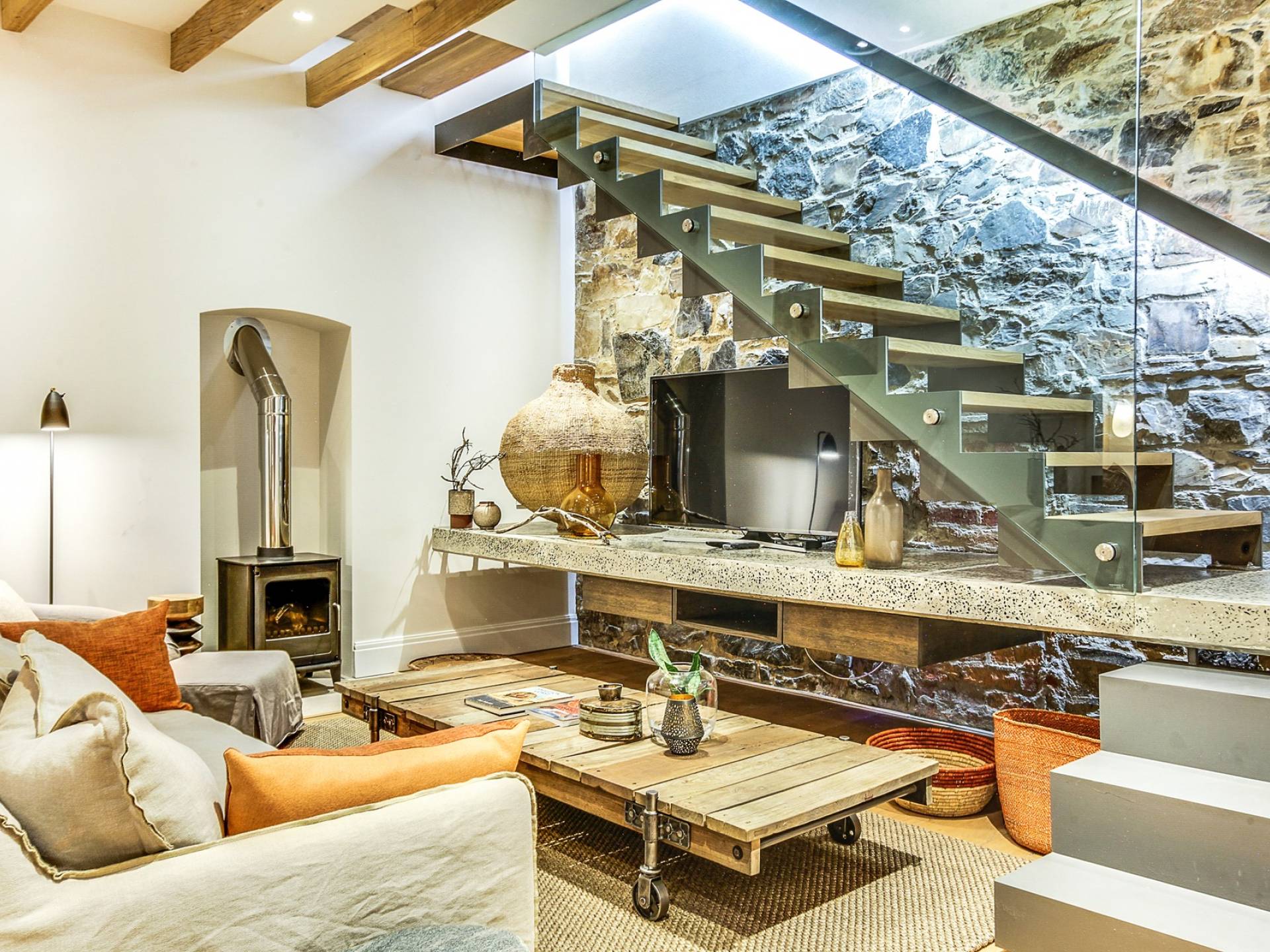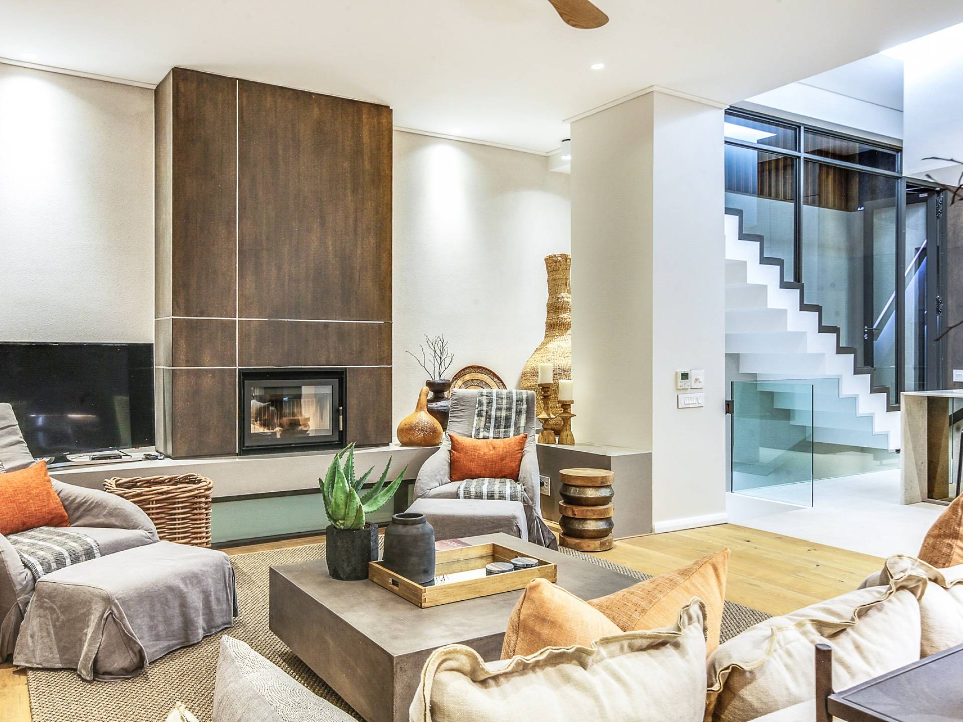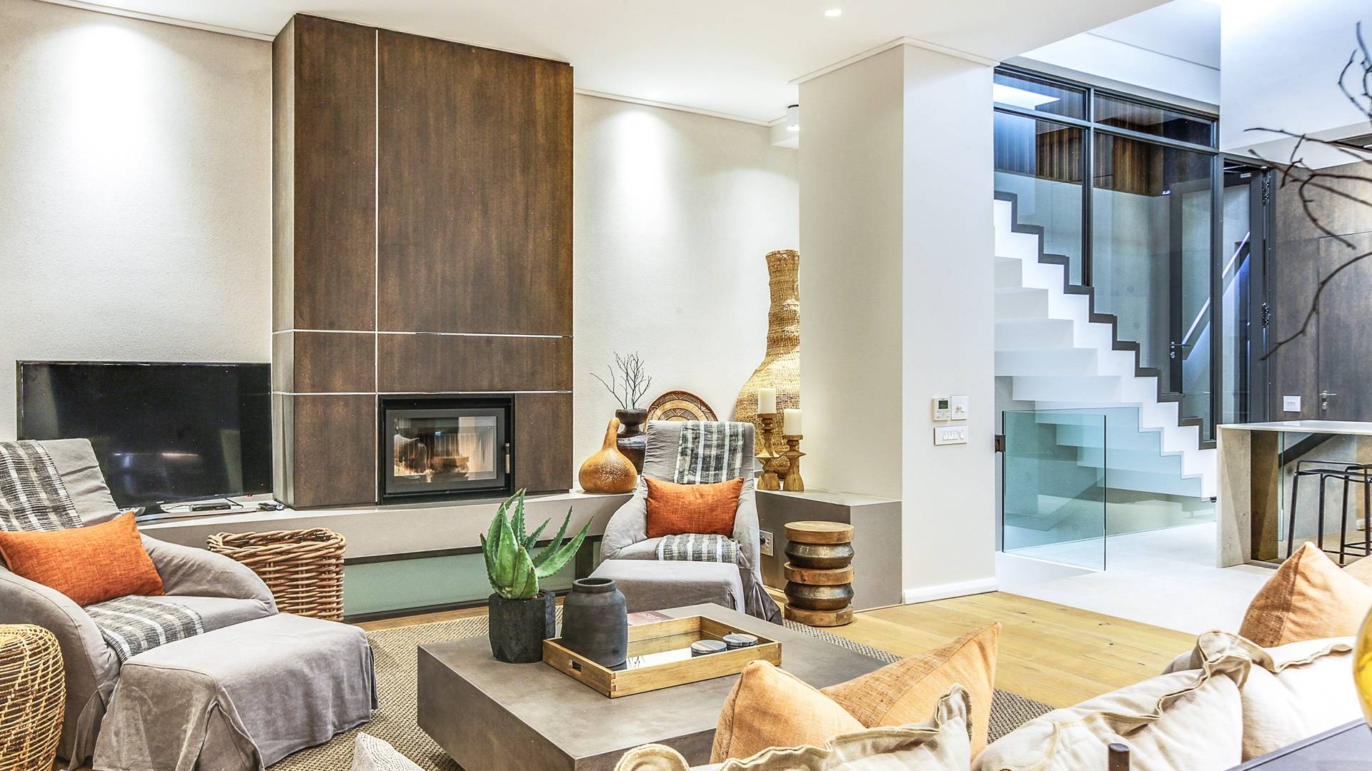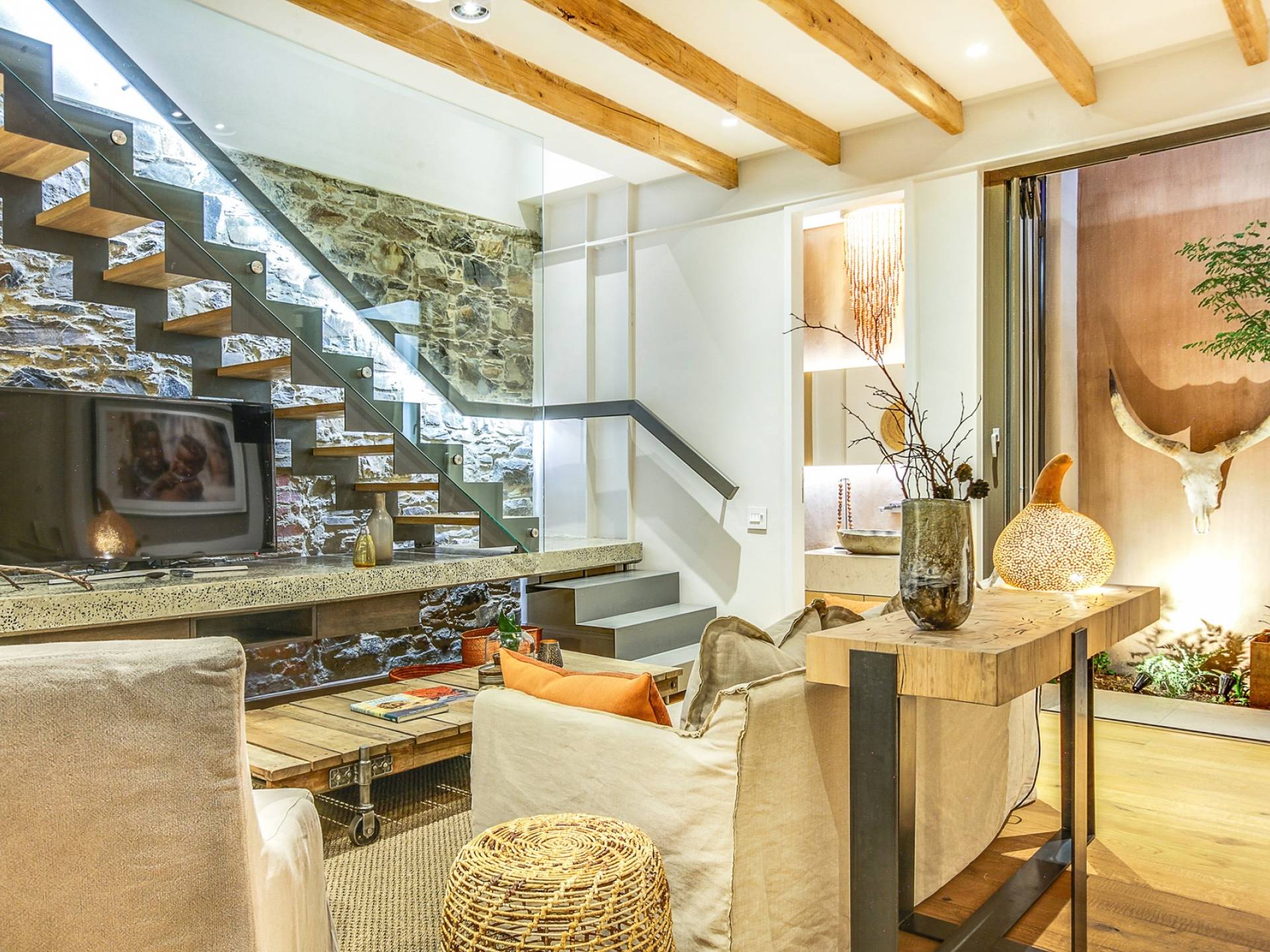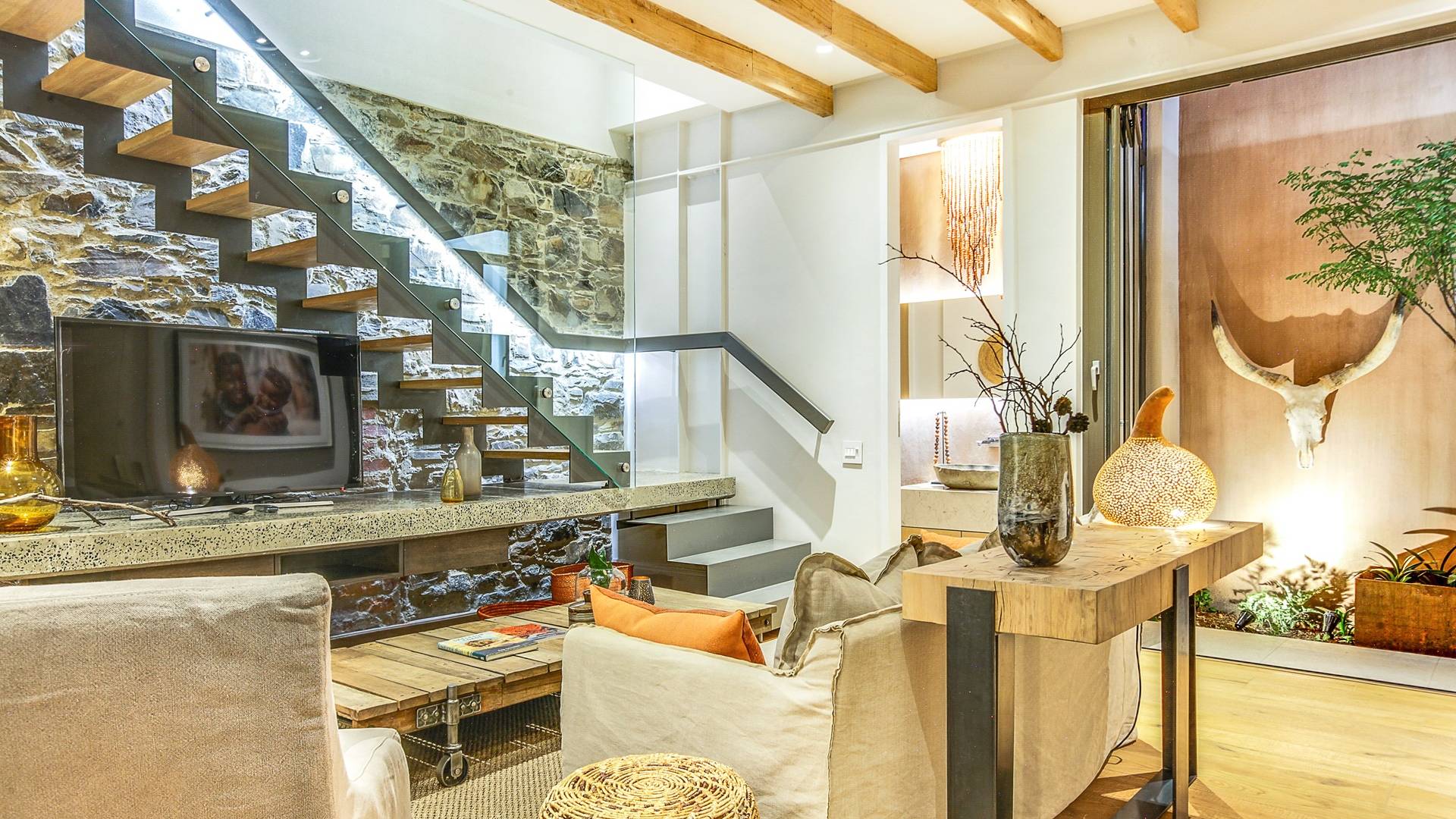 Villa 157 Waterkant in Kapstadt vermittelt ein industrielles Flair mit freiliegenden Felswänden, einer Metalltreppe und künstlerischen Leuchten. Das Farbschema bietet satte Töne, die einen einladenden und einladenden Raum schaffen.