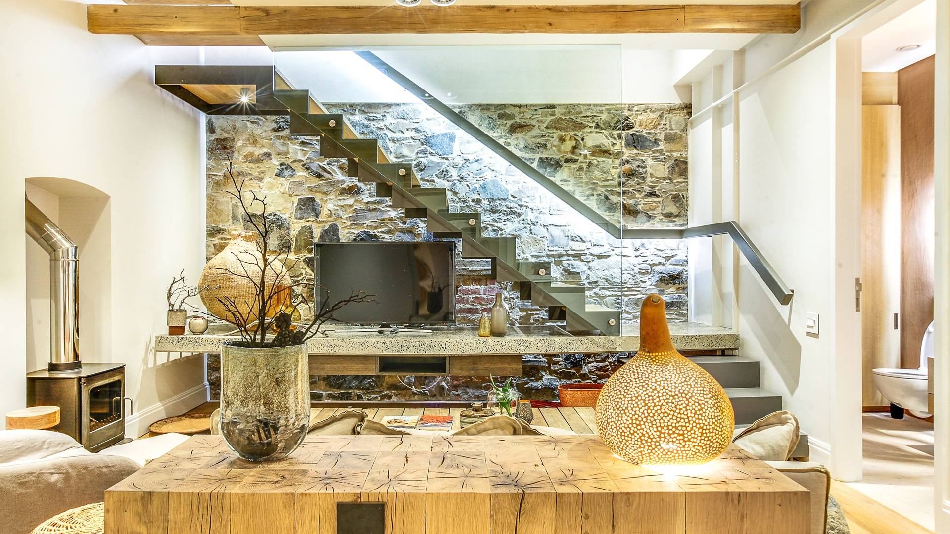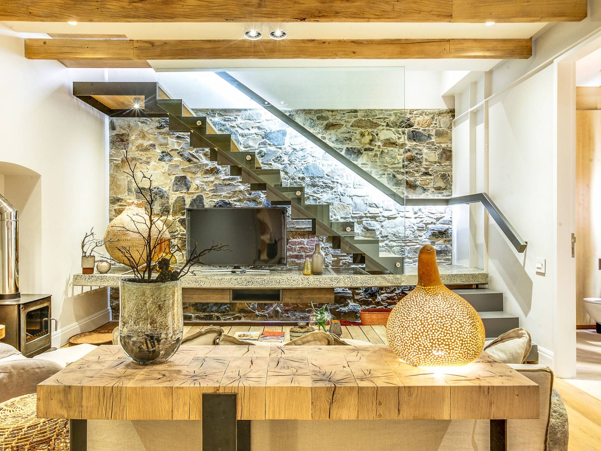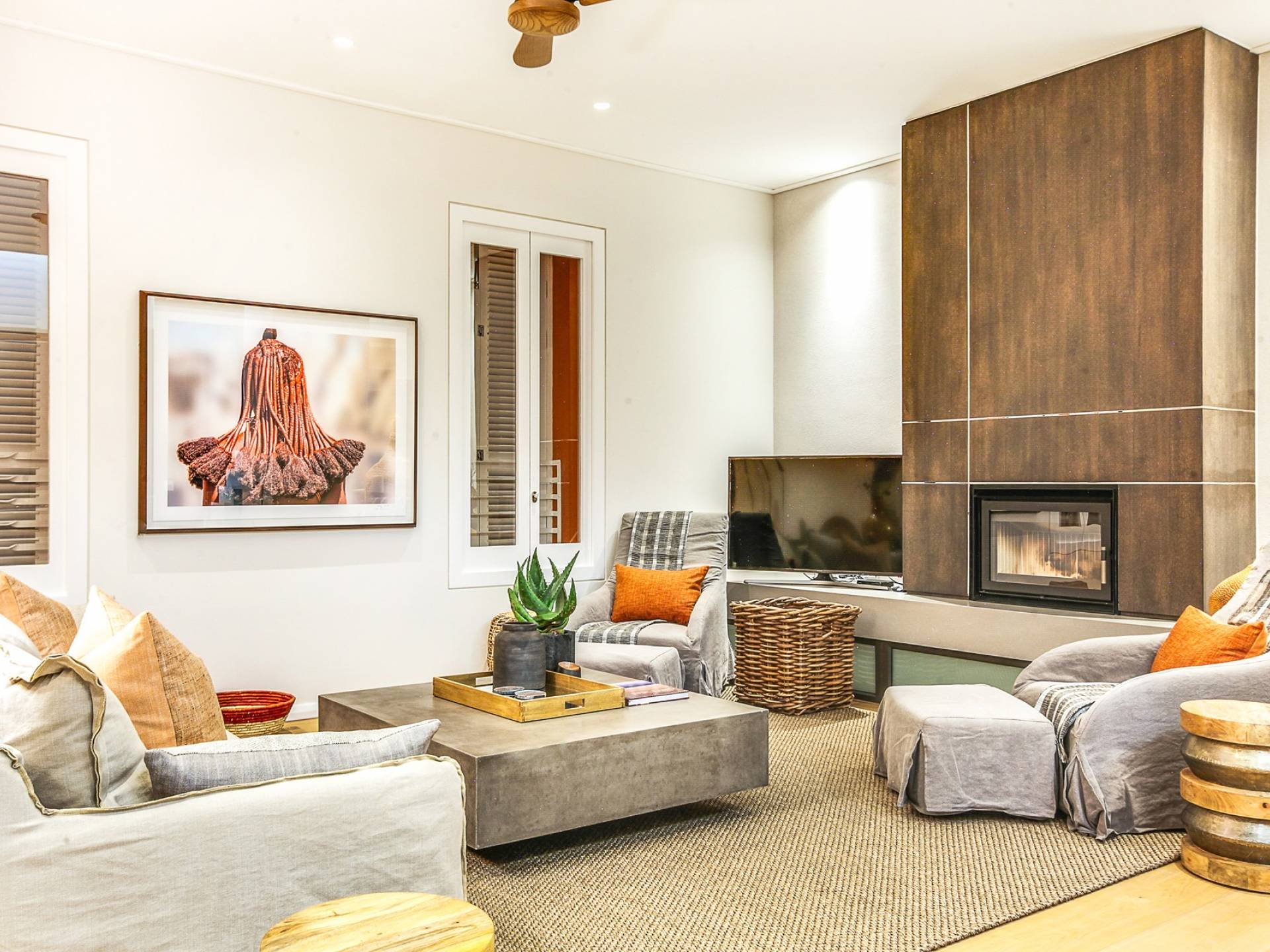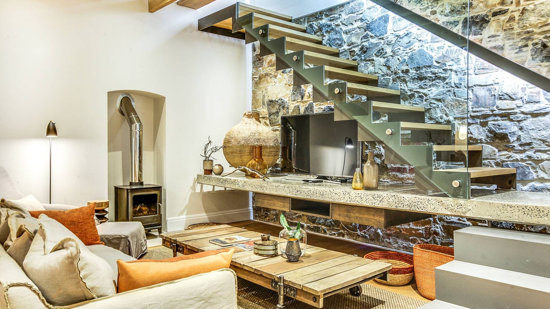 Villa 157 Waterkant in Kapstadt vermittelt ein industrielles Flair mit freiliegenden Felswänden, einer Metalltreppe und künstlerischen Leuchten. Das Farbschema bietet satte Töne, die einen einladenden und einladenden Raum schaffen.