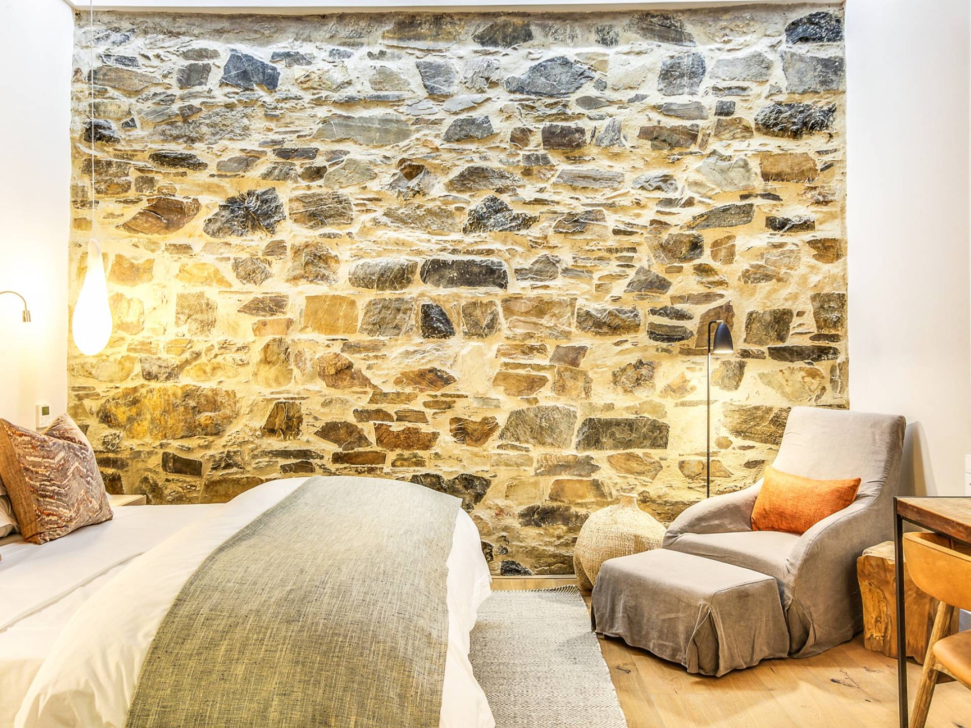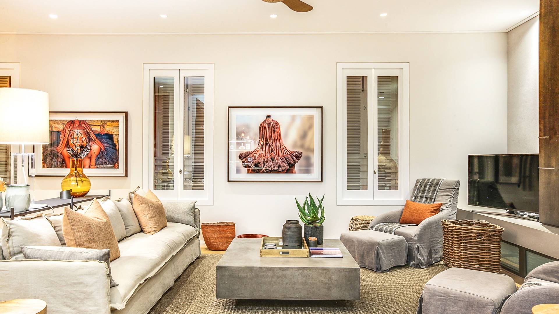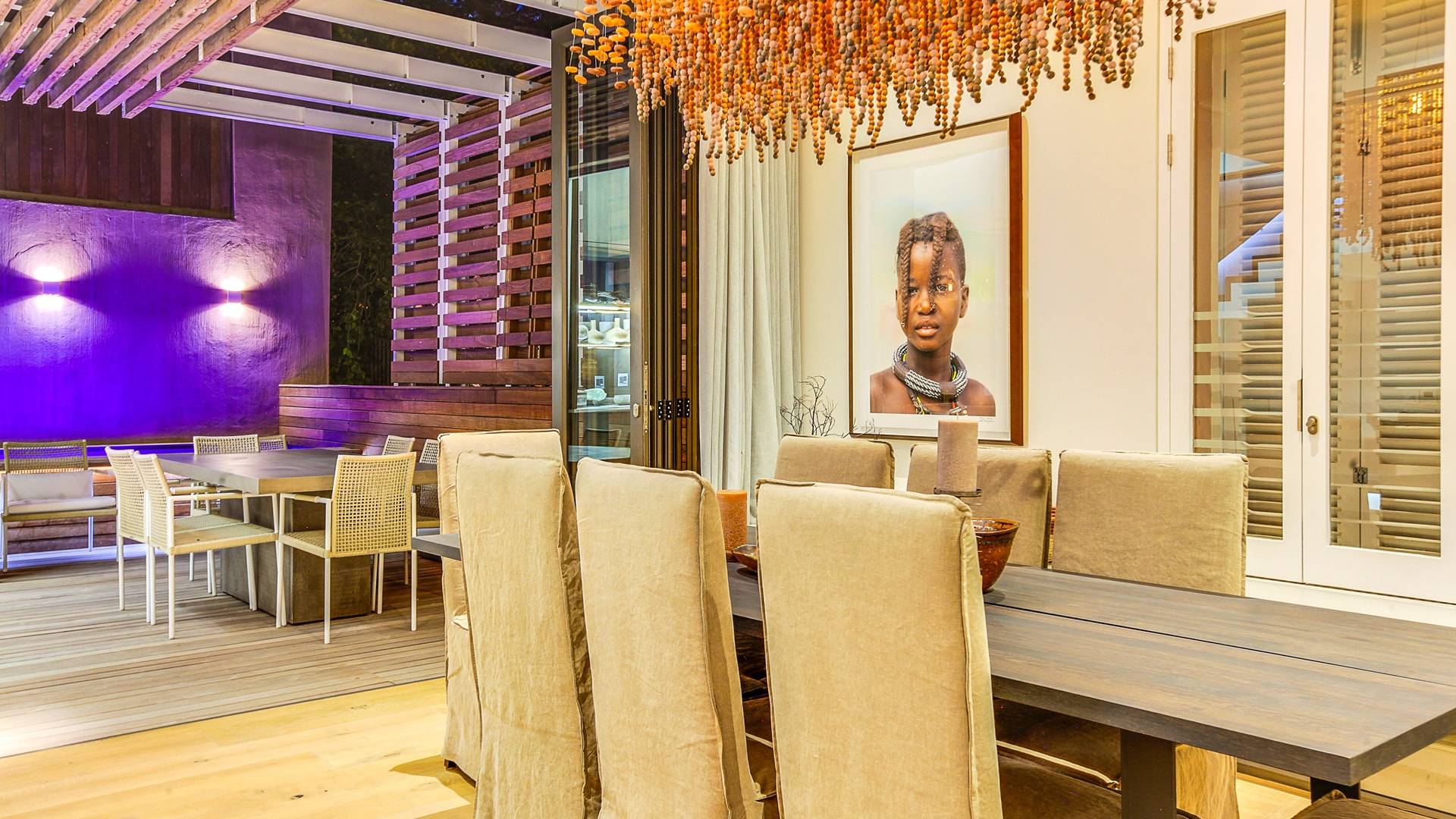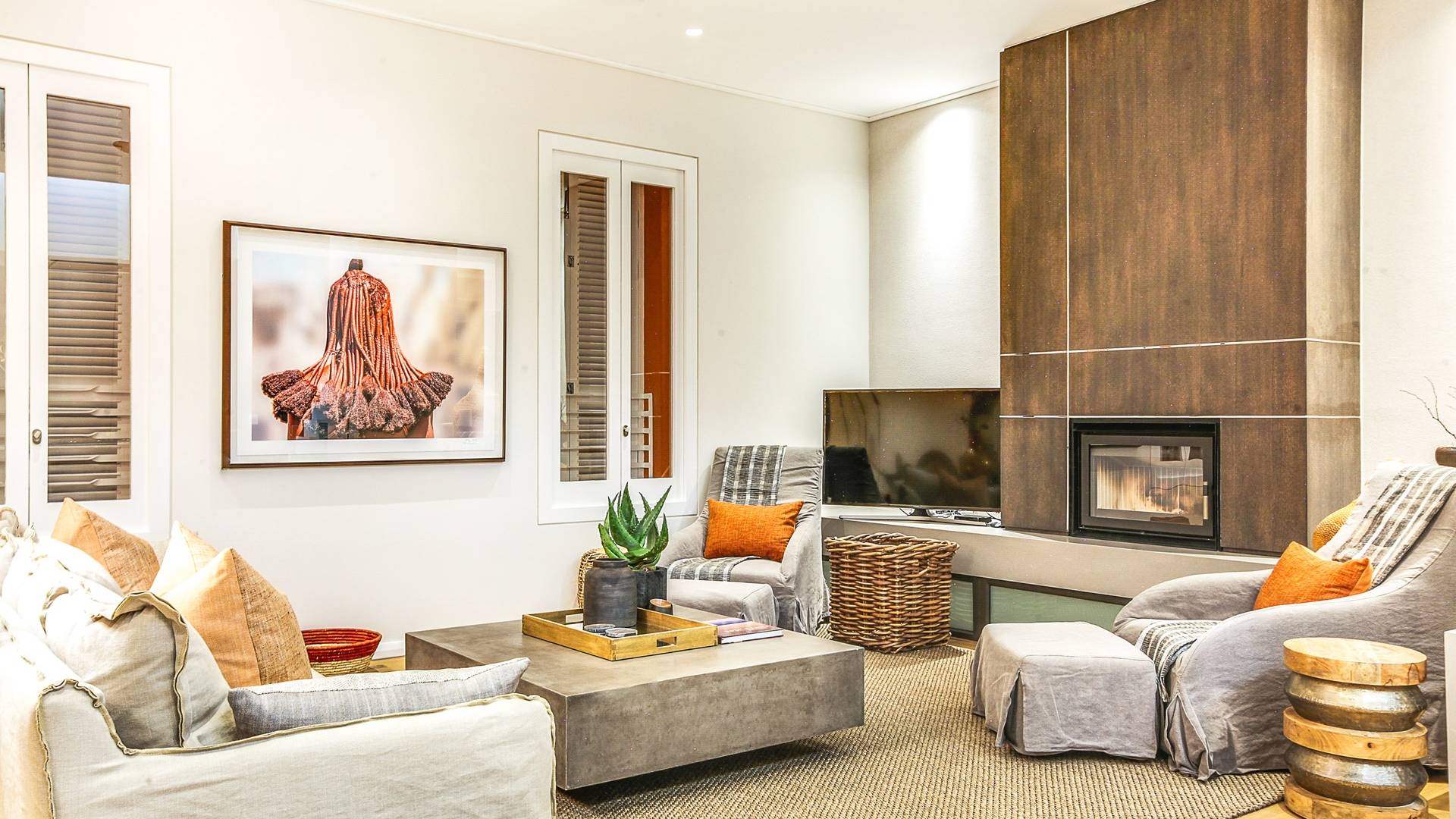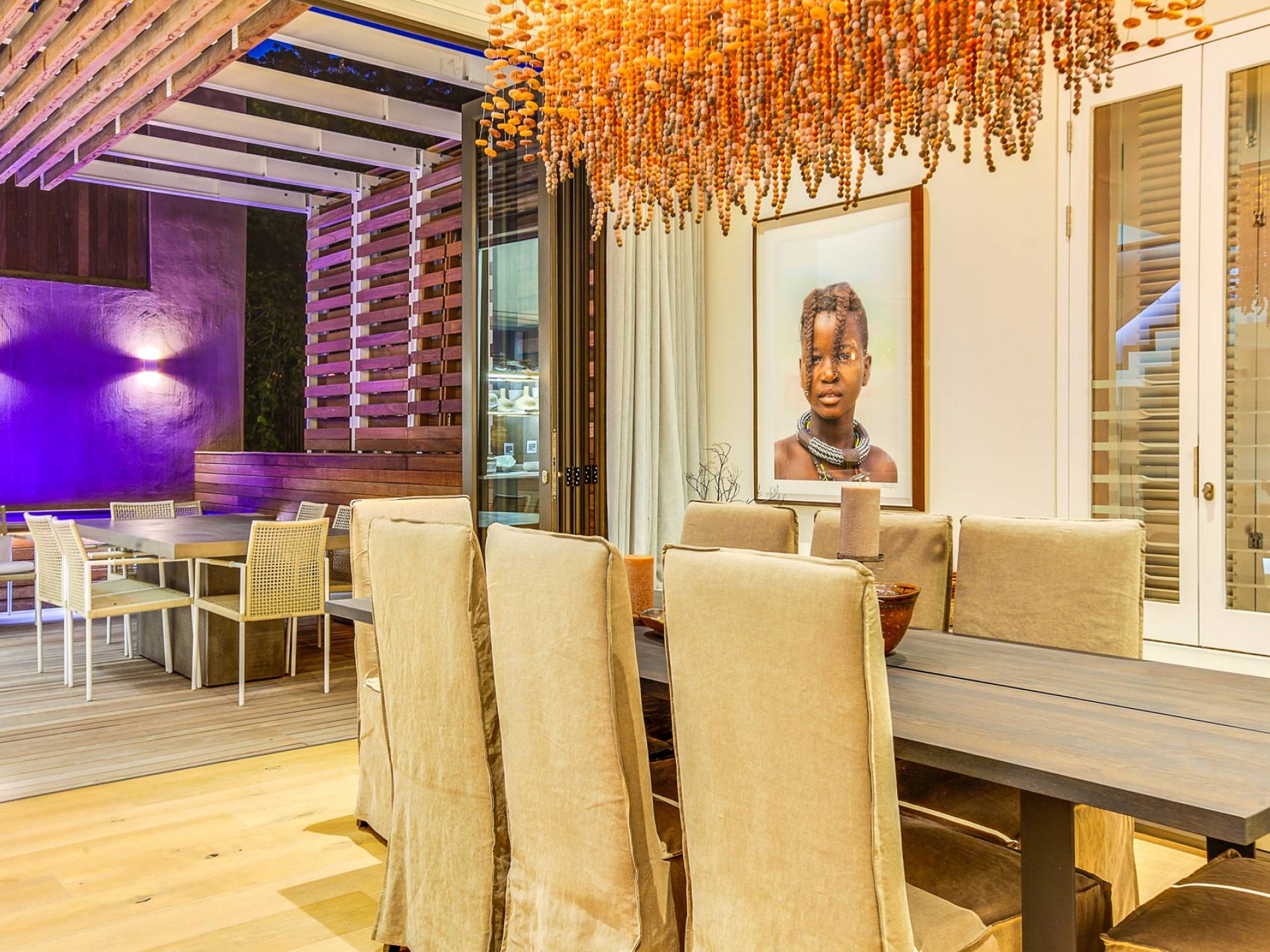 Villa 157 Waterkant in Kapstadt vermittelt ein industrielles Flair mit freiliegenden Felswänden, einer Metalltreppe und künstlerischen Leuchten. Das Farbschema bietet satte Töne, die einen einladenden und einladenden Raum schaffen.
