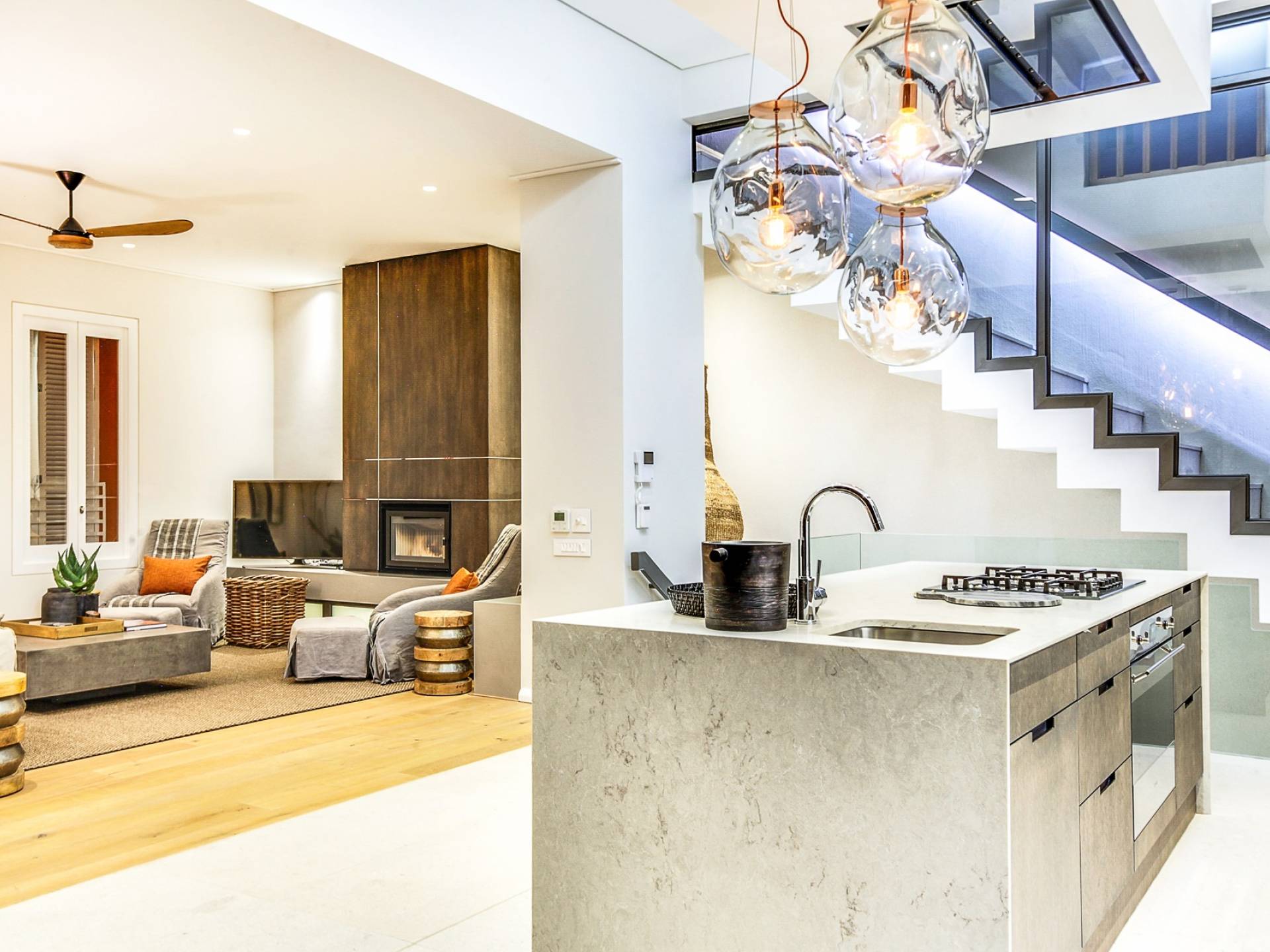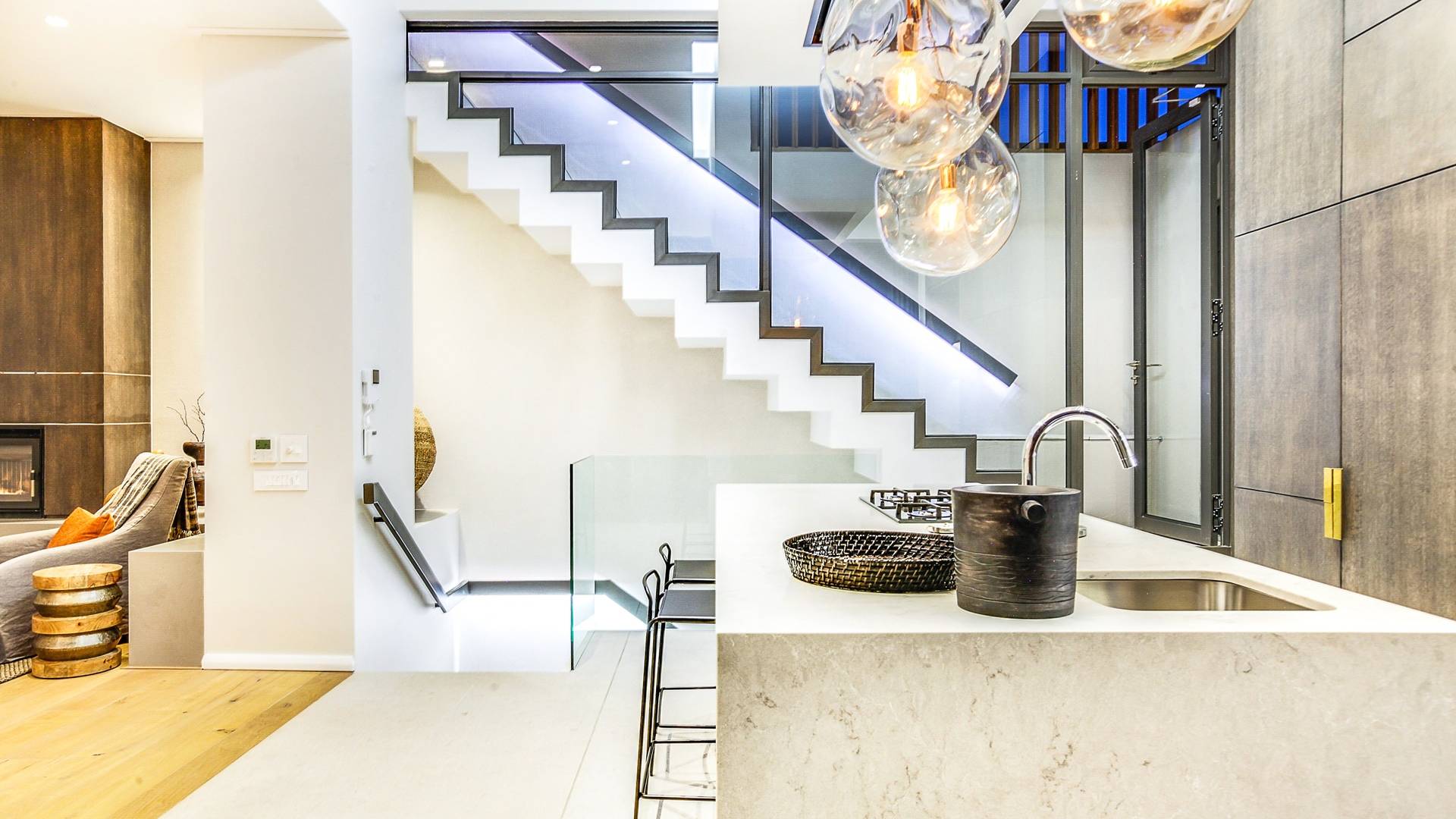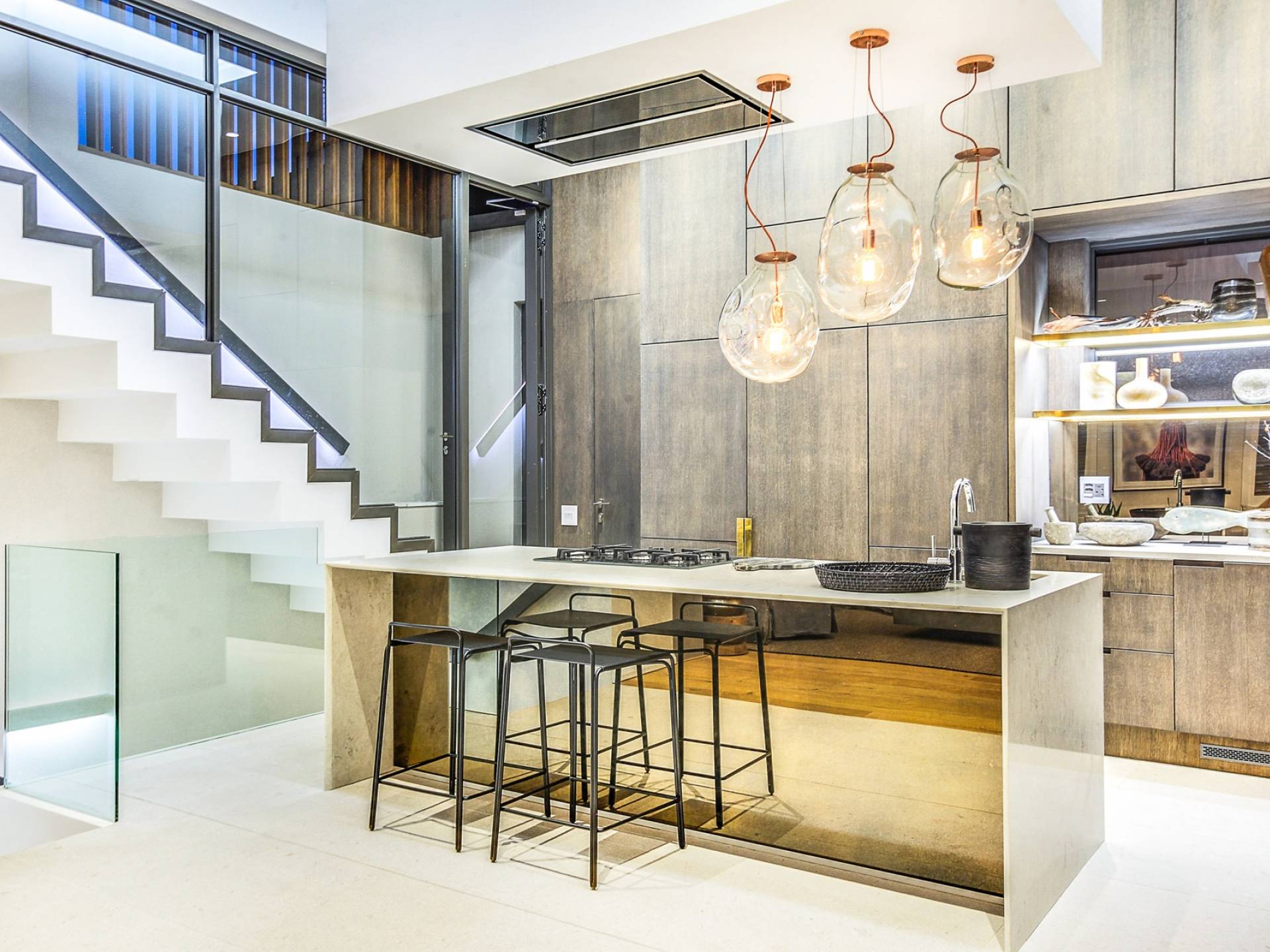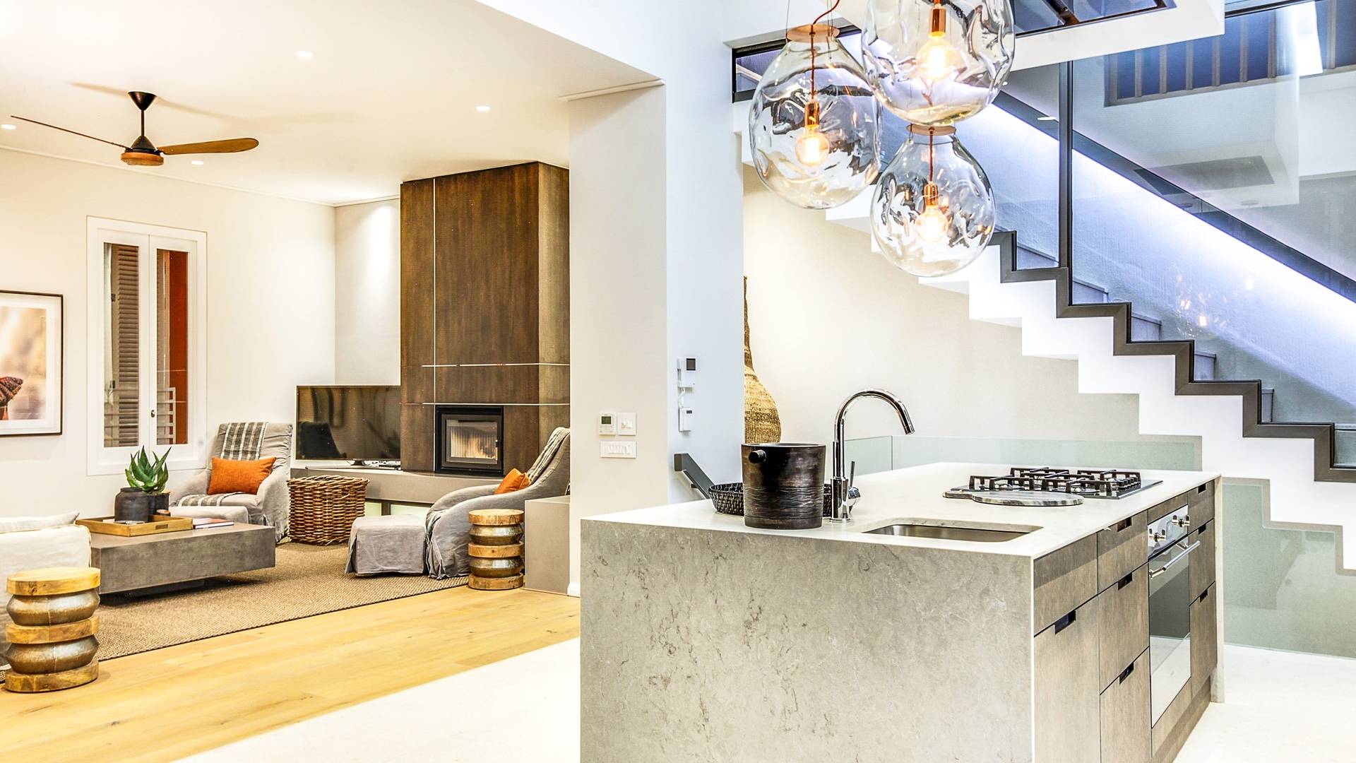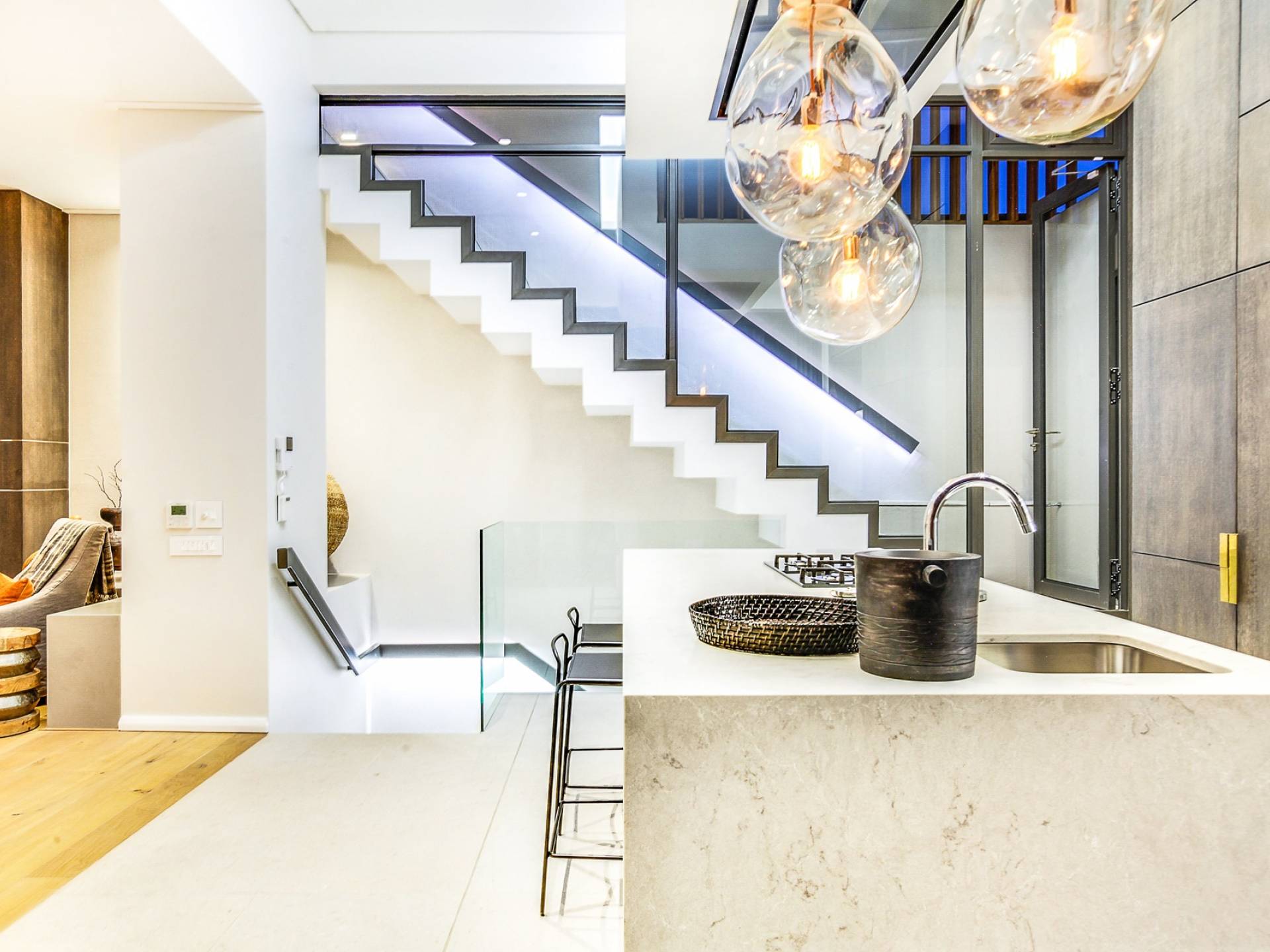 Villa 157 Waterkant in Kapstadt vermittelt ein industrielles Flair mit freiliegenden Felswänden, einer Metalltreppe und künstlerischen Leuchten. Das Farbschema bietet satte Töne, die einen einladenden und einladenden Raum schaffen.