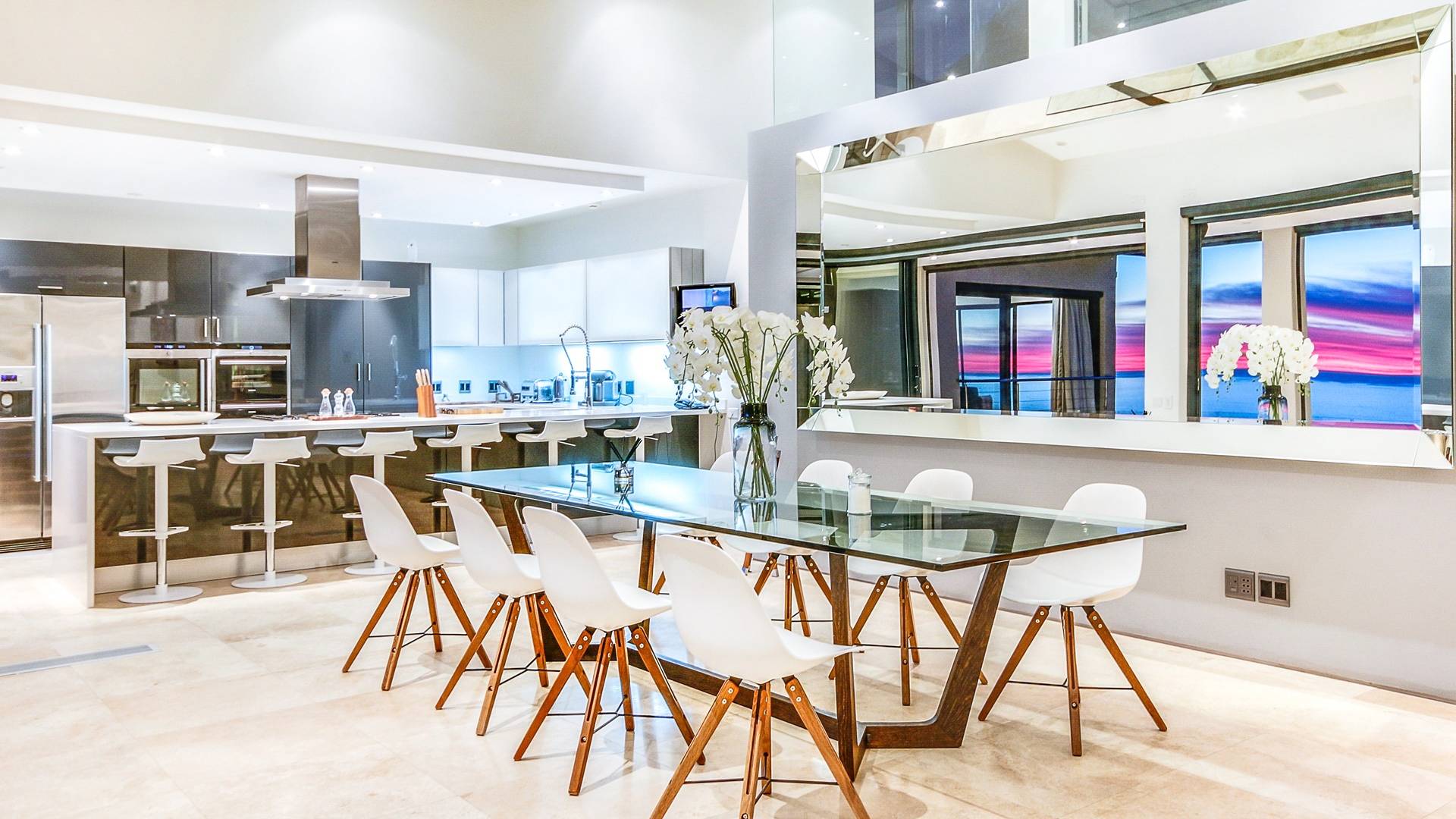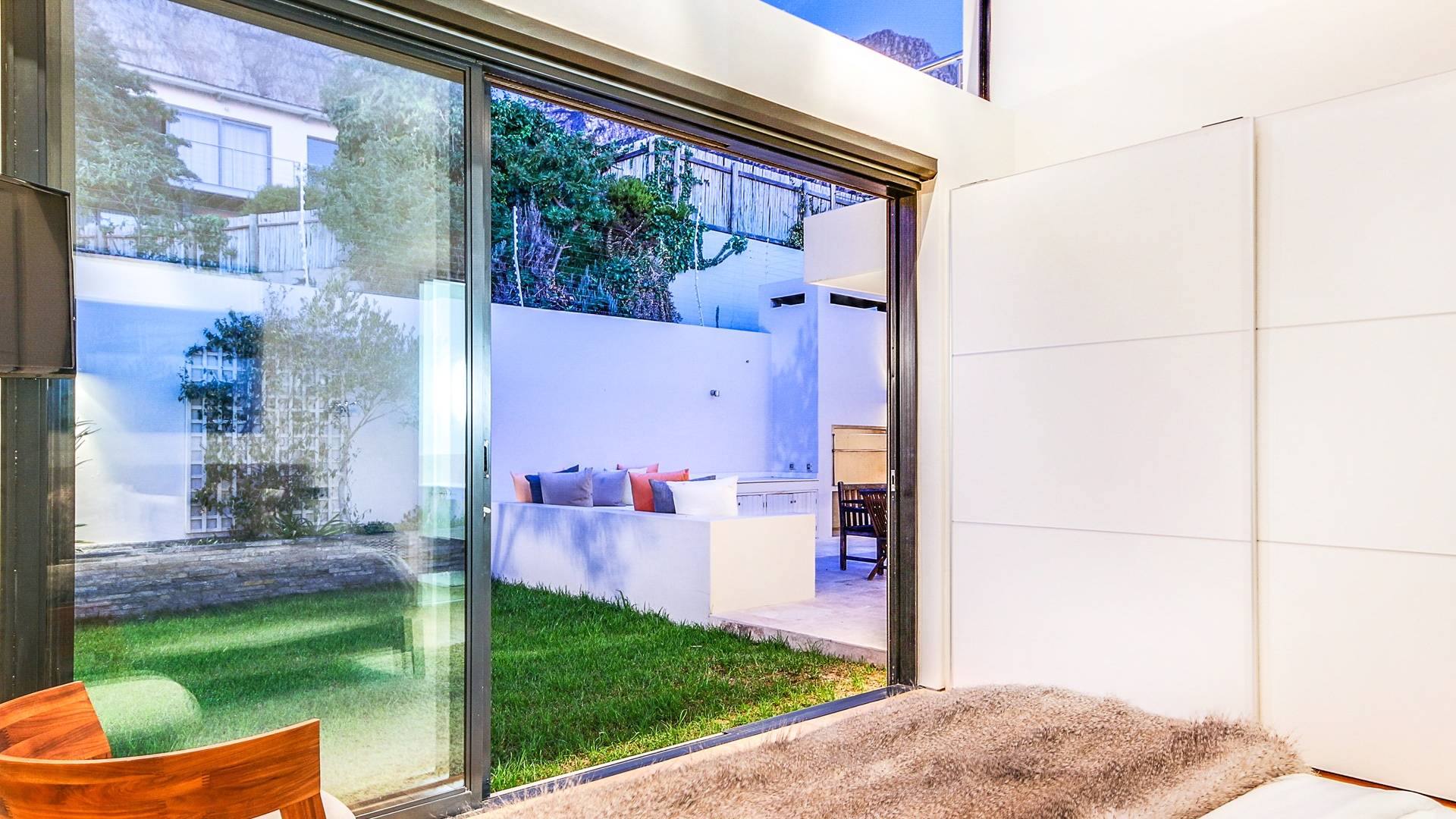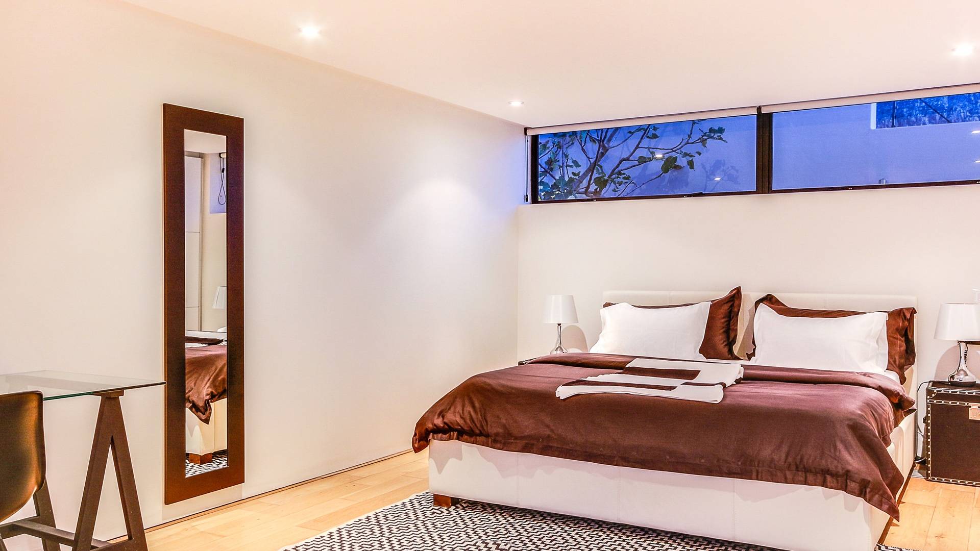 Dieses moderne Anwesen befindet sich an der Spitze von Camps Bay und bietet einen großartigen Blick auf das Meer und die Berge, egal in welchem Bereich des Hauses Sie sich befinden. Im Inneren sind die Zimmer hell und geräumig.