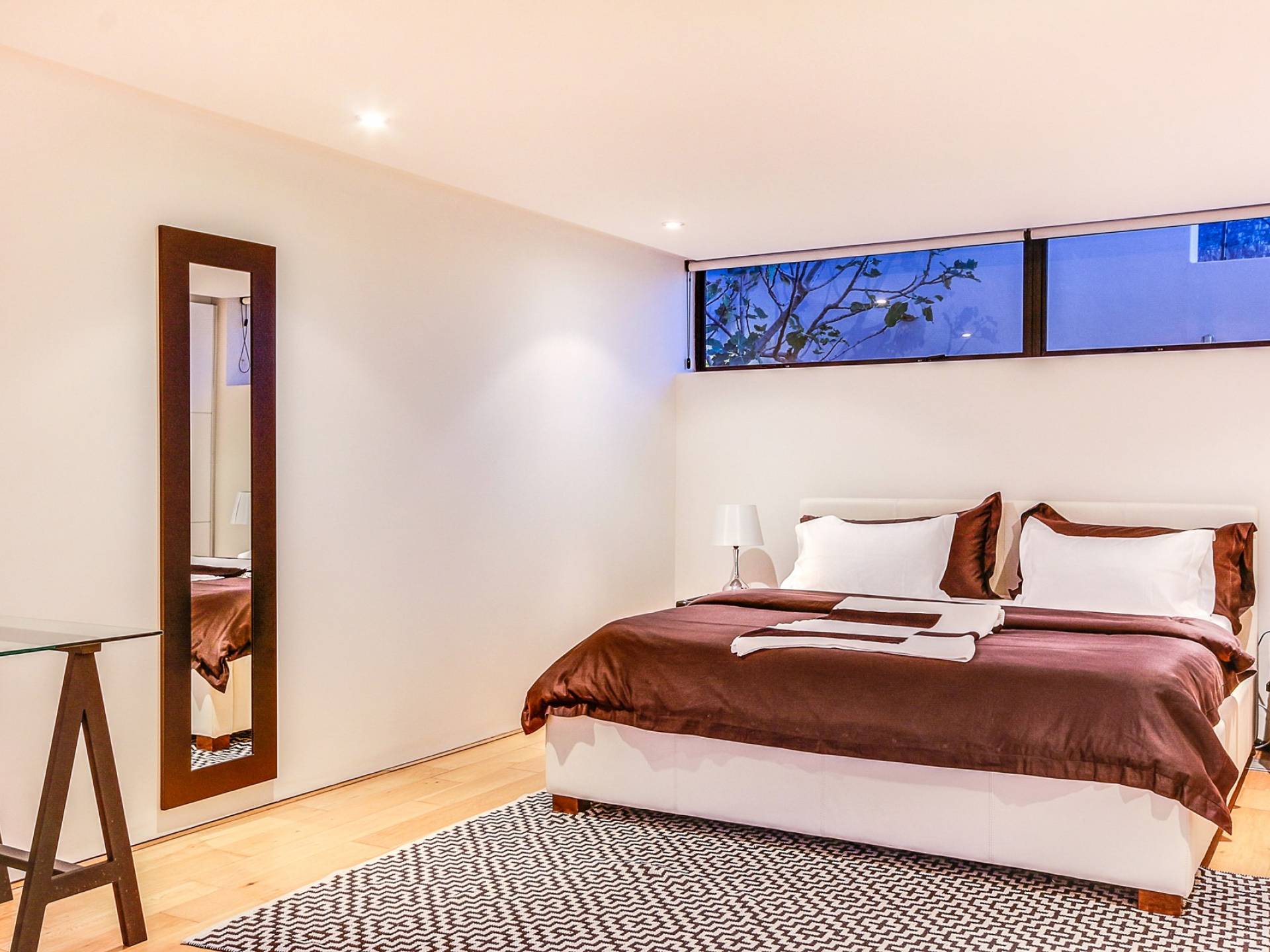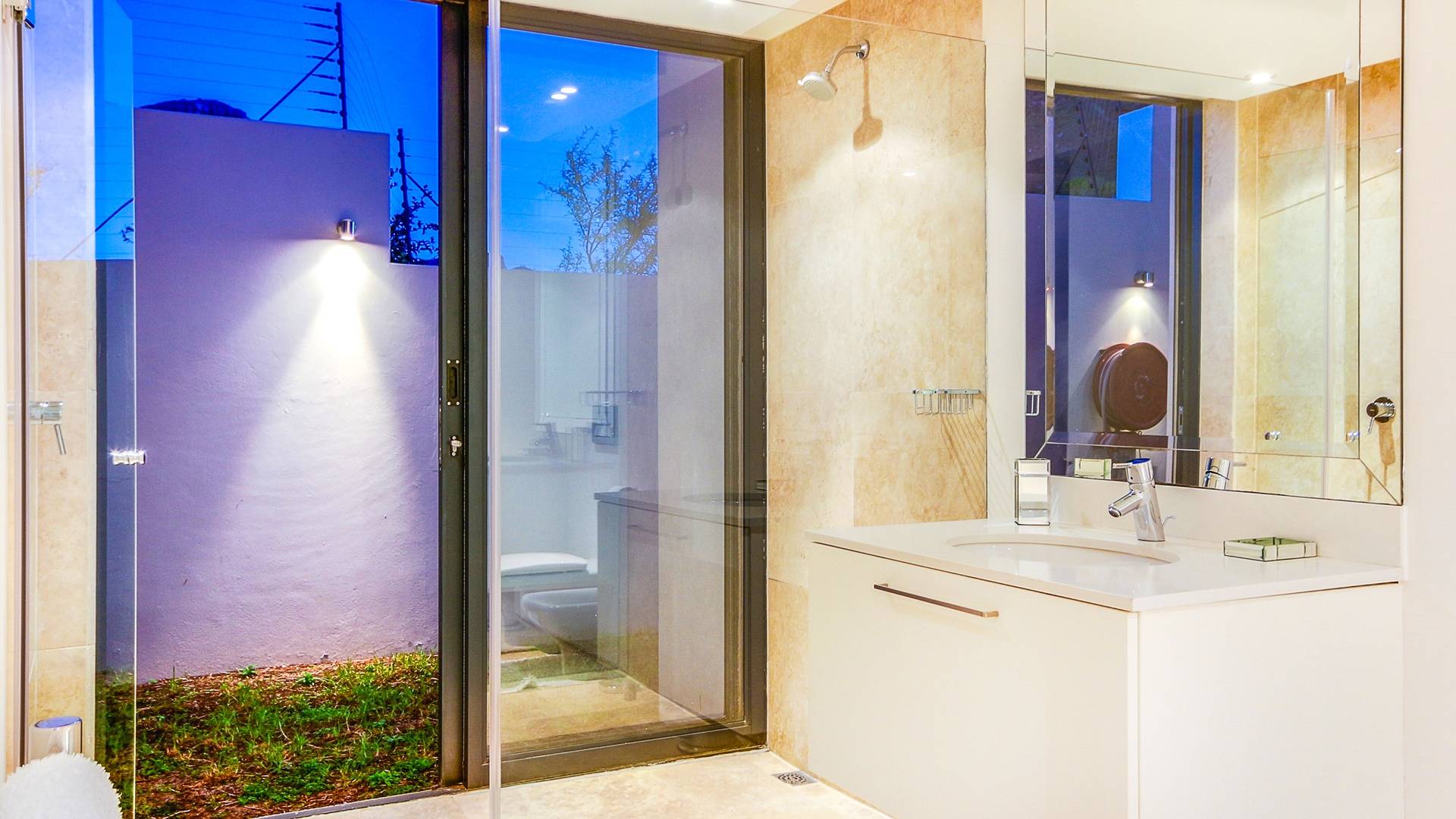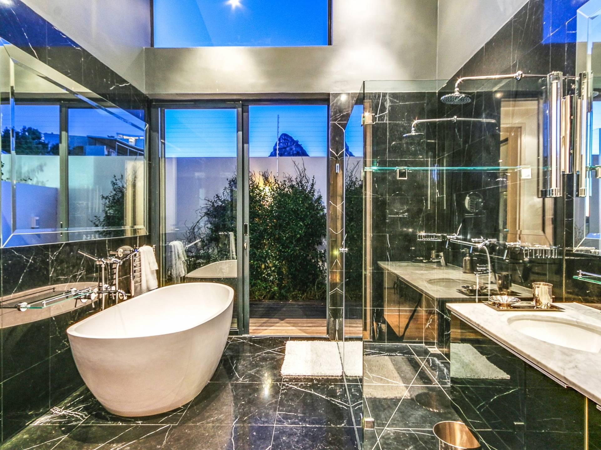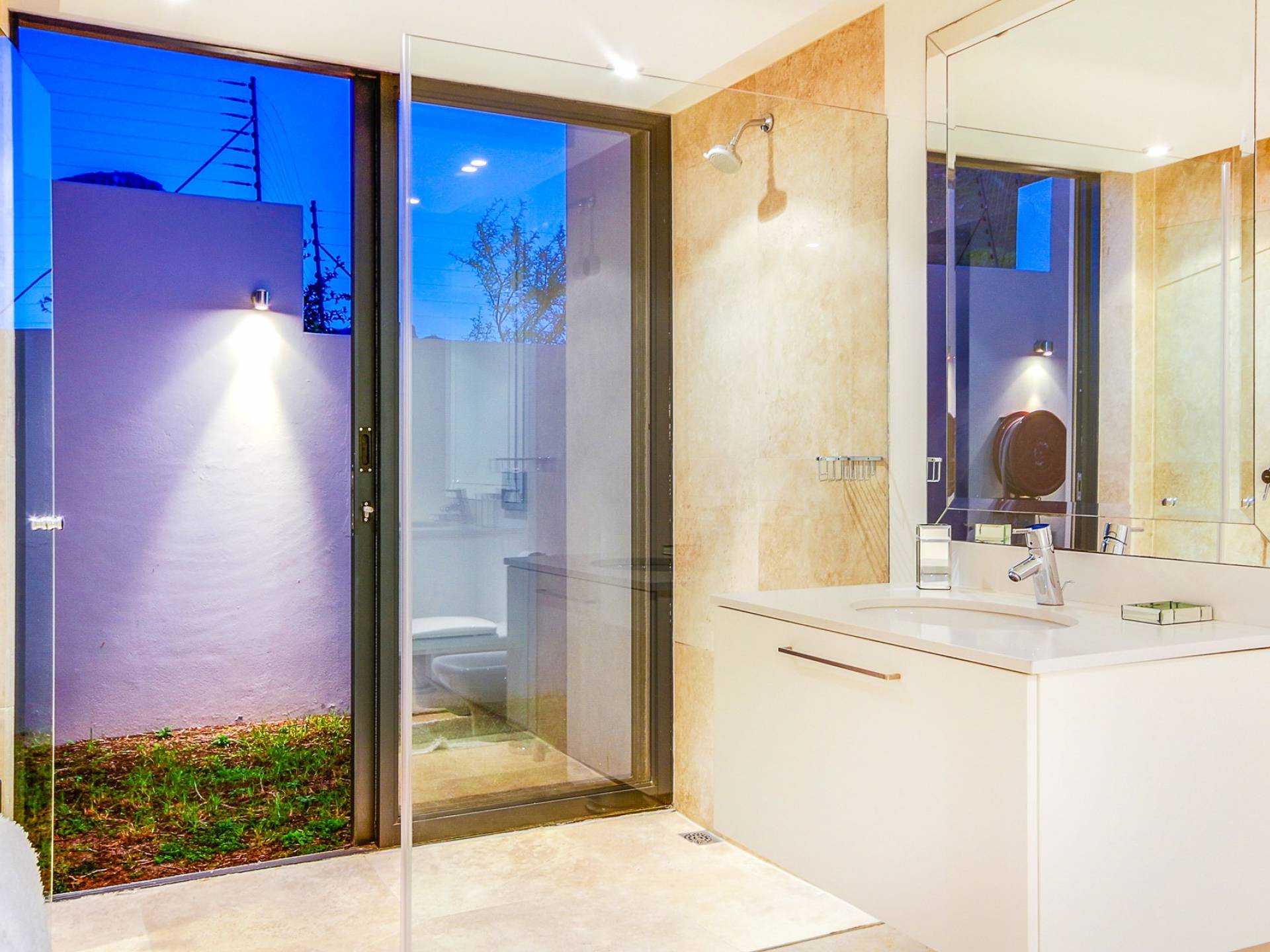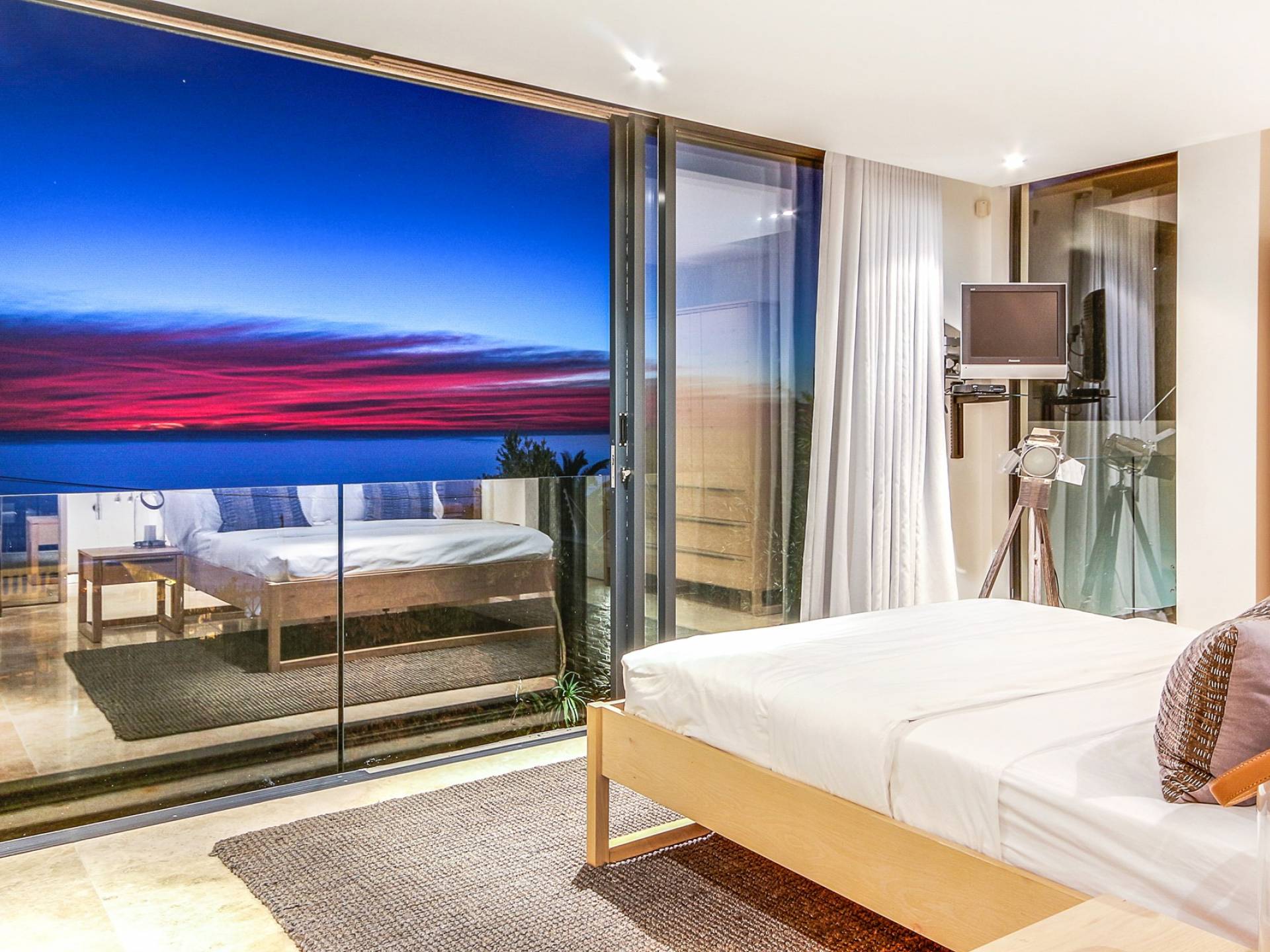 Das große Hauptschlafzimmer im Erdgeschoss verfügt über einen begehbaren Kleiderschrank, ein eigenes Bad und einen Juliette-Balkon mit spektakulärer Aussicht. Das zweite und dritte Schlafzimmer befinden sich am Ende des Korridors, beide haben Zugang zum großzügigen Hinterhof und haben auch beide ein eigenes Bad. Schlafzimmer vier befindet sich auf der unteren Ebene in der Nähe des Aufzugs und unterhalb des Wohnzimmers. Es ist auch en-suite, hat einen privaten Balkon mit Torzugang zum Hinterhof und hat eine eigene Küchenzeile und einen separaten Eingang. Das fünfte Schlafzimmer befindet sich unter dem Hauptschlafzimmer, ebenfalls mit eigenem Eingang und eigenem Bad. Dieses Zimmer hat keinen direkten Zugang zum Haus. Um in das Haus zu gelangen, verlassen Sie den Raum, gehen die Außentreppe hinauf und zur Haupteingangstür. Das zweite und fünfte Schlafzimmer haben Zugang zu halbprivaten Außenduschen.