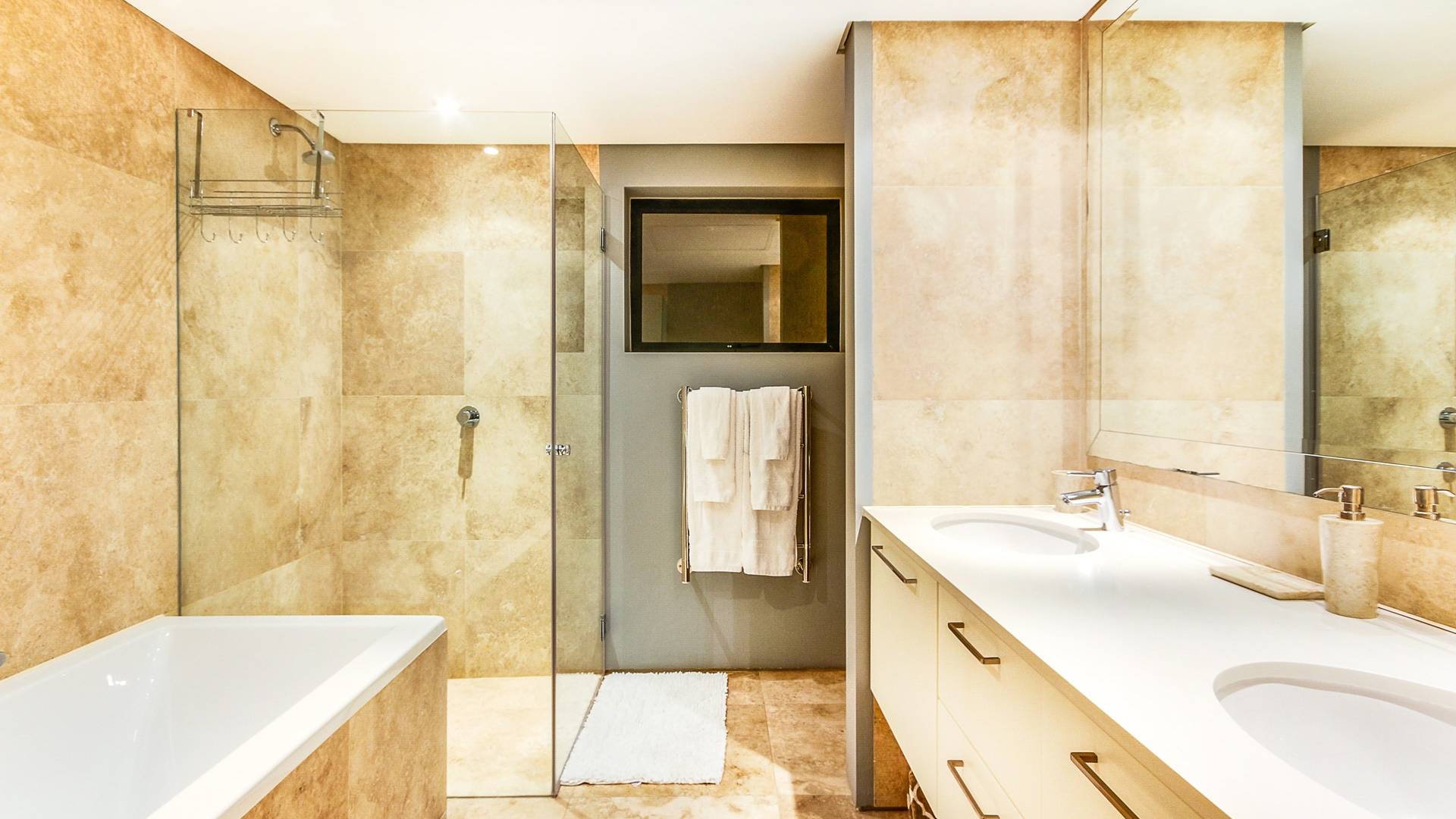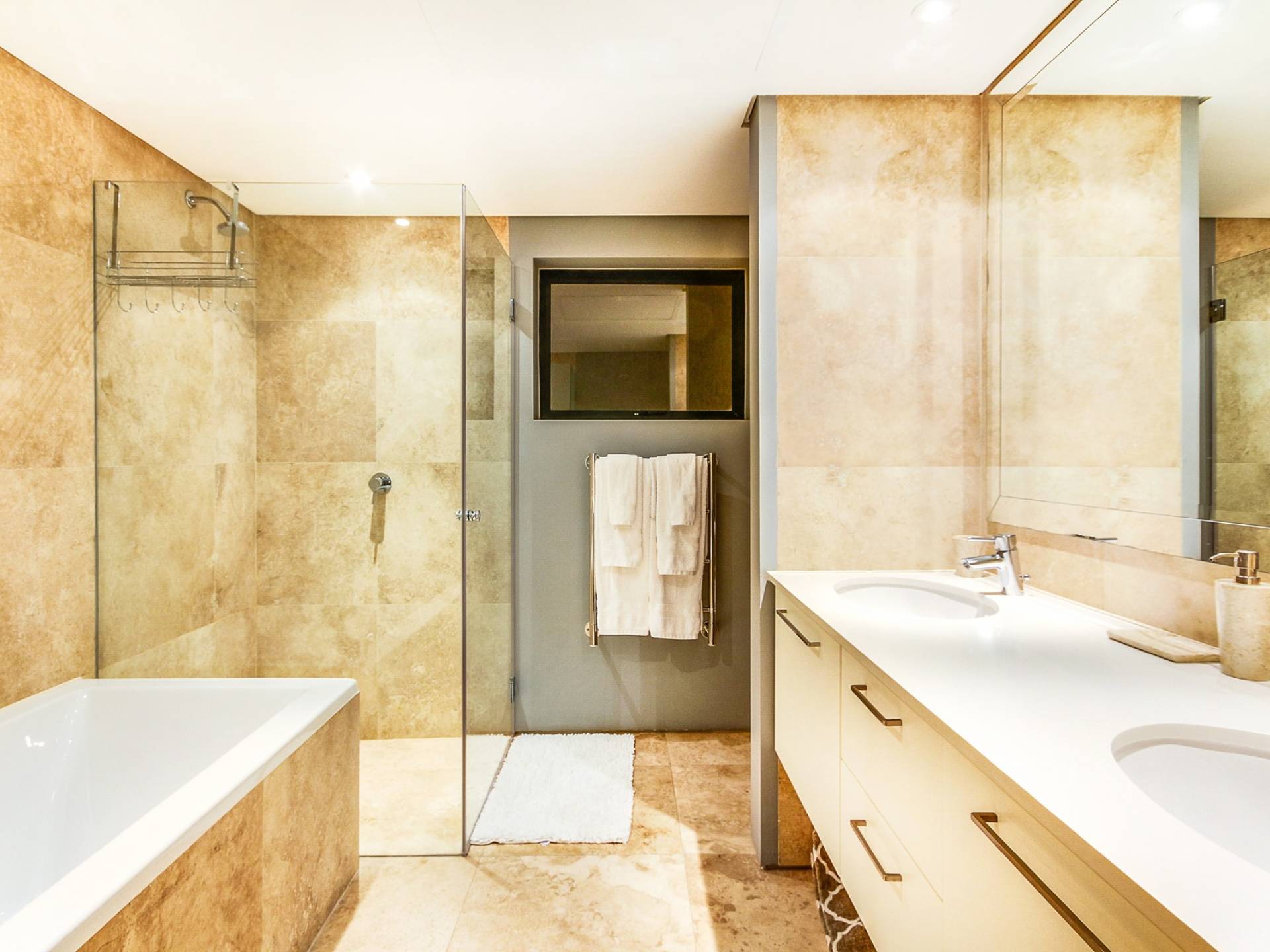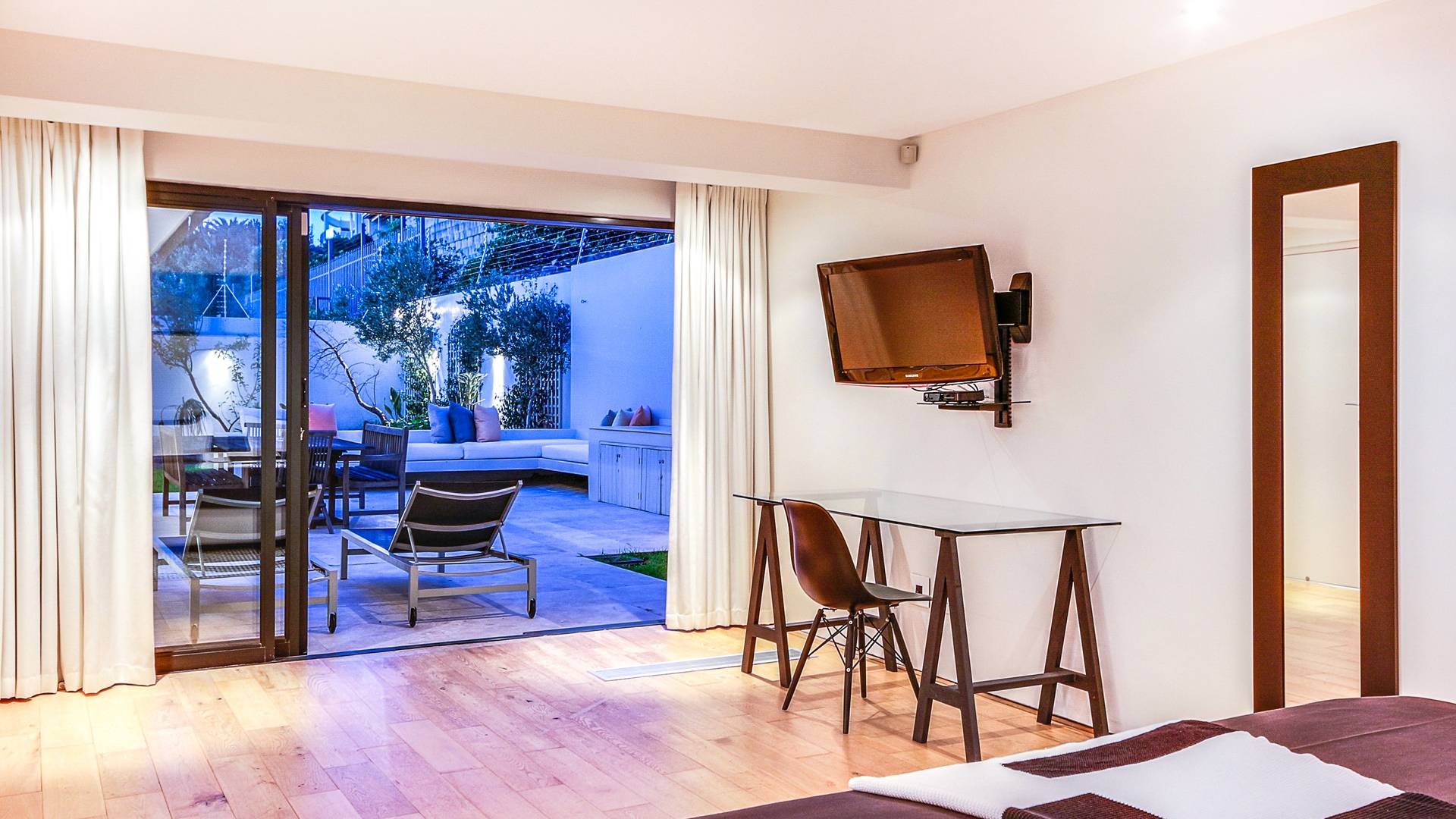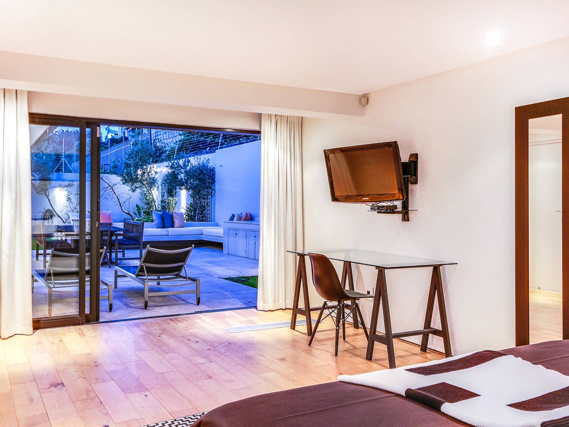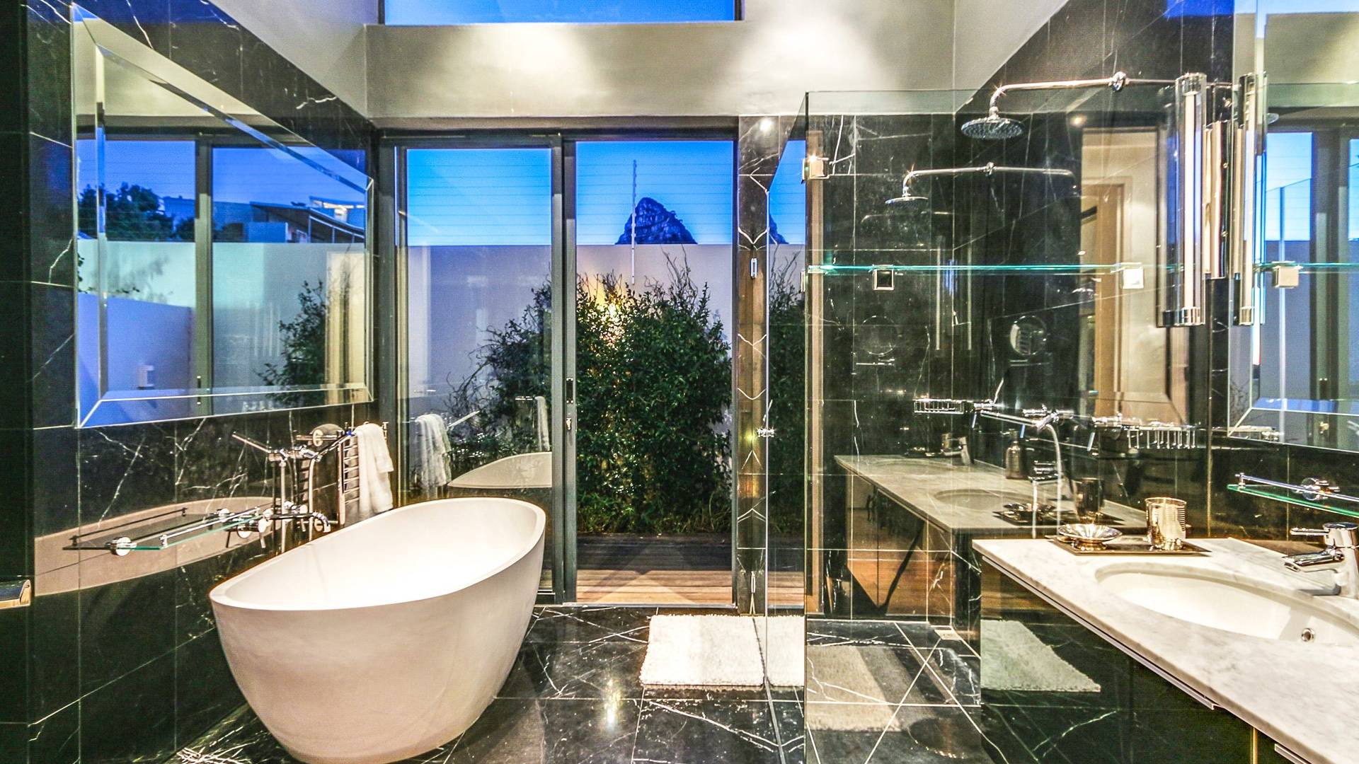 Das große Hauptschlafzimmer im Erdgeschoss verfügt über einen begehbaren Kleiderschrank, ein eigenes Bad und einen Juliette-Balkon mit spektakulärer Aussicht. Das zweite und dritte Schlafzimmer befinden sich am Ende des Korridors, beide haben Zugang zum großzügigen Hinterhof und haben auch beide ein eigenes Bad. Schlafzimmer vier befindet sich auf der unteren Ebene in der Nähe des Aufzugs und unterhalb des Wohnzimmers. Es ist auch en-suite, hat einen privaten Balkon mit Torzugang zum Hinterhof und hat eine eigene Küchenzeile und einen separaten Eingang. Das fünfte Schlafzimmer befindet sich unter dem Hauptschlafzimmer, ebenfalls mit eigenem Eingang und eigenem Bad. Dieses Zimmer hat keinen direkten Zugang zum Haus. Um in das Haus zu gelangen, verlassen Sie den Raum, gehen die Außentreppe hinauf und zur Haupteingangstür. Das zweite und fünfte Schlafzimmer haben Zugang zu halbprivaten Außenduschen.