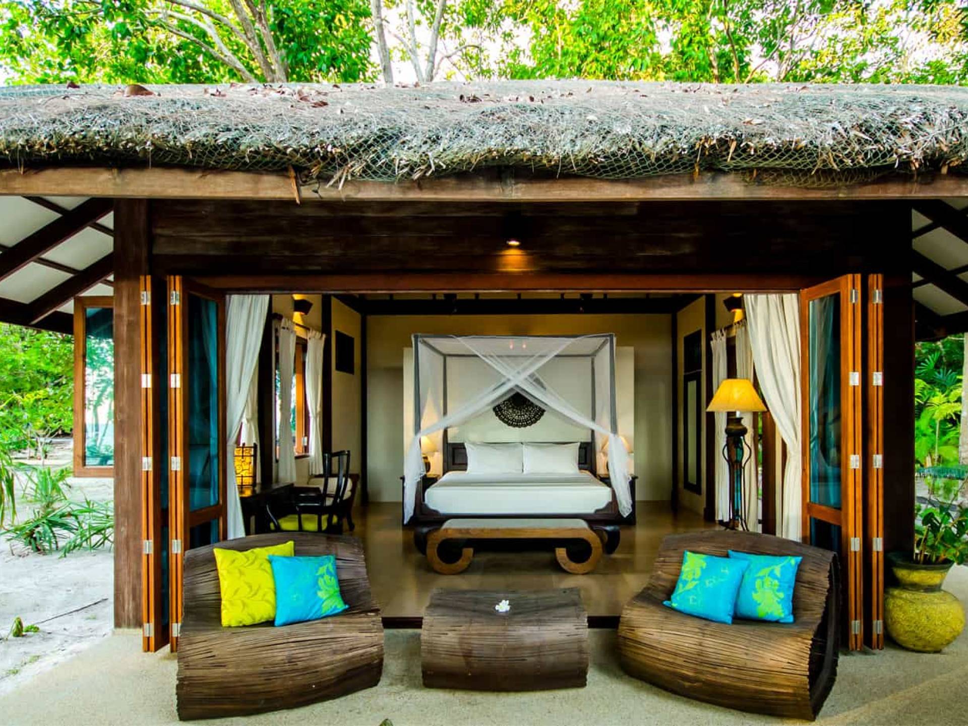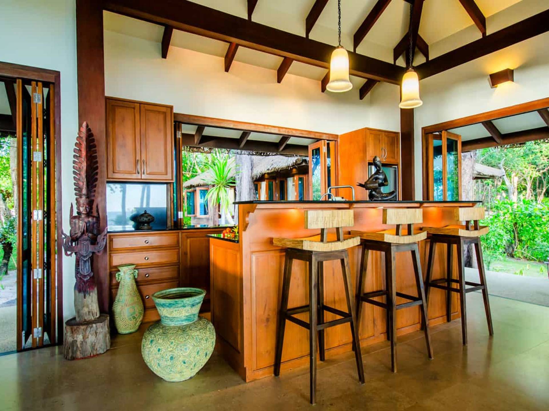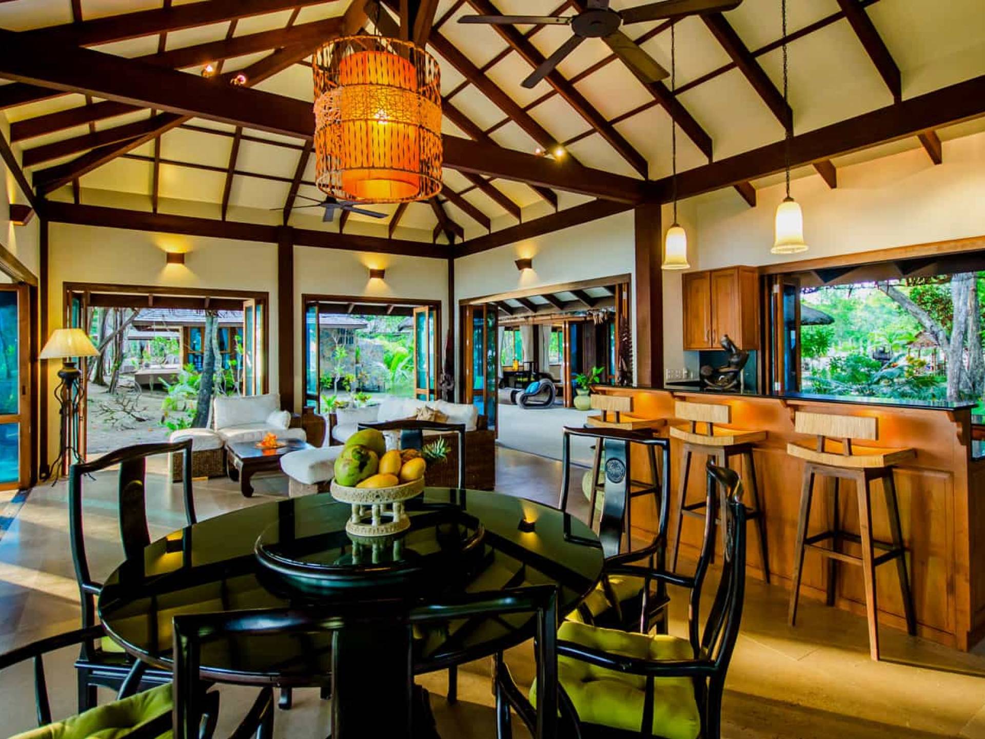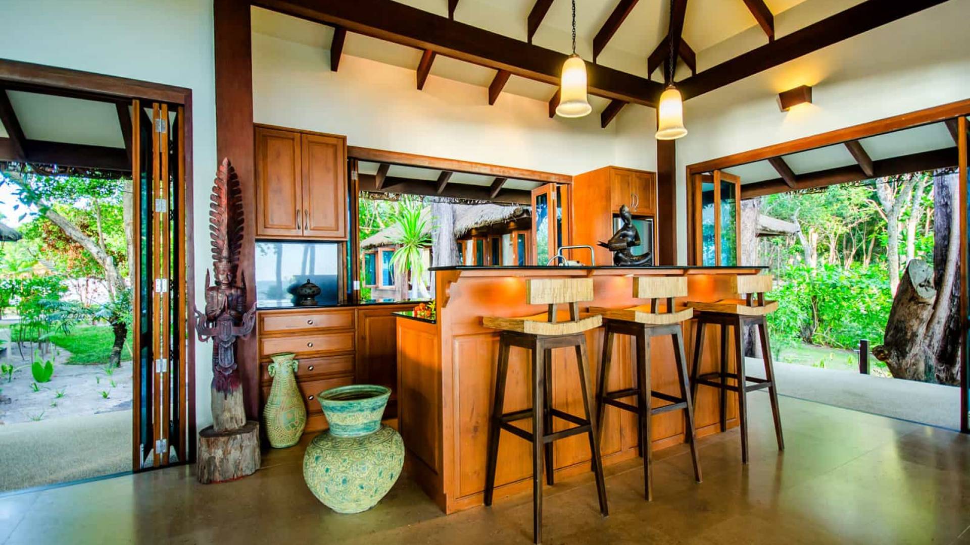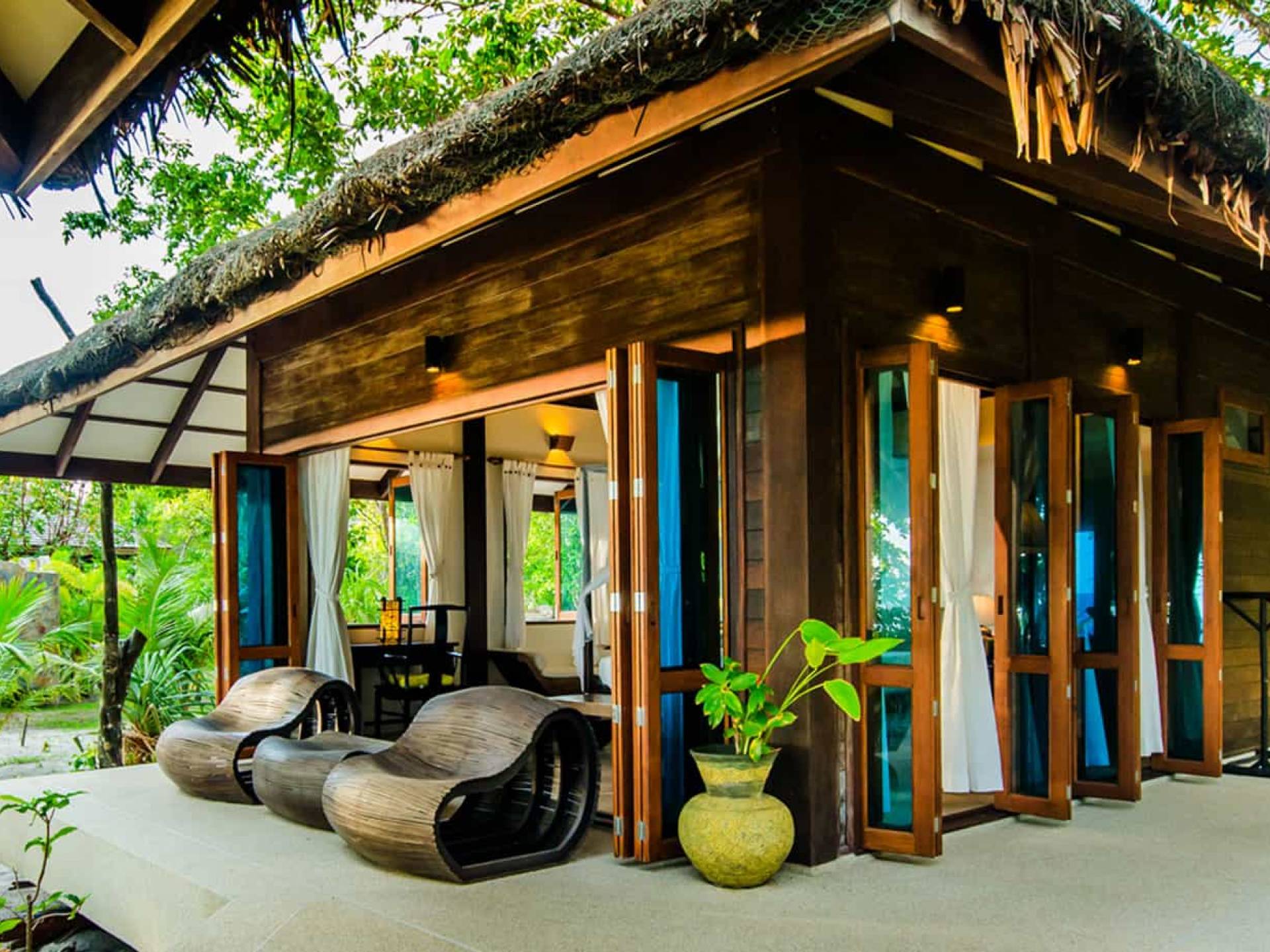 Baan Viva in den Koh Jum Beach Villas ist wunderschön mit vielen natürlichen Materialien wie Holz und Stein gestaltet und eine intelligente Architektur fördert eine ausreichende natürliche Belüftung in allen Bereichen der Villa, die dem Öko-Konzept des Koh Jum Beach Villas Resorts folgt. Die großen Deckenventilatoren und die natürliche Brise sind ein willkommenes Feature, wenn Sie sich in Ihrer Villa entspannen oder nachts schlafen.