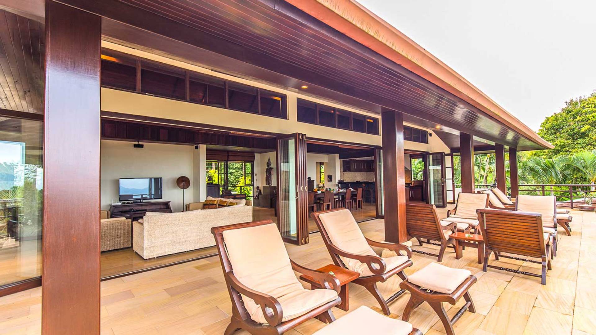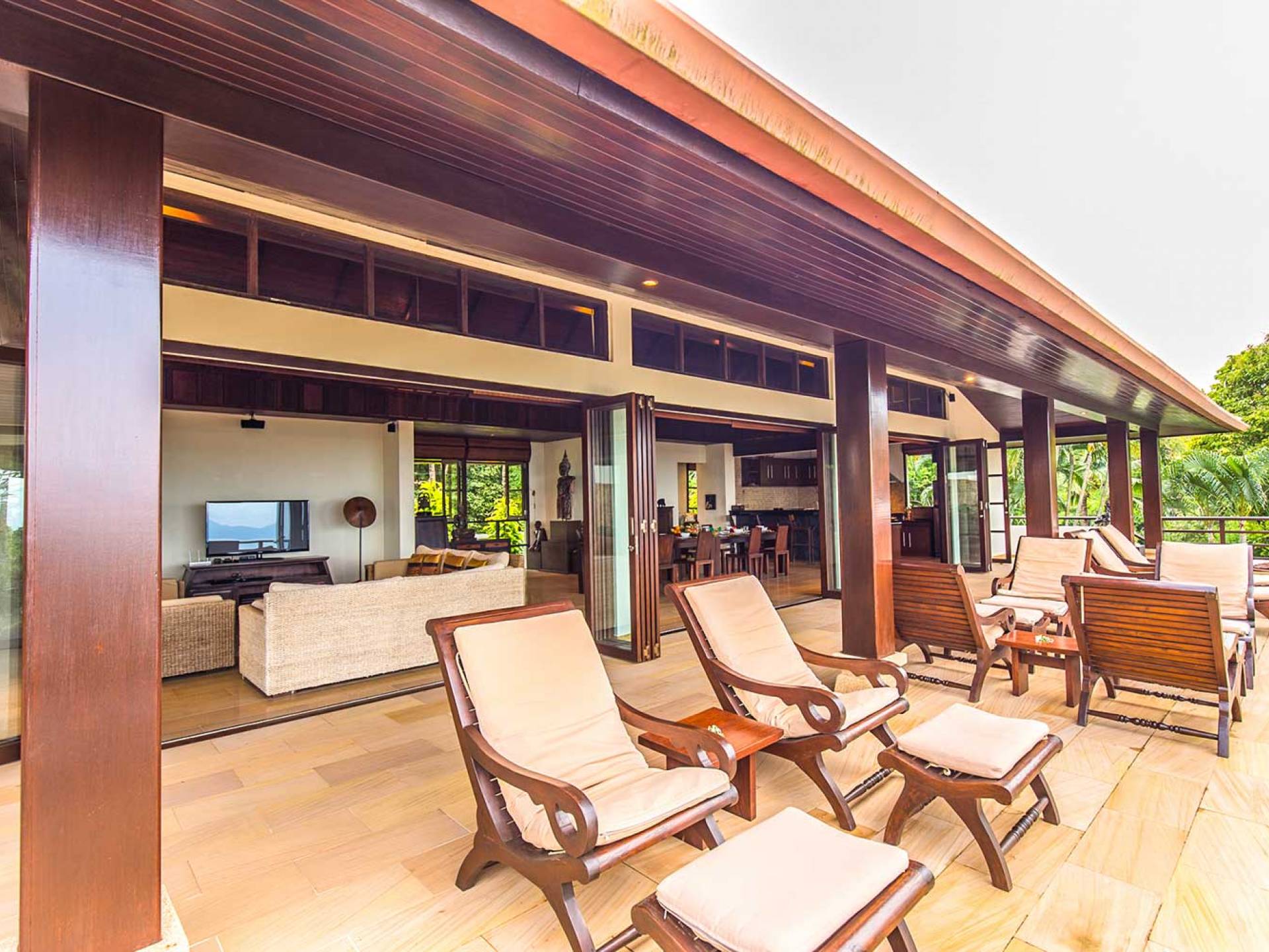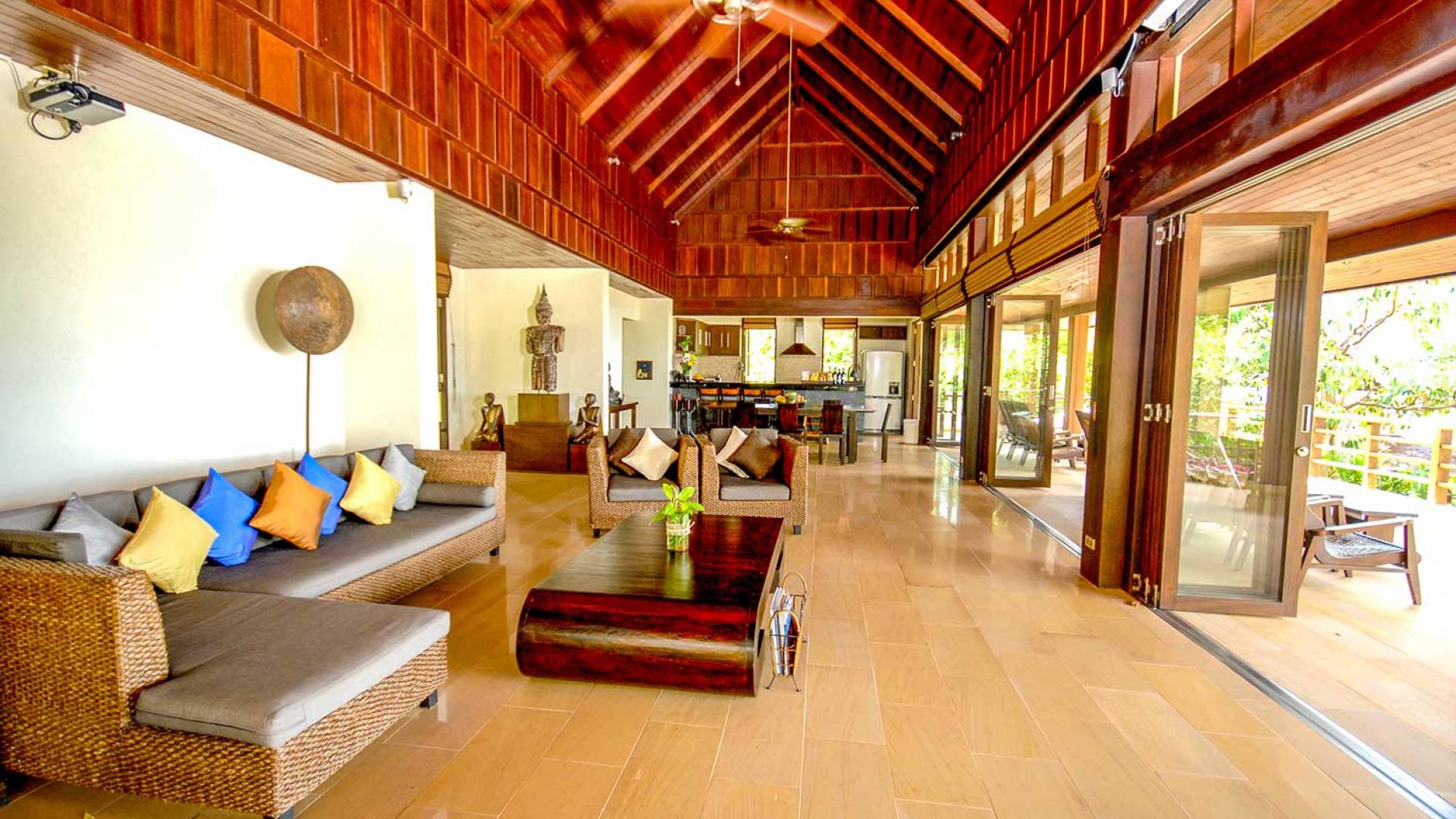 Ban Kinaree Samui besteht aus 3 separaten Pavillons, die in einer terrassierten Anlage mit üppiger und üppiger Gartenlandschaft harmonieren. Der kleinste Pavillon beherbergt ein Schlafzimmer; der größte und wichtigste Pavillon verfügt über das große Wohn-/Esszimmer/Küche sowie die 20-Meter-Terrasse mit Blick auf die Bophut-Bucht im ersten Stock, 2 Schlafzimmer befinden sich im Erdgeschoss; Der dritte Pavillon beherbergt das Hauptschlafzimmer und das 5. Schlafzimmer im Erdgeschoss.