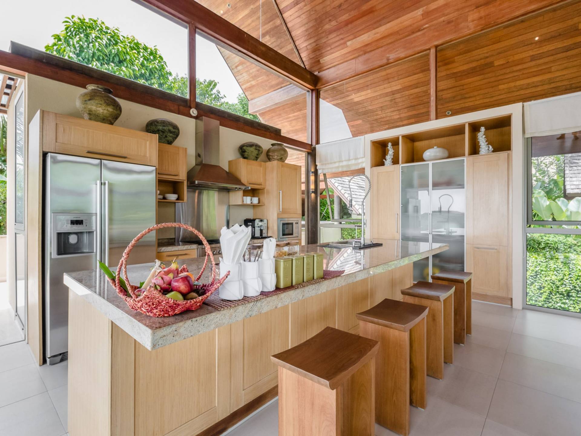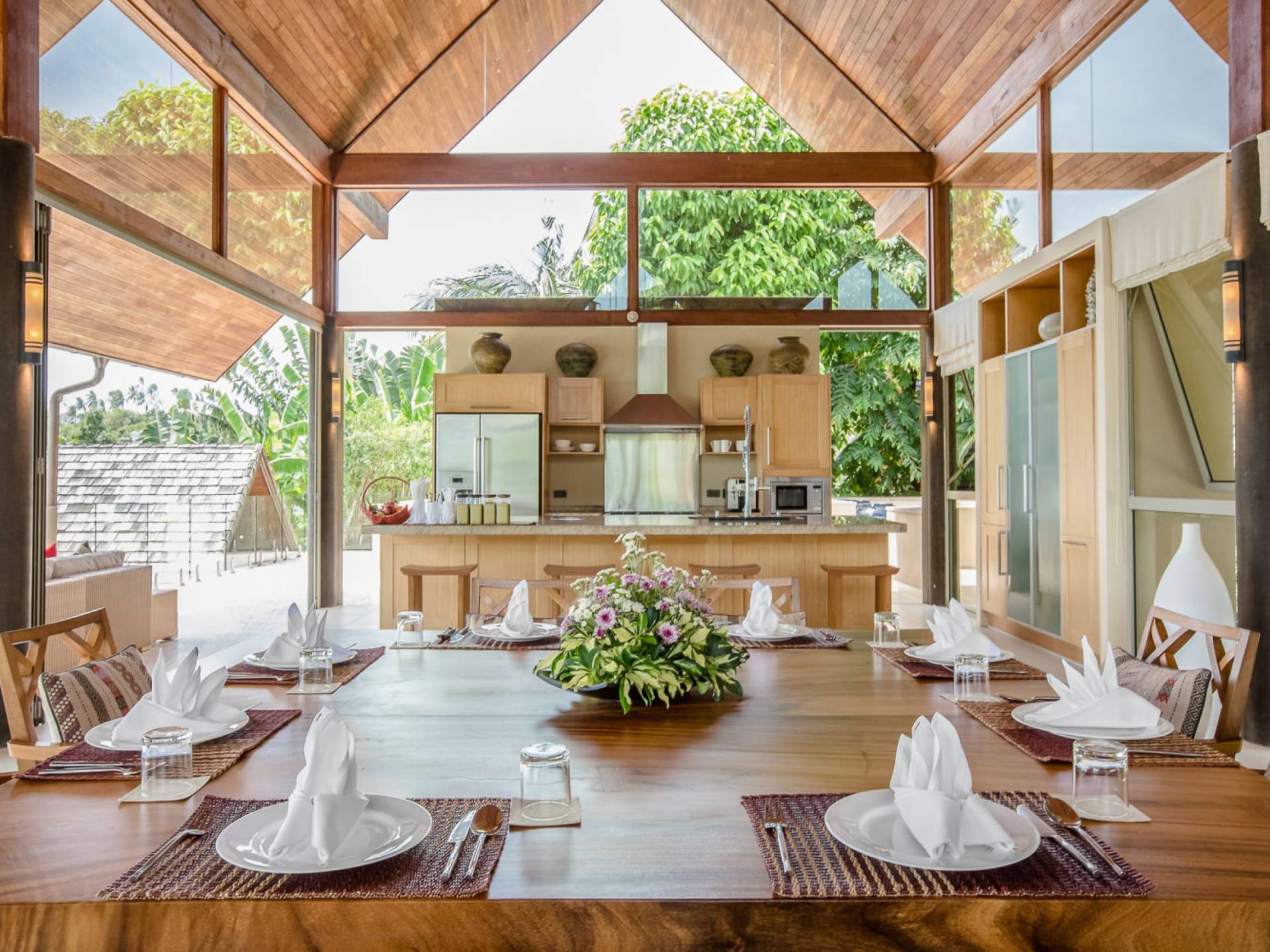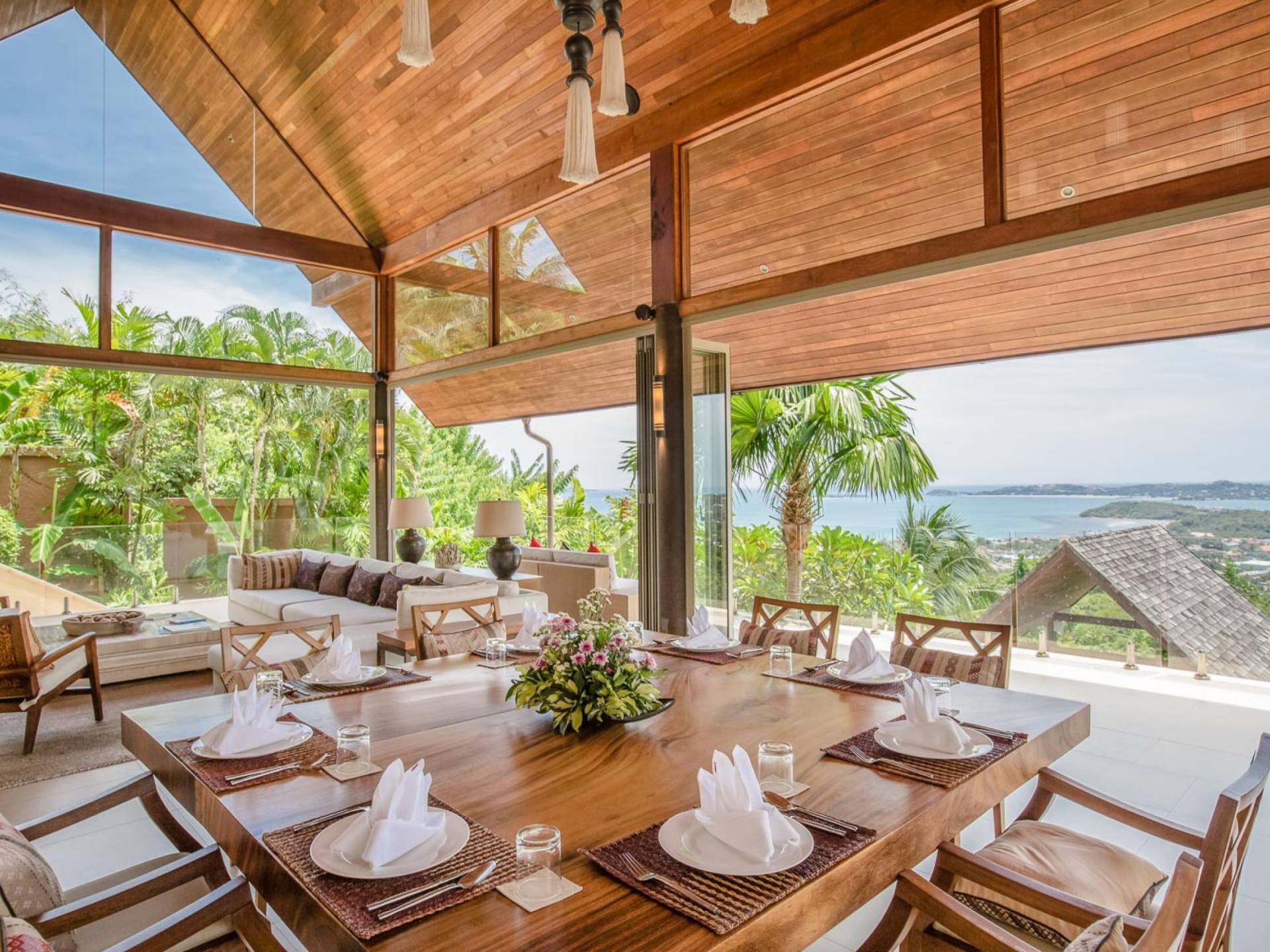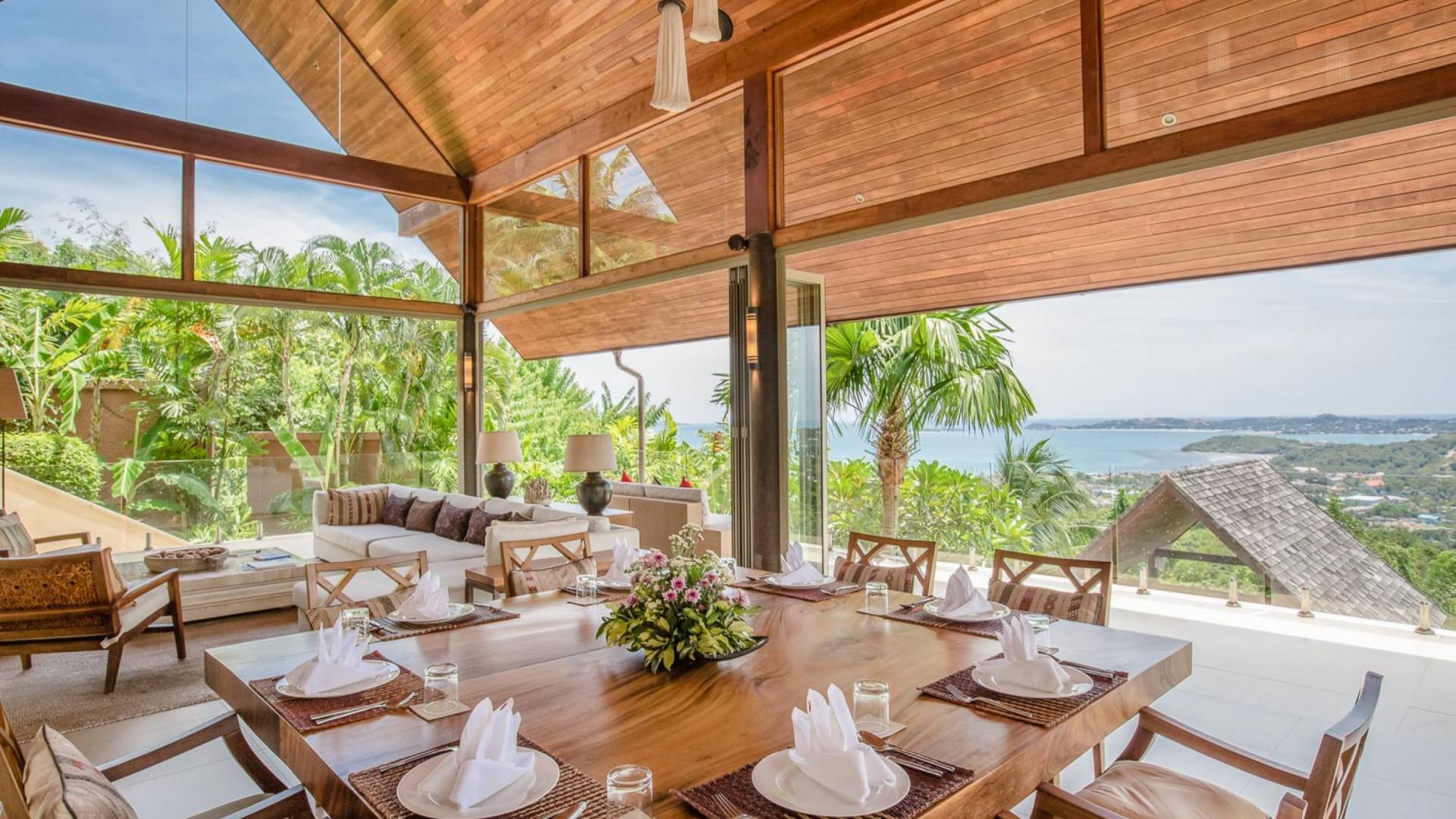 Große Holztüren öffnen sich in einen erstaunlich erhöhten Wohnbereich. Dieser weitläufige Raum erstreckt sich praktisch über die gesamte Breite des Anwesens und verfügt über eine sehr hohe, holzverkleidete Gewölbedecke mit Fenstern auf beiden Seiten, die das Raumgefühl erhöhen und die Gesamterhabenheit eines bereits beeindruckenden Raumes noch verstärken. Den Türen gegenüber ist eine Wand aus zweifach klappbaren Glastüren, die dafür sorgen, dass der Panoramablick über die bewaldeten Täler, die Bucht von Bophut und die Insel Koh Phangan immer sichtbar ist und Ihre Aufmerksamkeit auf sich zieht.