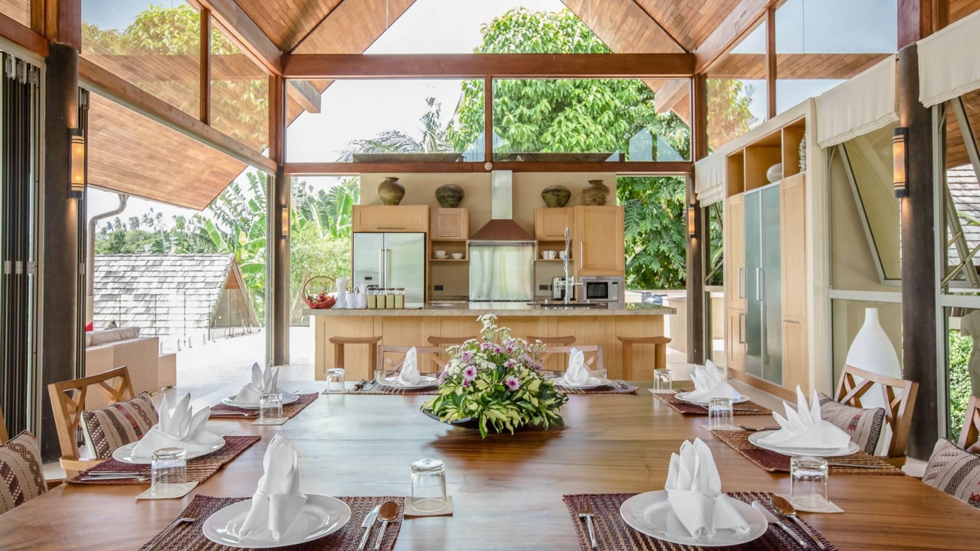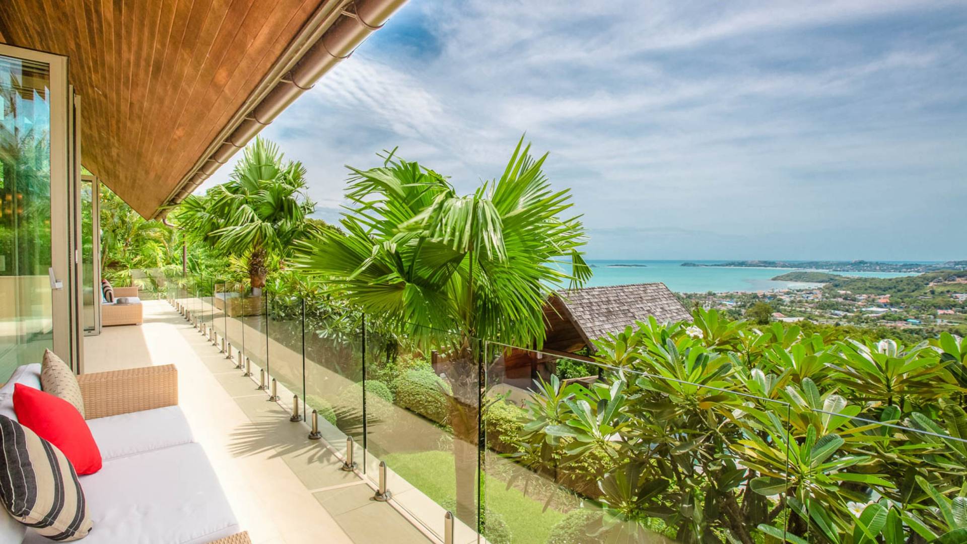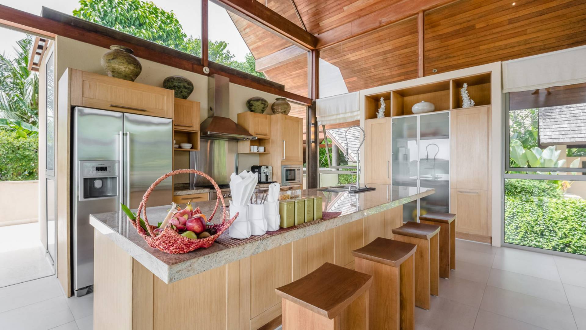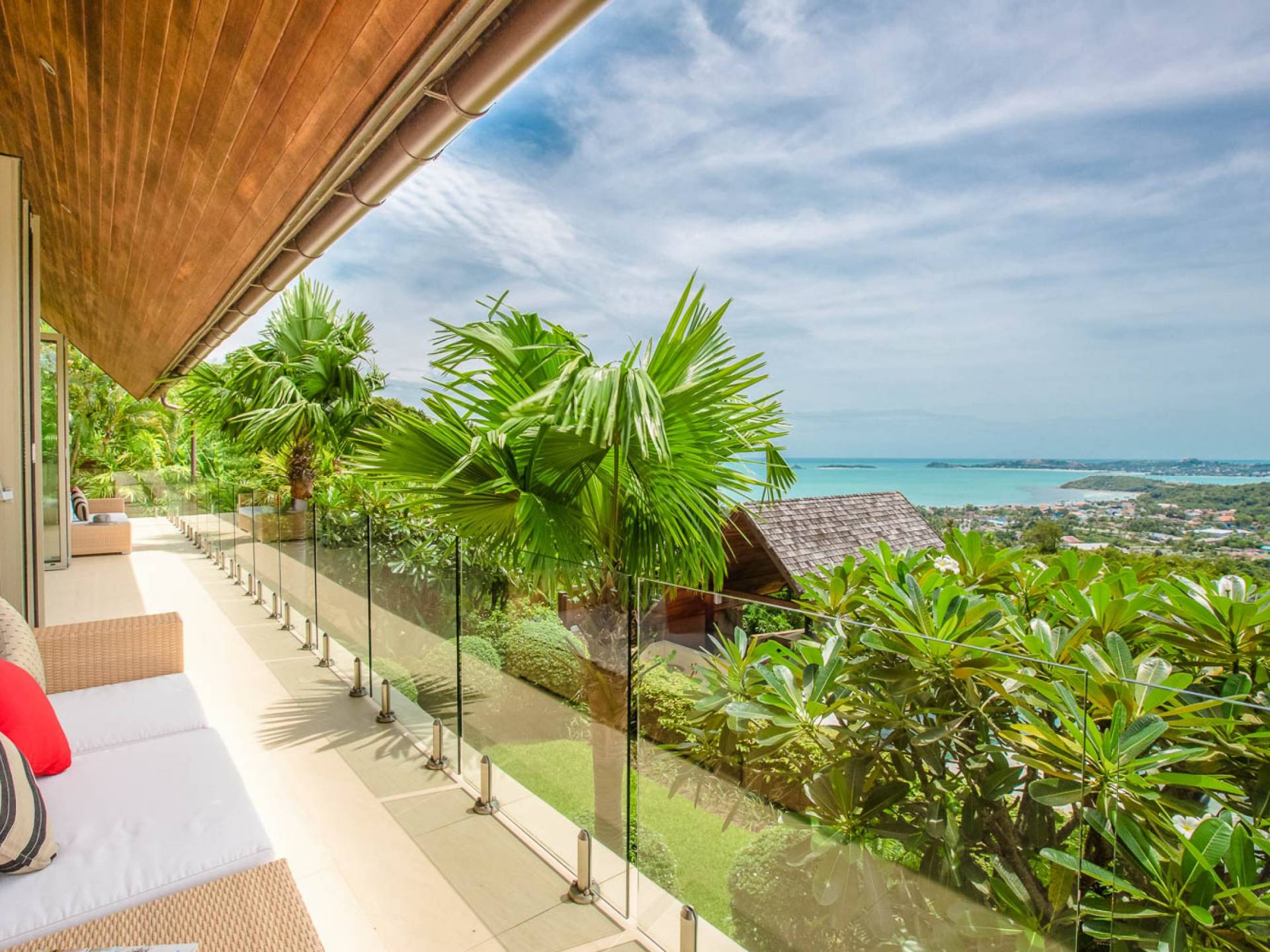 Große Holztüren öffnen sich in einen erstaunlich erhöhten Wohnbereich. Dieser weitläufige Raum erstreckt sich praktisch über die gesamte Breite des Anwesens und verfügt über eine sehr hohe, holzverkleidete Gewölbedecke mit Fenstern auf beiden Seiten, die das Raumgefühl erhöhen und die Gesamterhabenheit eines bereits beeindruckenden Raumes noch verstärken. Den Türen gegenüber ist eine Wand aus zweifach klappbaren Glastüren, die dafür sorgen, dass der Panoramablick über die bewaldeten Täler, die Bucht von Bophut und die Insel Koh Phangan immer sichtbar ist und Ihre Aufmerksamkeit auf sich zieht.