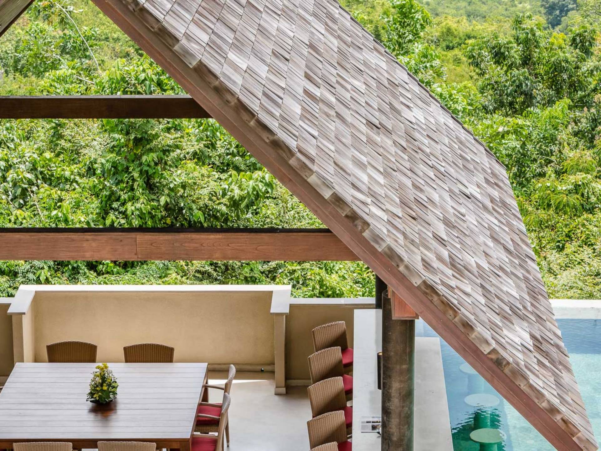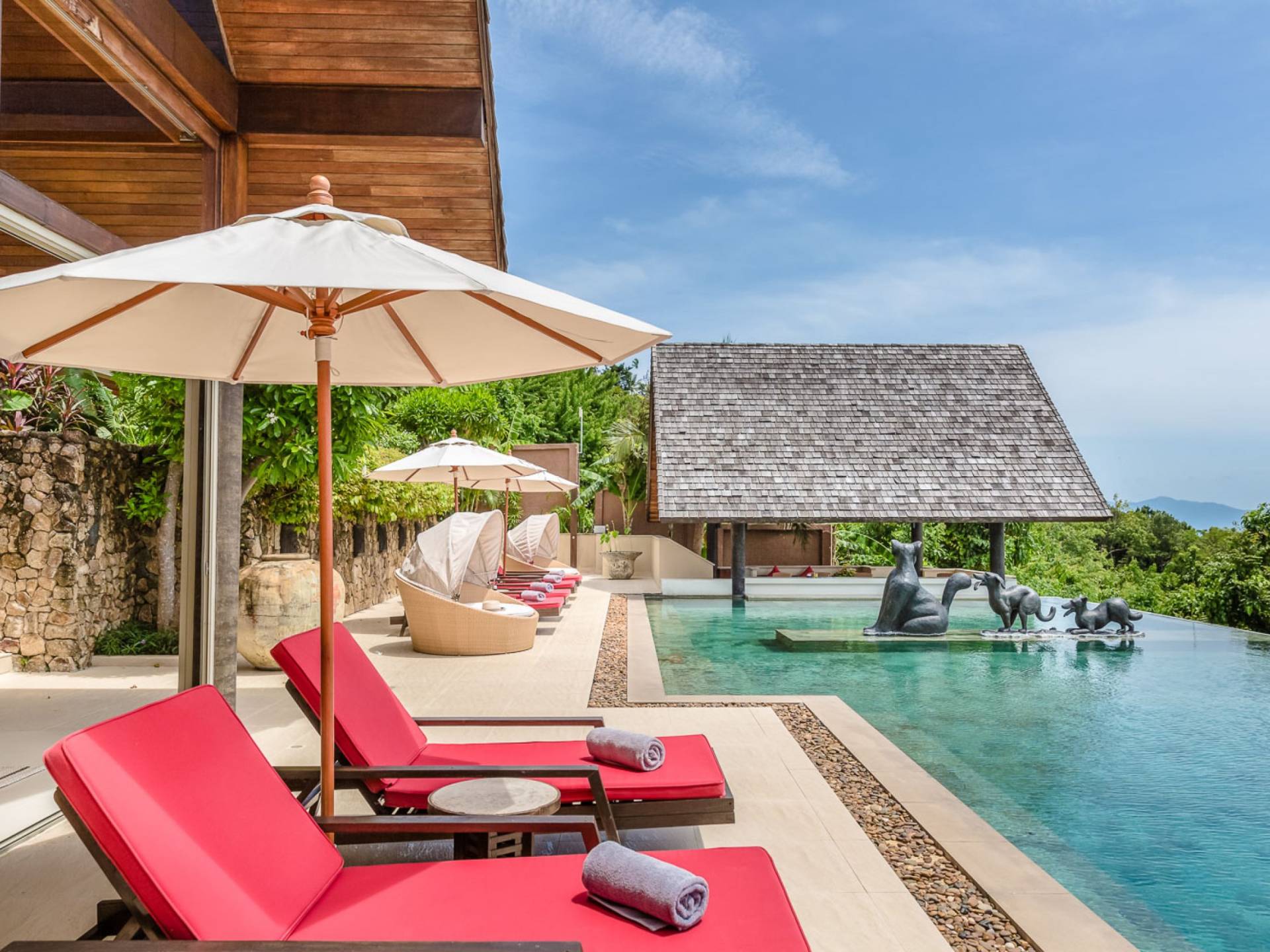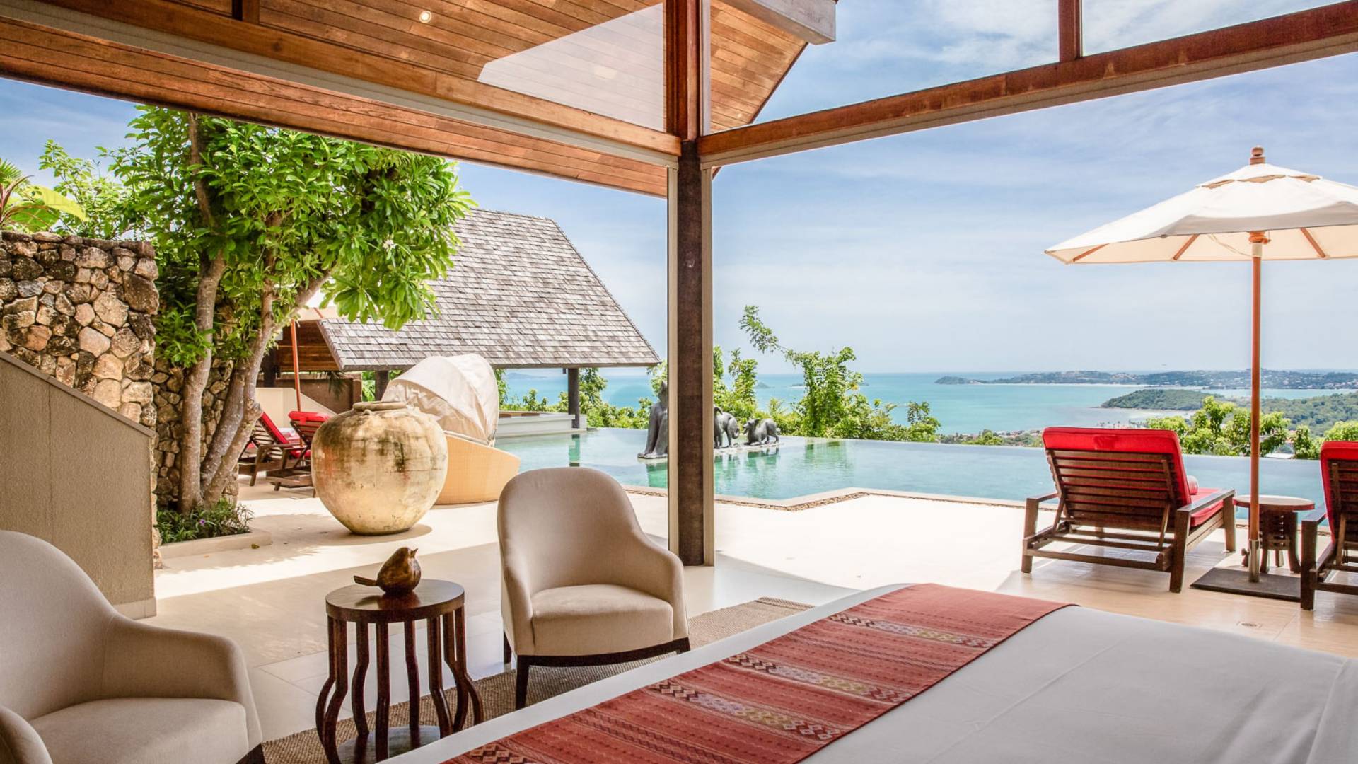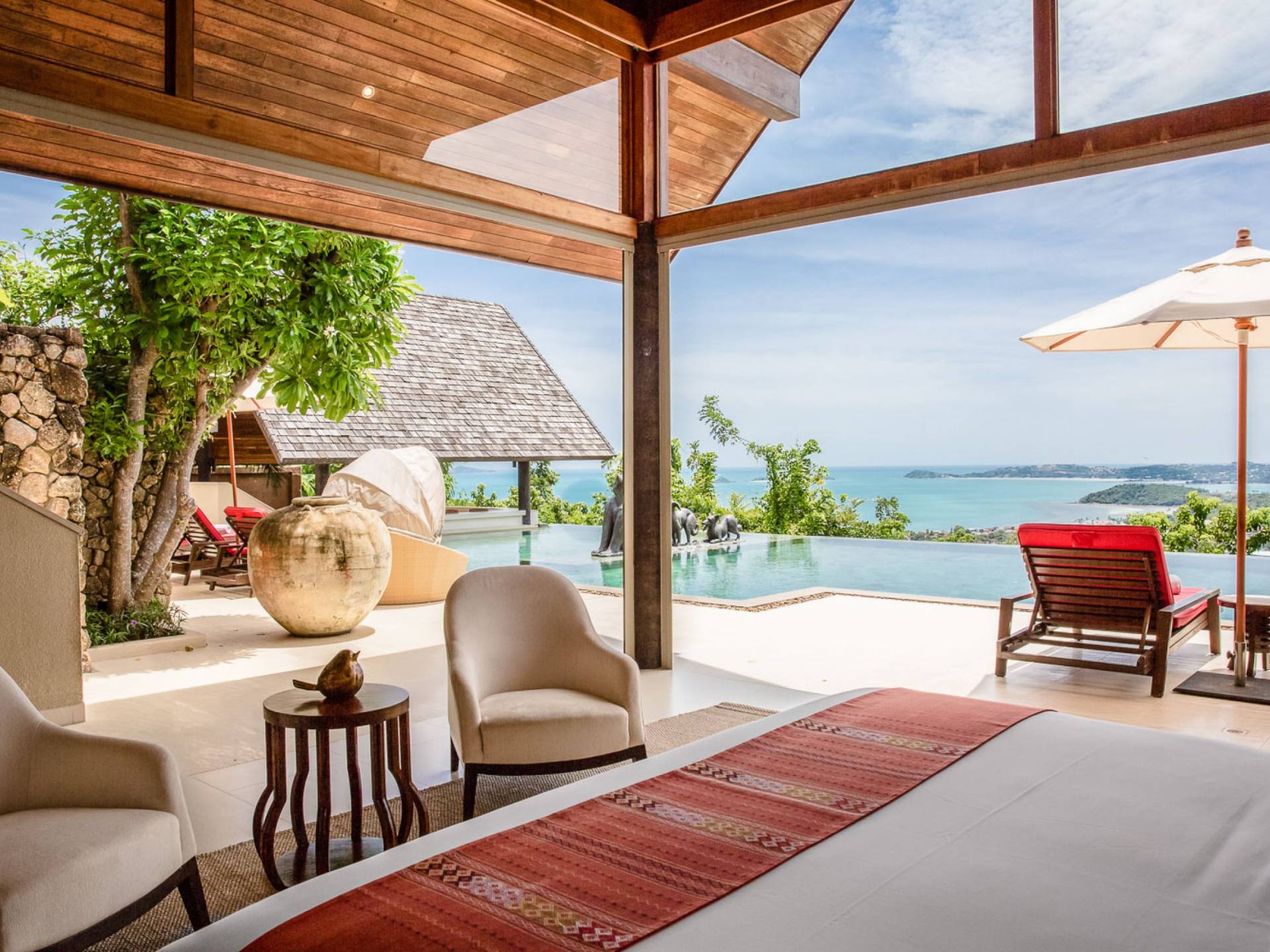 Große Holztüren öffnen sich in einen erstaunlich erhöhten Wohnbereich. Dieser weitläufige Raum erstreckt sich praktisch über die gesamte Breite des Anwesens und verfügt über eine sehr hohe, holzverkleidete Gewölbedecke mit Fenstern auf beiden Seiten, die das Raumgefühl erhöhen und die Gesamterhabenheit eines bereits beeindruckenden Raumes noch verstärken. Den Türen gegenüber ist eine Wand aus zweifach klappbaren Glastüren, die dafür sorgen, dass der Panoramablick über die bewaldeten Täler, die Bucht von Bophut und die Insel Koh Phangan immer sichtbar ist und Ihre Aufmerksamkeit auf sich zieht.